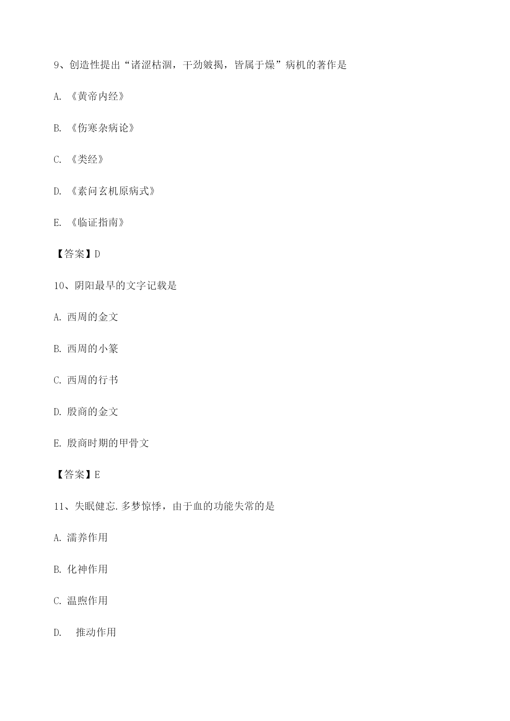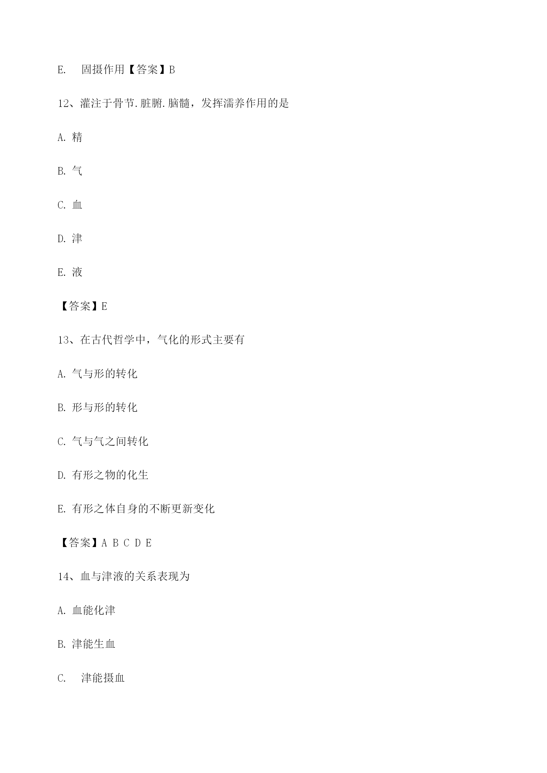 中医基础理论考试模拟题库1、泻南补北法中的“南”指的是肝B"5肺肾【答案】B2、膀胱的贮尿排尿功能,取决于肾气的盛衰肝气的疏泄。.心阳的盛衰脾气的健旺肺气的宣降【答案】A3、脾虚腹胀用健脾益气法治疗可称为塞因塞用通因通用虚则补之反治从治治病求本【答案】ACDE4、循行于上肢外侧中线的经脉是手少阴心经手厥阴心包经手太阳小肠经手少阳三焦经手太阴肺经【答案】D5、气化的具体表现包括精气互化精血同源互化血汗同源互化清气与水谷精气结合肾精生髓【答案】ABCDE6、六淫邪气中,致病变幻无常,发病迅速的是寒邪暑邪风邪湿邪燥邪【答案】C7、经络的感应传导现象体现气的功能是推动作用中介作用温煦作用防御作用固摄作用【答案】B8、属于胃的生理特性的是^喜燥喜满喜润喜运喜升【答案】C9、创造性提出“诸涩枯涸,干劲皴揭,皆属于燥”病机的著作是《黄帝内经》《伤寒杂病论》《类经》《素问玄机原病式》《临证指南》【答案】D10、阴阳最早的文字记载是西周的金文西周的小篆西周的行书殷商的金文殷商时期的甲骨文【答案】E11、失眠健忘.多梦惊悸,由于血的功能失常的是濡养作用化神作用温煦作用推动作用固摄作用【答案】B12、灌注于骨节.脏腑.脑髓,发挥濡养作用的是TOC\o"1-5"\h\z精气血津液【答案】E13、在古代哲学中,气化的形式主要有气与形的转化形与形的转化气与气之间转化有形之物的化生有形之体自身的不断更新变化【答案】ABCDE14、血与津液的关系表现为血能化津津能生血津能摄血津能行血津能载血【答案】AB15、与大肠的传导作用有关的脏腑有胃气的通降肺气的肃降肝气的疏泄肾气的推动和固摄脾气的运化【答案】ABCDE16、脾为气血生化之源的理论基础是气能生血脾主升清脾为后天之本脾主统血脾能运化水谷精微【答案】E17、寒从中生的形成因素有寒邪直中,伤及脾胃阳气虚衰,温煦失职过食生冷,寒湿停聚阳不化阴,水湿壅盛肾气不化,尿频泄泻【答案】BDE18、起于胞中,循行于背部正中的经脉是督脉足太阳膀胱经阳跷脉任脉足厥阴肝经【答案】A19、与奇经八脉相关的脏腑有TOC\o"1-5"\h\z肝肾脑。.心E.女子胞【答案】ABCDE20、被后人称“滋阴派”的医家代表是朱丹溪叶天士刘完素薛生白吴鞠通【答案】A21、某男,29岁。高热,烦躁,面赤,干唇燥。舌红少津,脉数,此病证变化体现的是阳损及阴阴损及阳阳胜则阴病阴胜则阳病阳胜则热【答案】C22、导致津液输布障碍,水湿痰饮内停的最主要因素是肾主水失调三焦水道不利脾主运化失健肺主行水失常肝主疏泄失职【答案】C23、致病原因,不属于情志内伤的是暑热扰神亲人亡故家庭纠纷工作烦心工作焦虑【答案】A24、阴虚风动的常见病因是生血不足或失血过多久病耗血或年老精亏产后恶露日久不尽热病后期,阴津亏损水不涵木,浮阳不潜【答案】D25、中医学认为,构成人体有机整体的中心是五脏六腑脑命门经络【答案】A26、与气的生成密切相关的脏腑有TOC\o"1-5"\h\z心脾5肾胃【答案】BCDE27、属于阴的是上升明亮兴奋抑制弥散【答案】D28、六淫中,易伤津耗气的邪气是燥邪风邪湿邪暑邪寒邪【答案】D29、六淫外邪中,致病易导致肿疡的是风邪寒邪火邪湿邪燥邪【答案】C30、人体之精按其功能可分为先天之精后天之精生殖之精脏腑之精营养之精【答案】CE31、不属于扶助机体正气方法的是顺应四时调摄精神多食肉食锻炼身体避其邪气【答案】E32、较早运用体质一词的著作是《景岳全书》《金匮要略》《温病条辨》《养老奉亲书》《临证指南医案》【答案】A33、不属于气虚形成原因的是禀赋不足后天失养肺脾肾功能失调形体劳倦情志抑郁【答案】E34、与手太阴肺经交接部位叙述正确的是在足大趾交于足厥阴肝经在足大趾端交于足太阴脾经在食指端交于手阳明大肠经在无名指端交于手少阳三焦经在小指端交于手太阳小肠经【答案】C35、精与血的关系表现为精能化血血能养精精能摄血精能行血精能载血【答案】AB36、运用阴阳互根理论解释的治法是阳病治阴阴病治阳阳中求阴阴阳双补回阳救阴【答案】C37、某女,25岁。尿道灼热涩痛,伴心烦失眠,舌生疮,渴,小便黄赤。舌红无苔,脉数。其病位是/心.脾B«胃。.心.膀胱»
