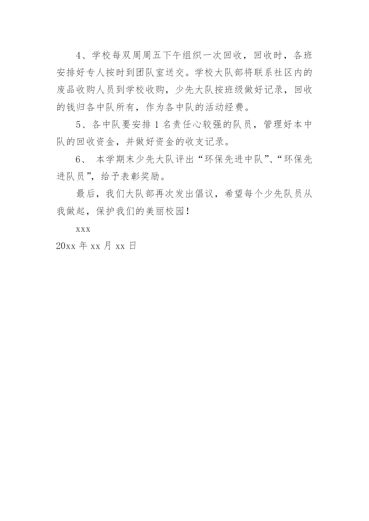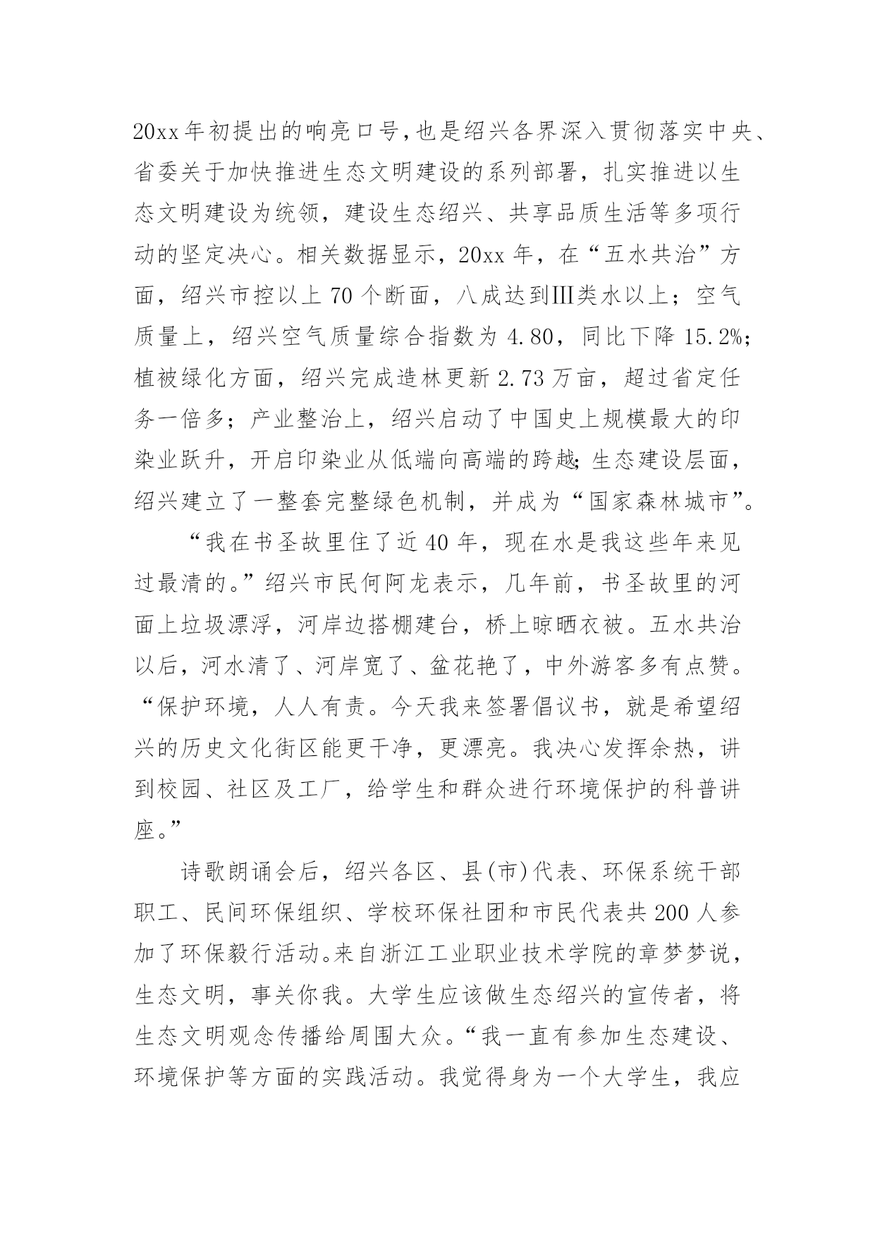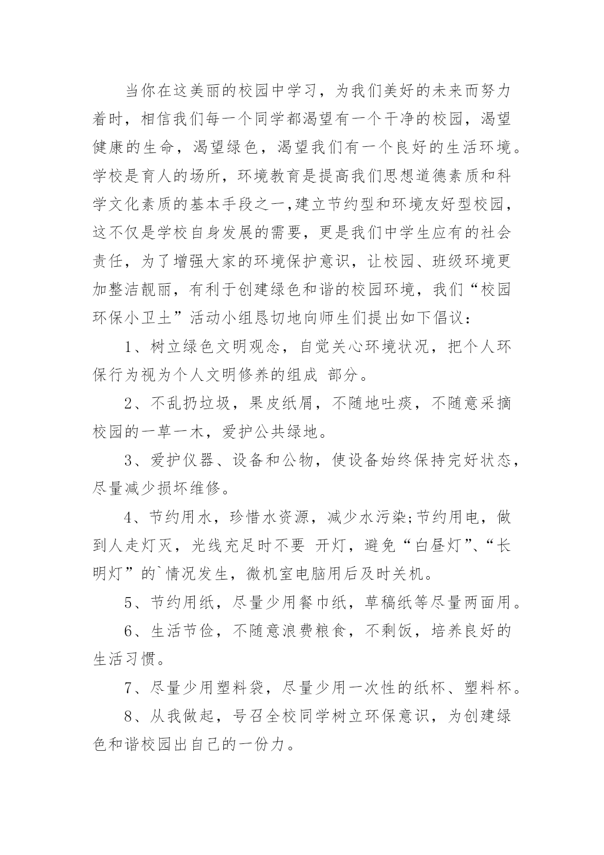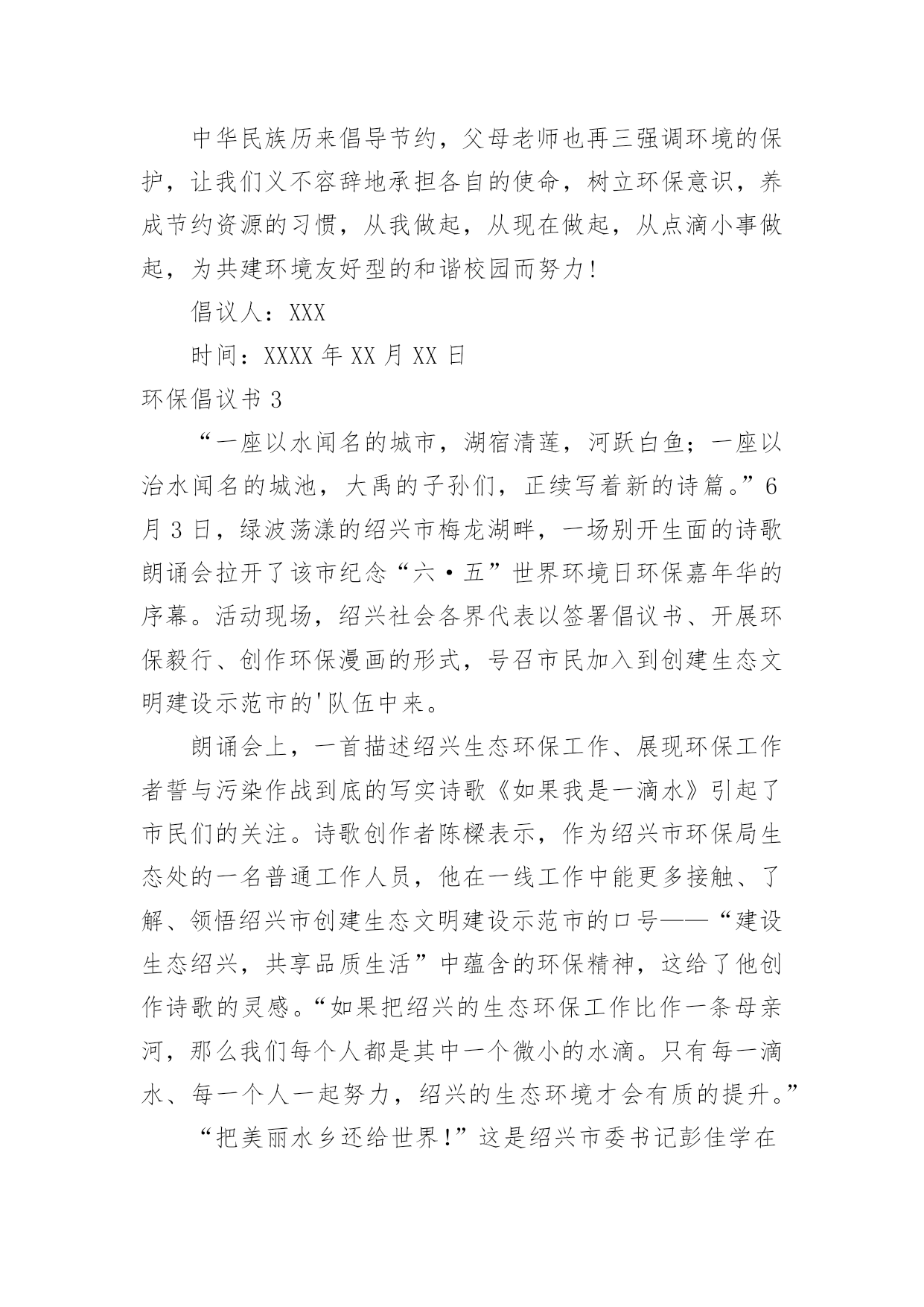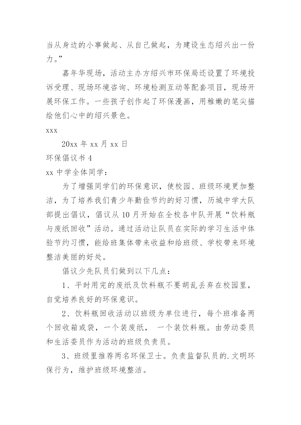 环保倡议书环保倡议书集锦4篇在充满活力,日益开放的今天,接触并使用倡议书的人越来越多,倡议书在写作上具有一定的格式要求。来参考自己需要的倡议书吧!以下是小编为大家整理的环保倡议书,仅供参考,希望能够帮助到大家。环保倡议书1地球与人类有着生死之交的关系,地球灭亡了,则人类也会跟着灭亡。现代的生活方式,对地球有着巨大压力:尾气排放、工业残渣、污水、乱砍滥伐等等人为的`破坏,使得地球经常发生地震、洪水、海啸、雾霾等灾害,所以我提出以下几点建议:第一:尽量不要驾车出行,或者发明电动汽车;第二:尽量节能生产;第三:污水不能排入大海与河流;第四:尽量砍一棵树种一棵树。地球是生命之源,我们要爱护她、呵护她,“善待地球就是善待自己”,让我们一起保护地球吧!环保倡议书2亲爱的同学们:当你在这美丽的校园中学习,为我们美好的未来而努力着时,相信我们每一个同学都渴望有一个干净的校园,渴望健康的生命,渴望绿色,渴望我们有一个良好的生活环境。学校是育人的场所,环境教育是提高我们思想道德素质和科学文化素质的基本手段之一,建立节约型和环境友好型校园,这不仅是学校自身发展的需要,更是我们中学生应有的社会责任,为了增强大家的环境保护意识,让校园、班级环境更加整洁靓丽,有利于创建绿色和谐的校园环境,我们“校园环保小卫土”活动小组恳切地向师生们提出如下倡议:1、树立绿色文明观念,自觉关心环境状况,把个人环保行为视为个人文明修养的组成部分。2、不乱扔垃圾,果皮纸屑,不随地吐痰,不随意采摘校园的一草一木,爱护公共绿地。3、爱护仪器、设备和公物,使设备始终保持完好状态,尽量减少损坏维修。4、节约用水,珍惜水资源,减少水污染;节约用电,做到人走灯灭,光线充足时不要开灯,避免“白昼灯”、“长明灯”的`情况发生,微机室电脑用后及时关机。5、节约用纸,尽量少用餐巾纸,草稿纸等尽量两面用。6、生活节俭,不随意浪费粮食,不剩饭,培养良好的生活习惯。7、尽量少用塑料袋,尽量少用一次性的纸杯、塑料杯。8、从我做起,号召全校同学树立环保意识,为创建绿色和谐校园出自己的一份力。中华民族历来倡导节约,父母老师也再三强调环境的保护,让我们义不容辞地承担各自的使命,树立环保意识,养成节约资源的习惯,从我做起,从现在做起,从点滴小事做起,为共建环境友好型的和谐校园而努力!倡议人:XXX时间:XXXX年XX月XX日环保倡议书3“一座以水闻名的城市,湖宿清莲,河跃白鱼;一座以治水闻名的城池,大禹的子孙们,正续写着新的诗篇。”6月3日,绿波荡漾的绍兴市梅龙湖畔,一场别开生面的诗歌朗诵会拉开了该市纪念“六·五”世界环境日环保嘉年华的序幕。活动现场,绍兴社会各界代表以签署倡议书、开展环保毅行、创作环保漫画的形式,号召市民加入到创建生态文明建设示范市的'队伍中来。朗诵会上,一首描述绍兴生态环保工作、展现环保工作者誓与污染作战到底的写实诗歌《如果我是一滴水》引起了市民们的关注。诗歌创作者陈樑表示,作为绍兴市环保局生态处的一名普通工作人员,他在一线工作中能更多接触、了解、领悟绍兴市创建生态文明建设示范市的口号——“建设生态绍兴,共享品质生活”中蕴含的环保精神,这给了他创作诗歌的灵感。“如果把绍兴的生态环保工作比作一条母亲河,那么我们每个人都是其中一个微小的水滴。只有每一滴水、每一个人一起努力,绍兴的生态环境才会有质的提升。”“把美丽水乡还给世界!”这是绍兴市委书记彭佳学在20xx年初提出的响亮口号,也是绍兴各界深入贯彻落实中央、省委关于加快推进生态文明建设的系列部署,扎实推进以生态文明建设为统领,建设生态绍兴、共享品质生活等多项行动的坚定决心。相关数据显示,20xx年,在“五水共治”方面,绍兴市控以上70个断面,八成达到Ⅲ类水以上;空气质量上,绍兴空气质量综合指数为4.80,同比下降15.2%;植被绿化方面,绍兴完成造林更新2.73万亩,超过省定任务一倍多;产业整治上,绍兴启动了中国史上规模最大的印染业跃升,开启印染业从低端向高端的跨越;生态建设层面,绍兴建立了一整套完整绿色机制,并成为“国家森林城市”。“我在书圣故里住了近40年,现在水是我这些年来见过最清的。”绍兴市民何阿龙表示,几年前,书圣故里的河面上垃圾漂浮,河岸边搭棚建台,桥上晾晒衣被。五水共治以后,河水清了、河岸宽了、盆花艳了,中外游客多有点赞。“保护环境,人人有责。今天我来签署倡议书,就是希望绍兴的历史文化街区能更干净,更漂亮。我决心发挥余热,讲到校园、社区及工厂,给学生和群众进行环境保护的科普讲座。”诗歌朗诵会后,绍兴各区、县(市)代表、环保系统干部职工、民间环保组织、学校环保社团和市民代表共200人参加了环保毅行活动。来自浙江工业职业技术学院的章梦梦说,生态文明,事关你我。大学生应该做生态绍兴的宣传者,将生态文明观念传播给周围大众。“我一直有参