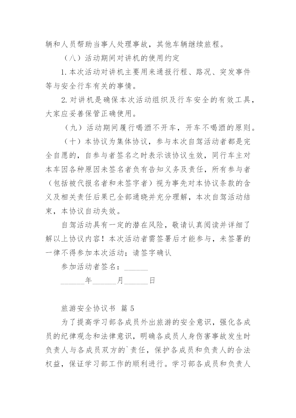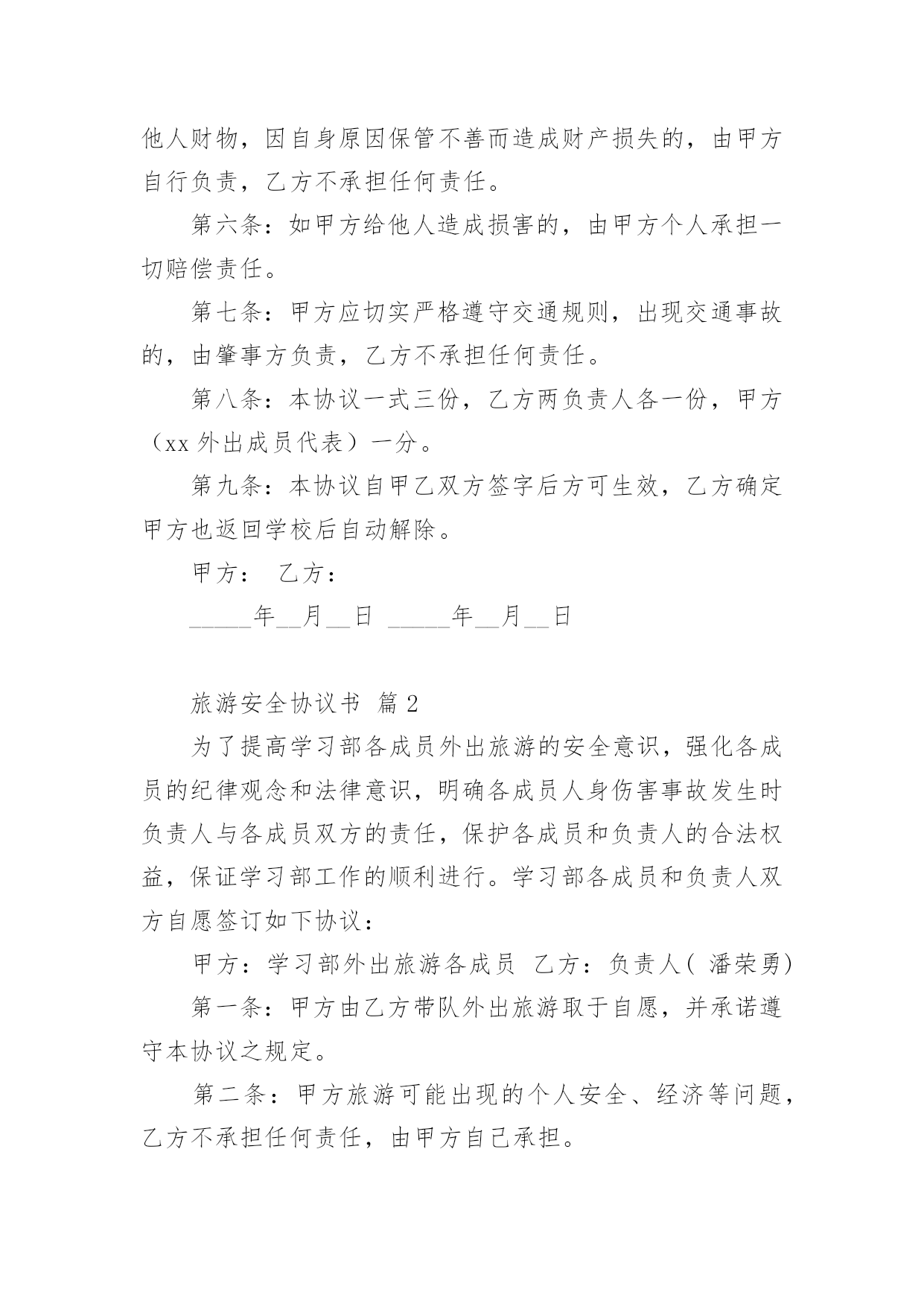 旅游安全协议书在日常生活和工作中,我们用到协议的地方越来越多,签订协议能够保证双方合作愉快。想必许多人都在为如何写好协议而烦恼吧,下面是小编收集整理的旅游安全协议书,欢迎大家借鉴与参考,希望对大家有所帮助。旅游安全协议书篇1甲方:xx外出旅游各成员乙方:负责人为了提高xx各成员外出旅游的安全意识,强化各成员的纪律观念和法律意识,明确各成员人身伤害事故发生时负责人与各成员双方的责任,保护各成员和负责人的合法权益,保证xx工作的'顺利进行。xx各成员和负责人双方自愿签订如下协议:第一条:甲方由乙方带队外出旅游取于自愿,并承诺遵守本协议之规定。第二条:甲方旅游可能出现的个人安全、经济等问题,乙方不承担任何责任,由甲方自己承担。第三条:甲方不得擅自离开团队,给集体或团队带来不必要的麻烦,否则后果自负。第四条:在旅游期间发生事故,甲方使本人或他人人身、财产等造成的伤害,乙方不承担任何责任。第五条:甲方应切实注意个人财产安全,不得非法占有他人财物,因自身原因保管不善而造成财产损失的,由甲方自行负责,乙方不承担任何责任。第六条:如甲方给他人造成损害的,由甲方个人承担一切赔偿责任。第七条:甲方应切实严格遵守交通规则,出现交通事故的,由肇事方负责,乙方不承担任何责任。第八条:本协议一式三份,乙方两负责人各一份,甲方(xx外出成员代表)一分。第九条:本协议自甲乙双方签字后方可生效,乙方确定甲方也返回学校后自动解除。甲方:乙方:_____年__月__日_____年__月__日旅游安全协议书篇2为了提高学习部各成员外出旅游的安全意识,强化各成员的纪律观念和法律意识,明确各成员人身伤害事故发生时负责人与各成员双方的责任,保护各成员和负责人的合法权益,保证学习部工作的顺利进行。学习部各成员和负责人双方自愿签订如下协议:甲方:学习部外出旅游各成员乙方:负责人(潘荣勇)第一条:甲方由乙方带队外出旅游取于自愿,并承诺遵守本协议之规定。第二条:甲方旅游可能出现的个人安全、经济等问题,乙方不承担任何责任,由甲方自己承担。第三条:甲方不得擅自离开团队,给集体或团队带来不必要的麻烦,否则后果自负。第四条:在旅游期间发生事故,甲方使本人或他人人身、财产等造成的伤害,乙方不承担任何责任。第五条:甲方应切实注意个人财产安全,不得非法占有他人财物,因自身原因保管不善而造成财产损失的,由甲方自行负责,乙方不承担任何责任。第六条:如甲方给他人造成损害的,由甲方个人承担一切赔偿责任。第七条:甲方应切实严格遵守交通规则,出现交通事故的,由肇事方负责,乙方不承担任何责任。第八条:本协议一式三份,乙方两负责人各一份,甲方(学习部外出成员代表)一分。第九条:本协议自甲乙双方签字后方可生效,乙方确定甲方也返回学校后自动解除。甲方签字:乙方签字:贵州电力职业技术学院学习部二〇一一年三月十二日----------、1、甲方外出旅游自愿,承诺遵守协议之规定,乙方按规定审批。2、甲方中途转车,可能出现安全、经济等问题,乙方不承担责任。3、甲方不得擅自离开团队,给集体或团队带来不必要的损失。4、乙方对甲方在外出期间的人身和财产安全概不负责,甲方在旅游期间发生事故,使本人或他人人身、财产等造成的'伤害,乙方不承担任何责任。5、注意个人财产安全,不得非法占有他人财物,因自身原因保管不善而造成财产损失自行负责6、发现或发生有关安全问题应及时报告。7、如给他人造成损害的,一般由学生承担赔偿责任。构成犯罪的,移交司法机关处理8、学生应严格遵守交通规则,出现交通事故的,由肇事方负责9、本协议自签订之日起开始生效;本协议如与法律、法规相违背,以国家法律、法规为准。。有效期自______年______月______日______时起至______年______月______日______时止。甲方:(盖章)代表签字:乙方(学生监护人)签字:年月日旅游安全协议书篇3甲方:_________(旅行社或公司)地址:_________邮码:_________电话:_________法定代表人:_________职务:_________乙方:_________(姓名或团体名称)地址:_________邮码:_________电话:_________根据国家有关旅游事业管理的规定,甲乙双方经协商一致,签订本合同,共同信守执行。第一条旅游的时间安排由甲方在_________年_________月_________日至_________年_________月_________日为乙方提供旅游服务。第二条旅游的地点及每个旅游景点的时间安排甲方为乙方提供的旅游景点为_________个。分别是_________。每天的时间安排为上午_________时至_________时,下午_________时至_________时。第三条旅游