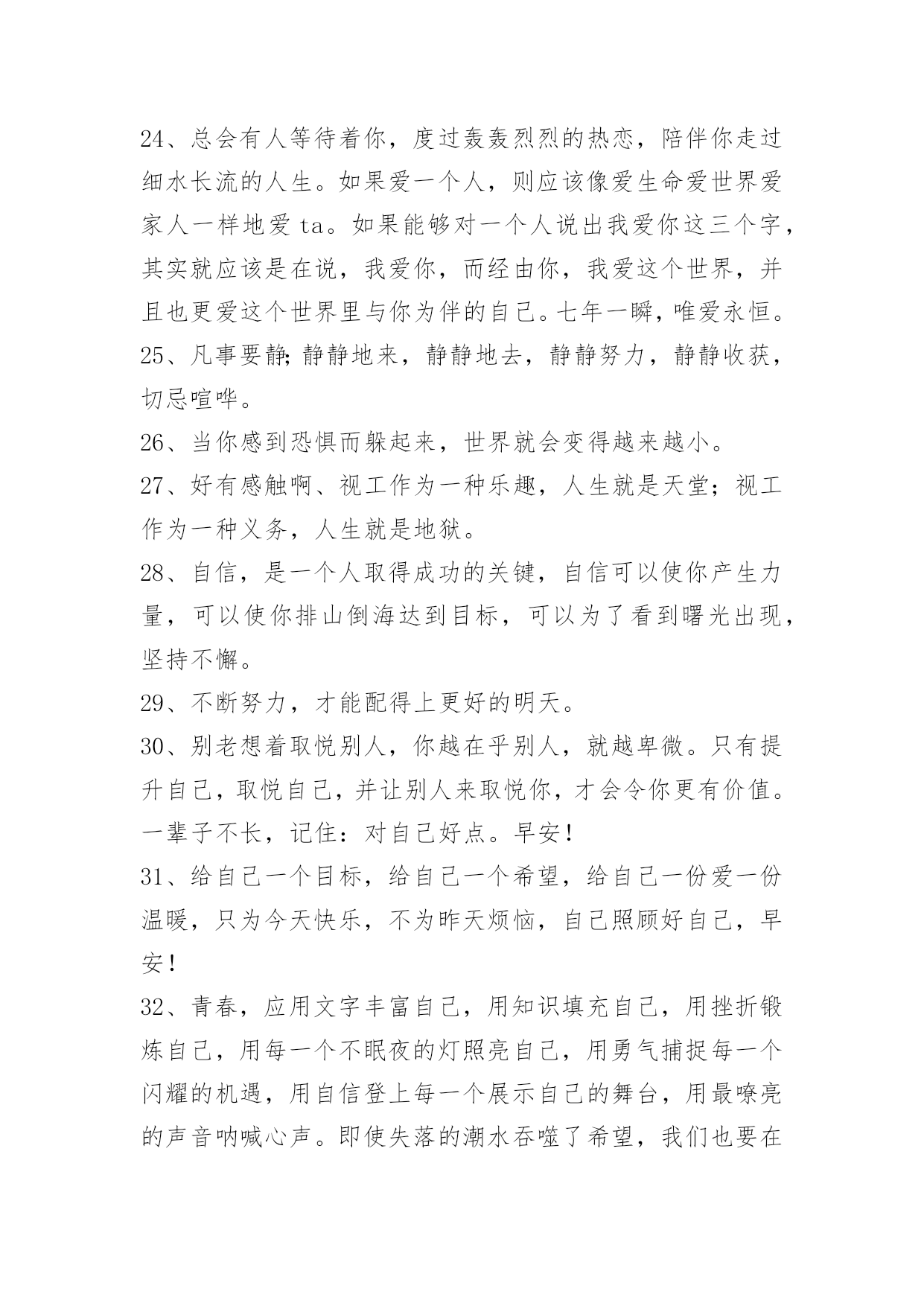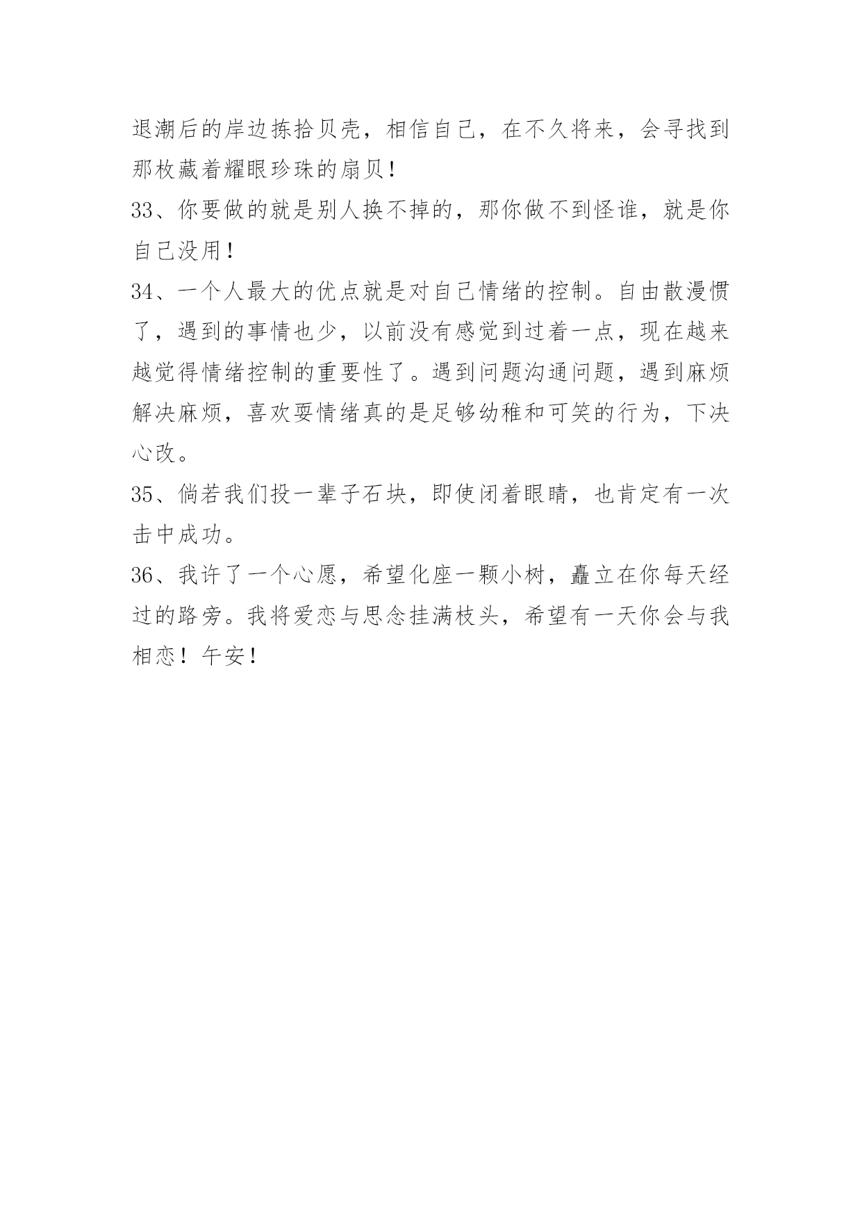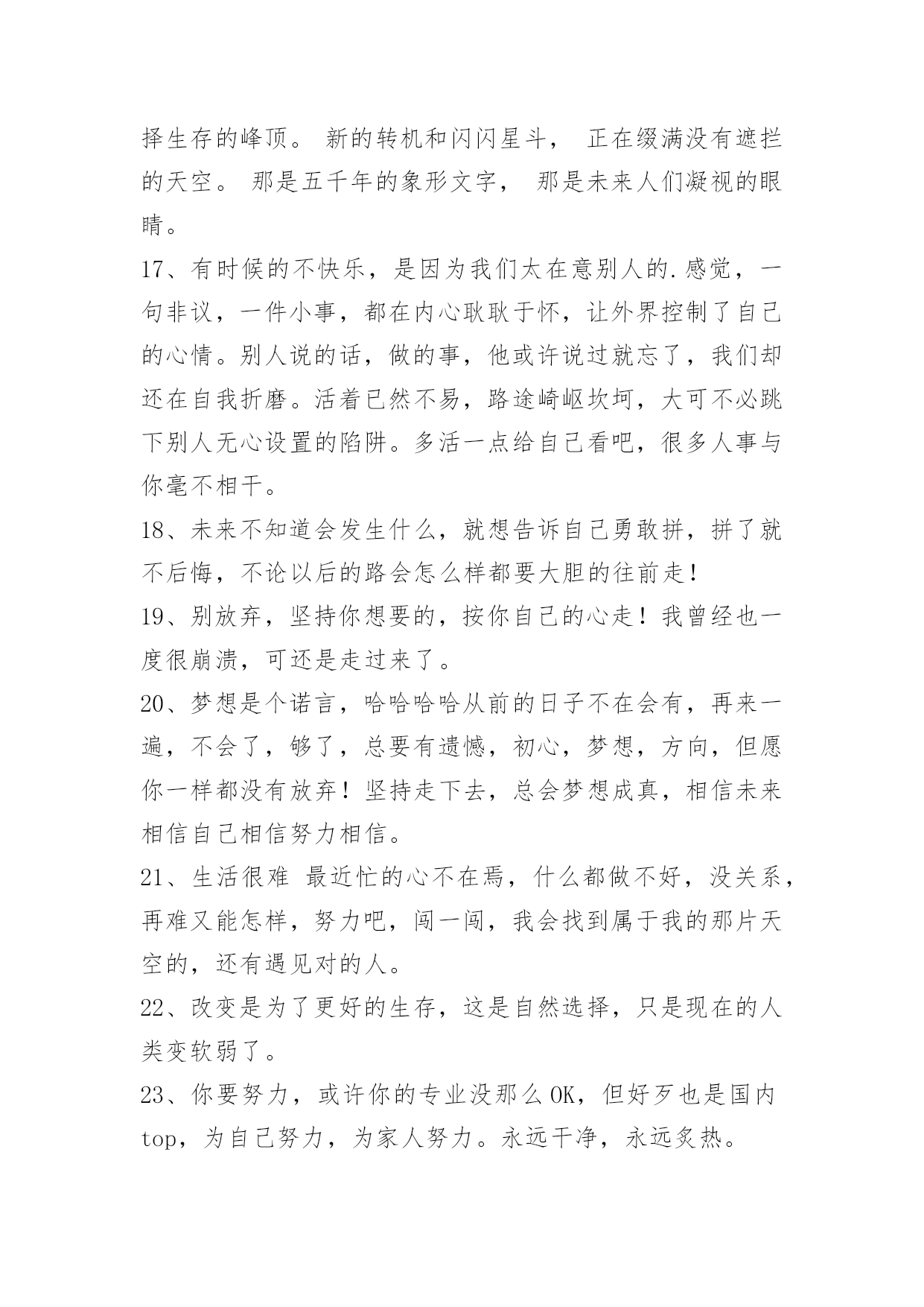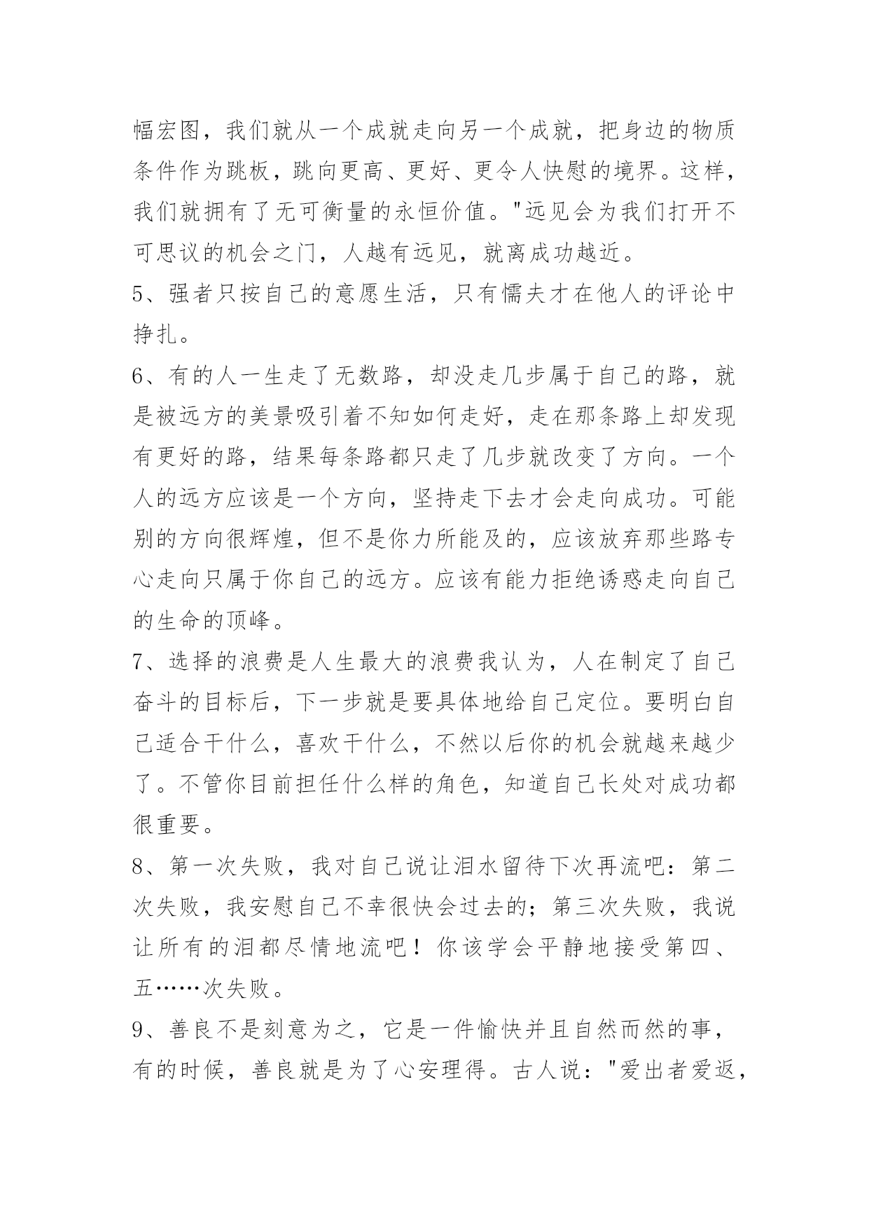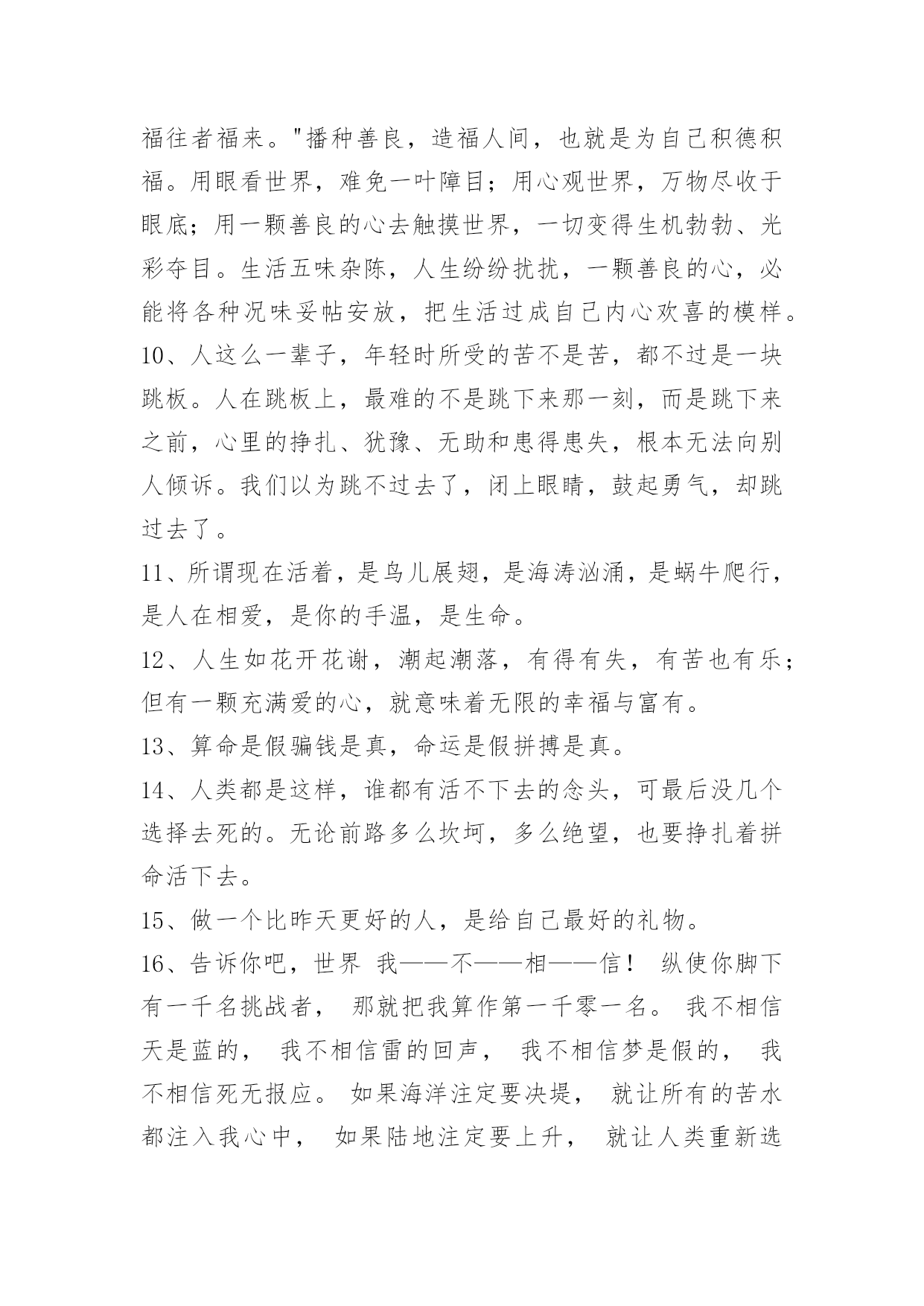 生活励志语录【必备】2021年生活励志语录集锦36句年轻人血气方刚,总想战胜对手。可往往事与愿违,反而被自己打败了。是啊,人生最大的敌人是自己,最大的对手也是自己。学习、生活中的失败,往往不是别人造成的,而是自己的心态决定了成功与否,因此,以一颗乐观的进取的心去面对生活与工作,才不至于被自己打败,从而战胜对手实现人生的理想。下面是小编精心准备的生活励志语录36句,欢迎阅读借鉴。1、就人生而言,应平衡于山、水之间。水边给人喜悦,山地给人安慰。水边让我们感知世界无常,山地让我们领悟天地恒昌。水边让我们享受脱离长辈怀抱的远行刺激,山地让我们体验回归祖先居所的悠悠厚味。水边的哲学是不舍昼夜,山地的哲学是不知日月。2、我一向认为人是慢慢变老的,其实不是,人是以瞬间变老的。3、"在懦夫的眼里,干什么事情都是危险的;而热爱生活的人,却总是蔑视困难,勇往直前。"4、如果你有远见,又勤奋努力,你就更有可能有所成就。诚然,未来到底会怎样,没人能保证,任何人都一样,但你能大大增加成功的机会。凯瑟琳·罗甘说过:"远见告诉我们可能会得到什么东西。远见召唤我们去行动。心中有了一幅宏图,我们就从一个成就走向另一个成就,把身边的物质条件作为跳板,跳向更高、更好、更令人快慰的境界。这样,我们就拥有了无可衡量的永恒价值。"远见会为我们打开不可思议的机会之门,人越有远见,就离成功越近。5、强者只按自己的意愿生活,只有懦夫才在他人的评论中挣扎。6、有的人一生走了无数路,却没走几步属于自己的路,就是被远方的美景吸引着不知如何走好,走在那条路上却发现有更好的路,结果每条路都只走了几步就改变了方向。一个人的远方应该是一个方向,坚持走下去才会走向成功。可能别的方向很辉煌,但不是你力所能及的,应该放弃那些路专心走向只属于你自己的远方。应该有能力拒绝诱惑走向自己的生命的顶峰。7、选择的浪费是人生最大的浪费我认为,人在制定了自己奋斗的目标后,下一步就是要具体地给自己定位。要明白自己适合干什么,喜欢干什么,不然以后你的机会就越来越少了。不管你目前担任什么样的角色,知道自己长处对成功都很重要。8、第一次失败,我对自己说让泪水留待下次再流吧:第二次失败,我安慰自己不幸很快会过去的;第三次失败,我说让所有的泪都尽情地流吧!你该学会平静地接受第四、五……次失败。9、善良不是刻意为之,它是一件愉快并且自然而然的事,有的时候,善良就是为了心安理得。古人说:"爱出者爱返,福往者福来。"播种善良,造福人间,也就是为自己积德积福。用眼看世界,难免一叶障目;用心观世界,万物尽收于眼底;用一颗善良的心去触摸世界,一切变得生机勃勃、光彩夺目。生活五味杂陈,人生纷纷扰扰,一颗善良的心,必能将各种况味妥帖安放,把生活过成自己内心欢喜的模样。10、人这么一辈子,年轻时所受的苦不是苦,都不过是一块跳板。人在跳板上,最难的不是跳下来那一刻,而是跳下来之前,心里的挣扎、犹豫、无助和患得患失,根本无法向别人倾诉。我们以为跳不过去了,闭上眼睛,鼓起勇气,却跳过去了。11、所谓现在活着,是鸟儿展翅,是海涛汹涌,是蜗牛爬行,是人在相爱,是你的手温,是生命。12、人生如花开花谢,潮起潮落,有得有失,有苦也有乐;但有一颗充满爱的心,就意味着无限的幸福与富有。13、算命是假骗钱是真,命运是假拼搏是真。14、人类都是这样,谁都有活不下去的念头,可最后没几个选择去死的。无论前路多么坎坷,多么绝望,也要挣扎着拼命活下去。15、做一个比昨天更好的人,是给自己最好的礼物。16、告诉你吧,世界我——不——相——信!纵使你脚下有一千名挑战者,那就把我算作第一千零一名。我不相信天是蓝的,我不相信雷的回声,我不相信梦是假的,我不相信死无报应。如果海洋注定要决堤,就让所有的苦水都注入我心中,如果陆地注定要上升,就让人类重新选择生存的峰顶。新的转机和闪闪星斗,正在缀满没有遮拦的天空。那是五千年的象形文字,那是未来人们凝视的眼睛。17、有时候的不快乐,是因为我们太在意别人的.感觉,一句非议,一件小事,都在内心耿耿于怀,让外界控制了自己的心情。别人说的话,做的事,他或许说过就忘了,我们却还在自我折磨。活着已然不易,路途崎岖坎坷,大可不必跳下别人无心设置的陷阱。多活一点给自己看吧,很多人事与你毫不相干。18、未来不知道会发生什么,就想告诉自己勇敢拼,拼了就不后悔,不论以后的路会怎么样都要大胆的往前走!19、别放弃,坚持你想要的,按你自己的心走!我曾经也一度很崩溃,可还是走过来了。20、梦想是个诺言,哈哈哈哈从前的日子不在会有,再来一遍,不会了,够了,总要有遗憾,初心,梦想,方向,但愿你一样都没有放弃!坚持走下去,总会梦想成真,相信未来相信自己相信努力相信。21、生活很难最近忙的心不在焉,什么都做不好,没关系,再难又能怎样,努力吧,闯一闯,我会找到属于我的