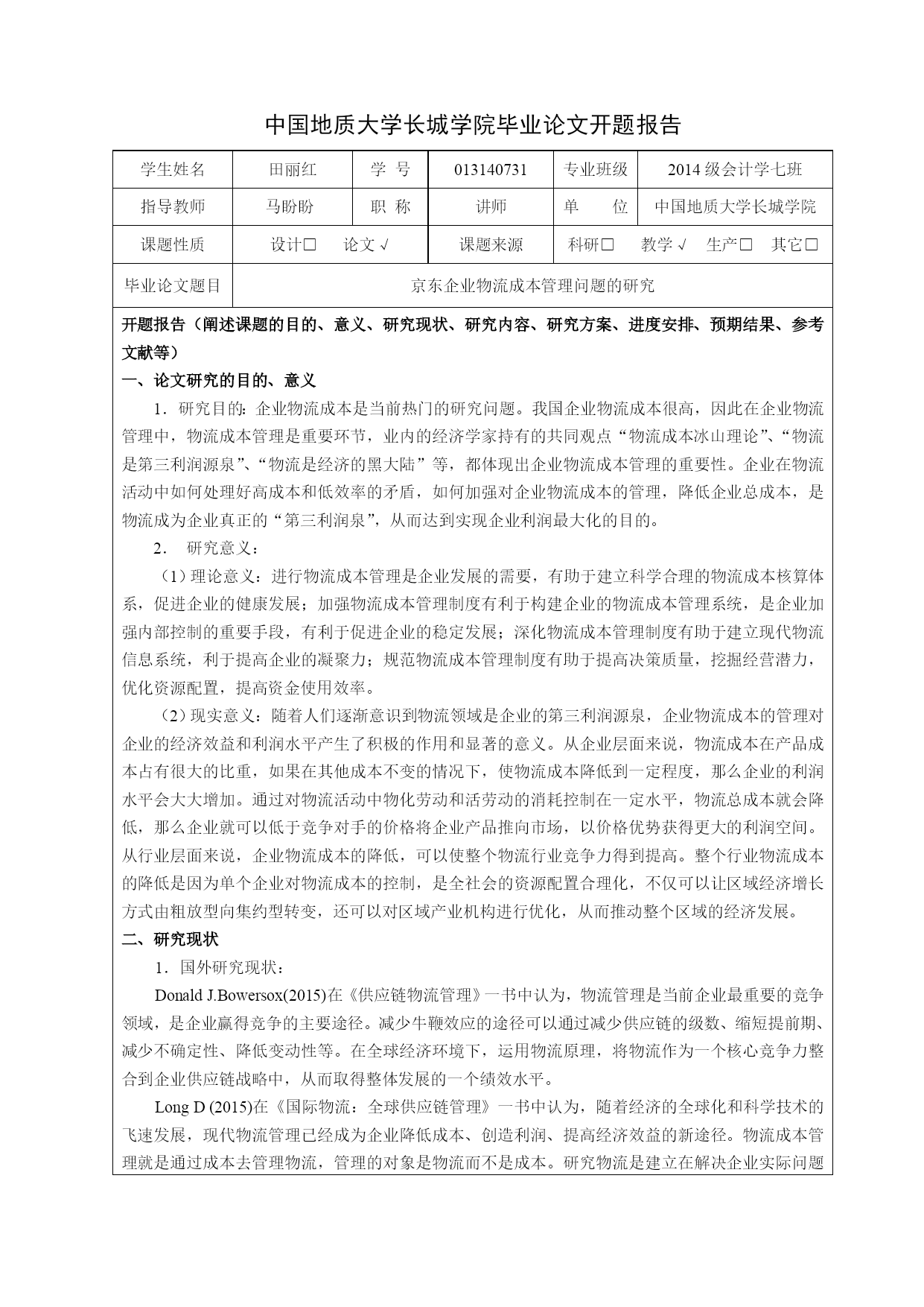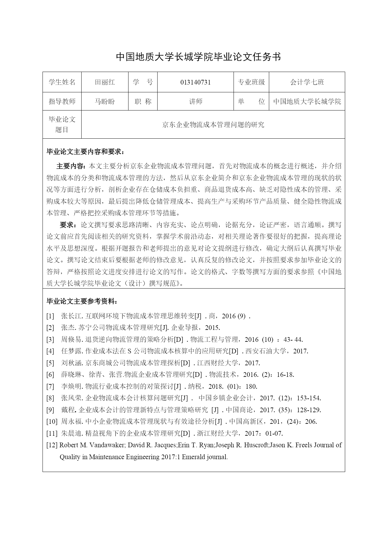 013140731-田丽红-京东企业物流成本管理问题的研究