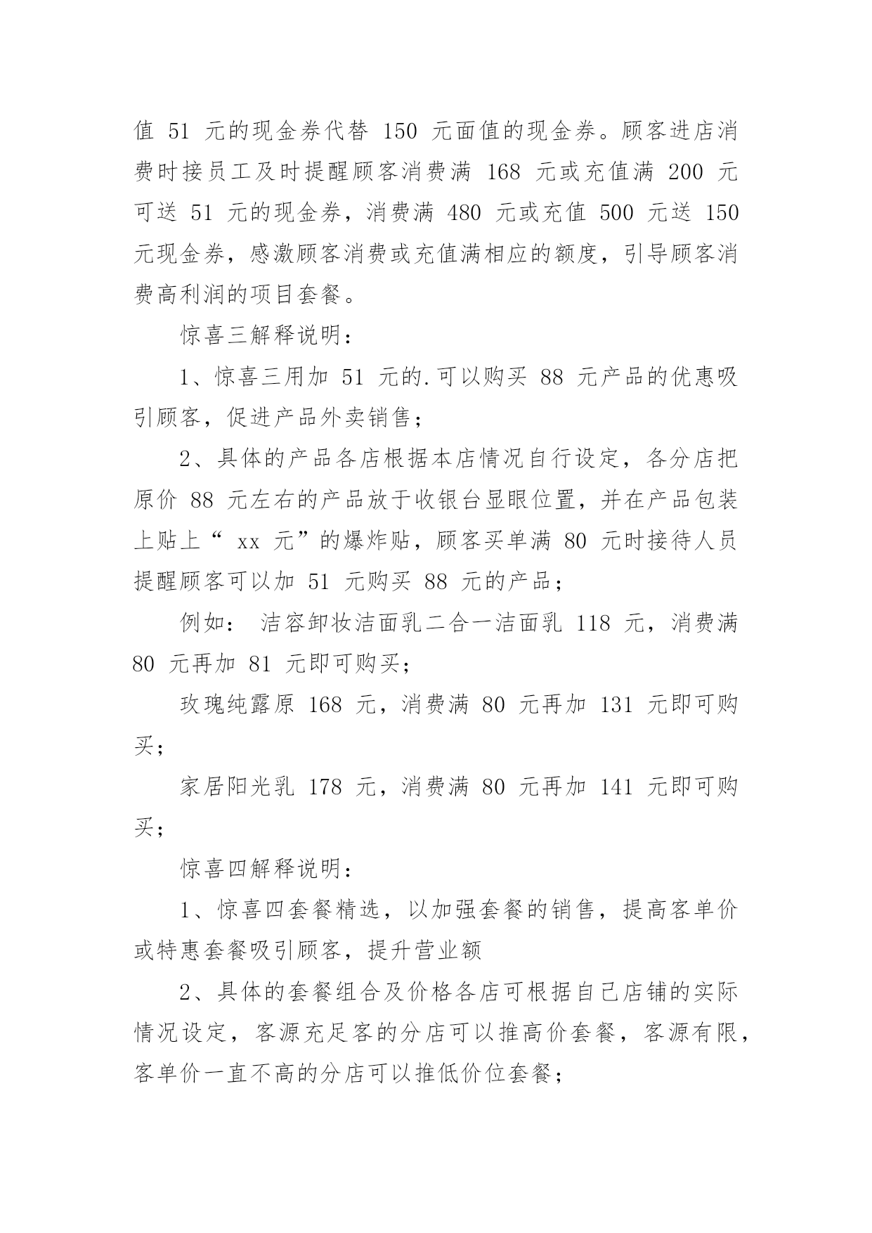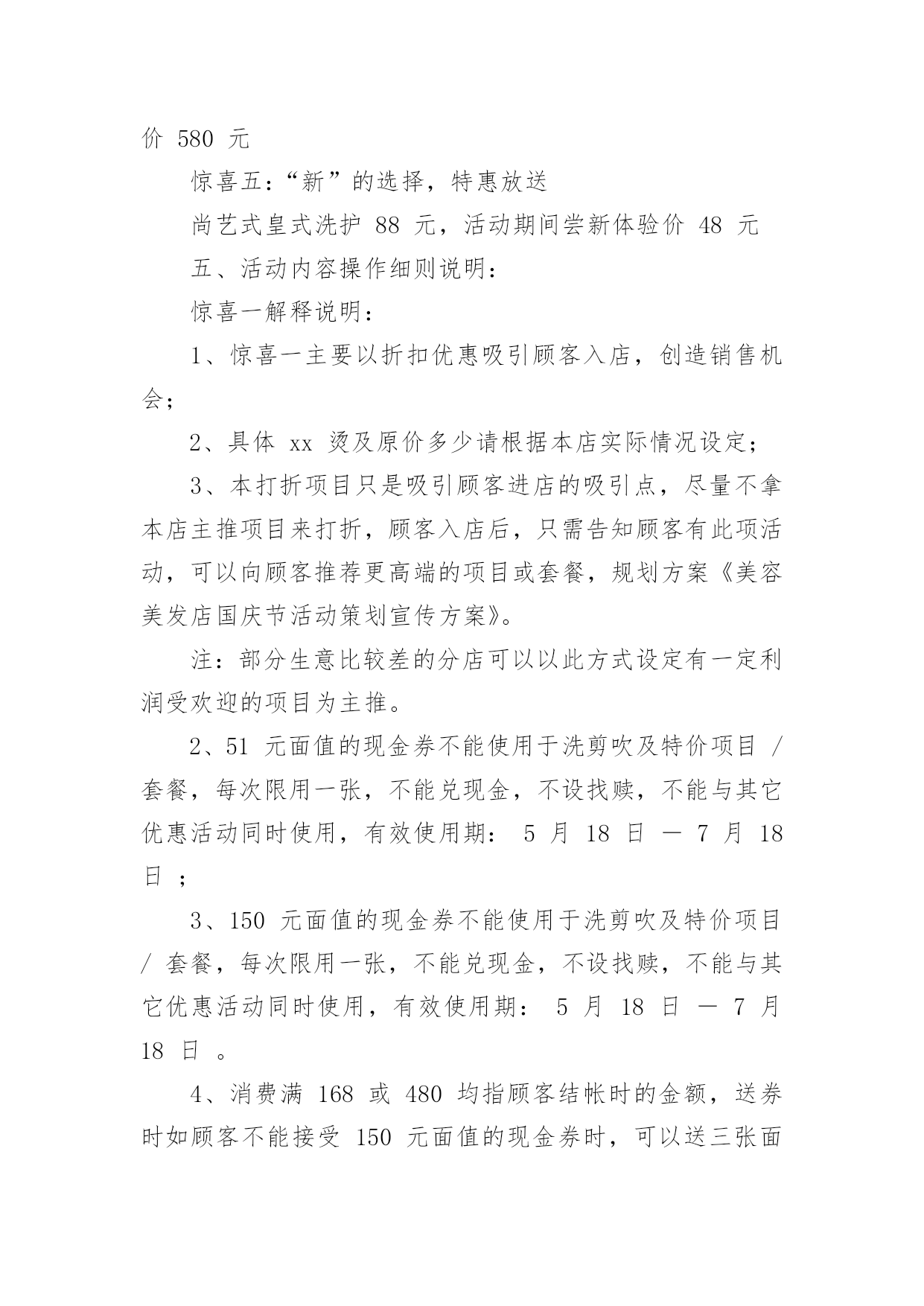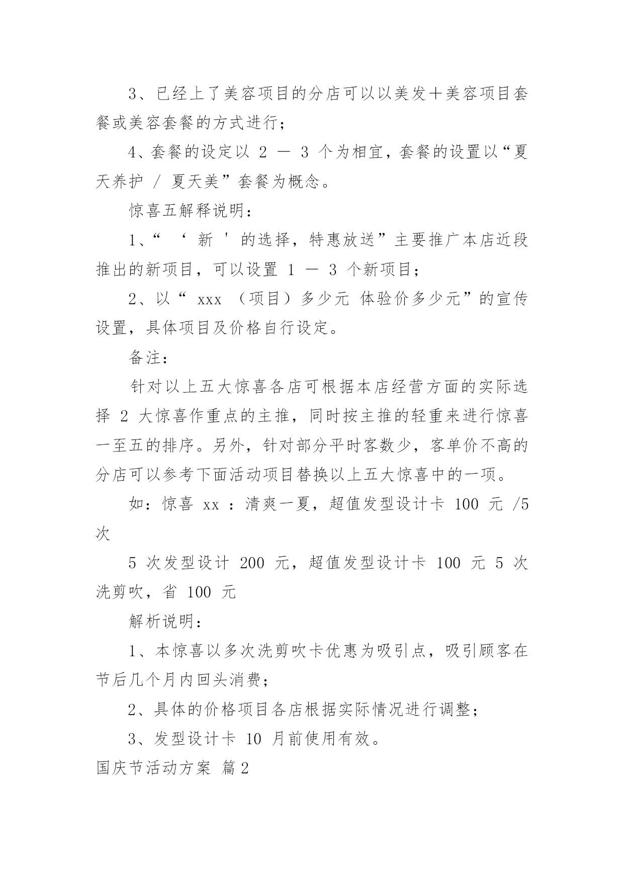 国庆节活动方案【精品】国庆节活动方案范文锦集8篇为确保事情或工作高质量高水平开展,常常需要提前进行细致的方案准备工作,方案是从目的、要求、方式、方法、进度等方面进行安排的书面计划。方案要怎么制定呢?下面是小编收集整理的国庆节活动方案8篇,供大家参考借鉴,希望可以帮助到有需要的朋友。国庆节活动方案篇1活动背景:七天的国庆节假期在一定程度上对消费者的消费热情造成影响,同时去年开始的物价上涨加大了美发店铺的经营成本,美容美发店国庆节活动策划宣传方案。3、假如顾客想购买88元以上的产品可以灵活变通原产品原价基础上给予优惠37元(88-51=37),可以提供更多的高于88元的产品供顾客挑选,同样产品上贴“xx元”的爆炸贴。一、活动主题:“缤纷国庆节,五大惊喜大放送”二、活动日期:9月26日-10月8日三、活动目的:1、利用国庆节期间活动吸引更多的新顾客进店消费,从而扩大顾客群,提高店铺的整体营业额;2、同时通过一系列的促销活动适当引导顾客向高附加值的项目消费或多项目消费,提高客单价及利润;3、让顾客产生好感,提升品牌形象。四、活动内容:惊喜一:天天前5名,低至5.1折想烫就烫,活动期间每天前5名顾客消费原价380元的数码烫可享受5.1折优惠。惊喜二:消费满168送51,消费满480送150一次性消费满168元(或充值200元)送51元的现金券;一次性消费满480元(或充值500元)元送150元的现金券。惊喜三:加“51元”=“88元”活动期间消费80元(或充值200元),加51元可购买原价88元的产品,即省37元;购买88元以上其它美容/美发产品可以优惠37元,详细参与活动产品请向店员咨询。惊喜四:夏日套餐精选,漂亮更出色1、美容超值体验套餐:原价519元,体验价258元(每人限体验一次)皇室spa松筋驻颜术(188元)+中医经络祛黑眼圈(158元)+全息身体理疗(148-188元)=258元2、xx烫368元+xx染286元+xx护理168元+水木年华高效润发58元,原价880元,活动优惠价580元惊喜五:“新”的选择,特惠放送尚艺式皇式洗护88元,活动期间尝新体验价48元五、活动内容操作细则说明:惊喜一解释说明:1、惊喜一主要以折扣优惠吸引顾客入店,创造销售机会;2、具体xx烫及原价多少请根据本店实际情况设定;3、本打折项目只是吸引顾客进店的吸引点,尽量不拿本店主推项目来打折,顾客入店后,只需告知顾客有此项活动,可以向顾客推荐更高端的项目或套餐,规划方案《美容美发店国庆节活动策划宣传方案》。注:部分生意比较差的分店可以以此方式设定有一定利润受欢迎的项目为主推。2、51元面值的现金券不能使用于洗剪吹及特价项目/套餐,每次限用一张,不能兑现金,不设找赎,不能与其它优惠活动同时使用,有效使用期:5月18日-7月18日;3、150元面值的现金券不能使用于洗剪吹及特价项目/套餐,每次限用一张,不能兑现金,不设找赎,不能与其它优惠活动同时使用,有效使用期:5月18日-7月18日。4、消费满168或480均指顾客结帐时的金额,送券时如顾客不能接受150元面值的现金券时,可以送三张面值51元的现金券代替150元面值的现金券。顾客进店消费时接员工及时提醒顾客消费满168元或充值满200元可送51元的现金券,消费满480元或充值500元送150元现金券,感激顾客消费或充值满相应的额度,引导顾客消费高利润的项目套餐。惊喜三解释说明:1、惊喜三用加51元的.可以购买88元产品的优惠吸引顾客,促进产品外卖销售;2、具体的产品各店根据本店情况自行设定,各分店把原价88元左右的产品放于收银台显眼位置,并在产品包装上贴上“xx元”的爆炸贴,顾客买单满80元时接待人员提醒顾客可以加51元购买88元的产品;例如:洁容卸妆洁面乳二合一洁面乳118元,消费满80元再加81元即可购买;玫瑰纯露原168元,消费满80元再加131元即可购买;家居阳光乳178元,消费满80元再加141元即可购买;惊喜四解释说明:1、惊喜四套餐精选,以加强套餐的销售,提高客单价或特惠套餐吸引顾客,提升营业额2、具体的套餐组合及价格各店可根据自己店铺的实际情况设定,客源充足客的分店可以推高价套餐,客源有限,客单价一直不高的分店可以推低价位套餐;3、已经上了美容项目的分店可以以美发+美容项目套餐或美容套餐的方式进行;4、套餐的设定以2-3个为相宜,套餐的设置以“夏天养护/夏天美”套餐为概念。惊喜五解释说明:1、“‘新'的选择,特惠放送”主要推广本店近段推出的新项目,可以设置1-3个新项目;2、以“xxx(项目)多少元体验价多少元”的宣传设置,具体项目及价格自行设定。备注:针对以上五大惊喜各店可根据本店经营方面的实际选择2大惊喜作重点的主推,同时按主推的轻重来进行惊喜一至五的排序。另外,针对部分平时