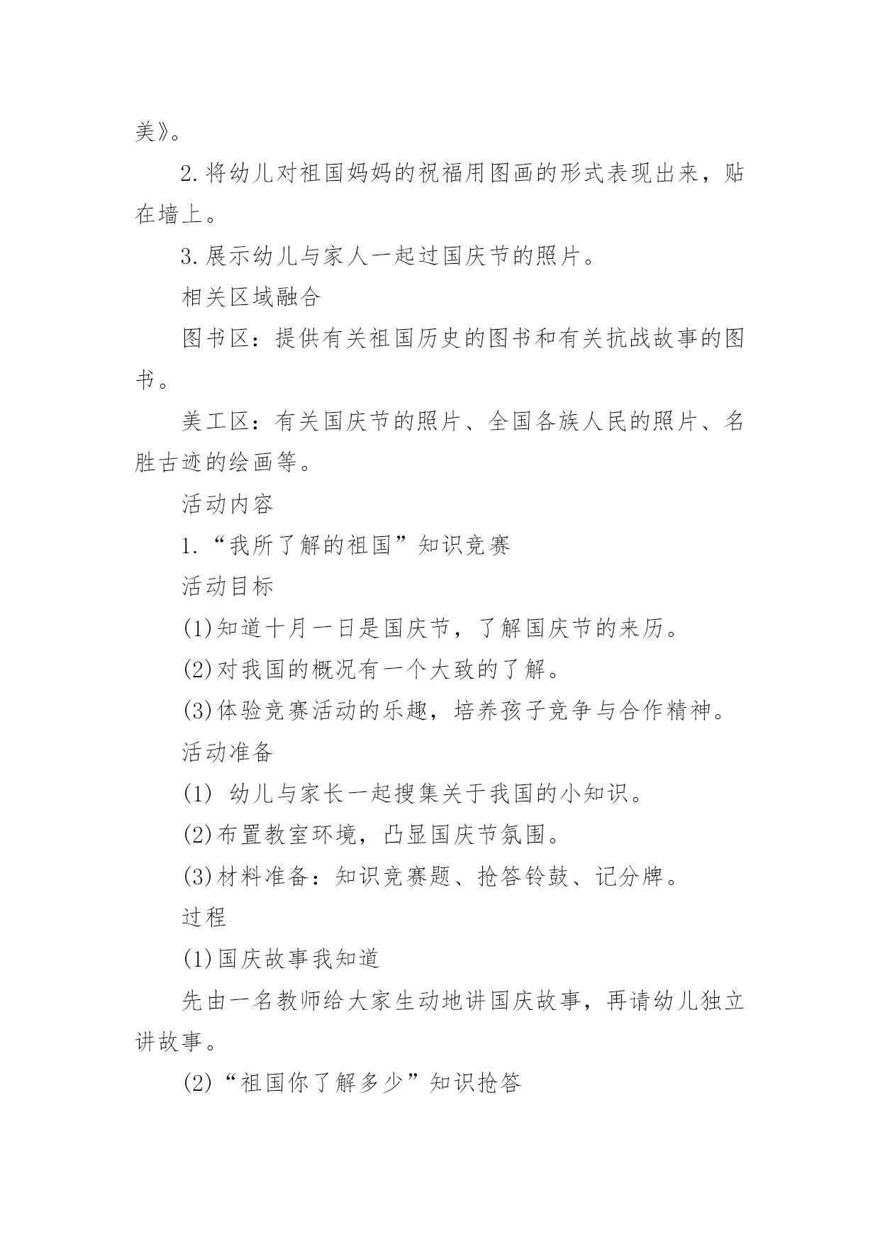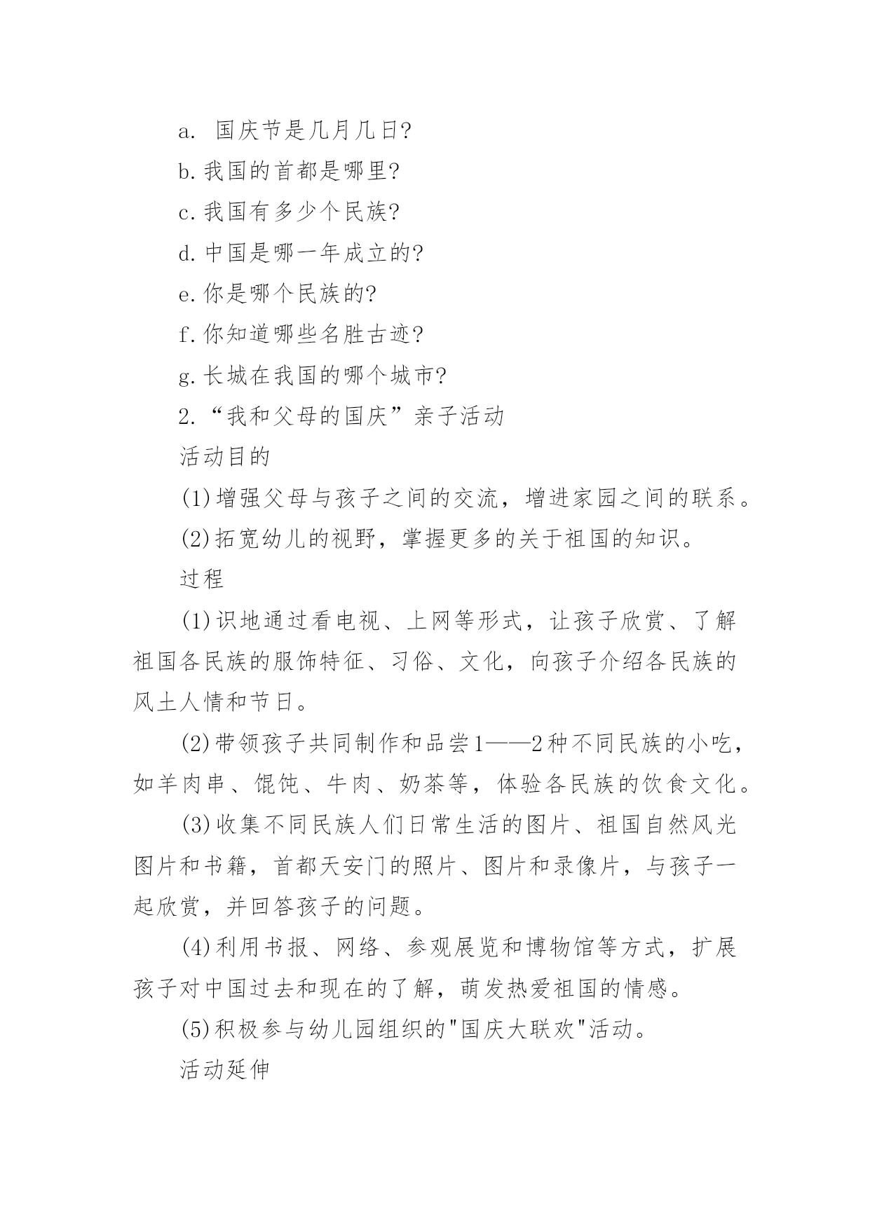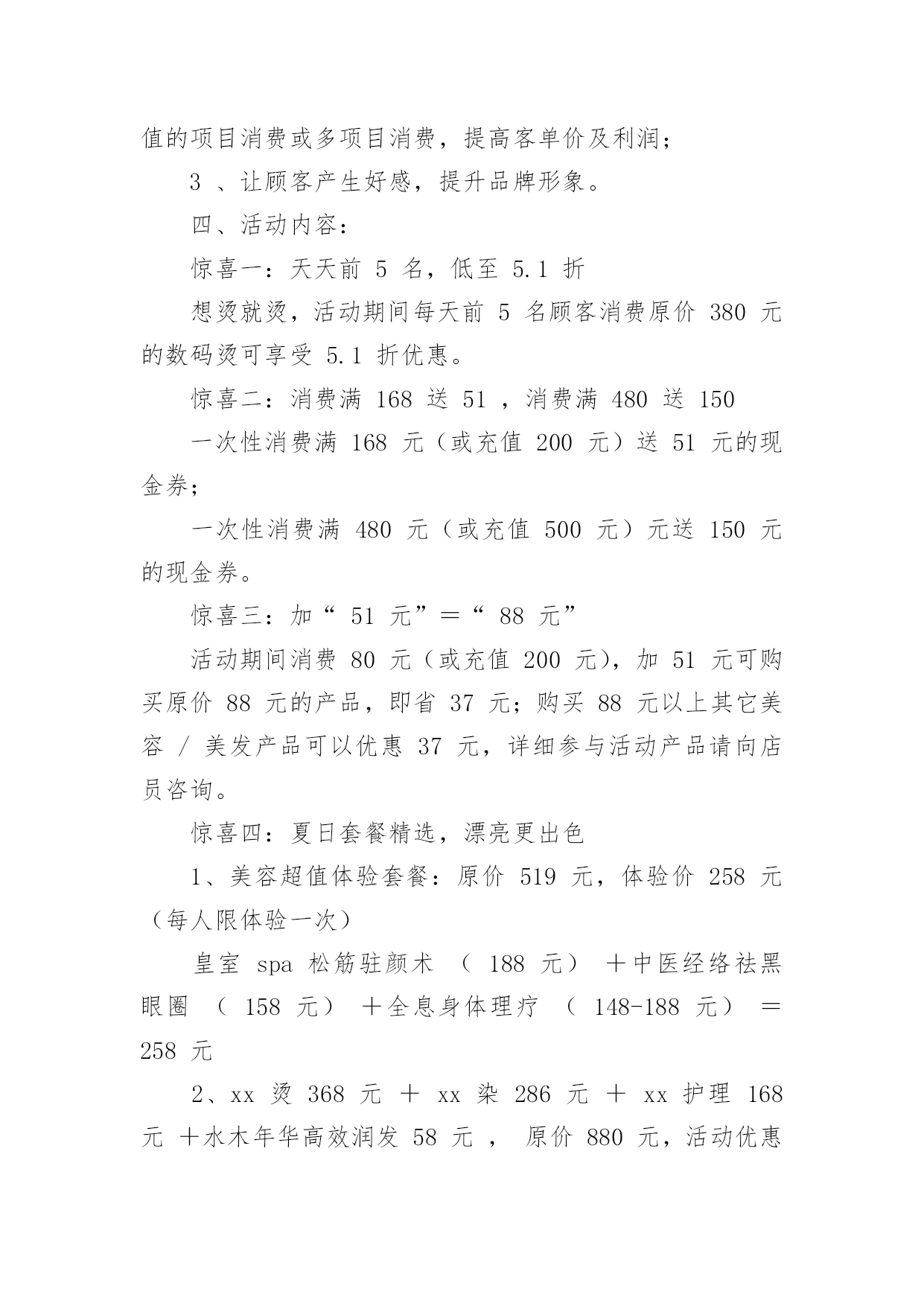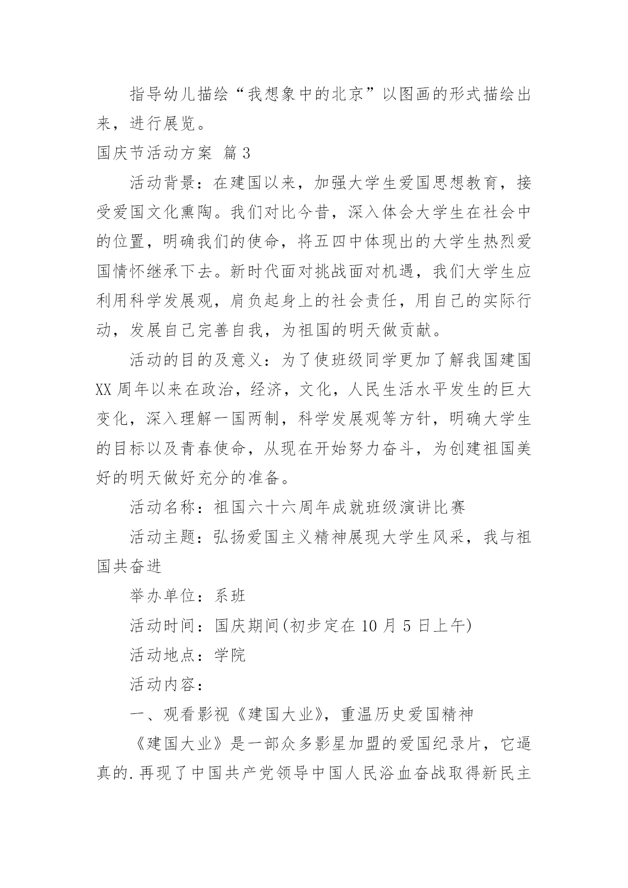 国庆节活动方案【精品】国庆节活动方案范文锦集8篇为确保事情或工作高质量高水平开展,常常需要提前进行细致的方案准备工作,方案是从目的、要求、方式、方法、进度等方面进行安排的书面计划。方案要怎么制定呢?下面是小编收集整理的国庆节活动方案8篇,供大家参考借鉴,希望可以帮助到有需要的朋友。国庆节活动方案篇1活动背景:七天的国庆节假期在一定程度上对消费者的消费热情造成影响,同时去年开始的物价上涨加大了美发店铺的经营成本,美容美发店国庆节活动策划宣传方案。3、假如顾客想购买88元以上的产品可以灵活变通原产品原价基础上给予优惠37元(88-51=37),可以提供更多的高于88元的产品供顾客挑选,同样产品上贴“xx元”的爆炸贴。一、活动主题:“缤纷国庆节,五大惊喜大放送”二、活动日期:9月26日-10月8日三、活动目的:1、利用国庆节期间活动吸引更多的新顾客进店消费,从而扩大顾客群,提高店铺的整体营业额;2、同时通过一系列的促销活动适当引导顾客向高附加值的项目消费或多项目消费,提高客单价及利润;3、让顾客产生好感,提升品牌形象。四、活动内容:惊喜一:天天前5名,低至5.1折想烫就烫,活动期间每天前5名顾客消费原价380元的数码烫可享受5.1折优惠。惊喜二:消费满168送51,消费满480送150一次性消费满168元(或充值200元)送51元的现金券;一次性消费满480元(或充值500元)元送150元的现金券。惊喜三:加“51元”=“88元”活动期间消费80元(或充值200元),加51元可购买原价88元的产品,即省37元;购买88元以上其它美容/美发产品可以优惠37元,详细参与活动产品请向店员咨询。惊喜四:夏日套餐精选,漂亮更出色1、美容超值体验套餐:原价519元,体验价258元(每人限体验一次)皇室spa松筋驻颜术(188元)+中医经络祛黑眼圈(158元)+全息身体理疗(148-188元)=258元2、xx烫368元+xx染286元+xx护理168元+水木年华高效润发58元,原价880元,活动优惠价580元惊喜五:“新”的选择,特惠放送尚艺式皇式洗护88元,活动期间尝新体验价48元五、活动内容操作细则说明:惊喜一解释说明:1、惊喜一主要以折扣优惠吸引顾客入店,创造销售机会;2、具体xx烫及原价多少请根据本店实际情况设定;3、本打折项目只是吸引顾客进店的吸引点,尽量不拿本店主推项目来打折,顾客入店后,只需告知顾客有此项活动,可以向顾客推荐更高端的项目或套餐,规划方案《美容美发店国庆节活动策划宣传方案》。注:部分生意比较差的分店可以以此方式设定有一定利润受欢迎的项目为主推。2、51元面值的现金券不能使用于洗剪吹及特价项目/套餐,每次限用一张,不能兑现金,不设找赎,不能与其它优惠活动同时使用,有效使用期:5月18日-7月18日;3、150元面值的现金券不能使用于洗剪吹及特价项目/套餐,每次限用一张,不能兑现金,不设找赎,不能与其它优惠活动同时使用,有效使用期:5月18日-7月18日。4、消费满168或480均指顾客结帐时的金额,送券时如顾客不能接受150元面值的现金券时,可以送三张面值51元的现金券代替150元面值的现金券。顾客进店消费时接员工及时提醒顾客消费满168元或充值满200元可送51元的现金券,消费满480元或充值500元送150元现金券,感激顾客消费或充值满相应的额度,引导顾客消费高利润的项目套餐。惊喜三解释说明:1、惊喜三用加51元的.可以购买88元产品的优惠吸引顾客,促进产品外卖销售;2、具体的产品各店根据本店情况自行设定,各分店把原价88元左右的产品放于收银台显眼位置,并在产品包装上贴上“xx元”的爆炸贴,顾客买单满80元时接待人员提醒顾客可以加51元购买88元的产品;例如:洁容卸妆洁面乳二合一洁面乳118元,消费满80元再加81元即可购买;玫瑰纯露原168元,消费满80元再加131元即可购买;家居阳光乳178元,消费满80元再加141元即可购买;惊喜四解释说明:1、惊喜四套餐精选,以加强套餐的销售,提高客单价或特惠套餐吸引顾客,提升营业额2、具体的套餐组合及价格各店可根据自己店铺的实际情况设定,客源充足客的分店可以推高价套餐,客源有限,客单价一直不高的分店可以推低价位套餐;3、已经上了美容项目的分店可以以美发+美容项目套餐或美容套餐的方式进行;4、套餐的设定以2-3个为相宜,套餐的设置以“夏天养护/夏天美”套餐为概念。惊喜五解释说明:1、“‘新'的选择,特惠放送”主要推广本店近段推出的新项目,可以设置1-3个新项目;2、以“xxx(项目)多少元体验价多少元”的宣传设置,具体项目及价格自行设定。备注:针对以上五大惊喜各店可根据本店经营方面的实际选择2大惊喜作重点的主推,同时按主推的轻重来进行惊喜一至五的排序。另外,针对部分平时