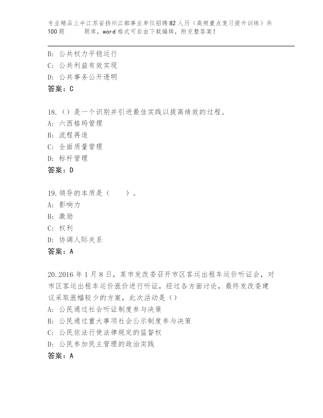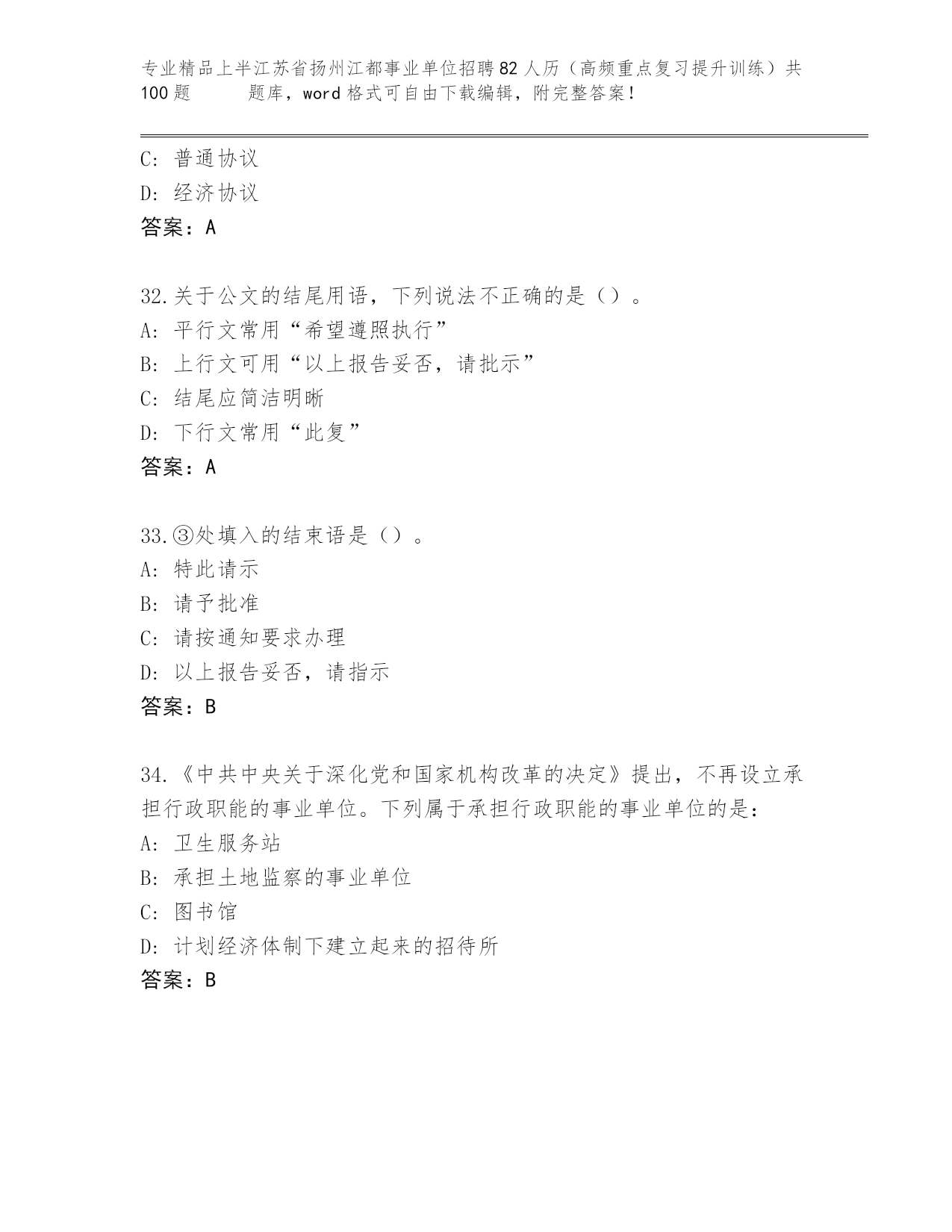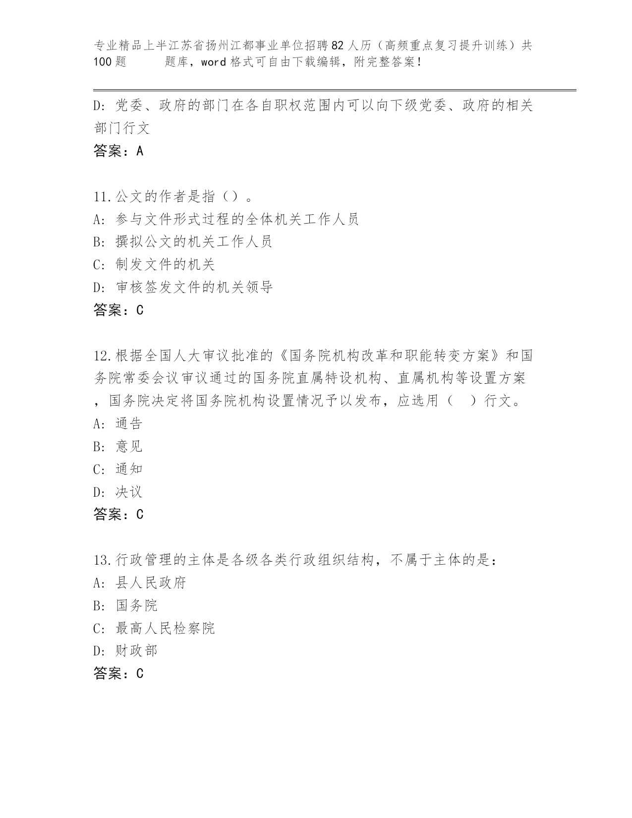 历年上半江苏省扬州江都事业单位招聘82人历(高频重点复习提升训练)共100题 王牌题库及答案参考