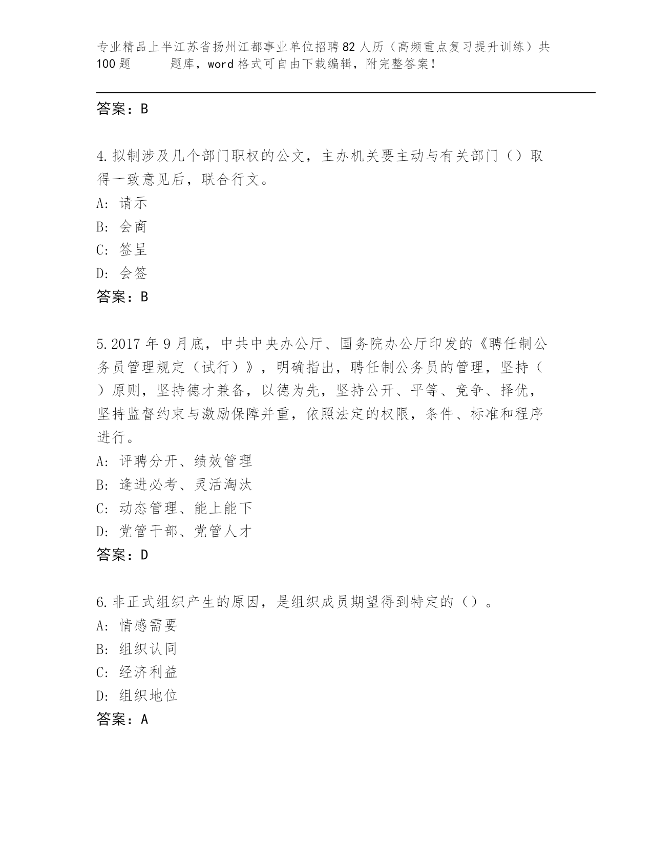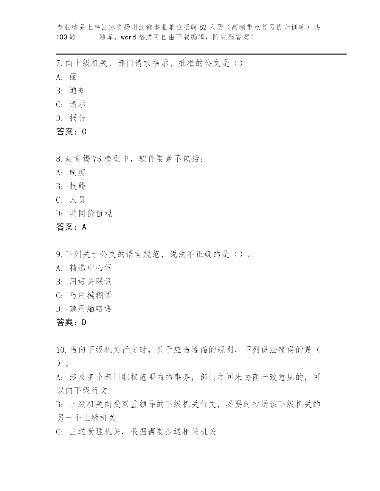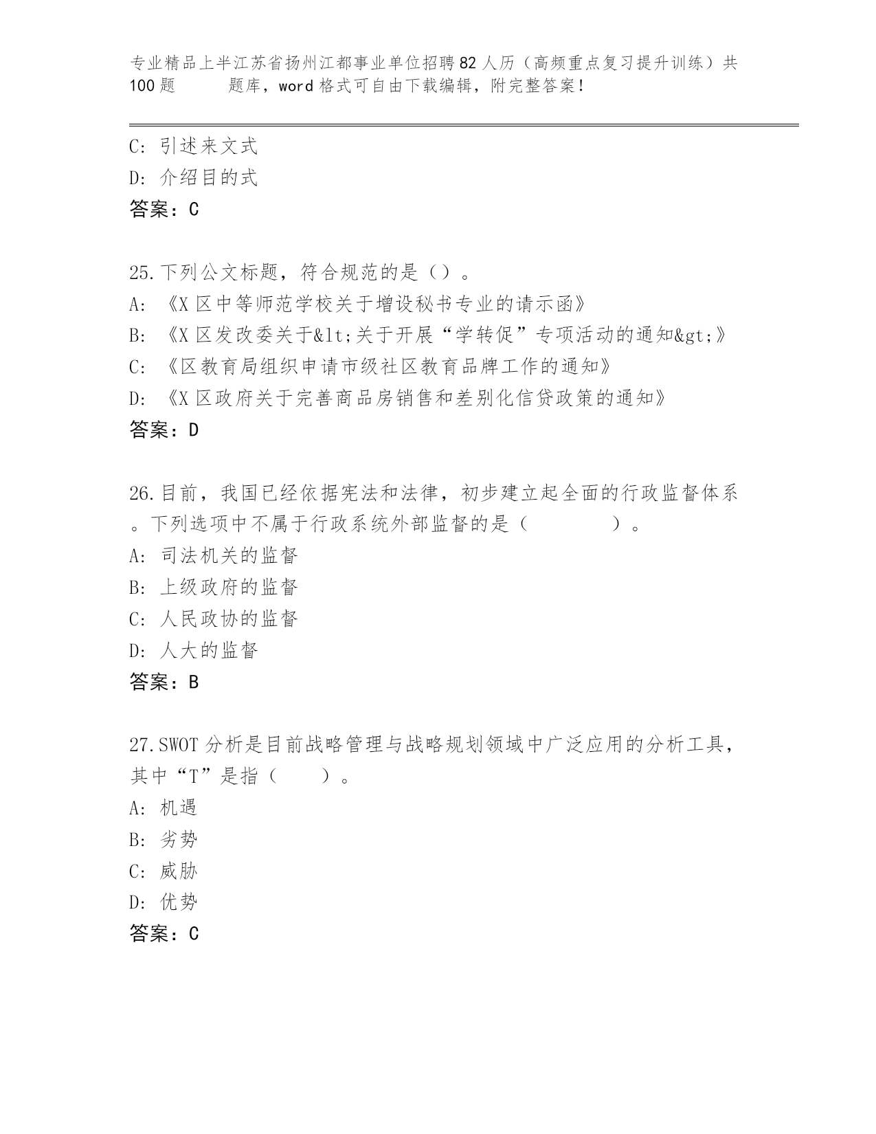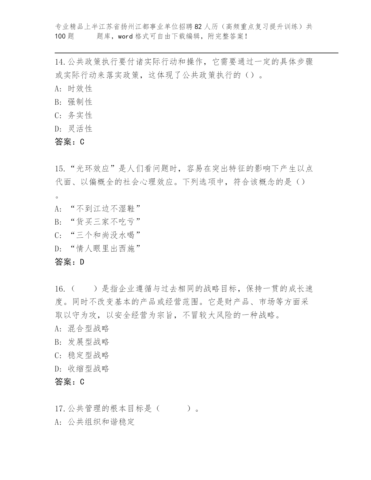 历年上半江苏省扬州江都事业单位招聘82人历(高频重点复习提升训练)共100题 王牌题库及答案参考
