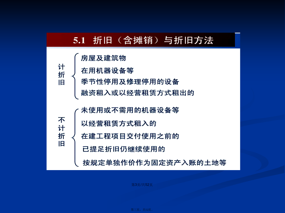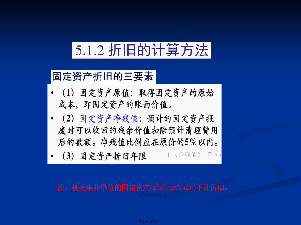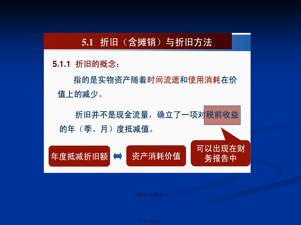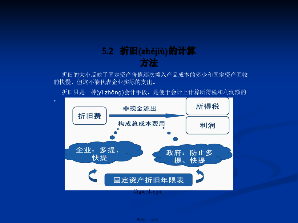 会计学5.2折旧(zhéjiù)的计算方法//2.工作量法例:某卡车原值60000元,预计总行驶里程(lǐchéng)为50万公里;报废时的残值为5%。若本月行驶了4000公里,则该车的月折旧额多少?采用加速折旧法,提高了折旧率,从而加速补偿固定资产的损耗,提前摊销固定资产旧额。从总量来看,其折旧总额没有因加速折旧而改变,改变的只是折旧额计入成本费用的时间(shíjiān)。加速折旧使资金的回收速度阶段性地加快,使纳税人应纳税额在前期减少,后期增加,因而实际上推迟了缴纳税款的时间(shíjiān),等于向政府取得了一笔无需支付利息的贷款。因此,准予采用加速折旧法,实际上是国家给予的一种特殊的缓税或延期纳税优惠。(二)折耗(shéhào)的方法(二)折耗(shéhào)的方法5.2利润(lìrùn)与利润(lìrùn)分配利润分配顺序(shùnxù)5.3所得税的估算(ɡūsuàn)1.流转税类:1)增值税增值税是对商品生产(shāngpǐnshēngchǎn)或流通中各环节的新增价值或商品附加值进行征税。我国实行的增值税基本属于生产型增值税,不允许扣除固定资产中所含的税金。其基本税率为17%,个别货物为13%(粮食、图书、天然气、…)营业税=营业额×税率(shuìlǜ)所得税=(纳税年度收入(shōurù)总额-扣除项目)×税率3.资源税=征税(zhēnɡshuì)数量单位税款4企业(qǐyè)所得税的核算5.4工程项目投资的获取(huòqǔ)利润能力分析5.4.2利润(lìrùn)与利润(lìrùn)分配表/5.4.3计算(jìsuàn)指标5.5工程项目的税后投资(tóuzī)现金流量(三)利润(lìrùn)和现金流量5.5工程项目的税后投资(tóuzī)现金流量(1)初始投资(tóuzī)支出现金流(2)经营期的营业现金净流量可按下列(xiàliè)方法计算例:项目初始投资20万,当年就开始运营,年营业收入20万,经营成本10万,计算期5年,忽略营业税金及附加。按直线折旧每年提折旧31000元;双倍余额折旧的每年折旧额为64000,38400,23040,14780,14780元。所得税率为25%.计算税前、税后的净现金流量(liúliàng)以及相应的内部收益率。序序折旧的抵税作用企业计提折旧会引起成本增加,利润减少,从而(cóngér)使所得税减少。所以折旧可以起到减少税负的作用,即会使企业实际少缴所得税,也就是减少了企业现金流出量,增加了现金净流量。感谢您的观看(guānkàn)!