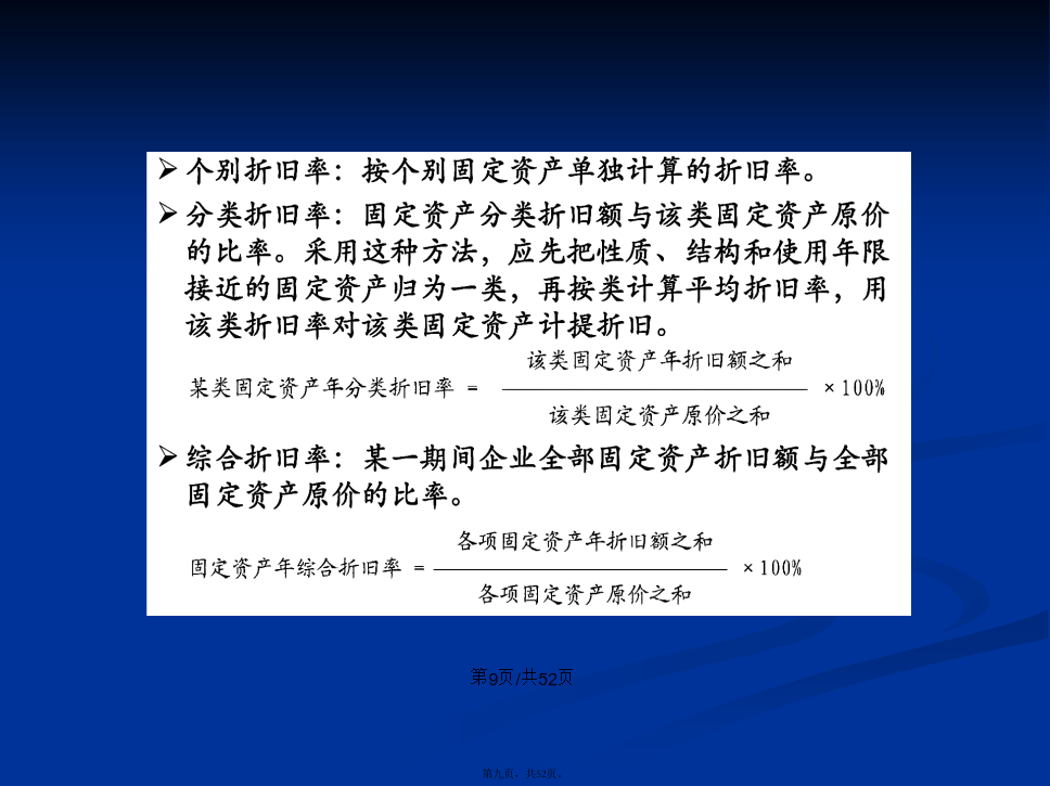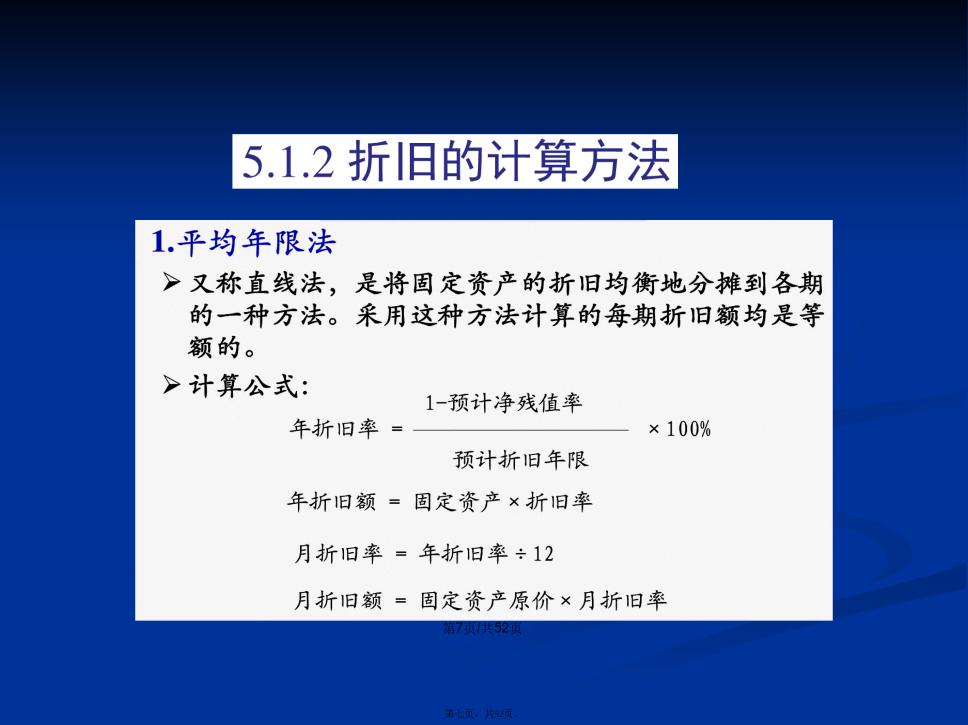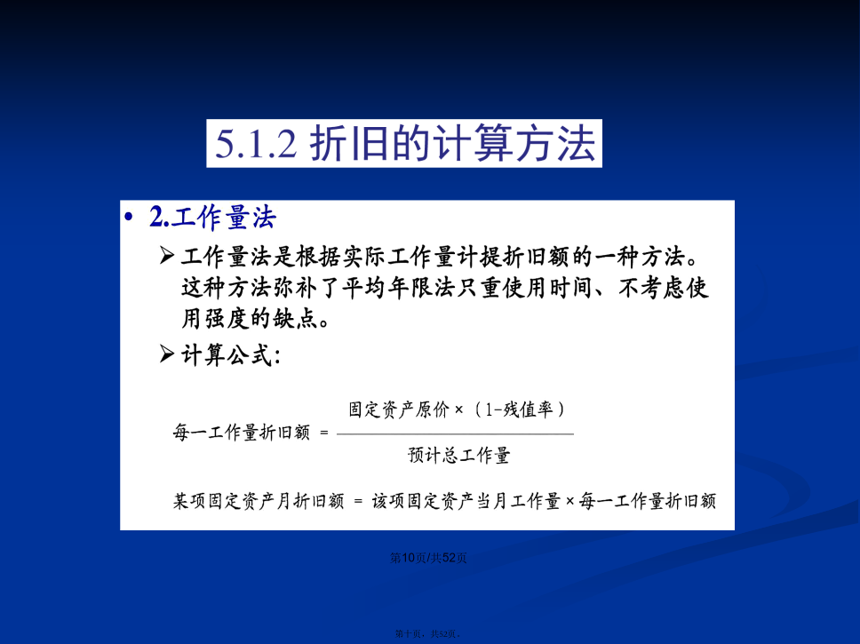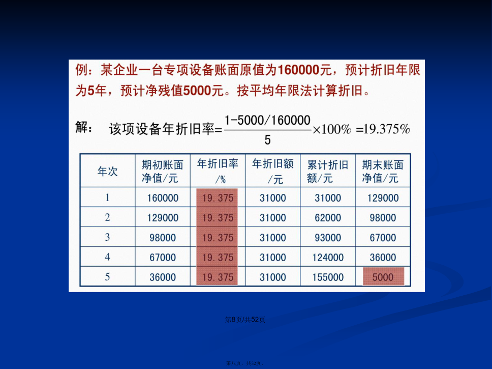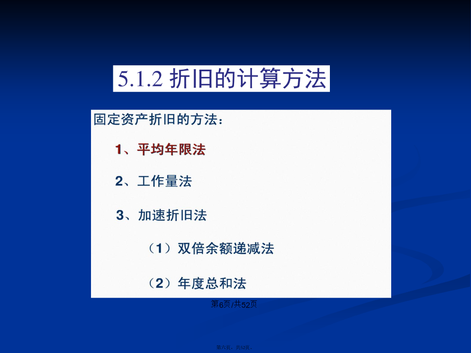 会计学5.2折旧(zhéjiù)的计算方法//2.工作量法例:某卡车原值60000元,预计总行驶里程(lǐchéng)为50万公里;报废时的残值为5%。若本月行驶了4000公里,则该车的月折旧额多少?采用加速折旧法,提高了折旧率,从而加速补偿固定资产的损耗,提前摊销固定资产旧额。从总量来看,其折旧总额没有因加速折旧而改变,改变的只是折旧额计入成本费用的时间(shíjiān)。加速折旧使资金的回收速度阶段性地加快,使纳税人应纳税额在前期减少,后期增加,因而实际上推迟了缴纳税款的时间(shíjiān),等于向政府取得了一笔无需支付利息的贷款。因此,准予采用加速折旧法,实际上是国家给予的一种特殊的缓税或延期纳税优惠。(二)折耗(shéhào)的方法(二)折耗(shéhào)的方法5.2利润(lìrùn)与利润(lìrùn)分配利润分配顺序(shùnxù)5.3所得税的估算(ɡūsuàn)1.流转税类:1)增值税增值税是对商品生产(shāngpǐnshēngchǎn)或流通中各环节的新增价值或商品附加值进行征税。我国实行的增值税基本属于生产型增值税,不允许扣除固定资产中所含的税金。其基本税率为17%,个别货物为13%(粮食、图书、天然气、…)营业税=营业额×税率(shuìlǜ)所得税=(纳税年度收入(shōurù)总额-扣除项目)×税率3.资源税=征税(zhēnɡshuì)数量单位税款4企业(qǐyè)所得税的核算5.4工程项目投资的获取(huòqǔ)利润能力分析5.4.2利润(lìrùn)与利润(lìrùn)分配表/5.4.3计算(jìsuàn)指标5.5工程项目的税后投资(tóuzī)现金流量(三)利润(lìrùn)和现金流量5.5工程项目的税后投资(tóuzī)现金流量(1)初始投资(tóuzī)支出现金流(2)经营期的营业现金净流量可按下列(xiàliè)方法计算例:项目初始投资20万,当年就开始运营,年营业收入20万,经营成本10万,计算期5年,忽略营业税金及附加。按直线折旧每年提折旧31000元;双倍余额折旧的每年折旧额为64000,38400,23040,14780,14780元。所得税率为25%.计算税前、税后的净现金流量(liúliàng)以及相应的内部收益率。序序折旧的抵税作用企业计提折旧会引起成本增加,利润减少,从而(cóngér)使所得税减少。所以折旧可以起到减少税负的作用,即会使企业实际少缴所得税,也就是减少了企业现金流出量,增加了现金净流量。感谢您的观看(guānkàn)!