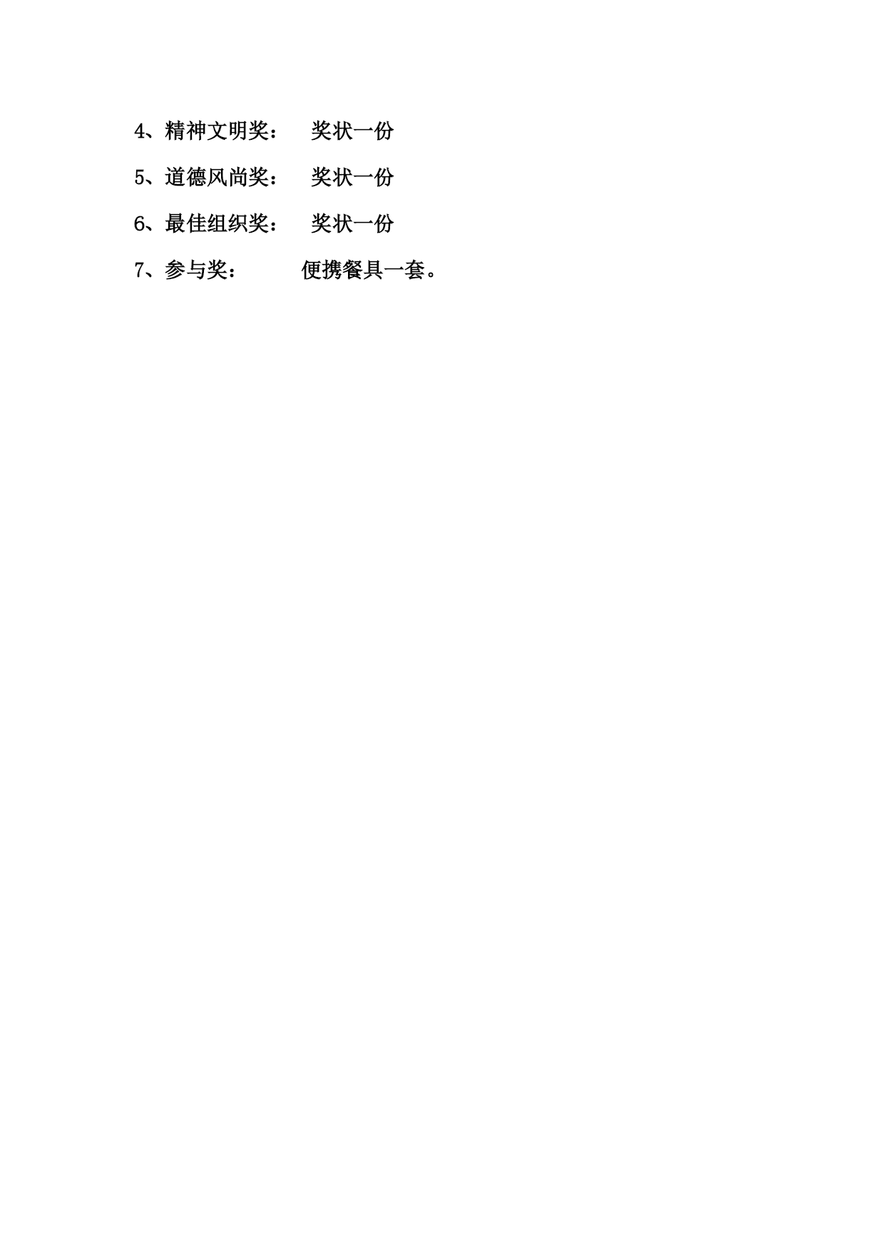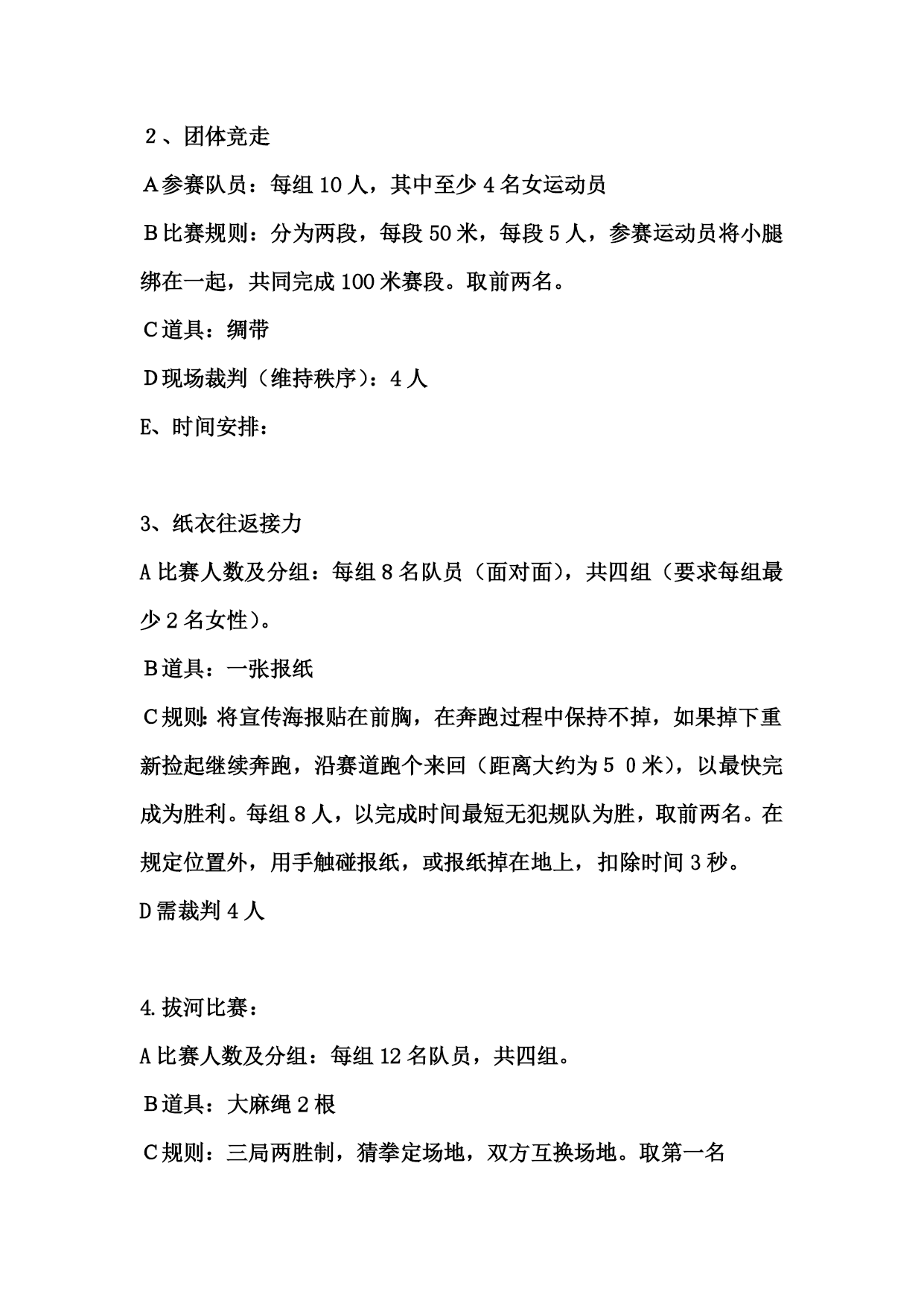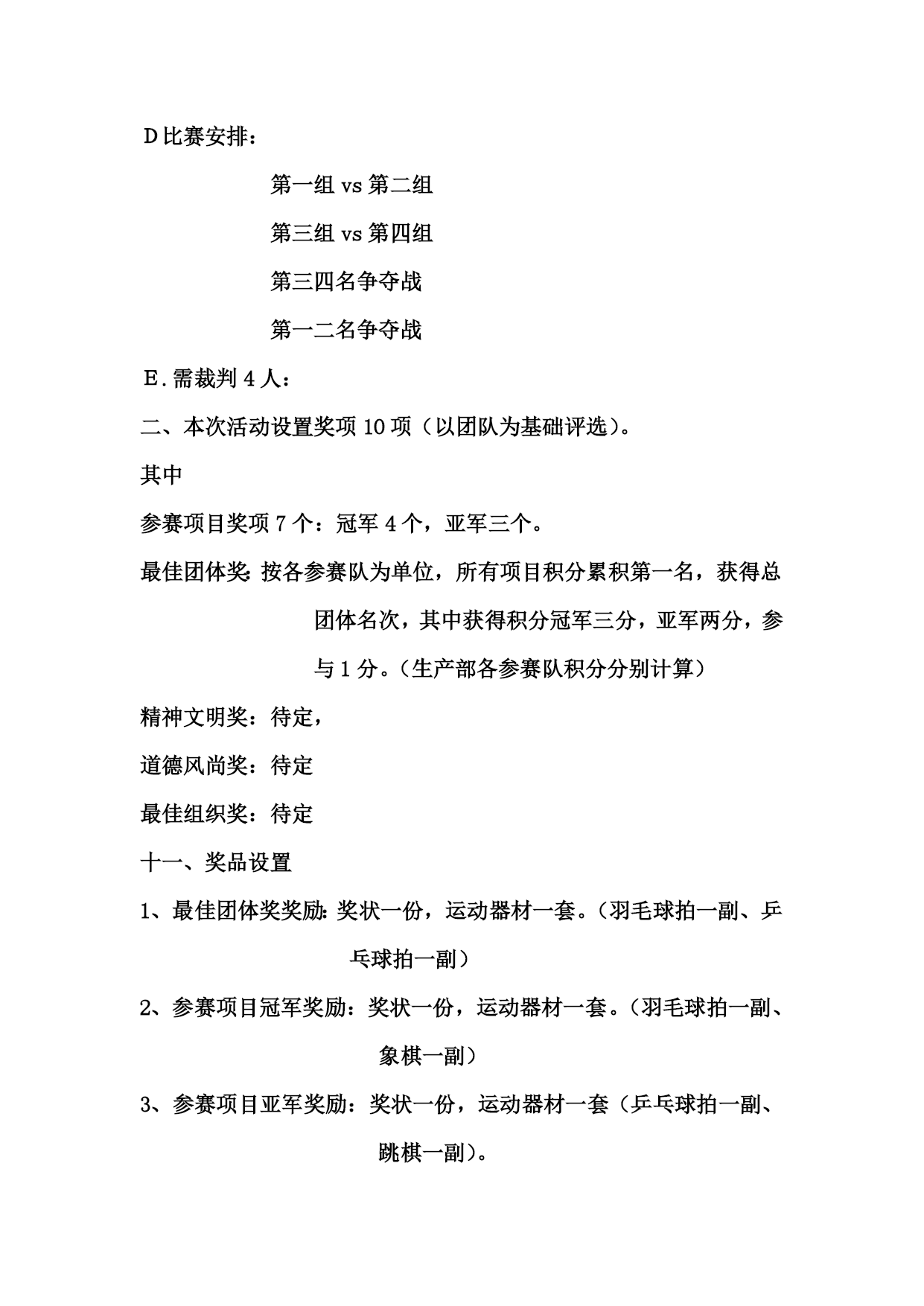 一、活动比赛方法:分组说明:各部门参赛队伍分成四组进行比赛1:侧边传球:A比赛人数及分组:每队10名队员(至少3名女生),共四组。B比赛赛制:一场决定胜负,用时最少的队伍获胜C.比赛规则:1)每个队10名队员依次排开排成一列,间距一臂;2)从第一名队员开始开始向侧边传球,每轮开始传球到传球结束过程中,要求队员不得移动,不得将球从手上脱离,当听到裁判发令后,第一队员将球传给第二名队员,依次类推,当第十名队员接到球后,持球跑到第一名队员前面依次传球,当第九名队员接到球后,持球跑到第十名队员前面依传球,依次轮换传球3)当第一名队员站在最后一位并双手持球后视为比赛结束(比赛过程中,第一名队员是不跑动的)4)在传球过程中,球落地后,须由落地传球队员的前一人捡球后重新传球。比赛场地要求距离为11米,具体站位由比赛队伍自行调配。每次离手扣除时间3秒,每次传球过程中脚步移动扣除3秒。D.比赛纪律:比赛中应绝对服从裁判,以裁判员的判罚为最终判决。取前两名。E.时间安排:第一组vs第二组第三组vs第四组第一名争夺战团体竞走A参赛队员:每组10人,其中至少4名女运动员B比赛规则:分为两段,每段50米,每段5人,参赛运动员将小腿绑在一起,共同完成100米赛段。取前两名。C道具:绸带D现场裁判(维持秩序):4人E、时间安排:3、纸衣往返接力A比赛人数及分组:每组8名队员(面对面),共四组(要求每组最少2名女性)。B道具:一张报纸C规则:将宣传海报贴在前胸,在奔跑过程中保持不掉,如果掉下重新捡起继续奔跑,沿赛道跑个来回(距离大约为50米),以最快完成为胜利。每组8人,以完成时间最短无犯规队为胜,取前两名。在规定位置外,用手触碰报纸,或报纸掉在地上,扣除时间3秒。D需裁判4人4.拔河比赛:A比赛人数及分组:每组12名队员,共四组。B道具:大麻绳2根C规则:三局两胜制,猜拳定场地,双方互换场地。取第一名D比赛安排:第一组vs第二组第三组vs第四组第三四名争夺战第一二名争夺战E.需裁判4人:二、本次活动设置奖项10项(以团队为基础评选)。其中参赛项目奖项7个:冠军4个,亚军三个。最佳团体奖:按各参赛队为单位,所有项目积分累积第一名,获得总团体名次,其中获得积分冠军三分,亚军两分,参与1分。(生产部各参赛队积分分别计算)精神文明奖:待定,道德风尚奖:待定最佳组织奖:待定十一、奖品设置1、最佳团体奖奖励:奖状一份,运动器材一套。(羽毛球拍一副、乒乓球拍一副)2、参赛项目冠军奖励:奖状一份,运动器材一套。(羽毛球拍一副、象棋一副)3、参赛项目亚军奖励:奖状一份,运动器材一套(乒乓球拍一副、跳棋一副)。4、精神文明奖:奖状一份5、道德风尚奖:奖状一份6、最佳组织奖:奖状一份7、参与奖:便携餐具一套。