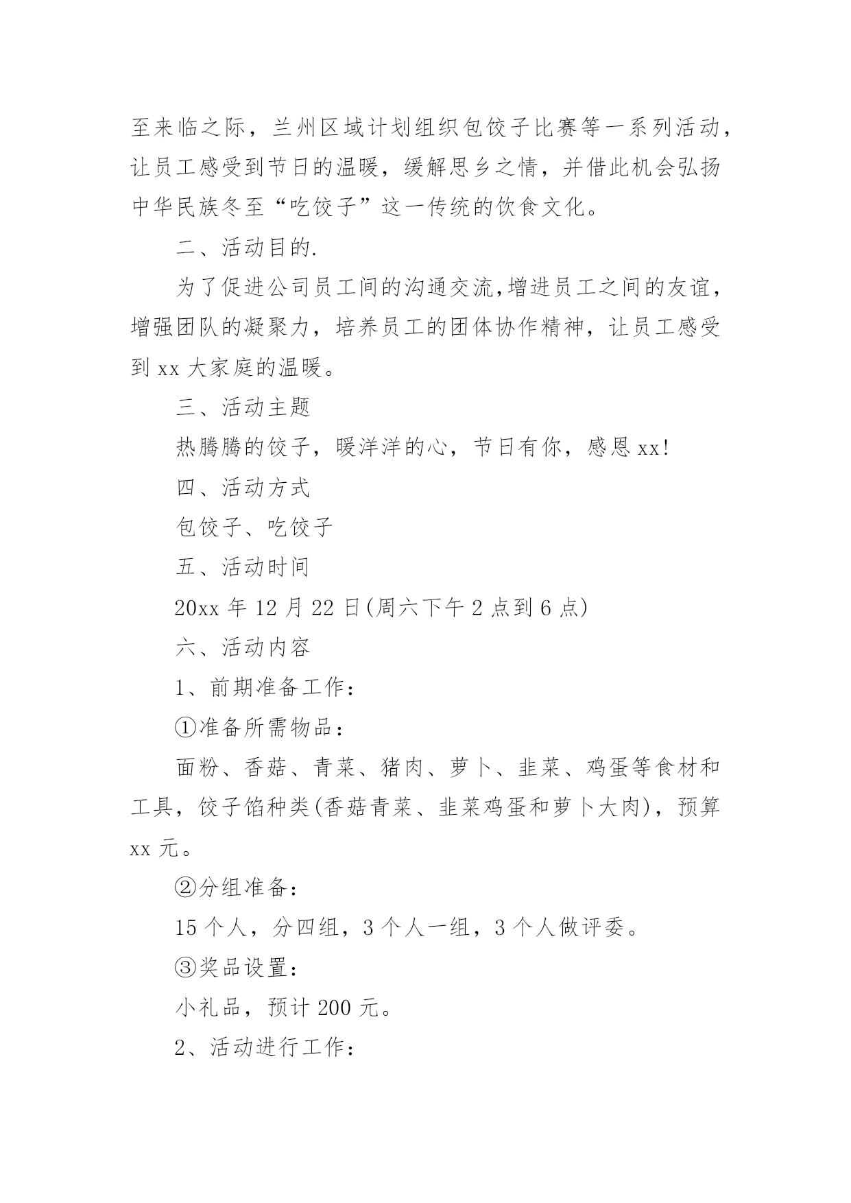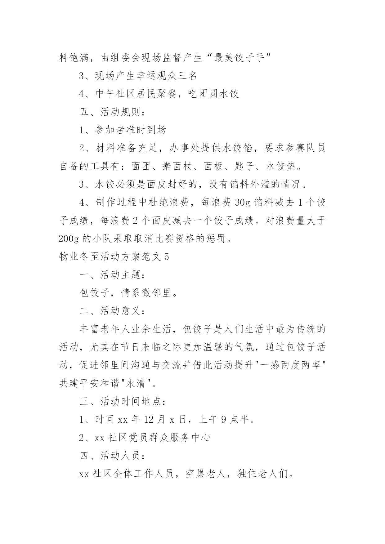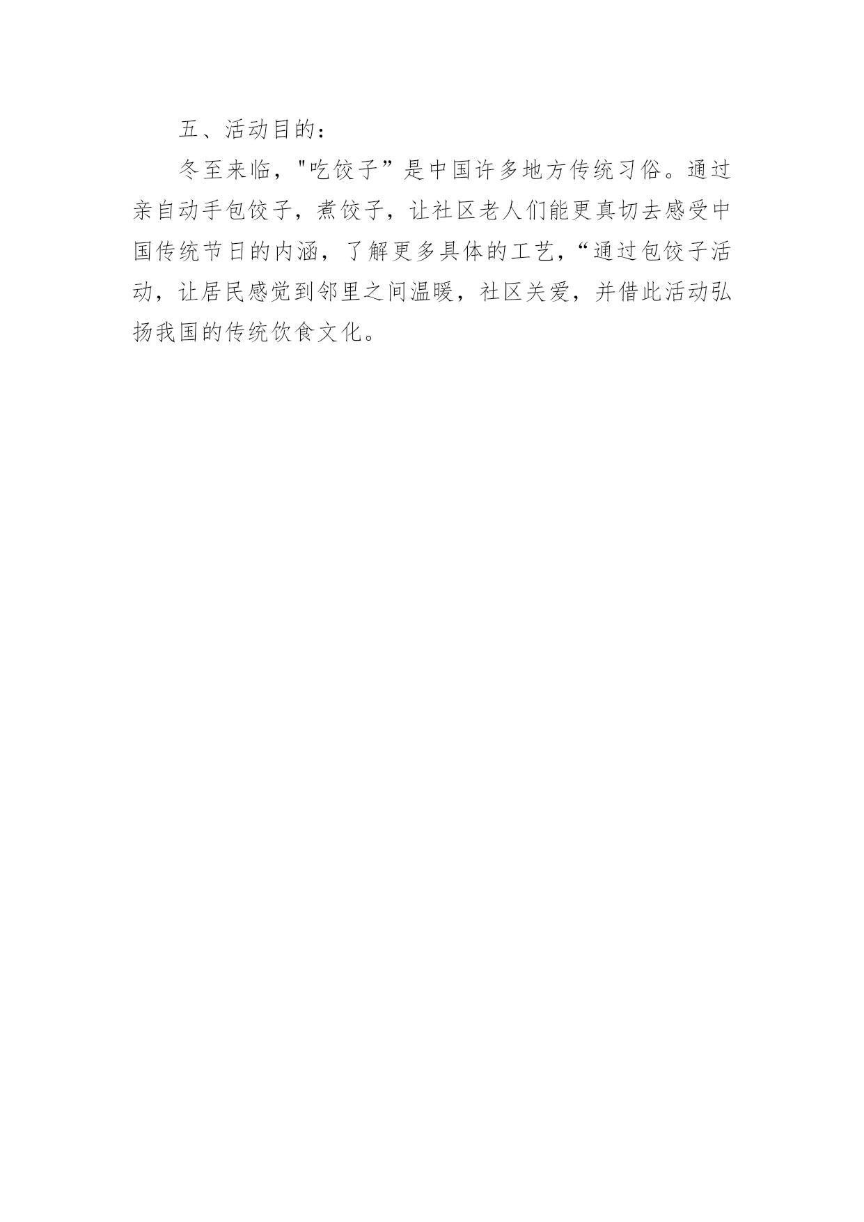 物业冬至活动方案物业冬至活动方案范文为了确保事情或工作有序有效开展,常常需要提前准备一份具体、详细、针对性强的方案,方案是为某一行动所制定的具体行动实施办法细则、步骤和安排等。方案应该怎么制定才好呢?下面是小编为大家收集的物业冬至活动方案范文,仅供参考,希望能够帮助到大家。物业冬至活动方案范文1一、活动主题:冬至有吃饺子的习俗。为了锻炼孩子的动手能力,增长孩子的见识,培养孩子的合作与关爱之情,我们大班组决定举行“包饺子”活动。让孩子们在活动中体验劳动的快乐,分享劳动成果。二、活动目标:1、让孩子们了解冬至节气,还有冬至吃饺子的习俗。2、通过选购原料、拌馅、包饺子、煮饺子、品饺子、喂饺子等活动,丰富孩子体验,提高动手实践的能力。三、活动时间:20xx年x月x日上午9:00——11:00四、参加人员:大班全体老师和幼儿五、活动准备:1、材料准备:饺子馅、餐具、水、盘子、调味品等。2、活动场地:各班教室。六、活动设想:1、事先让孩子了解有关饺子的知识。知道饺子的历史、饺子馅要哪些原料和调料以及是如何搭配的、饺子是如何包的,怎么样煮饺子的。知道包饺子必须带的物品。2、在老师指导下,各班同学分成几个小组,班主任老师作为辅导员,指导本班孩子包饺子、煮饺子,和中班小弟弟、小妹妹共同品尝饺子。七、成果形式:交流体会、品尝饺子、分享劳动成果。八、活动要求:1、活动时,教师做好班级安全工作和卫生教育。2、活动时,教师要求孩子做到不大声喧哗,不自由走动。九、活动流程:1、开展了“包饺子”的活动。2、为弟弟妹妹喂饺子活动。物业冬至活动方案范文2一、活动主题:促进和谐社区,关爱社区弱势群体。二、活动目的与意义:通过实际行动去帮助那些需要帮助的社区弱势群体。通过组织社区冬至活动,深入了解居民生活,切实帮助社区弱势群体生活问题,使社区弱势群体真正感受到集体的温暖,让弱势群体度过一个温暖的冬至之夜。三、活动时间地点:1、时间:12月22日。2、地点:xx社区xx小区四、送温暖活动重点对象:1、孤寡老人:为老人送去冬至团子。2、流动困难儿童:为其送去学习文具。3、残疾困难家庭送上冬至慰问金。五、活动方式:分片区进行摸底,上报孤寡老人、流动困难儿童、残疾困难家庭各一名,汇总后,根据名单和社区党员一起集体走访。1、为孤寡老人送去冬至饺子。2、为流动困难儿童送去学习文具。3、为残疾困难家庭送去大米、食用油。结束语:俗话说,冬至大如年。冬至社区举办活动,让居民们亲手做汤圆、煮饺子等,在继承和发扬民间传统文化的同时,也有力地促进了社区邻里之间的和睦、和谐。物业冬至活动方案范文3一、活动背景冬至时节吃饺子是中国许多地方的传统习俗,在今年冬至来临之际,兰州区域计划组织包饺子比赛等一系列活动,让员工感受到节日的温暖,缓解思乡之情,并借此机会弘扬中华民族冬至“吃饺子”这一传统的饮食文化。二、活动目的.为了促进公司员工间的沟通交流,增进员工之间的友谊,增强团队的凝聚力,培养员工的团体协作精神,让员工感受到xx大家庭的温暖。三、活动主题热腾腾的饺子,暖洋洋的心,节日有你,感恩xx!四、活动方式包饺子、吃饺子五、活动时间20xx年12月22日(周六下午2点到6点)六、活动内容1、前期准备工作:①准备所需物品:面粉、香菇、青菜、猪肉、萝卜、韭菜、鸡蛋等食材和工具,饺子馅种类(香菇青菜、韭菜鸡蛋和萝卜大肉),预算xx元。②分组准备:15个人,分四组,3个人一组,3个人做评委。③奖品设置:小礼品,预计200元。2、活动进行工作:①活动第一项比赛:擀皮速度比赛;②活动第二项比赛:包饺子速度比赛(美观);③活动第三项比赛:知识竞赛(饺子和冬至等相关常识);④活动节目表演。七、活动跟踪活动帖子最迟在12月31日上传至xx社区。物业冬至活动方案范文4一、活动主题:包饺子,连情谊。二、活动意义:包饺子是家庭生活中最为传统的活动,尤其在节日来临的时候更能增加温馨的气氛,通过包饺子比赛,丰富社区居民业余生活,促进邻里间沟通与交流,并借此活动宣传文明城创建知识。三、活动时间地点:1、时间:xx月xx日,上午九点半。2、地点:xx社区xx小区四、活动内容:1、社区居民自由报名,每队两人。计算10分钟内做出的水饺数量,分别决出三对“最快饺子手”。参与有奖,获胜重奖!2、各小组选派一名选手参加“最美饺子”比赛,计算5分钟内做出的“最美饺子”的数量,要求水饺外形美观,馅料饱满,由组委会现场监督产生“最美饺子手”3、现场产生幸运观众三名4、中午社区居民聚餐,吃团圆水饺五、活动规则:1、参加者准时到场2、材料准备充足,办事处提供水饺馅,要求参赛队员自备的工具有:面团、擀面杖、面板、匙子、水饺垫。3、水饺必须是面皮封好的,没有馅料外溢的情况。4、制作过程中杜绝浪费,每浪费30g馅料减去1个饺子成绩,每浪费2个面皮减
