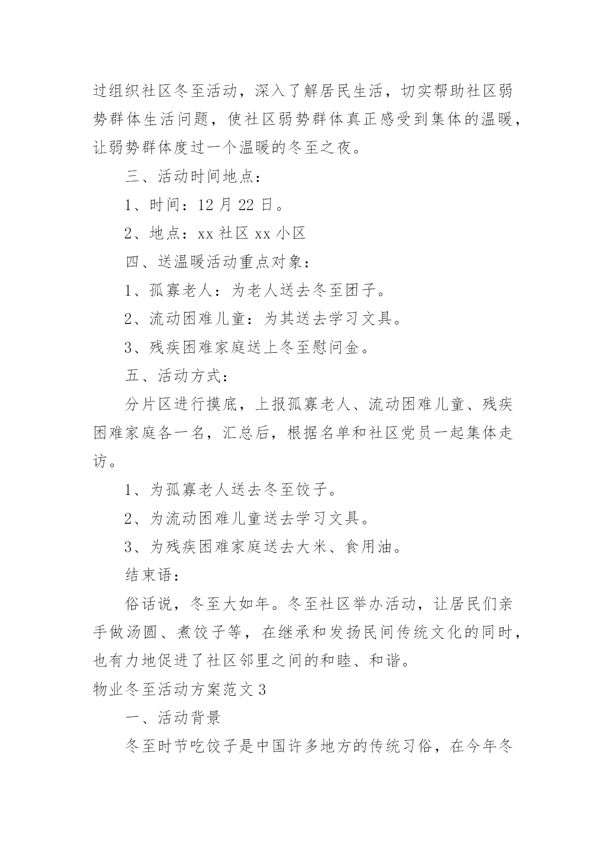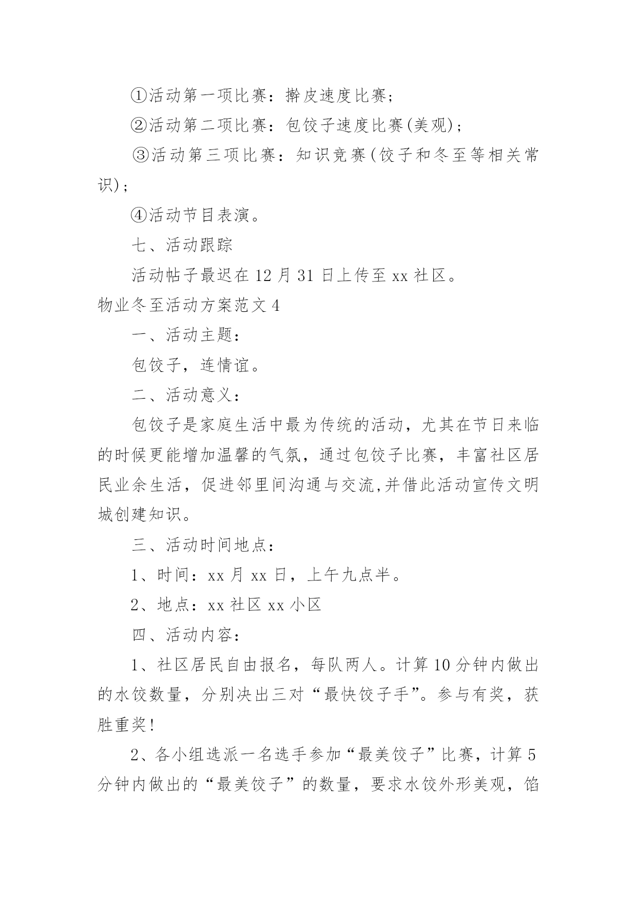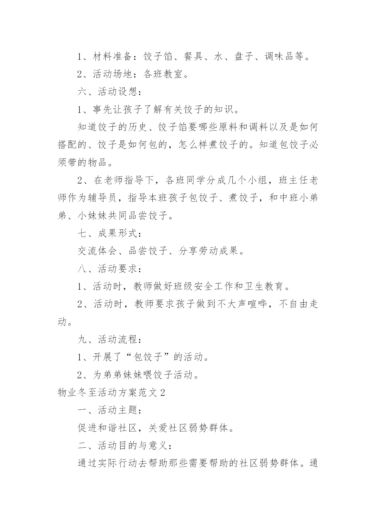 物业冬至活动方案物业冬至活动方案范文为了确保事情或工作有序有效开展,常常需要提前准备一份具体、详细、针对性强的方案,方案是为某一行动所制定的具体行动实施办法细则、步骤和安排等。方案应该怎么制定才好呢?下面是小编为大家收集的物业冬至活动方案范文,仅供参考,希望能够帮助到大家。物业冬至活动方案范文1一、活动主题:冬至有吃饺子的习俗。为了锻炼孩子的动手能力,增长孩子的见识,培养孩子的合作与关爱之情,我们大班组决定举行“包饺子”活动。让孩子们在活动中体验劳动的快乐,分享劳动成果。二、活动目标:1、让孩子们了解冬至节气,还有冬至吃饺子的习俗。2、通过选购原料、拌馅、包饺子、煮饺子、品饺子、喂饺子等活动,丰富孩子体验,提高动手实践的能力。三、活动时间:20xx年x月x日上午9:00——11:00四、参加人员:大班全体老师和幼儿五、活动准备:1、材料准备:饺子馅、餐具、水、盘子、调味品等。2、活动场地:各班教室。六、活动设想:1、事先让孩子了解有关饺子的知识。知道饺子的历史、饺子馅要哪些原料和调料以及是如何搭配的、饺子是如何包的,怎么样煮饺子的。知道包饺子必须带的物品。2、在老师指导下,各班同学分成几个小组,班主任老师作为辅导员,指导本班孩子包饺子、煮饺子,和中班小弟弟、小妹妹共同品尝饺子。七、成果形式:交流体会、品尝饺子、分享劳动成果。八、活动要求:1、活动时,教师做好班级安全工作和卫生教育。2、活动时,教师要求孩子做到不大声喧哗,不自由走动。九、活动流程:1、开展了“包饺子”的活动。2、为弟弟妹妹喂饺子活动。物业冬至活动方案范文2一、活动主题:促进和谐社区,关爱社区弱势群体。二、活动目的与意义:通过实际行动去帮助那些需要帮助的社区弱势群体。通过组织社区冬至活动,深入了解居民生活,切实帮助社区弱势群体生活问题,使社区弱势群体真正感受到集体的温暖,让弱势群体度过一个温暖的冬至之夜。三、活动时间地点:1、时间:12月22日。2、地点:xx社区xx小区四、送温暖活动重点对象:1、孤寡老人:为老人送去冬至团子。2、流动困难儿童:为其送去学习文具。3、残疾困难家庭送上冬至慰问金。五、活动方式:分片区进行摸底,上报孤寡老人、流动困难儿童、残疾困难家庭各一名,汇总后,根据名单和社区党员一起集体走访。1、为孤寡老人送去冬至饺子。2、为流动困难儿童送去学习文具。3、为残疾困难家庭送去大米、食用油。结束语:俗话说,冬至大如年。冬至社区举办活动,让居民们亲手做汤圆、煮饺子等,在继承和发扬民间传统文化的同时,也有力地促进了社区邻里之间的和睦、和谐。物业冬至活动方案范文3一、活动背景冬至时节吃饺子是中国许多地方的传统习俗,在今年冬至来临之际,兰州区域计划组织包饺子比赛等一系列活动,让员工感受到节日的温暖,缓解思乡之情,并借此机会弘扬中华民族冬至“吃饺子”这一传统的饮食文化。二、活动目的.为了促进公司员工间的沟通交流,增进员工之间的友谊,增强团队的凝聚力,培养员工的团体协作精神,让员工感受到xx大家庭的温暖。三、活动主题热腾腾的饺子,暖洋洋的心,节日有你,感恩xx!四、活动方式包饺子、吃饺子五、活动时间20xx年12月22日(周六下午2点到6点)六、活动内容1、前期准备工作:①准备所需物品:面粉、香菇、青菜、猪肉、萝卜、韭菜、鸡蛋等食材和工具,饺子馅种类(香菇青菜、韭菜鸡蛋和萝卜大肉),预算xx元。②分组准备:15个人,分四组,3个人一组,3个人做评委。③奖品设置:小礼品,预计200元。2、活动进行工作:①活动第一项比赛:擀皮速度比赛;②活动第二项比赛:包饺子速度比赛(美观);③活动第三项比赛:知识竞赛(饺子和冬至等相关常识);④活动节目表演。七、活动跟踪活动帖子最迟在12月31日上传至xx社区。物业冬至活动方案范文4一、活动主题:包饺子,连情谊。二、活动意义:包饺子是家庭生活中最为传统的活动,尤其在节日来临的时候更能增加温馨的气氛,通过包饺子比赛,丰富社区居民业余生活,促进邻里间沟通与交流,并借此活动宣传文明城创建知识。三、活动时间地点:1、时间:xx月xx日,上午九点半。2、地点:xx社区xx小区四、活动内容:1、社区居民自由报名,每队两人。计算10分钟内做出的水饺数量,分别决出三对“最快饺子手”。参与有奖,获胜重奖!2、各小组选派一名选手参加“最美饺子”比赛,计算5分钟内做出的“最美饺子”的数量,要求水饺外形美观,馅料饱满,由组委会现场监督产生“最美饺子手”3、现场产生幸运观众三名4、中午社区居民聚餐,吃团圆水饺五、活动规则:1、参加者准时到场2、材料准备充足,办事处提供水饺馅,要求参赛队员自备的工具有:面团、擀面杖、面板、匙子、水饺垫。3、水饺必须是面皮封好的,没有馅料外溢的情况。4、制作过程中杜绝浪费,每浪费30g馅料减去1个饺子成绩,每浪费2个面皮减