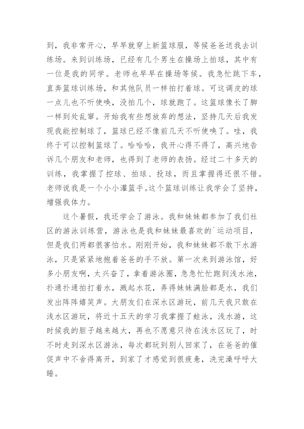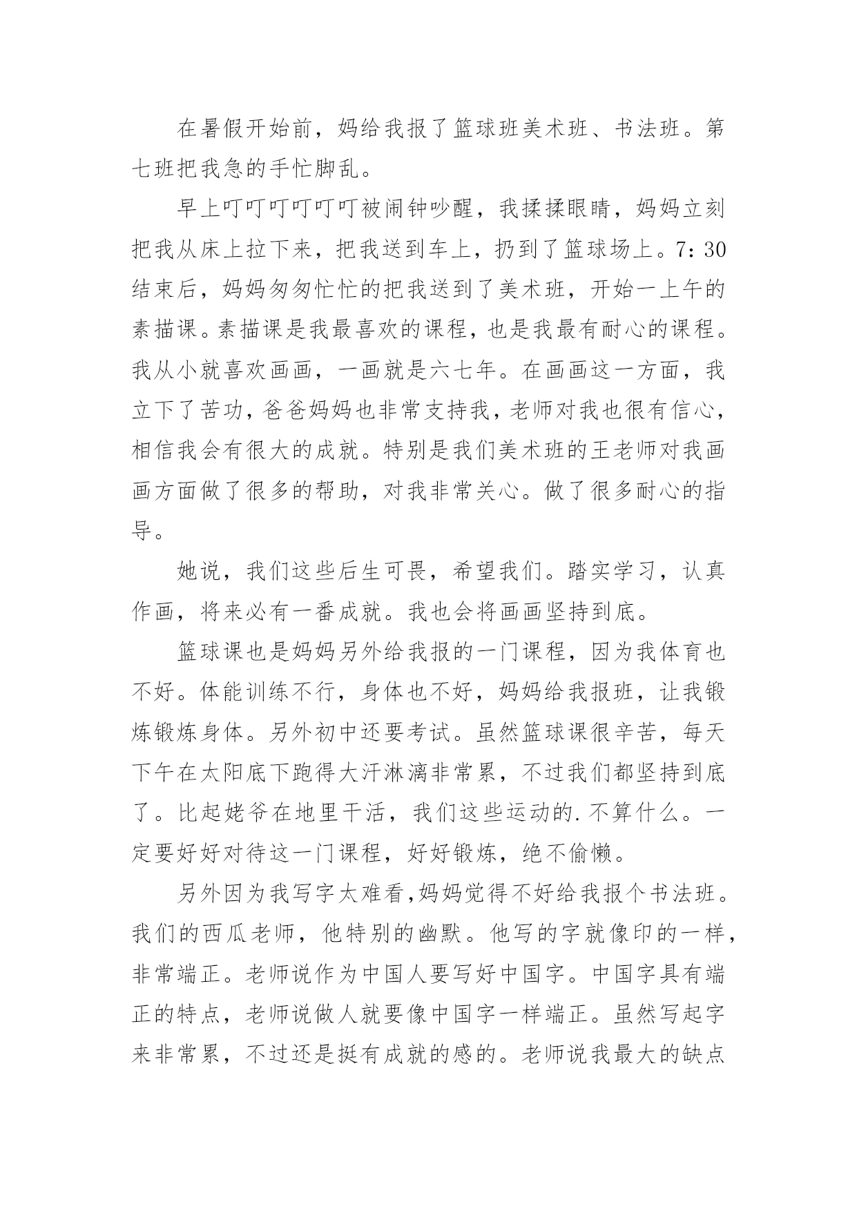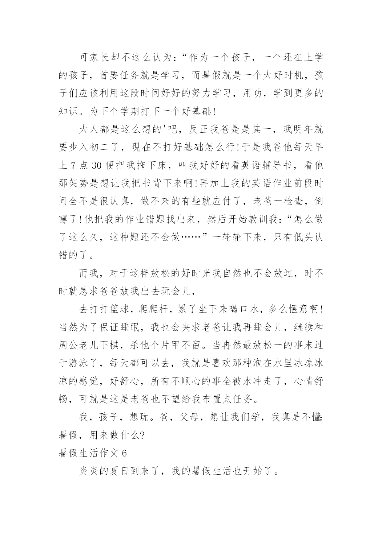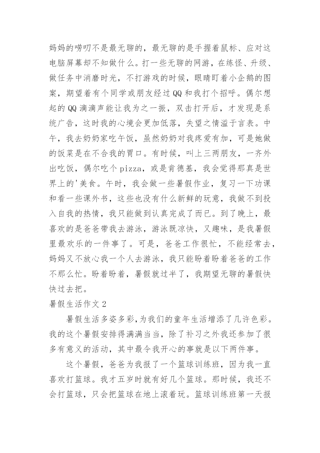 暑假生活作文暑假生活作文[优秀]无论在学习、工作或是生活中,大家总免不了要接触或使用作文吧,作文是通过文字来表达一个主题意义的记叙方法。为了让您在写作文时更加简单方便,下面是小编精心整理的暑假生活作文,仅供参考,欢迎大家阅读。暑假生活作文1暑假刚刚过半,而我却盼着开学了。这与上学期期末的时候盼着放暑假刚刚相反,此刻反而觉得在学校的生活比较趣味,要明白,我的暑假太平淡了,平淡到像一杯装在玻璃杯中的白开水,透过玻璃杯,一眼就能看出,里面只是开水而已,没有一点盛红酒的高脚杯想象力。要说有多么平淡,请听我慢慢道来。我早上8点准时自然醒,梳洗完毕后,和爸爸妈妈一齐吃早饭。这早饭的资料也是毫无想象力,牛奶、鸡蛋、面包。偶尔爸爸会买来豆浆和油条,这也让我感到无比的惊喜,吃着都将和有条,我会觉得十分的有滋味。吃早饭的同时,我默默地遭受着妈妈的唠叨,唠叨我不要整天上网玩游戏,唠叨我要多复习功课,唠叨我上的辅导班要好好学。偶尔,爸爸会和我讲一些时事和笑话,这才会激起我说话的欲望,我和爸爸往往能款款而谈,这顿早饭吃得也会让我的心境豁然开朗。爸爸妈妈出门后,我一个人在家更无聊了,此时会觉得妈妈的唠叨不是最无聊的,最无聊的是手握着鼠标、应对这电脑屏幕却不知做什么。打一些无聊的网游,在练怪、升级、做任务中消磨时光,不打游戏的时候,眼睛盯着小企鹅的图案,期望着有个同学或朋友经过QQ和我打个招呼。偶尔想起的QQ滴滴声能让我为之一振,双击打开后,才发现是系统广告,这时我的心境会更加低落,失望之情溢于言表。中午,我去奶奶家吃午饭,虽然奶奶对我疼爱有加,可是她做的饭菜是在不合我的胃口。有时候,叫上三两朋友,一齐外出吃饭,偶尔吃个pizza,或是肯德基,我会觉得那真是世界上的'美食。午时,我会做一些暑假作业,复习一下功课和看一些课外书,这些也没有什么新鲜的玩意,我做不到投入自我的热情,我只能做到认真完成了而已。到了晚上,最喜欢的是爸爸带我去游泳,游泳既凉快,又趣味,是我暑假里最欢乐的一件事了。可是,爸爸工作很忙,不能经常去,妈妈又不放心我一个人去游泳,我只能盼着盼着爸爸的工作不那么忙。盼着盼着,暑假就过半了,我期望无聊的暑假快快过去把。暑假生活作文2暑假生活多姿多彩,为我们的童年生活增添了几许色彩。我的这个暑假安排得满满当当,除了补习之外我还参加了很多有意义的活动,其中最令我开心的事就是以下两件事。这个暑假,爸爸为我报了一个篮球训练班,因为我一直喜欢打篮球。我才五岁时就有好几个篮球。那时候,我还不会打篮球,只会把篮球在地上滚着玩。篮球训练班第一天报到,我非常开心,早早就穿上新篮球服,等候爸爸送我去训练场。来到训练场,已经有几个男生在操场上拍球,其中有一位是我的同学。老师也早早在操场等候。我急忙跳下车,直奔篮球训练场,和其他队员一样拍打着球。可这调皮的球一点儿也不听使唤,没拍几个,球就跑了。这篮球像长了脚一样到处乱窜。开始我有些想放弃的想法,坚持几天后我发现我能控制球了,篮球已经不像前几天不听使唤了。哇,我终于可以控制篮球了。哈哈哈,我开心得不得了,高兴地告诉几个朋友和老师,也得到了老师的表扬。经过二十多天的训练,我掌握了控球、拍球、投球,而且掌握得还很不错。老师说我是一个小小灌篮手。这个篮球训练让我学会了坚持,增强我体力。这个暑假,我还学会了游泳。我和妹妹都参加了我们社区的游泳训练营,游泳也是我和妹妹最喜欢的`运动项目,但是我们两都很害怕水。刚刚开始,我和妹妹都不敢下水游泳,只是紧紧地抱着爸爸的手不放。第一次来到游泳馆,好多小朋友啊,太兴奋了,拿着游泳圈,急急忙忙跑到浅水池,扑通扑通拍打着水,溅起水花,弄得妹妹满脸都是水,我们发出阵阵嬉笑声。大朋友们在深水区游玩,前几天我只敢在浅水区游玩,将近十五天的学习我掌握了蛙泳,浅水游,这时候我的胆子越来越大,再也不愿意只待在浅水区玩了,时不时走到深水区游泳,每次都玩到别人回家了,在爸爸的催促声中不舍得离开,到家了才感觉到很疲惫,洗完澡呼呼大睡。暑假生活真精彩,它让我更加热爱生活。暑假生活作文3丰富多彩的暑假生活离我们越来越近。怎样才能度过一个充实而有意义的假期?我来说说我理想中的暑假生活。高尔基曾经说过:“书籍是人类进步的阶梯。”阅读不仅丰富了知识,也让人明白了人生的哲理。是的,书中有好的、坏的、丑的、美的故事。我是一个“书虫”,当然,书籍是长假必不可少的!我每天都要去新华书店看书。我喜欢校园故事,世界名著,儒家经典,童话,侦探小说。哈哈,暑假可以好好欣赏一下眼睛。我读《呐喊》,正在读《孔乙几》。虽然之前看过这篇文章,但是在《呐喊》营造的氛围下,悲凉可笑的孔乙己似乎增添了不少悲凉的色彩。再看《淘气包马小跳》,我幽默风趣,只笑到肚子疼。书真的是精神食粮!伏尔泰说:“生命在于运动”。在漫长的暑假里,为了让我的身体更好,我必须