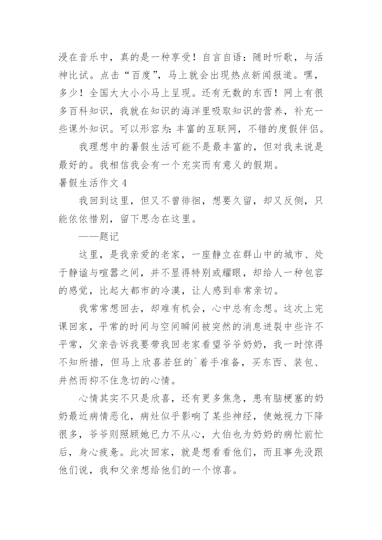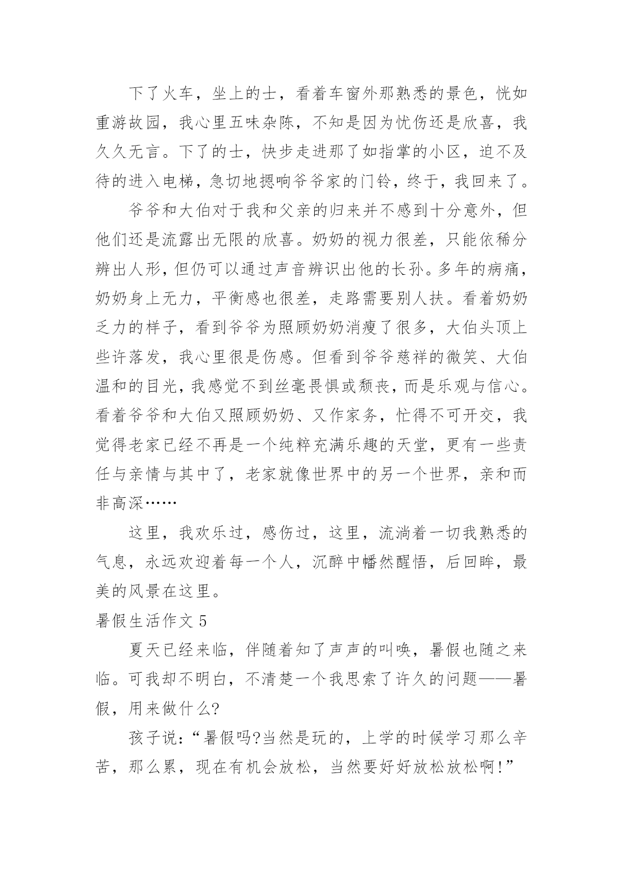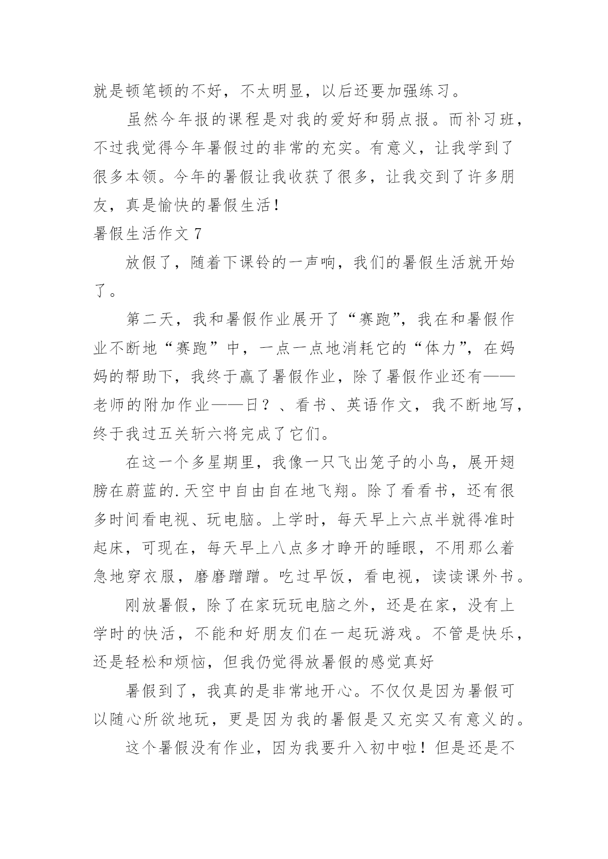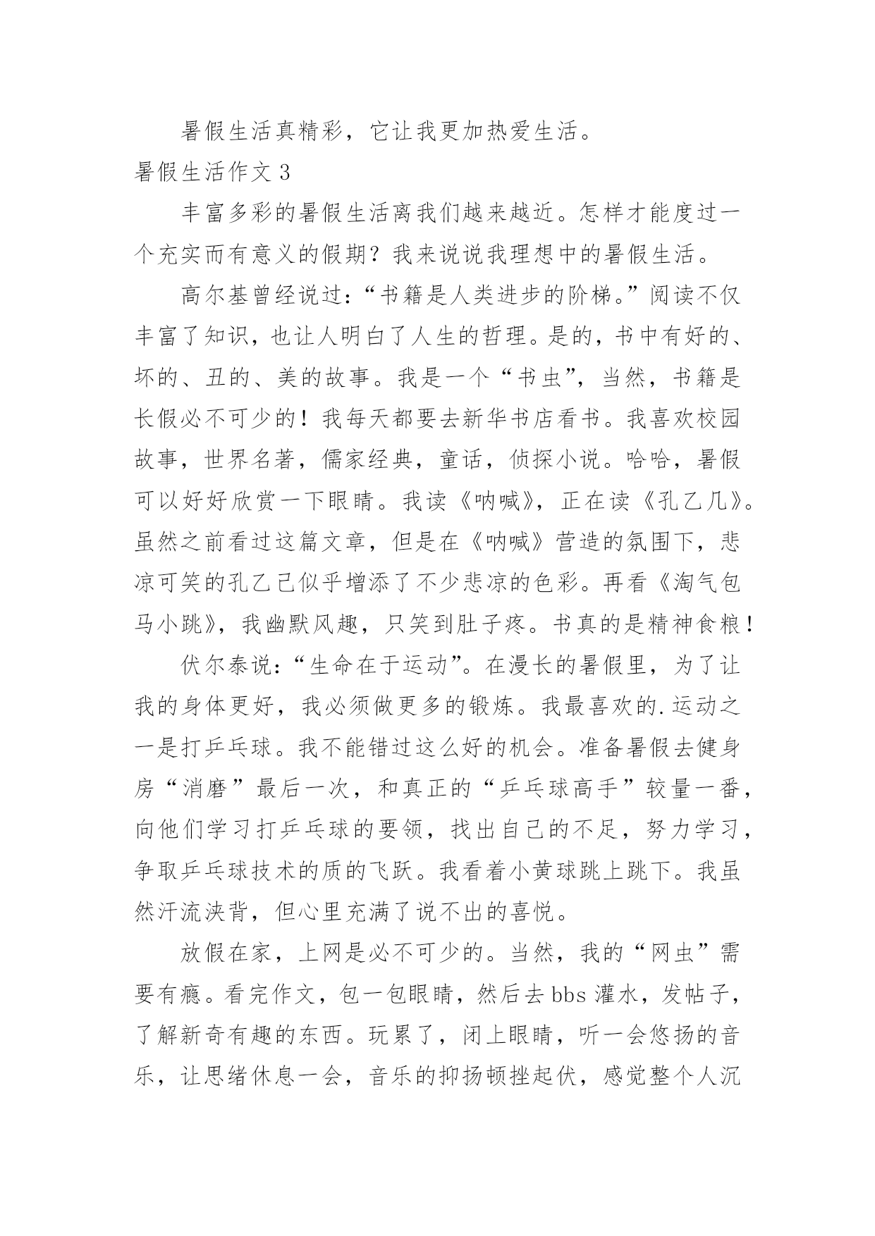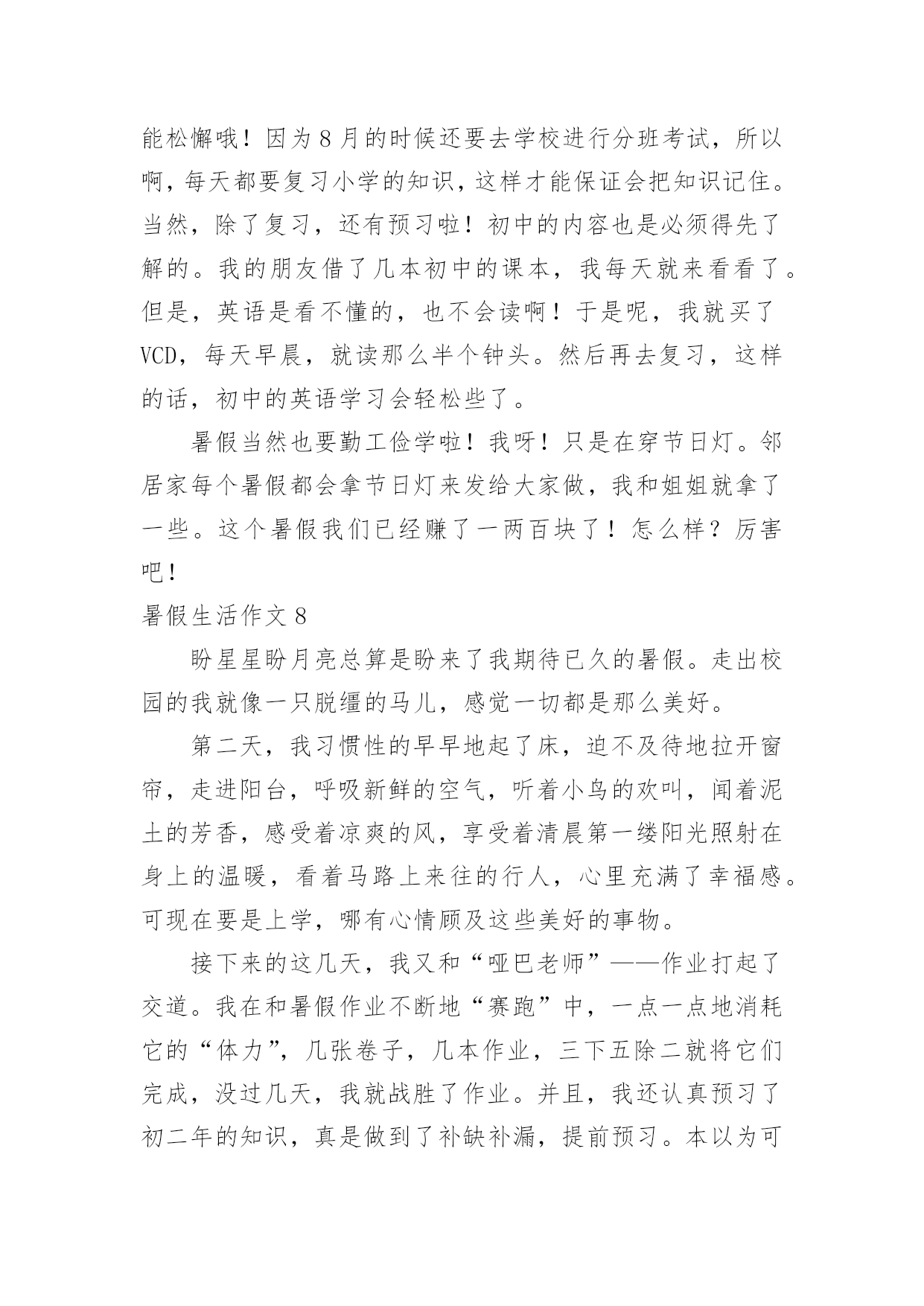 暑假生活作文暑假生活作文[优秀]无论在学习、工作或是生活中,大家总免不了要接触或使用作文吧,作文是通过文字来表达一个主题意义的记叙方法。为了让您在写作文时更加简单方便,下面是小编精心整理的暑假生活作文,仅供参考,欢迎大家阅读。暑假生活作文1暑假刚刚过半,而我却盼着开学了。这与上学期期末的时候盼着放暑假刚刚相反,此刻反而觉得在学校的生活比较趣味,要明白,我的暑假太平淡了,平淡到像一杯装在玻璃杯中的白开水,透过玻璃杯,一眼就能看出,里面只是开水而已,没有一点盛红酒的高脚杯想象力。要说有多么平淡,请听我慢慢道来。我早上8点准时自然醒,梳洗完毕后,和爸爸妈妈一齐吃早饭。这早饭的资料也是毫无想象力,牛奶、鸡蛋、面包。偶尔爸爸会买来豆浆和油条,这也让我感到无比的惊喜,吃着都将和有条,我会觉得十分的有滋味。吃早饭的同时,我默默地遭受着妈妈的唠叨,唠叨我不要整天上网玩游戏,唠叨我要多复习功课,唠叨我上的辅导班要好好学。偶尔,爸爸会和我讲一些时事和笑话,这才会激起我说话的欲望,我和爸爸往往能款款而谈,这顿早饭吃得也会让我的心境豁然开朗。爸爸妈妈出门后,我一个人在家更无聊了,此时会觉得妈妈的唠叨不是最无聊的,最无聊的是手握着鼠标、应对这电脑屏幕却不知做什么。打一些无聊的网游,在练怪、升级、做任务中消磨时光,不打游戏的时候,眼睛盯着小企鹅的图案,期望着有个同学或朋友经过QQ和我打个招呼。偶尔想起的QQ滴滴声能让我为之一振,双击打开后,才发现是系统广告,这时我的心境会更加低落,失望之情溢于言表。中午,我去奶奶家吃午饭,虽然奶奶对我疼爱有加,可是她做的饭菜是在不合我的胃口。有时候,叫上三两朋友,一齐外出吃饭,偶尔吃个pizza,或是肯德基,我会觉得那真是世界上的'美食。午时,我会做一些暑假作业,复习一下功课和看一些课外书,这些也没有什么新鲜的玩意,我做不到投入自我的热情,我只能做到认真完成了而已。到了晚上,最喜欢的是爸爸带我去游泳,游泳既凉快,又趣味,是我暑假里最欢乐的一件事了。可是,爸爸工作很忙,不能经常去,妈妈又不放心我一个人去游泳,我只能盼着盼着爸爸的工作不那么忙。盼着盼着,暑假就过半了,我期望无聊的暑假快快过去把。暑假生活作文2暑假生活多姿多彩,为我们的童年生活增添了几许色彩。我的这个暑假安排得满满当当,除了补习之外我还参加了很多有意义的活动,其中最令我开心的事就是以下两件事。这个暑假,爸爸为我报了一个篮球训练班,因为我一直喜欢打篮球。我才五岁时就有好几个篮球。那时候,我还不会打篮球,只会把篮球在地上滚着玩。篮球训练班第一天报到,我非常开心,早早就穿上新篮球服,等候爸爸送我去训练场。来到训练场,已经有几个男生在操场上拍球,其中有一位是我的同学。老师也早早在操场等候。我急忙跳下车,直奔篮球训练场,和其他队员一样拍打着球。可这调皮的球一点儿也不听使唤,没拍几个,球就跑了。这篮球像长了脚一样到处乱窜。开始我有些想放弃的想法,坚持几天后我发现我能控制球了,篮球已经不像前几天不听使唤了。哇,我终于可以控制篮球了。哈哈哈,我开心得不得了,高兴地告诉几个朋友和老师,也得到了老师的表扬。经过二十多天的训练,我掌握了控球、拍球、投球,而且掌握得还很不错。老师说我是一个小小灌篮手。这个篮球训练让我学会了坚持,增强我体力。这个暑假,我还学会了游泳。我和妹妹都参加了我们社区的游泳训练营,游泳也是我和妹妹最喜欢的`运动项目,但是我们两都很害怕水。刚刚开始,我和妹妹都不敢下水游泳,只是紧紧地抱着爸爸的手不放。第一次来到游泳馆,好多小朋友啊,太兴奋了,拿着游泳圈,急急忙忙跑到浅水池,扑通扑通拍打着水,溅起水花,弄得妹妹满脸都是水,我们发出阵阵嬉笑声。大朋友们在深水区游玩,前几天我只敢在浅水区游玩,将近十五天的学习我掌握了蛙泳,浅水游,这时候我的胆子越来越大,再也不愿意只待在浅水区玩了,时不时走到深水区游泳,每次都玩到别人回家了,在爸爸的催促声中不舍得离开,到家了才感觉到很疲惫,洗完澡呼呼大睡。暑假生活真精彩,它让我更加热爱生活。暑假生活作文3丰富多彩的暑假生活离我们越来越近。怎样才能度过一个充实而有意义的假期?我来说说我理想中的暑假生活。高尔基曾经说过:“书籍是人类进步的阶梯。”阅读不仅丰富了知识,也让人明白了人生的哲理。是的,书中有好的、坏的、丑的、美的故事。我是一个“书虫”,当然,书籍是长假必不可少的!我每天都要去新华书店看书。我喜欢校园故事,世界名著,儒家经典,童话,侦探小说。哈哈,暑假可以好好欣赏一下眼睛。我读《呐喊》,正在读《孔乙几》。虽然之前看过这篇文章,但是在《呐喊》营造的氛围下,悲凉可笑的孔乙己似乎增添了不少悲凉的色彩。再看《淘气包马小跳》,我幽默风趣,只笑到肚子疼。书真的是精神食粮!伏尔泰说:“生命在于运动”。在漫长的暑假里,为了让我的身体更好,我必须