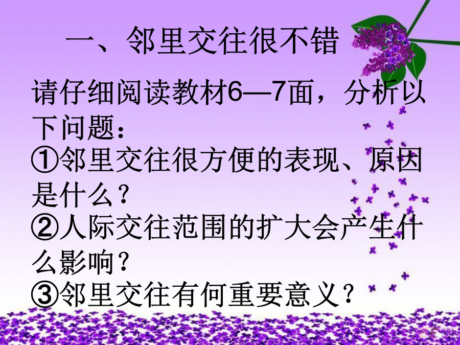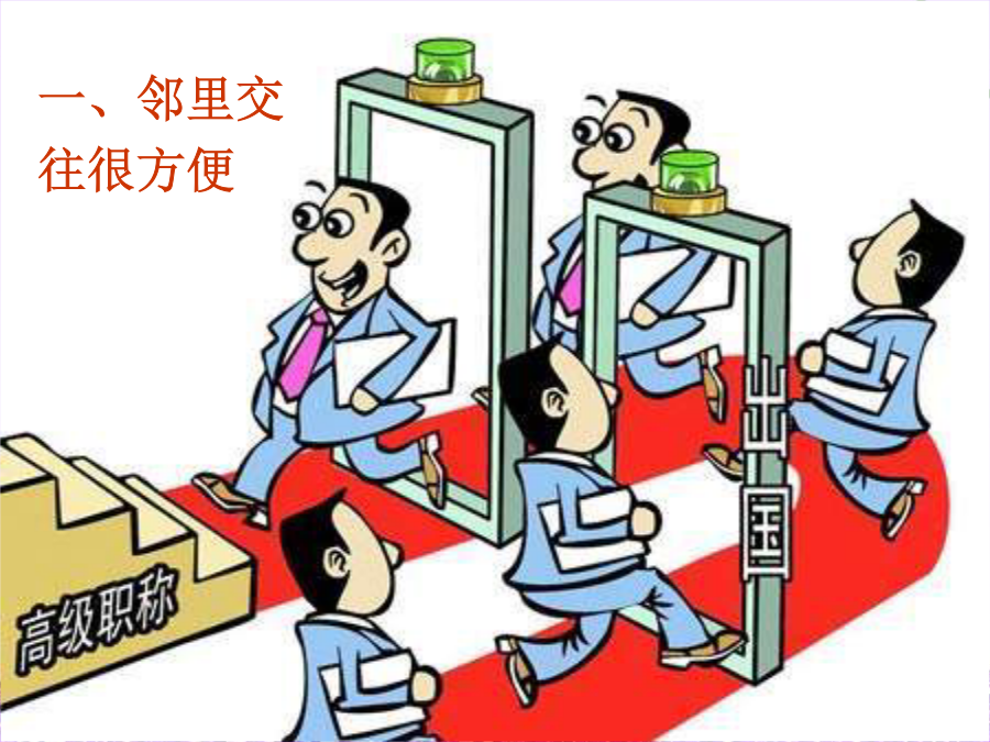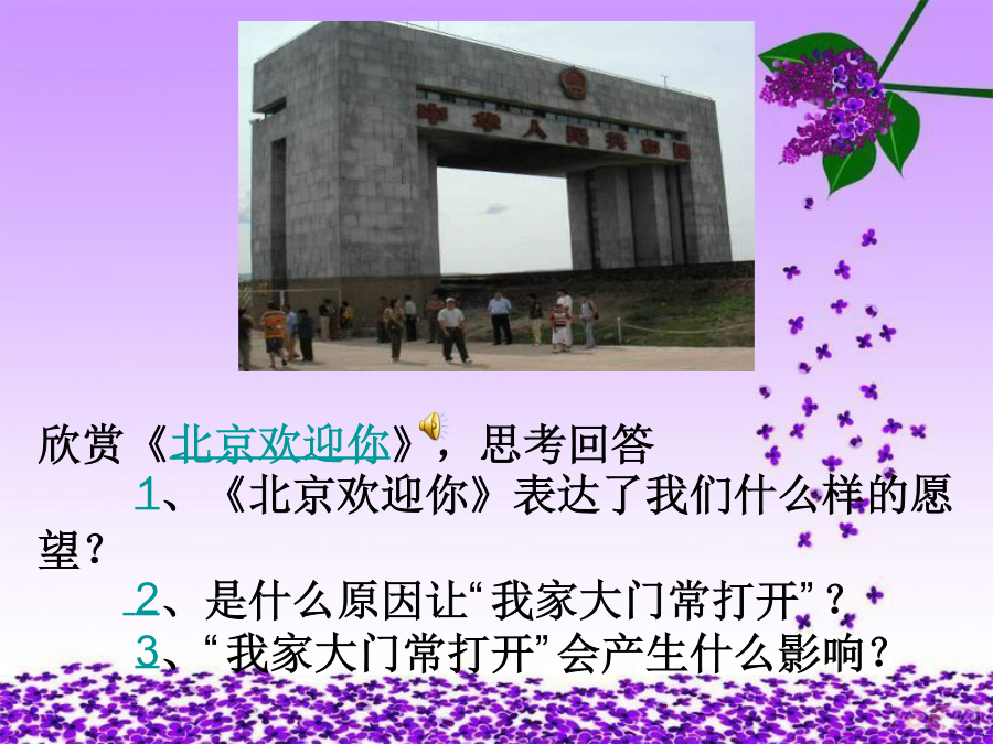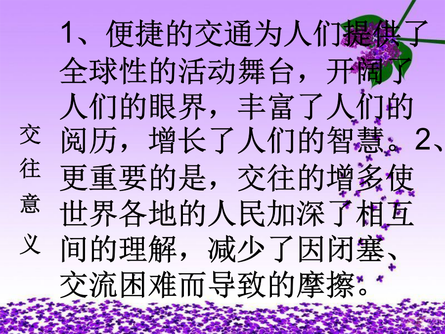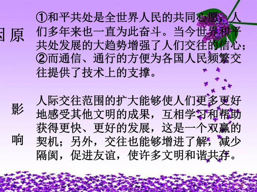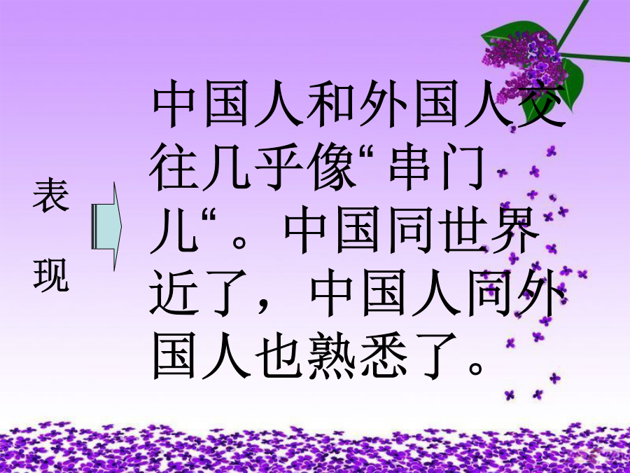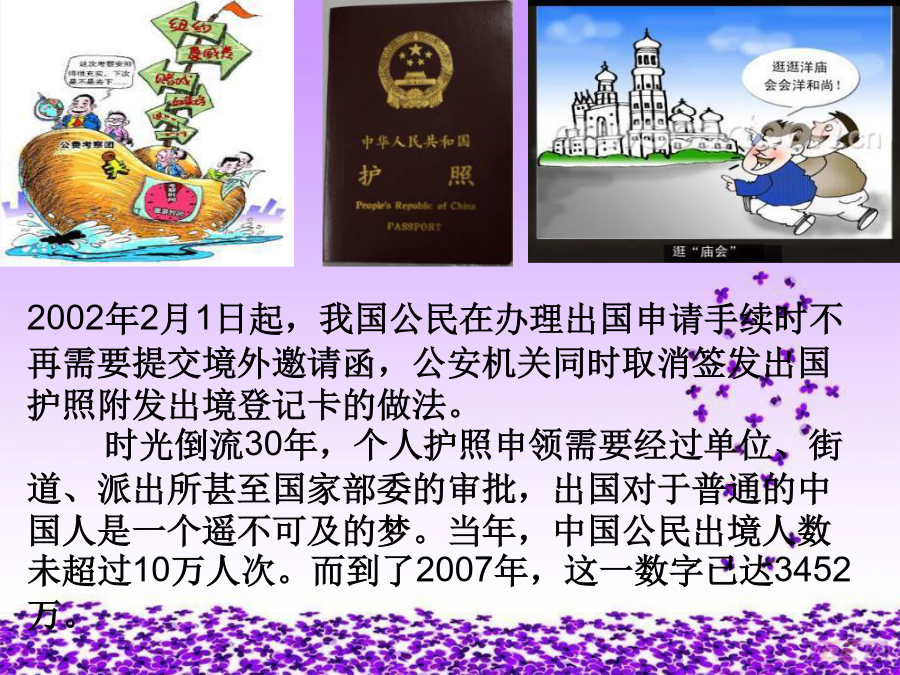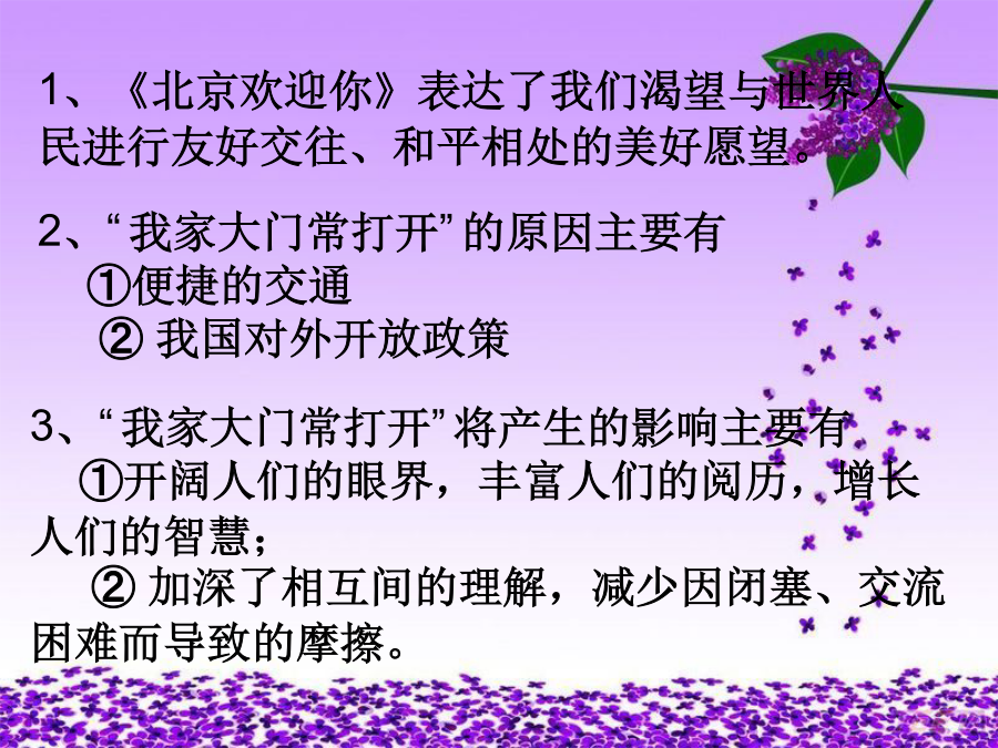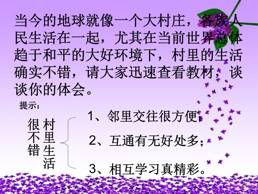 村里的生活很不错当今的地球就像一个大村庄,各族人民生活在一起,尤其在当前世界总体趋于和平的大好环境下,村里的生活确实不错,请大家迅速查看教材,谈谈你的体会。一、邻里交往很方便2002年2月1日起,我国公民在办理出国申请手续时不再需要提交境外邀请函,公安机关同时取消签发出国护照附发出境登记卡的做法。时光倒流30年,个人护照申领需要经过单位、街道、派出所甚至国家部委的审批,出国对于普通的中国人是一个遥不可及的梦。当年,中国公民出境人数未超过10万人次。而到了2007年,这一数字已达3452万。一、邻里交往很不错表现原因交往意义欣赏《北京欢迎你》,思考回答1、《北京欢迎你》表达了我们什么样的愿望?2、是什么原因让“我家大门常打开”?3、“我家大门常打开”会产生什么影响?1、《北京欢迎你》表达了我们渴望与世界人民进行友好交往、和平相处的美好愿望。材料一:早晨6:00,诺基亚手机的闹铃把小明的父亲叫醒。他先用松下电动剃须刀刮胡子,用三笑的牙刷和佳洁士的牙膏漱口,再穿上一套阿迪达斯服装和老人头皮鞋,到楼下的肯德基吃了早餐,就开着他的宝马到德国工业园去上班。材料二:波音747飞机的450万个零部件,来自近10个国家,1000多家大企业,15000多家小企业。英国装配的汽车:发动机来自瑞典;控制设备来自德国;底盘、弹簧来自美国;车身来自意大利。材料三:2004年全球货物和服务贸易总额超过22万亿美元。而2004年中国贸易额达到1万1547亿4000万美元,成为仅次于美、德的第三大贸易大国。上面的材料反映的是什么现象?二、互通有无好处多(一)经济全球化——是指世界经济活动超越国界,通过对外贸易、资本流动、技术转移、提供服务、相互依存、相互联系而形成的全球范围的有机经济整体。(简单的说也就是世界经济日益成为紧密联系的一个整体)。经济全球化是当代世界经济的重要特征之一,也是世界经济发展的重要趋势。(二)互通有无的主要表现:中国制造的产品在美国商场科隆家电展上的亮点结论:表现一、商品流通国际化德国欧宝轿车零部件产地分布示意图1、你能列举扬名海外的中国企业、品牌有哪些?温州一制鞋企业工人正精心制作外贸出口皮鞋。2007年上半年,我国鞋类出口总额119.6亿美元。你知道我国有哪些产品出口到国外?在国外的中国企业有哪些想一想:今天,中国企业、品牌扬名海外说明了什么?2、你能列举家门口的外国公司、外国产品有哪些?看看我们身边的洋品牌、洋企业你所知道的跨国公司:松下、菲利浦、花旗银行、诺基亚、摩托罗拉、北方电讯、微软、惠普本地市场上的外国产品:肯德基快餐索尼电器可口可乐、别克、大众、丰田、微软、耐克、三星、现代、日立、东芝、丰田、三菱、本田、西门子、宝马想一想:我们该如何正确对待身边的洋品牌?在一次盛大宴会上,来自中国、法国、俄国、德国、意大利、美国的贵宾聚集一堂,各国来宾纷纷夸耀自己国家的文化。他们拿出本国的国粹——酒来彼此相敬,中国人拿出古色古香的茅台,瓶盖一开,沁人心脾,举座皆惊,俄国人拿出伏特加,法国人拿出大香槟,意大利人拿出葡萄酒,德国人拿出威士忌,只有美国人两手空空。(你猜他拿出了什么)只见他不慌不忙的走上前来,把各国的名酒兑在一起,举杯相敬,说:这就是我们美国的酒——鸡尾酒。这个故事给我们的启示是什么?在经济全球化浪潮中,我们要充分吸收世界经济的营养,为我所用,尤其是要学习世界各国的先进科学技术,多生产自主创新的高科技产品,这样才能在经济全球化中更好的发展,真正挺立在世界民族之林。三、相互学习真精彩丰富多彩的各国文化中国元素中国元素阅读上述材料后你有何感想?外国人学说相声设有国际、地中海、亚洲等餐区,共提供460种菜品。菜单每8天一个循环周期,以尽量满足运动员的不同口味奥运村宗教服务中心共有专业宗教服务志愿者69名,提供24小时的宗教服务。服务用语有英语、阿拉伯语、意大利语、法语、韩语和希伯来语38名洋教练助“中国军团”夺金金昶伯2006年,中国—俄罗斯年活动取得丰硕成果我们该如何正确对待外国文化?尊重、交流、学习我们该如何正确对待本国的传统文化?中华文明历经五千年而绵延不绝,其生机和活力就在于它能不断吸纳域外先进文明成果,吐故纳新。我们一方面要吸收别国文化中的有益因子,创造更为璀璨的中华文明,另一方面也要保持并发扬本国的文化传统,防止发生文化迷失现象,使中华文明傲立于世界文明之林。古代中外文化交流典范中国文化传播:科学技术:a.唐朝时造纸术,宋朝时印刷术传到朝鲜、日本、印度、阿拉伯、北非和欧洲,促进了人类文化的发展。b宋朝时指南针由阿拉伯人传到欧洲,为欧洲航海家发现美洲和实现环球航行提供了重要的条件。c元朝时,火药和火药武器传到欧洲。文字:唐朝时,日本参照汉字草书和楷书的偏旁,创制了日本文字