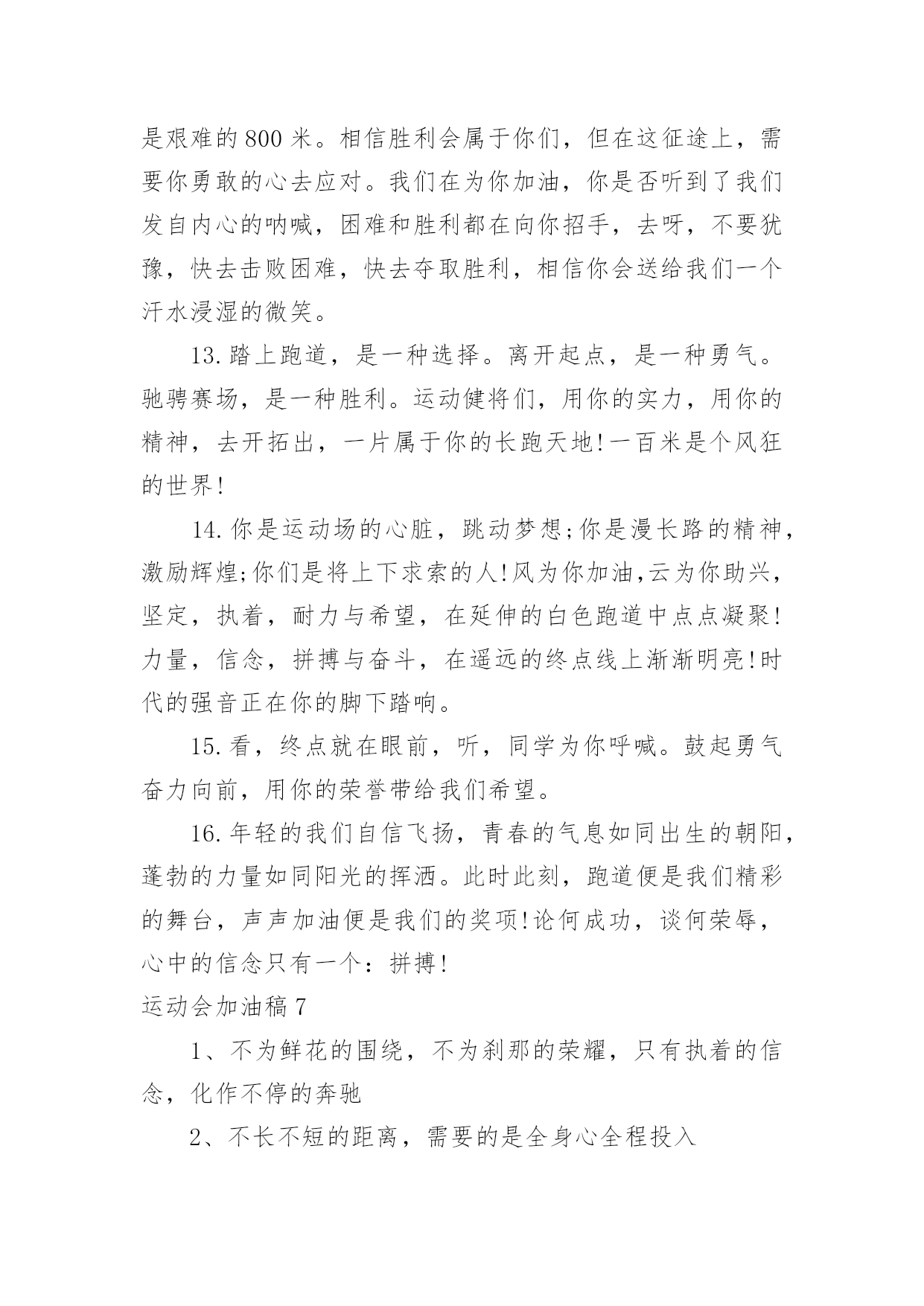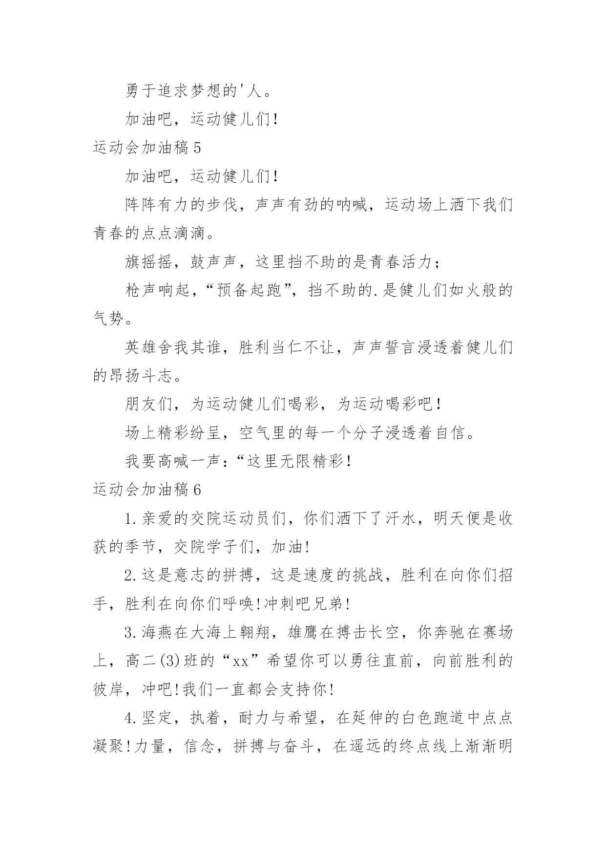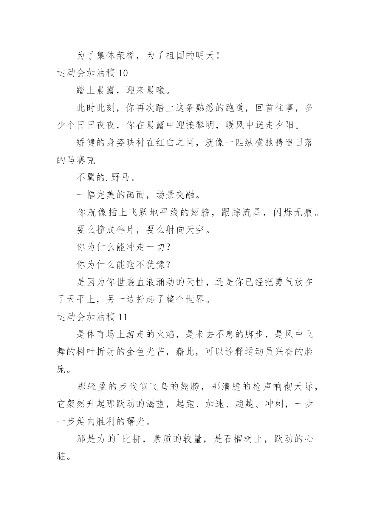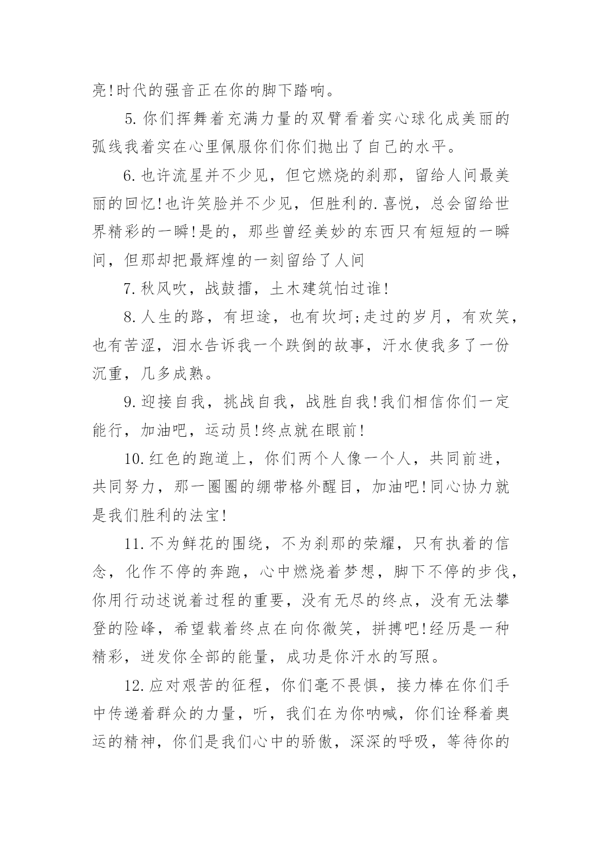 运动会加油稿运动会加油稿在现在社会,我们用到加油稿的地方越来越多,加油稿可以起到鼓励场上的人、增添其信心的作用。还是对加油稿一筹莫展吗?下面是小编为大家收集的运动会加油稿,仅供参考,欢迎大家阅读。运动会加油稿1不为掌声的诠释,不伟刻意的征服,只有辛勤的汗水化作追求的脚步。心中坚定的信念,脚下沉稳的步伐,你用行动诉说着一个不变的真理。没有比脚更长的路,没有比人更高的`山,希望在终点向你招手。努力吧!用你坚韧不拔的意志,去迎接终点的掌声,相信成功属于你。运动会加油稿21、你们挥舞着充满力量的双臂,看着实心球化成美丽的弧线,我着实在心里佩服你们,你们抛出了自我的水平。2、漫漫长路,你愿一人独撑,忍受着孤独与寂寞,承受着体力与精神的压迫,只任汗水溶于泪水,可脚步却从不停歇。3、这炎热的夏日居然也如此美丽,美丽的让人绝望,你坚毅的目光,终点,加力,冲刺,立刻就是胜利。4、只是一道过场,几秒钟转瞬即逝,可是这背后承载的`是多少成败,加油吧,少年。5、加油吧,你们的肌肉爆发着力量,你们的目光充满着自信,相信,胜利就在前方。6、不为掌声的注释,不为刻意的征服,不为失败的痛苦,仅有辛勤的汗水化作成功的脚步!运动会加油稿3一个盼望出发,一个盼望到达。烈日骄阳下的'奔驰,蓝天白云下的拼搏,总想为你高声呐喊,却怕被天空误解。总想为你放声歌唱,却又怕惊动了白云。把内心最美的祝愿挂在跑道线上,微风中每一次振动是又一次的衷心祝愿。加油吧!胜利源于希望,胜利就在眼前!运动会加油稿4理想毕竟不同于现实,失败是生活的一部分,谁也无法选择,无法拒绝。人生要自己去拼搏,去奋斗,在风雨中百折不挠勇往前进,在集资的每个驿站上都留下一段不悔的回忆。流泪不是失落,徘徊不是迷惑,成功属于那些战胜失败,坚持不懈、勇于追求梦想的'人。加油吧,运动健儿们!运动会加油稿5加油吧,运动健儿们!阵阵有力的步伐,声声有劲的呐喊,运动场上洒下我们青春的点点滴滴。旗摇摇,鼓声声,这里挡不助的是青春活力;枪声响起,“预备起跑”,挡不助的.是健儿们如火般的气势。英雄舍我其谁,胜利当仁不让,声声誓言浸透着健儿们的昂扬斗志。朋友们,为运动健儿们喝彩,为运动喝彩吧!场上精彩纷呈,空气里的每一个分子浸透着自信。我要高喊一声:“这里无限精彩!运动会加油稿61.亲爱的交院运动员们,你们洒下了汗水,明天便是收获的季节,交院学子们,加油!2.这是意志的拼搏,这是速度的挑战,胜利在向你们招手,胜利在向你们呼唤!冲刺吧兄弟!3.海燕在大海上翱翔,雄鹰在搏击长空,你奔驰在赛场上,高二(3)班的“xx”希望你可以勇往直前,向前胜利的彼岸,冲吧!我们一直都会支持你!4.坚定,执着,耐力与希望,在延伸的白色跑道中点点凝聚!力量,信念,拼搏与奋斗,在遥远的终点线上渐渐明亮!时代的强音正在你的脚下踏响。5.你们挥舞着充满力量的双臂看着实心球化成美丽的弧线我着实在心里佩服你们你们抛出了自己的水平。6.也许流星并不少见,但它燃烧的刹那,留给人间最美丽的回忆!也许笑脸并不少见,但胜利的.喜悦,总会留给世界精彩的一瞬!是的,那些曾经美妙的东西只有短短的一瞬间,但那却把最辉煌的一刻留给了人间7.秋风吹,战鼓擂,土木建筑怕过谁!8.人生的路,有坦途,也有坎坷;走过的岁月,有欢笑,也有苦涩,泪水告诉我一个跌倒的故事,汗水使我多了一份沉重,几多成熟。9.迎接自我,挑战自我,战胜自我!我们相信你们一定能行,加油吧,运动员!终点就在眼前!10.红色的跑道上,你们两个人像一个人,共同前进,共同努力,那一圈圈的绷带格外醒目,加油吧!同心协力就是我们胜利的法宝!11.不为鲜花的围绕,不为刹那的荣耀,只有执着的信念,化作不停的奔跑,心中燃烧着梦想,脚下不停的步伐,你用行动述说着过程的重要,没有无尽的终点,没有无法攀登的险峰,希望载着终点在向你微笑,拼搏吧!经历是一种精彩,迸发你全部的能量,成功是你汗水的写照。12.应对艰苦的征程,你们毫不畏惧,接力棒在你们手中传递着群众的力量,听,我们在为你呐喊,你们诠释着奥运的精神,你们是我们心中的骄傲,深深的呼吸,等待你的是艰难的800米。相信胜利会属于你们,但在这征途上,需要你勇敢的心去应对。我们在为你加油,你是否听到了我们发自内心的呐喊,困难和胜利都在向你招手,去呀,不要犹豫,快去击败困难,快去夺取胜利,相信你会送给我们一个汗水浸湿的微笑。13.踏上跑道,是一种选择。离开起点,是一种勇气。驰骋赛场,是一种胜利。运动健将们,用你的实力,用你的精神,去开拓出,一片属于你的长跑天地!一百米是个风狂的世界!14.你是运动场的心脏,跳动梦想;你是漫长路的精神,激励辉煌;你们是将上下求索的人!风为你加油,云为你助兴,坚定,执着,耐力与希望,在延伸的白色跑道中点点凝聚!力量,信念,拼搏与奋斗,在遥远的终点线上渐渐明亮!时代的