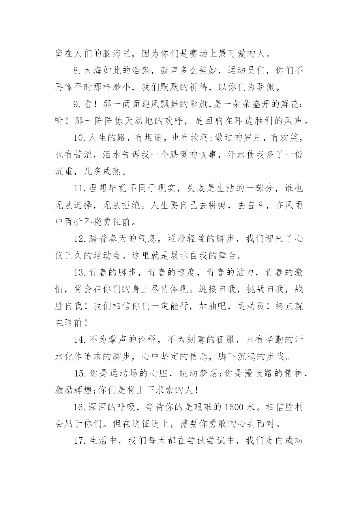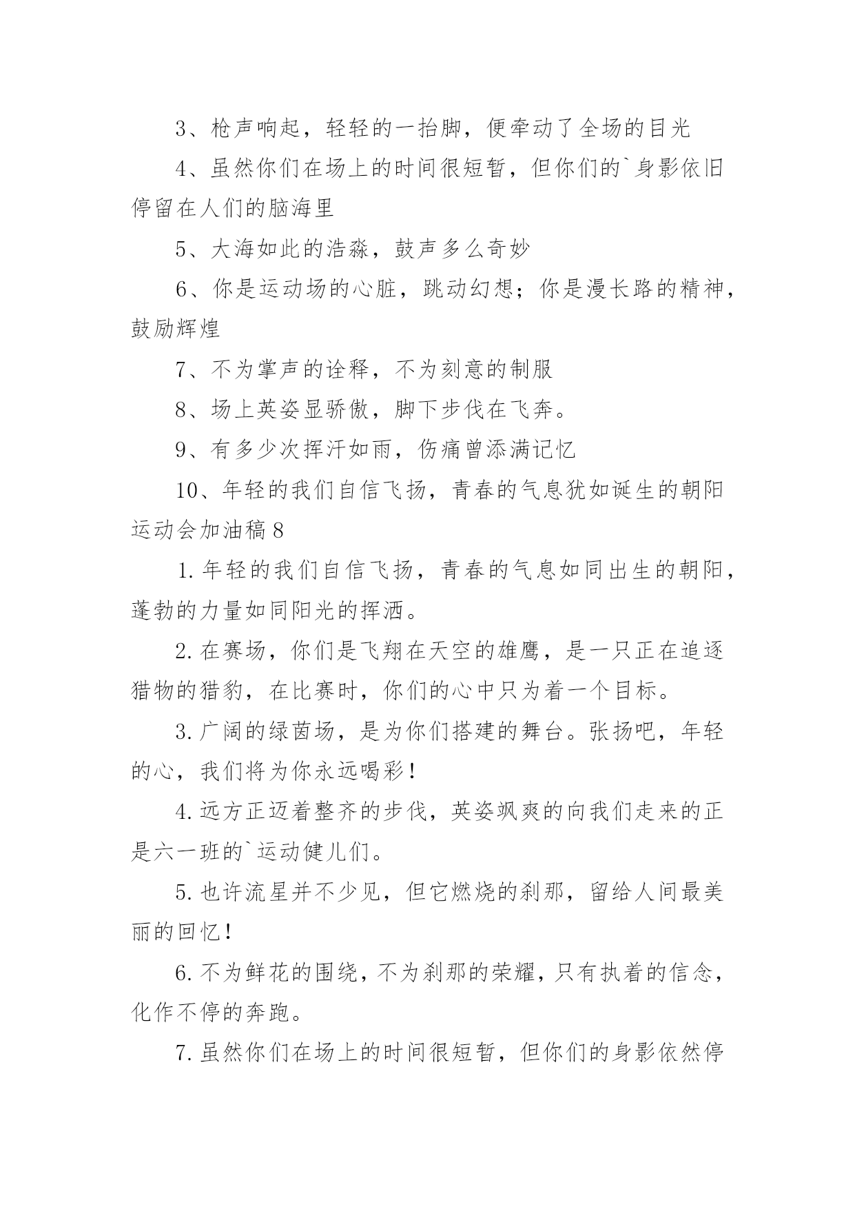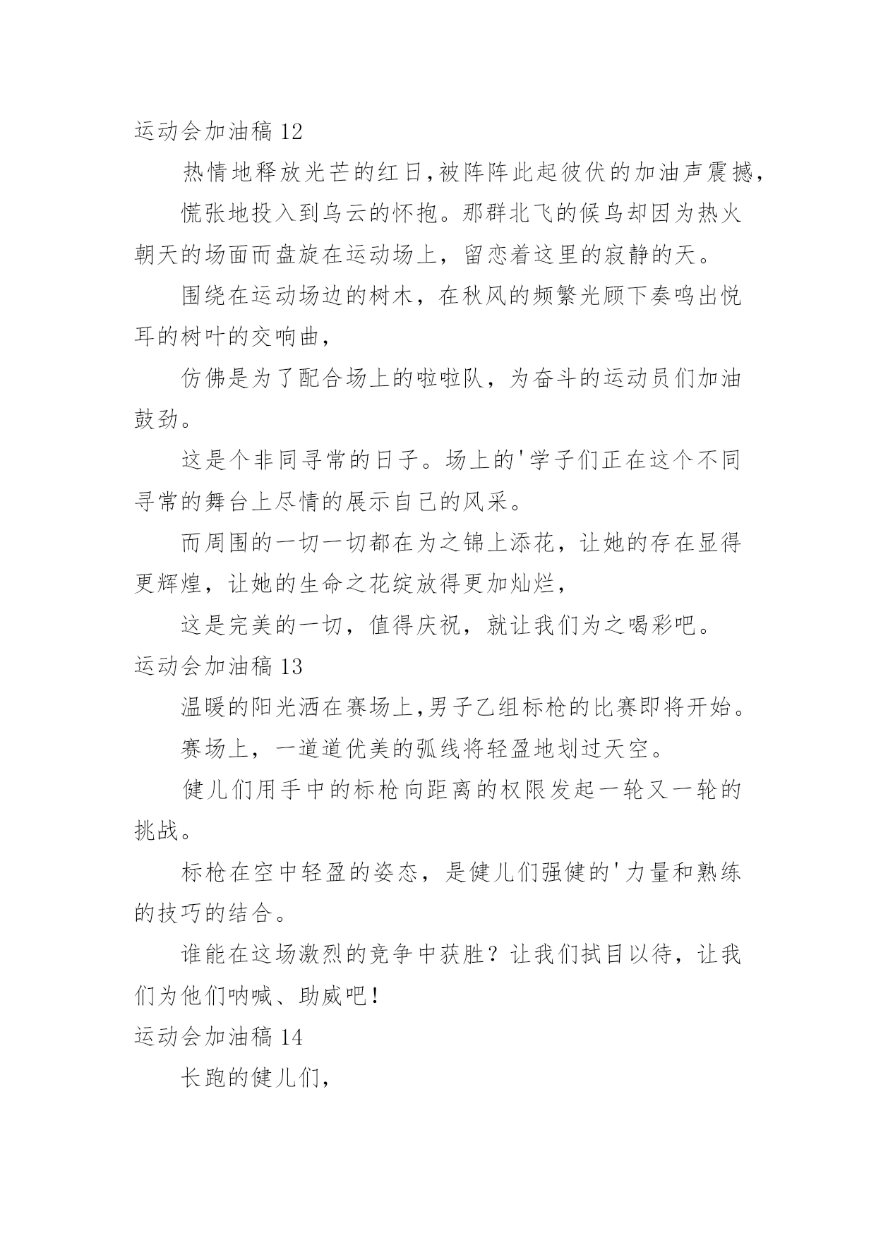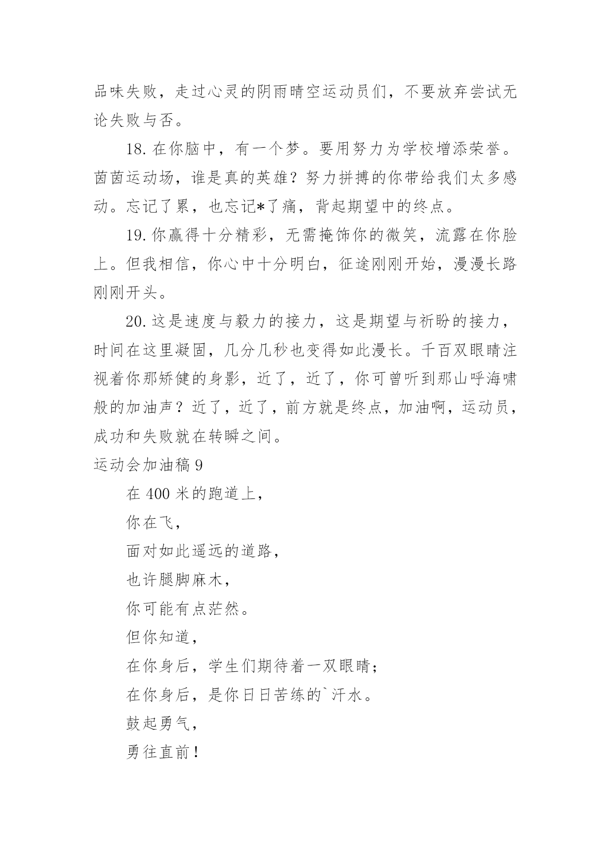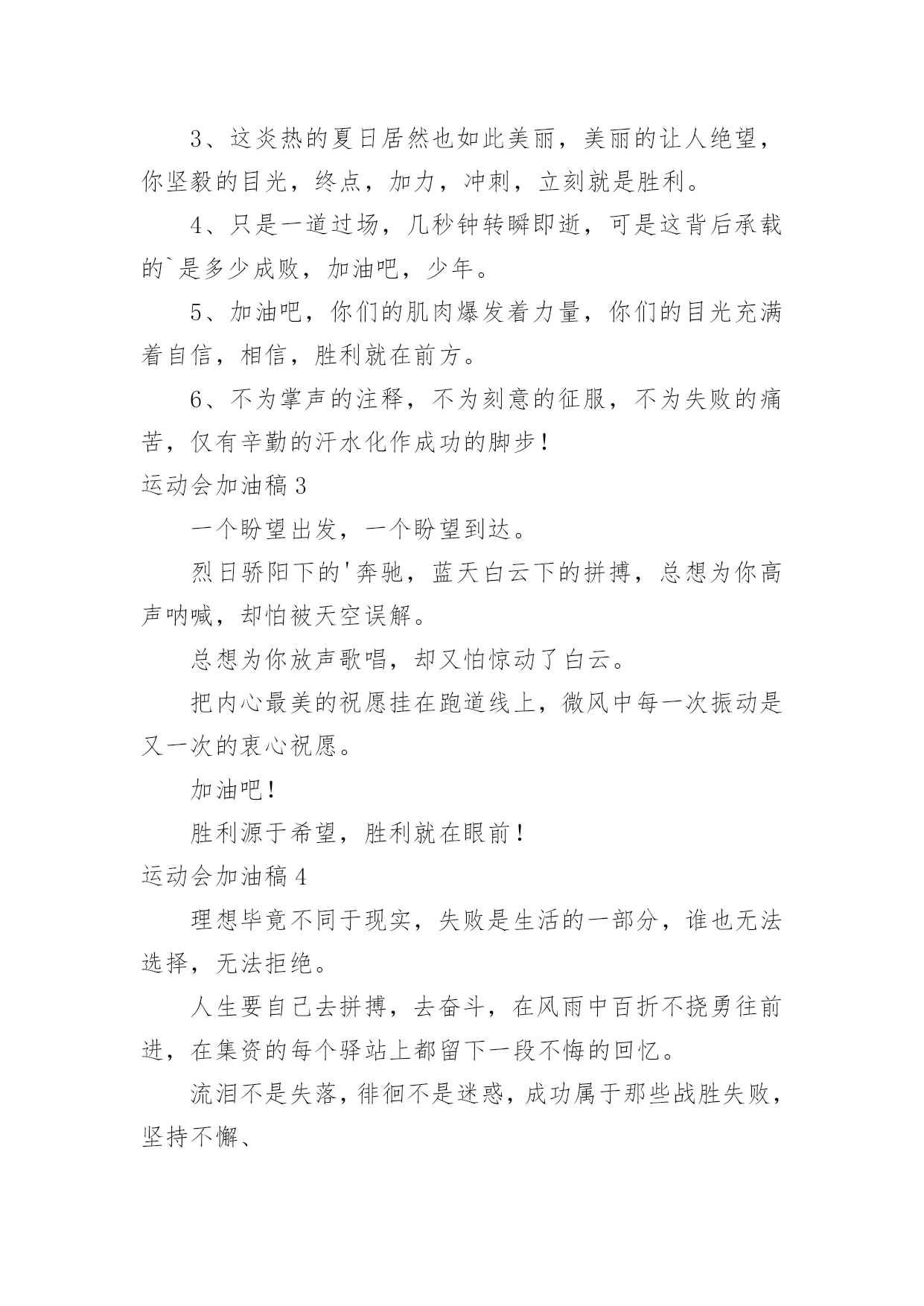 运动会加油稿运动会加油稿在现在社会,我们用到加油稿的地方越来越多,加油稿可以起到鼓励场上的人、增添其信心的作用。还是对加油稿一筹莫展吗?下面是小编为大家收集的运动会加油稿,仅供参考,欢迎大家阅读。运动会加油稿1不为掌声的诠释,不伟刻意的征服,只有辛勤的汗水化作追求的脚步。心中坚定的信念,脚下沉稳的步伐,你用行动诉说着一个不变的真理。没有比脚更长的路,没有比人更高的`山,希望在终点向你招手。努力吧!用你坚韧不拔的意志,去迎接终点的掌声,相信成功属于你。运动会加油稿21、你们挥舞着充满力量的双臂,看着实心球化成美丽的弧线,我着实在心里佩服你们,你们抛出了自我的水平。2、漫漫长路,你愿一人独撑,忍受着孤独与寂寞,承受着体力与精神的压迫,只任汗水溶于泪水,可脚步却从不停歇。3、这炎热的夏日居然也如此美丽,美丽的让人绝望,你坚毅的目光,终点,加力,冲刺,立刻就是胜利。4、只是一道过场,几秒钟转瞬即逝,可是这背后承载的`是多少成败,加油吧,少年。5、加油吧,你们的肌肉爆发着力量,你们的目光充满着自信,相信,胜利就在前方。6、不为掌声的注释,不为刻意的征服,不为失败的痛苦,仅有辛勤的汗水化作成功的脚步!运动会加油稿3一个盼望出发,一个盼望到达。烈日骄阳下的'奔驰,蓝天白云下的拼搏,总想为你高声呐喊,却怕被天空误解。总想为你放声歌唱,却又怕惊动了白云。把内心最美的祝愿挂在跑道线上,微风中每一次振动是又一次的衷心祝愿。加油吧!胜利源于希望,胜利就在眼前!运动会加油稿4理想毕竟不同于现实,失败是生活的一部分,谁也无法选择,无法拒绝。人生要自己去拼搏,去奋斗,在风雨中百折不挠勇往前进,在集资的每个驿站上都留下一段不悔的回忆。流泪不是失落,徘徊不是迷惑,成功属于那些战胜失败,坚持不懈、勇于追求梦想的'人。加油吧,运动健儿们!运动会加油稿5加油吧,运动健儿们!阵阵有力的步伐,声声有劲的呐喊,运动场上洒下我们青春的点点滴滴。旗摇摇,鼓声声,这里挡不助的是青春活力;枪声响起,“预备起跑”,挡不助的.是健儿们如火般的气势。英雄舍我其谁,胜利当仁不让,声声誓言浸透着健儿们的昂扬斗志。朋友们,为运动健儿们喝彩,为运动喝彩吧!场上精彩纷呈,空气里的每一个分子浸透着自信。我要高喊一声:“这里无限精彩!运动会加油稿61.亲爱的交院运动员们,你们洒下了汗水,明天便是收获的季节,交院学子们,加油!2.这是意志的拼搏,这是速度的挑战,胜利在向你们招手,胜利在向你们呼唤!冲刺吧兄弟!3.海燕在大海上翱翔,雄鹰在搏击长空,你奔驰在赛场上,高二(3)班的“xx”希望你可以勇往直前,向前胜利的彼岸,冲吧!我们一直都会支持你!4.坚定,执着,耐力与希望,在延伸的白色跑道中点点凝聚!力量,信念,拼搏与奋斗,在遥远的终点线上渐渐明亮!时代的强音正在你的脚下踏响。5.你们挥舞着充满力量的双臂看着实心球化成美丽的弧线我着实在心里佩服你们你们抛出了自己的水平。6.也许流星并不少见,但它燃烧的刹那,留给人间最美丽的回忆!也许笑脸并不少见,但胜利的.喜悦,总会留给世界精彩的一瞬!是的,那些曾经美妙的东西只有短短的一瞬间,但那却把最辉煌的一刻留给了人间7.秋风吹,战鼓擂,土木建筑怕过谁!8.人生的路,有坦途,也有坎坷;走过的岁月,有欢笑,也有苦涩,泪水告诉我一个跌倒的故事,汗水使我多了一份沉重,几多成熟。9.迎接自我,挑战自我,战胜自我!我们相信你们一定能行,加油吧,运动员!终点就在眼前!10.红色的跑道上,你们两个人像一个人,共同前进,共同努力,那一圈圈的绷带格外醒目,加油吧!同心协力就是我们胜利的法宝!11.不为鲜花的围绕,不为刹那的荣耀,只有执着的信念,化作不停的奔跑,心中燃烧着梦想,脚下不停的步伐,你用行动述说着过程的重要,没有无尽的终点,没有无法攀登的险峰,希望载着终点在向你微笑,拼搏吧!经历是一种精彩,迸发你全部的能量,成功是你汗水的写照。12.应对艰苦的征程,你们毫不畏惧,接力棒在你们手中传递着群众的力量,听,我们在为你呐喊,你们诠释着奥运的精神,你们是我们心中的骄傲,深深的呼吸,等待你的是艰难的800米。相信胜利会属于你们,但在这征途上,需要你勇敢的心去应对。我们在为你加油,你是否听到了我们发自内心的呐喊,困难和胜利都在向你招手,去呀,不要犹豫,快去击败困难,快去夺取胜利,相信你会送给我们一个汗水浸湿的微笑。13.踏上跑道,是一种选择。离开起点,是一种勇气。驰骋赛场,是一种胜利。运动健将们,用你的实力,用你的精神,去开拓出,一片属于你的长跑天地!一百米是个风狂的世界!14.你是运动场的心脏,跳动梦想;你是漫长路的精神,激励辉煌;你们是将上下求索的人!风为你加油,云为你助兴,坚定,执着,耐力与希望,在延伸的白色跑道中点点凝聚!力量,信念,拼搏与奋斗,在遥远的终点线上渐渐明亮!时代的