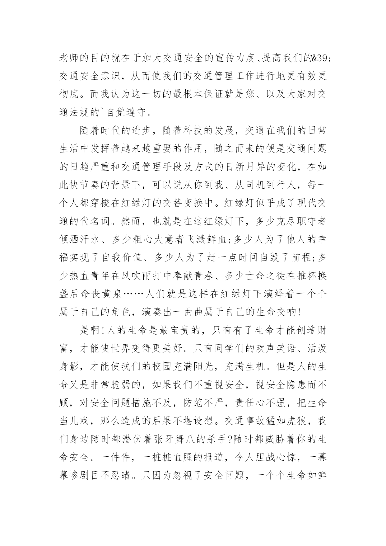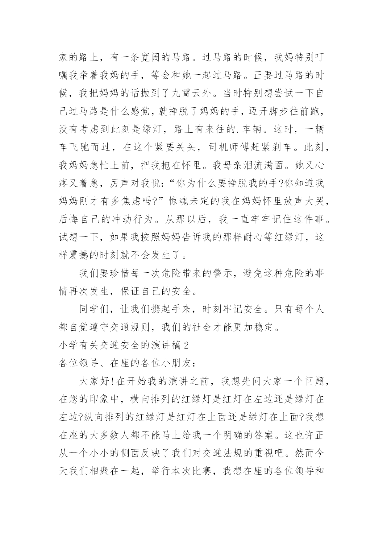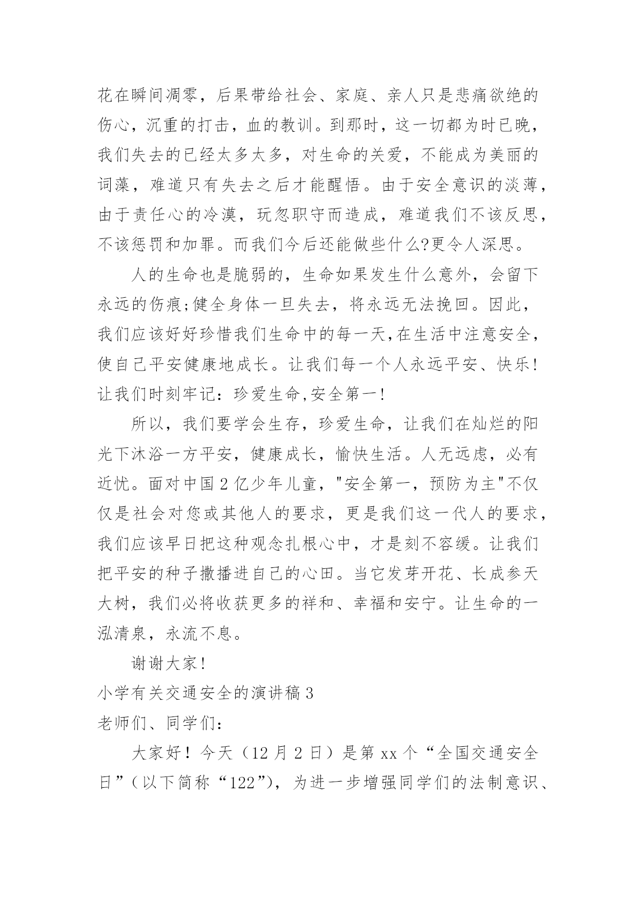 小学交通安全的演讲稿小学有关交通安全的演讲稿演讲稿可以起到整理演讲者的思路、提示演讲的内容、限定演讲的速度的作用。在现实社会中,在很多情况下我们需要用到演讲稿,大家知道演讲稿的格式吗?以下是小编精心整理的小学有关交通安全的演讲稿,欢迎阅读,希望大家能够喜欢。小学有关交通安全的演讲稿1亲爱的老师和同学们:大家好!众所周知,每个人的一生只有一次。如果丢了,就再也找不回来了。问:当你拥有宝贵的生命时,你真的会珍惜吗?随着现代经济的快速发展,随之而来的是一系列安全隐患。在我们身边,交通事故频发,溺水事故年年发生,食品安全隐患重重。在这样的环境下如何保护自己?首先,我认为每个孩子都应该意识到安全预防措施。时刻保持警惕,危险往往在你的&39;粗心中悄悄发生。我们每天往返于学校和家之间,路程不长,所以很熟悉。但是父母还是时不时的担心和提醒我:过马路要小心,走斑马线,不要在交通拥挤的地方追逐打闹。我一直牢记这些教导。记得有一次,我和爸妈在农田里干完活就回家了。在回家的路上,有一条宽阔的马路。过马路的时候,我妈特别叮嘱我牵着我妈的手,等会和她一起过马路。正要过马路的时候,我把妈妈的话抛到了九霄云外。当时特别想尝试一下自己过马路是什么感觉,就挣脱了妈妈的手,迈开脚步往前跑,没有考虑到此刻是绿灯,路上有来往的.车辆。这时,一辆车飞驰而过,在这个紧要关头,司机师傅赶紧刹车。此刻,我妈妈急忙上前,把我抱在怀里。我母亲泪流满面。她又心疼又着急,厉声对我说:“你为什么要挣脱我的手?你知道我妈妈刚才有多焦虑吗?”惊魂未定的我在妈妈怀里放声大哭,后悔自己的冲动行为。从那以后,我一直牢牢记住这件事。试想一下,如果我按照妈妈告诉我的那样耐心等红绿灯,这样震撼的时刻就不会发生了。我们要珍惜每一次危险带来的警示,避免这种危险的事情再次发生,保证自己的安全。同学们,让我们携起手来,时刻牢记安全。只有每个人都自觉遵守交通规则,我们的社会才能更加稳定。小学有关交通安全的演讲稿2各位领导、在座的各位小朋友:大家好!在开始我的演讲之前,我想先问大家一个问题,在您的印象中,横向排列的红绿灯是红灯在左边还是绿灯在左边?纵向排列的红绿灯是红灯在上面还是绿灯在上面?我想在座的大多数人都不能马上给我一个明确的答案。这也许正从一个小小的侧面反映了我们对交通法规的重视吧。然而今天我们相聚在一起,举行本次比赛,我想在座的各位领导和老师的目的就在于加大交通安全的宣传力度、提高我们的&39;交通安全意识,从而使我们的交通管理工作进行地更有效更彻底。而我认为这一切的最根本保证就是您、以及大家对交通法规的`自觉遵守。随着时代的进步,随着科技的发展,交通在我们的日常生活中发挥着越来越重要的作用,随之而来的便是交通问题的日趋严重和交通管理手段及方式的日新月异的变化,在如此快节奏的背景下,可以说从你到我、从司机到行人,每一个人都穿梭在红绿灯的交替变换中。红绿灯似乎成了现代交通的代名词。然而,也就是在这红绿灯下,多少克尽职守者倾洒汗水、多少粗心大意者飞溅鲜血;多少人为了他人的幸福实现了自我价值、多少人为了赶一点时间自毁了前程;多少热血青年在风吹雨打中奉献青春、多少亡命之徒在推杯换盏后命丧黄泉……人们就是这样在红绿灯下演绎着一个个属于自己的角色,演奏出一曲曲属于自己的生命交响!是啊!人的生命是最宝贵的,只有有了生命才能创造财富,才能使世界变得更美好。只有同学们的欢声笑语、活泼身影,才能使我们的校园充满阳光,充满生机。但是人的生命又是非常脆弱的,如果我们不重视安全,视安全隐患而不顾,对安全问题措施不及,防范不严,责任心不强,把生命当儿戏,那么造成的后果不堪设想。交通事故猛如虎狼,我们身边随时都潜伏着张牙舞爪的杀手?随时都威胁着你的生命安全。一件件,一桩桩血腥的报道,令人胆战心惊,一幕幕惨剧目不忍睹。只因为忽视了安全问题,一个个生命如鲜花在瞬间凋零,后果带给社会、家庭、亲人只是悲痛欲绝的伤心,沉重的打击,血的教训。到那时,这一切都为时已晚,我们失去的已经太多太多,对生命的关爱,不能成为美丽的词藻,难道只有失去之后才能醒悟。由于安全意识的淡薄,由于责任心的冷漠,玩忽职守而造成,难道我们不该反思,不该惩罚和加罪。而我们今后还能做些什么?更令人深思。人的生命也是脆弱的,生命如果发生什么意外,会留下永远的伤痕;健全身体一旦失去,将永远无法挽回。因此,我们应该好好珍惜我们生命中的每一天,在生活中注意安全,使自己平安健康地成长。让我们每一个人永远平安、快乐!让我们时刻牢记:珍爱生命,安全第一!所以,我们要学会生存,珍爱生命,让我们在灿烂的阳光下沐浴一方平安,健康成长,愉快生活。人无远虑,必有近忧。面对中国2亿少年儿童,"安全第一,预防为主"不仅仅是社会对您或其他人的要求,更是我们这一代人的要求,我们应该早日把这种观念扎根心