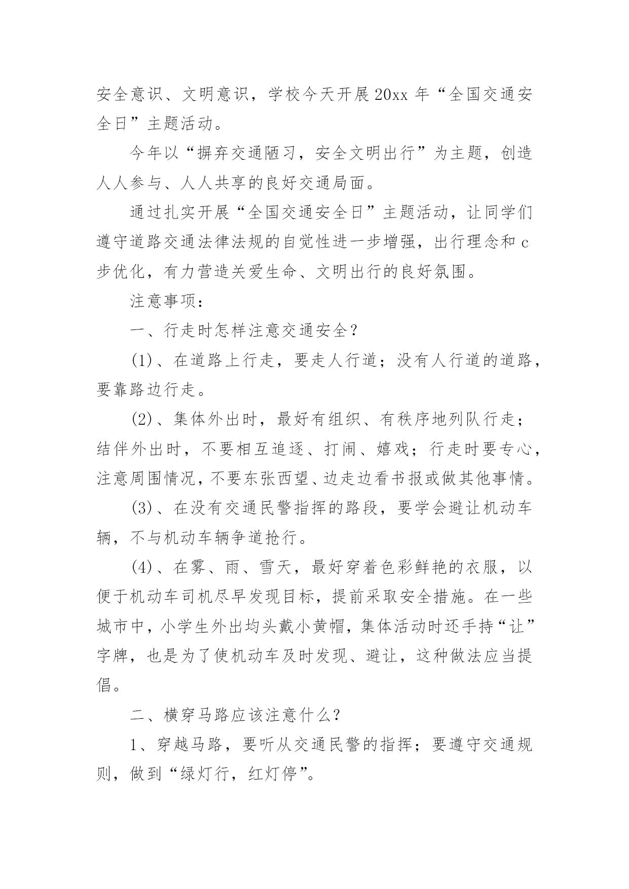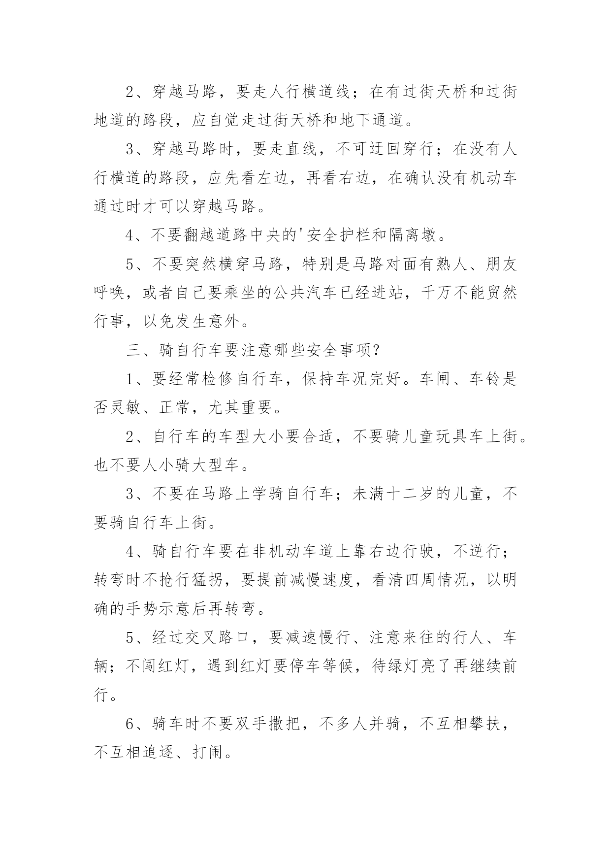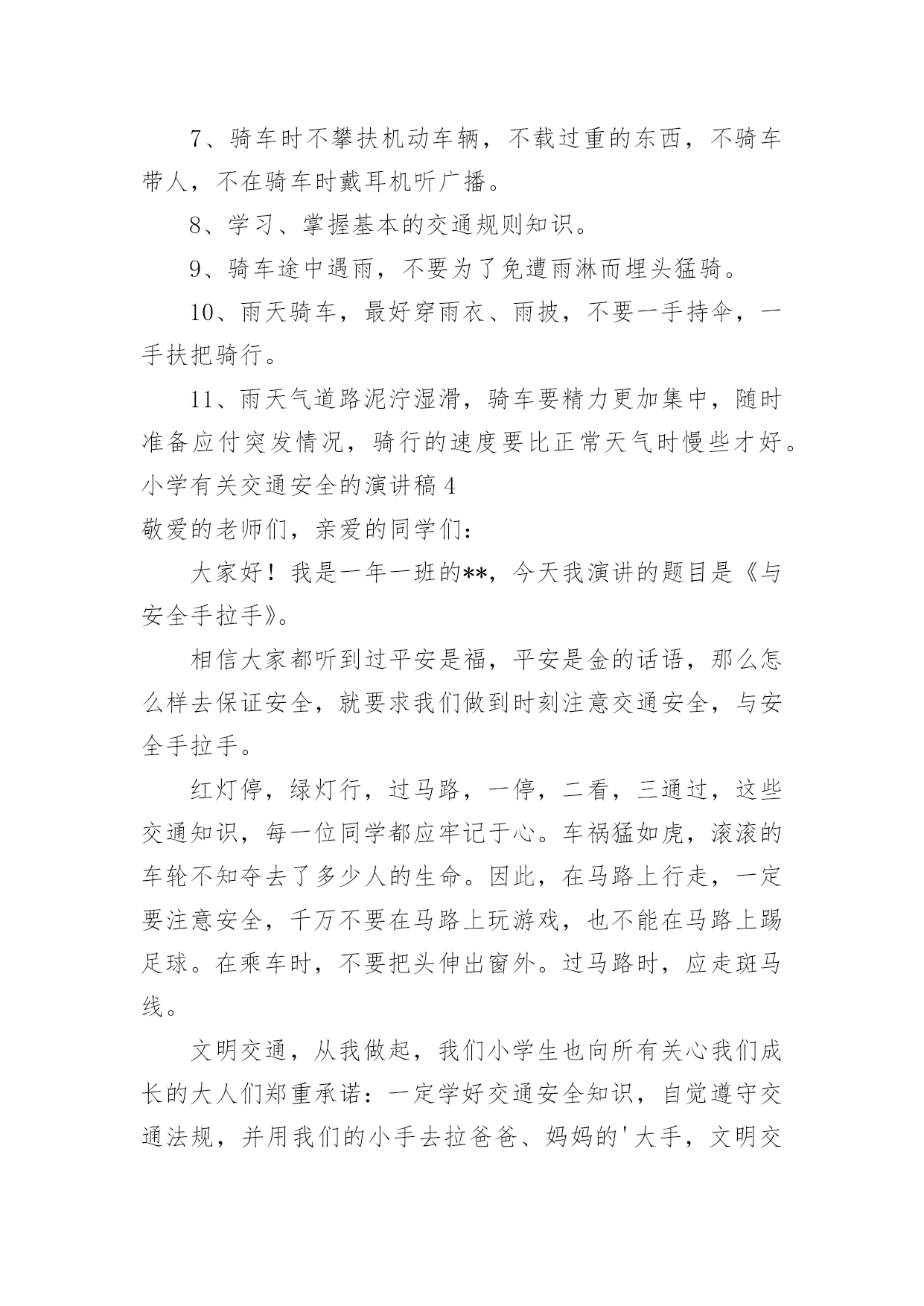小学交通安全的演讲稿小学有关交通安全的演讲稿演讲稿可以起到整理演讲者的思路、提示演讲的内容、限定演讲的速度的作用。在现实社会中,在很多情况下我们需要用到演讲稿,大家知道演讲稿的格式吗?以下是小编精心整理的小学有关交通安全的演讲稿,欢迎阅读,希望大家能够喜欢。小学有关交通安全的演讲稿1亲爱的老师和同学们:大家好!众所周知,每个人的一生只有一次。如果丢了,就再也找不回来了。问:当你拥有宝贵的生命时,你真的会珍惜吗?随着现代经济的快速发展,随之而来的是一系列安全隐患。在我们身边,交通事故频发,溺水事故年年发生,食品安全隐患重重。在这样的环境下如何保护自己?首先,我认为每个孩子都应该意识到安全预防措施。时刻保持警惕,危险往往在你的&39;粗心中悄悄发生。我们每天往返于学校和家之间,路程不长,所以很熟悉。但是父母还是时不时的担心和提醒我:过马路要小心,走斑马线,不要在交通拥挤的地方追逐打闹。我一直牢记这些教导。记得有一次,我和爸妈在农田里干完活就回家了。在回家的路上,有一条宽阔的马路。过马路的时候,我妈特别叮嘱我牵着我妈的手,等会和她一起过马路。正要过马路的时候,我把妈妈的话抛到了九霄云外。当时特别想尝试一下自己过马路是什么感觉,就挣脱了妈妈的手,迈开脚步往前跑,没有考虑到此刻是绿灯,路上有来往的.车辆。这时,一辆车飞驰而过,在这个紧要关头,司机师傅赶紧刹车。此刻,我妈妈急忙上前,把我抱在怀里。我母亲泪流满面。她又心疼又着急,厉声对我说:“你为什么要挣脱我的手?你知道我妈妈刚才有多焦虑吗?”惊魂未定的我在妈妈怀里放声大哭,后悔自己的冲动行为。从那以后,我一直牢牢记住这件事。试想一下,如果我按照妈妈告诉我的那样耐心等红绿灯,这样震撼的时刻就不会发生了。我们要珍惜每一次危险带来的警示,避免这种危险的事情再次发生,保证自己的安全。同学们,让我们携起手来,时刻牢记安全。只有每个人都自觉遵守交通规则,我们的社会才能更加稳定。小学有关交通安全的演讲稿2各位领导、在座的各位小朋友:大家好!在开始我的演讲之前,我想先问大家一个问题,在您的印象中,横向排列的红绿灯是红灯在左边还是绿灯在左边?纵向排列的红绿灯是红灯在上面还是绿灯在上面?我想在座的大多数人都不能马上给我一个明确的答案。这也许正从一个小小的侧面反映了我们对交通法规的重视吧。然而今天我们相聚在一起,举行本次比赛,我想在座的各位领导和老师的目的就在于加大交通安全的宣传力度、提高我们的&39;交通安全意识,从而使我们的交通管理工作进行地更有效更彻底。而我认为这一切的最根本保证就是您、以及大家对交通法规的`自觉遵守。随着时代的进步,随着科技的发展,交通在我们的日常生活中发挥着越来越重要的作用,随之而来的便是交通问题的日趋严重和交通管理手段及方式的日新月异的变化,在如此快节奏的背景下,可以说从你到我、从司机到行人,每一个人都穿梭在红绿灯的交替变换中。红绿灯似乎成了现代交通的代名词。然而,也就是在这红绿灯下,多少克尽职守者倾洒汗水、多少粗心大意者飞溅鲜血;多少人为了他人的幸福实现了自我价值、多少人为了赶一点时间自毁了前程;多少热血青年在风吹雨打中奉献青春、多少亡命之徒在推杯换盏后命丧黄泉……人们就是这样在红绿灯下演绎着一个个属于自己的角色,演奏出一曲曲属于自己的生命交响!是啊!人的生命是最宝贵的,只有有了生命才能创造财富,才能使世界变得更美好。只有同学们的欢声笑语、活泼身影,才能使我们的校园充满阳光,充满生机。但是人的生命又是非常脆弱的,如果我们不重视安全,视安全隐患而不顾,对安全问题措施不及,防范不严,责任心不强,把生命当儿戏,那么造成的后果不堪设想。交通事故猛如虎狼,我们身边随时都潜伏着张牙舞爪的杀手?随时都威胁着你的生命安全。一件件,一桩桩血腥的报道,令人胆战心惊,一幕幕惨剧目不忍睹。只因为忽视了安全问题,一个个生命如鲜花在瞬间凋零,后果带给社会、家庭、亲人只是悲痛欲绝的伤心,沉重的打击,血的教训。到那时,这一切都为时已晚,我们失去的已经太多太多,对生命的关爱,不能成为美丽的词藻,难道只有失去之后才能醒悟。由于安全意识的淡薄,由于责任心的冷漠,玩忽职守而造成,难道我们不该反思,不该惩罚和加罪。而我们今后还能做些什么?更令人深思。人的生命也是脆弱的,生命如果发生什么意外,会留下永远的伤痕;健全身体一旦失去,将永远无法挽回。因此,我们应该好好珍惜我们生命中的每一天,在生活中注意安全,使自己平安健康地成长。让我们每一个人永远平安、快乐!让我们时刻牢记:珍爱生命,安全第一!所以,我们要学会生存,珍爱生命,让我们在灿烂的阳光下沐浴一方平安,健康成长,愉快生活。人无远虑,必有近忧。面对中国2亿少年儿童,"安全第一,预防为主"不仅仅是社会对您或其他人的要求,更是我们这一代人的要求,我们应该早日把这种观念扎根心