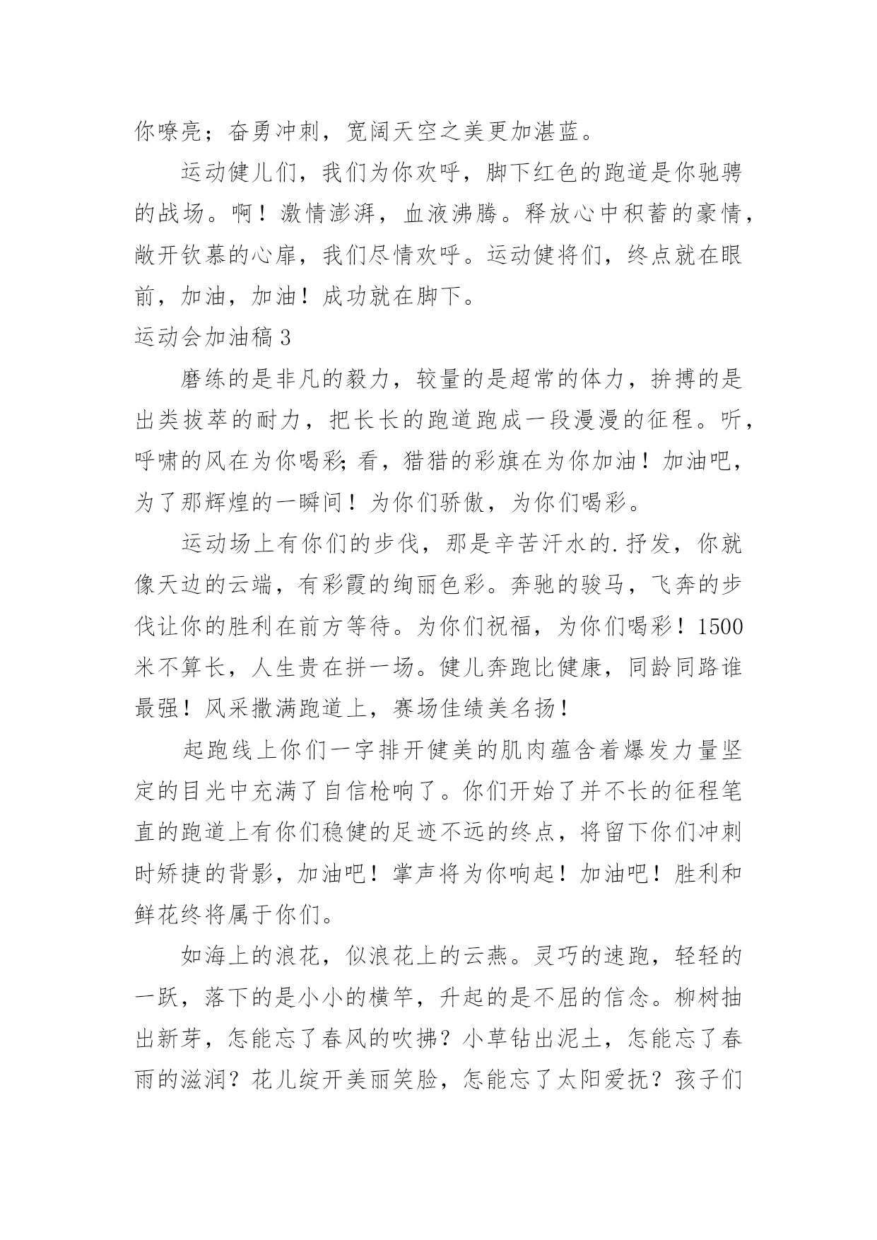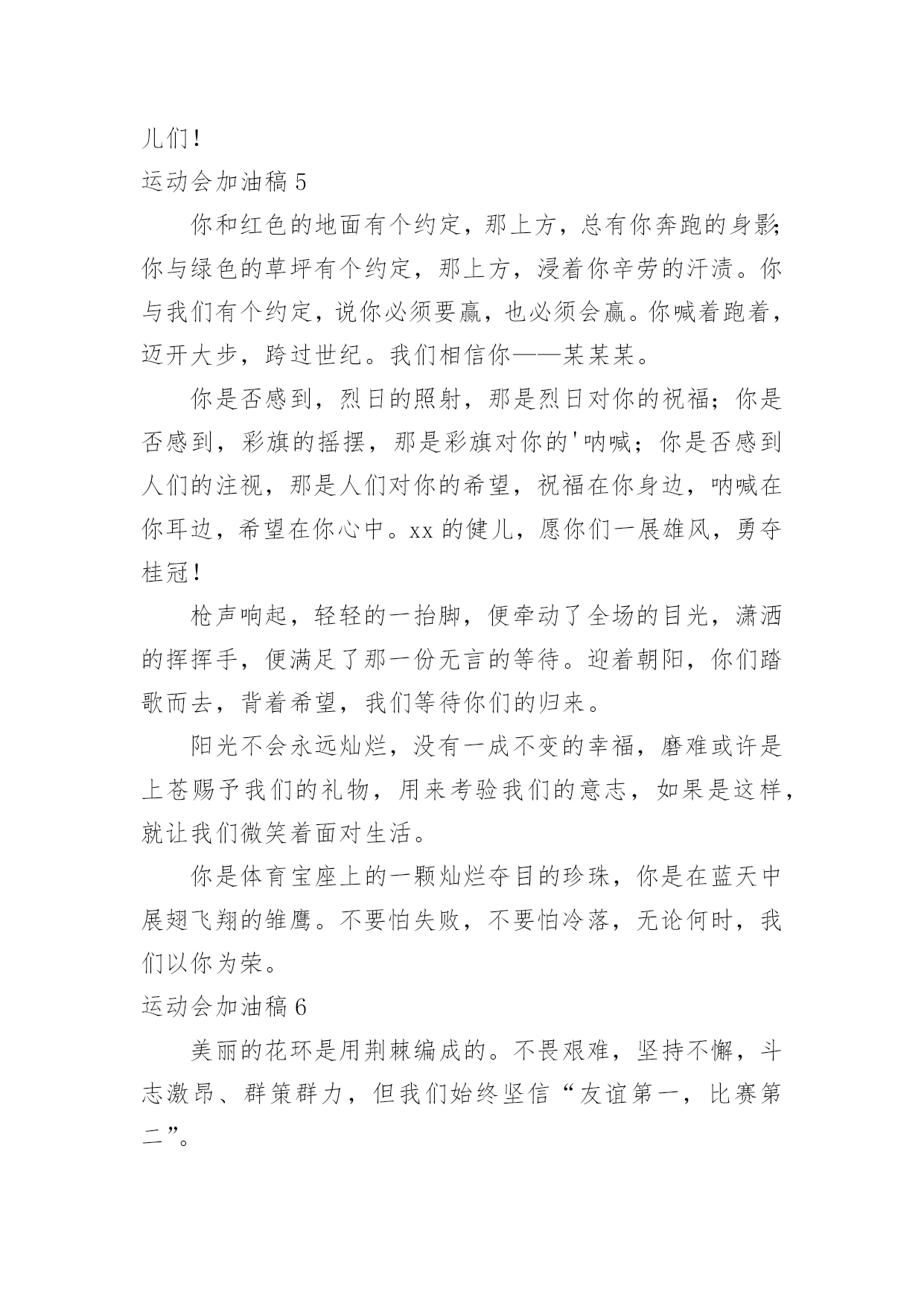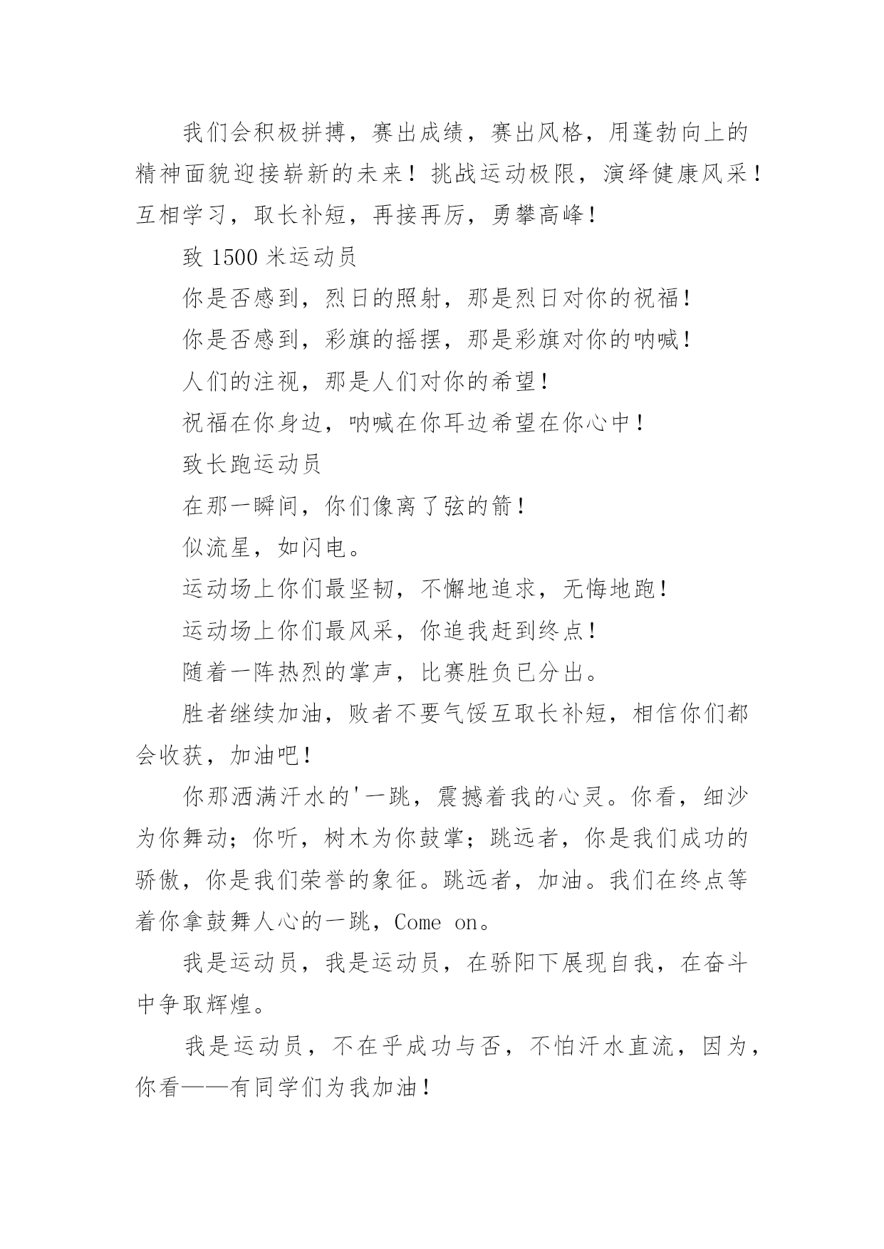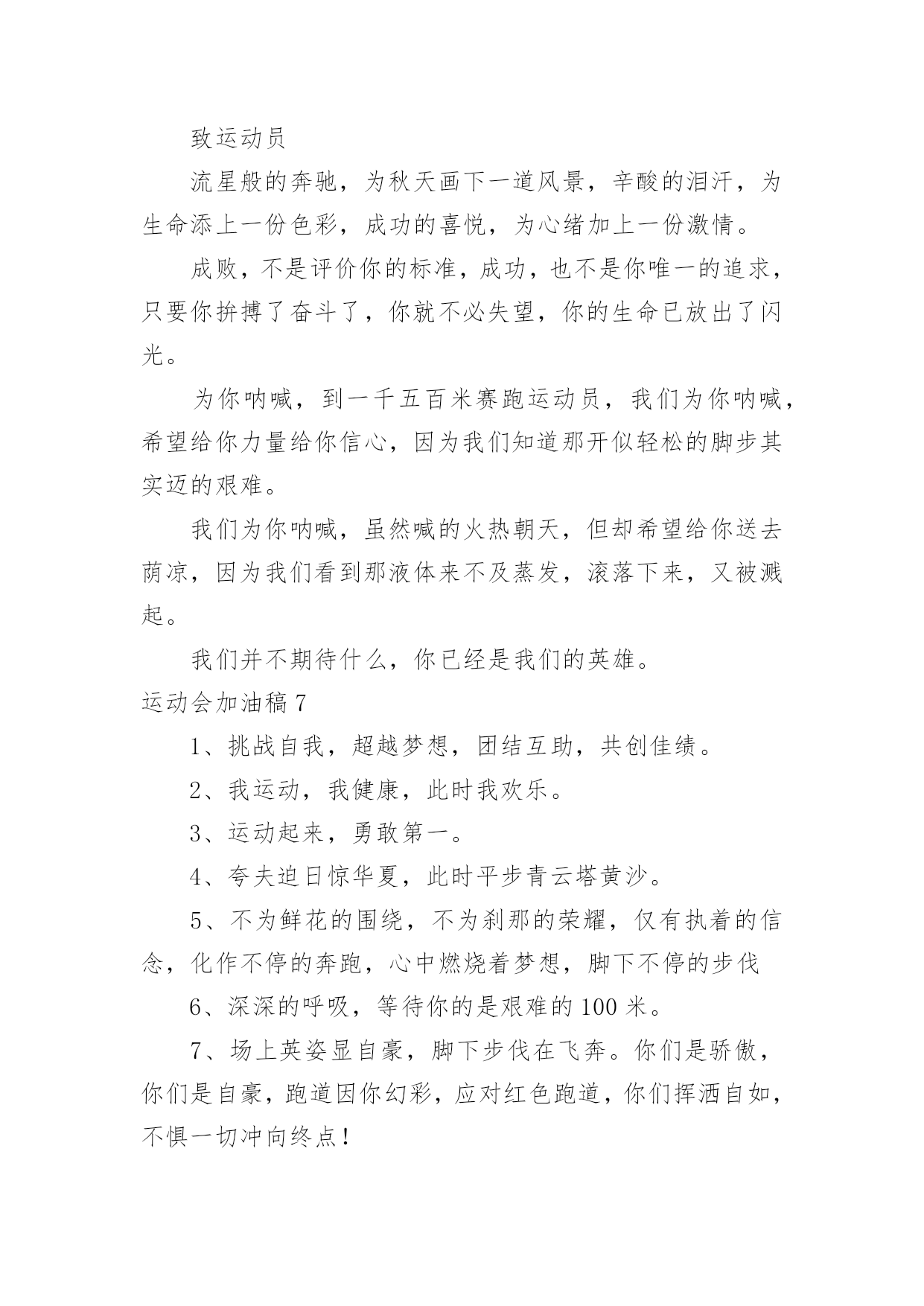 运动会加油稿运动会加油稿(集锦15篇)在现在的社会生活中,我们很多时候都不得不用到加油稿,加油稿可以给予对方克服困难的勇气和信心。你所见过的加油稿是什么样的呢?以下是小编为大家整理的运动会加油稿,希望能够帮助到大家。运动会加油稿11、奥林匹克精神佳,运动健将拼搏强。在运动场上的运动健儿们,发挥你们的特长,展示你们的风采,让你们的身影在运动场上留下优美的风景线,让你们的雄心壮志在运动场上发挥的淋漓尽致。2、山不在高,有仙则名;水不在深,有龙则灵;人不在多,有你则行。运动员们,你们那英姿飒爽豪迈的步履,深深地牵引着我们这些观众的心,让我们不分班级情不自禁的为你们呐喊,不由自主的为你们的胜利而兴奋。你们——运动场上的灵魂,你们——烈日下的主宰者,你们——我们之中的佼佼者,你们——我们骄傲的理由……因为有你,我们感到自豪。因支持,我们必胜!3、在生活中,有成功,也会有失败。因此,我们要放飞生命,也许远方很渺茫,也许我们要被“倾覆于人生的荆棘”刺伤,但我们仍无怨无悔。放飞,即使是黄昏,也必然布满歌唱的流霞,因为我们坚信,不经过战斗的舍弃是虚伪的,不经过劫难磨炼的超脱是轻佻的,逃避显示的明哲是卑怯的。4、谁能在这场激烈的竞争中获胜?让我们拭目以待,让我们为他们呐喊助威吧!只有将力量与技巧合二为一的人,才能获得胜利的桂冠!5、不到最后一刻,绝不轻言放弃,责成了你们的信仰,也成了我们的信仰,运动员们,飞吧!翅膀属于你。致百米运动员最想目睹的是你的风姿,最想倾听的是你的呼吸,最想感觉的是你呼啸而过的骤风,今日,你们是焦点;今日,你们是骄傲;今日,我们看你们创造辉煌。6、有多少次挥汗如雨,伤+痛曾添满记忆,只因为始终相信,去拼搏才能胜利。总在鼓舞自己,要成功就得努力。热血在赛场沸腾,巨人在赛场升起。相信自己,你将赢得胜利,创造奇迹;相信自己,梦想在你手中,这是你的天地。当一切过去,你们将是第一。相信自己,你们将超越极限,超越自己!相信自己,加油吧,健儿们,相信你自己。7、可敬的运动员,努力吧,前进吧,你们是强者,能战胜困难,奋勇进取;你们是鲜花,能给我班增添一道亮丽的风景线;你们是水滴的源泉,愿你们能发挥出令人意想不到的成绩;你们是佼佼者,是独一无二的,加油吧!我们的希望都寄托在你们的身上。8、在操场上,除了同学以外,还有我们的老师。今日在操场上,他们以自己的行动,为我们树立努力拼搏的榜样。虽然鬓角已有白发,皱纹已上眼角,但这些无法遮掩年轻的心!早晨的阳光照在每个人的身上,拼搏属于每个年轻的`心房。9、拼搏者,你是赛场上最亮的点。在你的眼中,不在乎胜利的欢乐与失败的眼泪,完全只是为了展示生命跳跃的节拍。奋斗者,你是生命乐章中最响的音符,在你的心中,只有不停奋斗的信念,用自己坚定的步伐去迈开人生新的旅程。场上的运动员,你是我们永远的骄傲!10、大地属于你,蓝天属于你,在你一跃的瞬间,同时跃出了我们的希望。草儿欣赏你,白云欢迎你,身轻如燕,飞跃蓝天,奥林匹克精神在你的身上体现。跳吧,跳出你的自信,跳出你的顶尖,跳出你的胜利山巅。运动会加油稿2或许会有人认为赛场是男生的天下,但在赛场上却活跃着许多女生的身影。他们与男生一样驰骋赛场,拼搏赛场,也与男生一样拥有了胜利的喜悦,拥有了令人羡慕的'掌声与鲜花;他们的飒爽风姿引人注目,在他们身上折射出有如女足运动员般的坚定信念与不屈精神,他们是盛开在赛场上的铿锵玫瑰,他们是一朵朵充满生命力的铿锵玫瑰,是一朵朵洋溢着青春朝气的铿锵玫瑰。祝愿每朵铿锵玫瑰都能怒放在人生的道路上。祝愿每朵铿锵玫瑰都能傲立在拼搏的赛场上。运动员,我们为你加油!运动员,我们为你喝彩!健步腾飞,冲向终点之路不再遥远;英姿飒爽,诚挚欢呼之声因你嘹亮;奋勇冲刺,宽阔天空之美更加湛蓝。运动健儿们,我们为你欢呼,脚下红色的跑道是你驰骋的战场。啊!激情澎湃,血液沸腾。释放心中积蓄的豪情,敞开钦慕的心扉,我们尽情欢呼。运动健将们,终点就在眼前,加油,加油!成功就在脚下。运动会加油稿3磨练的是非凡的毅力,较量的是超常的体力,拚搏的是出类拔萃的耐力,把长长的跑道跑成一段漫漫的征程。听,呼啸的风在为你喝彩;看,猎猎的彩旗在为你加油!加油吧,为了那辉煌的一瞬间!为你们骄傲,为你们喝彩。运动场上有你们的步伐,那是辛苦汗水的.抒发,你就像天边的云端,有彩霞的绚丽色彩。奔驰的骏马,飞奔的步伐让你的胜利在前方等待。为你们祝福,为你们喝彩!1500米不算长,人生贵在拼一场。健儿奔跑比健康,同龄同路谁最强!风采撒满跑道上,赛场佳绩美名扬!起跑线上你们一字排开健美的肌肉蕴含着爆发力量坚定的目光中充满了自信枪响了。你们开始了并不长的征程笔直的跑道上有你们稳健的足迹不远的终点,将留下你们冲刺时矫捷的背影,加油吧!掌声将为你响起!加油吧!胜利和鲜花终将属于你们。如海上的浪花,似