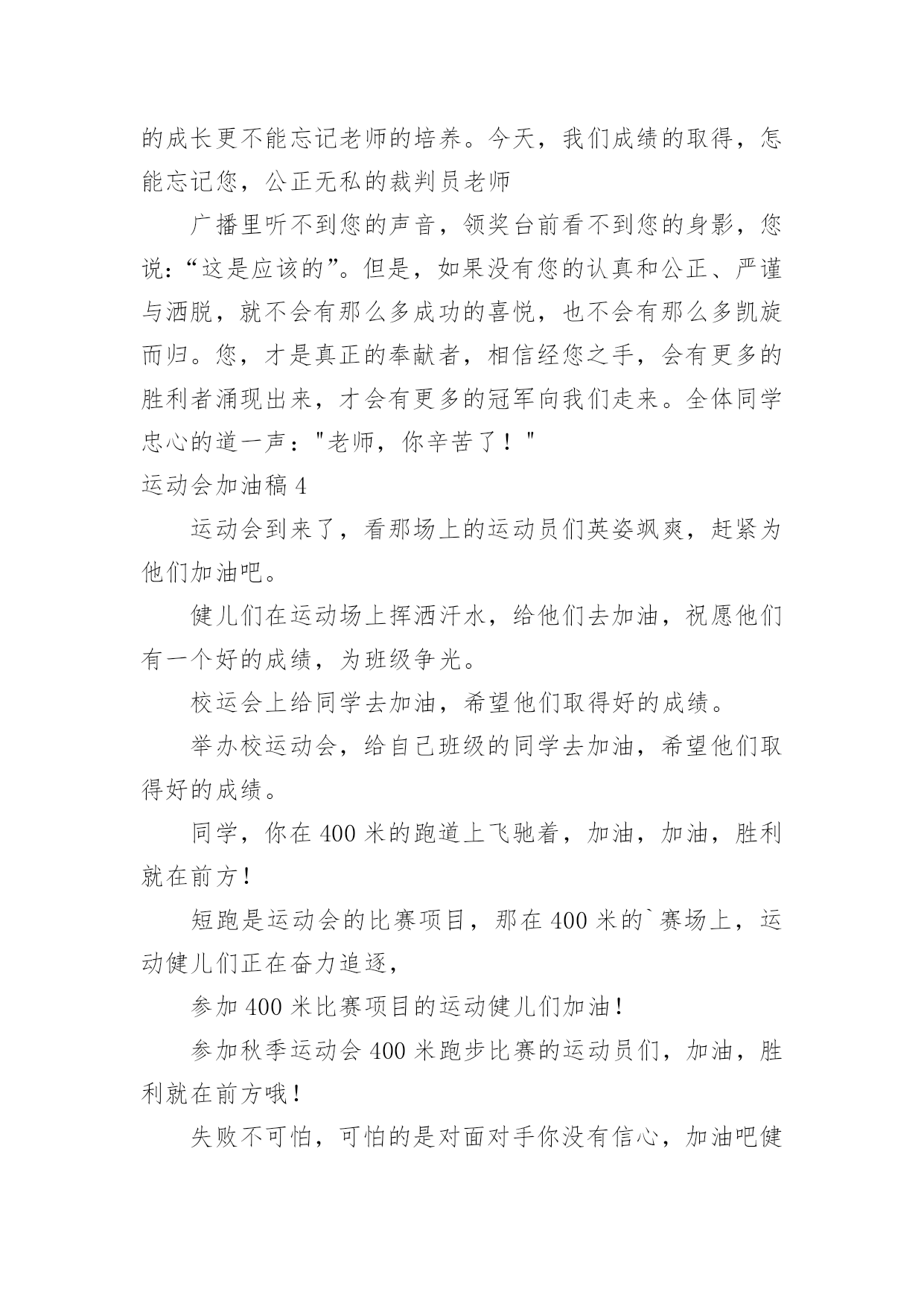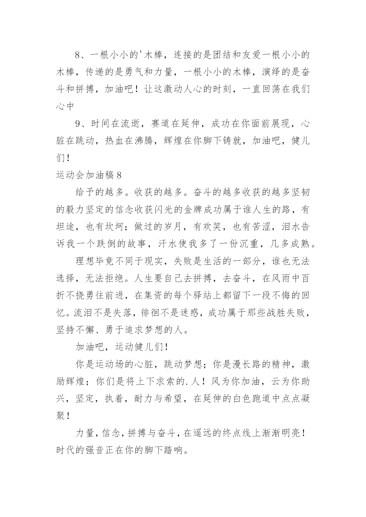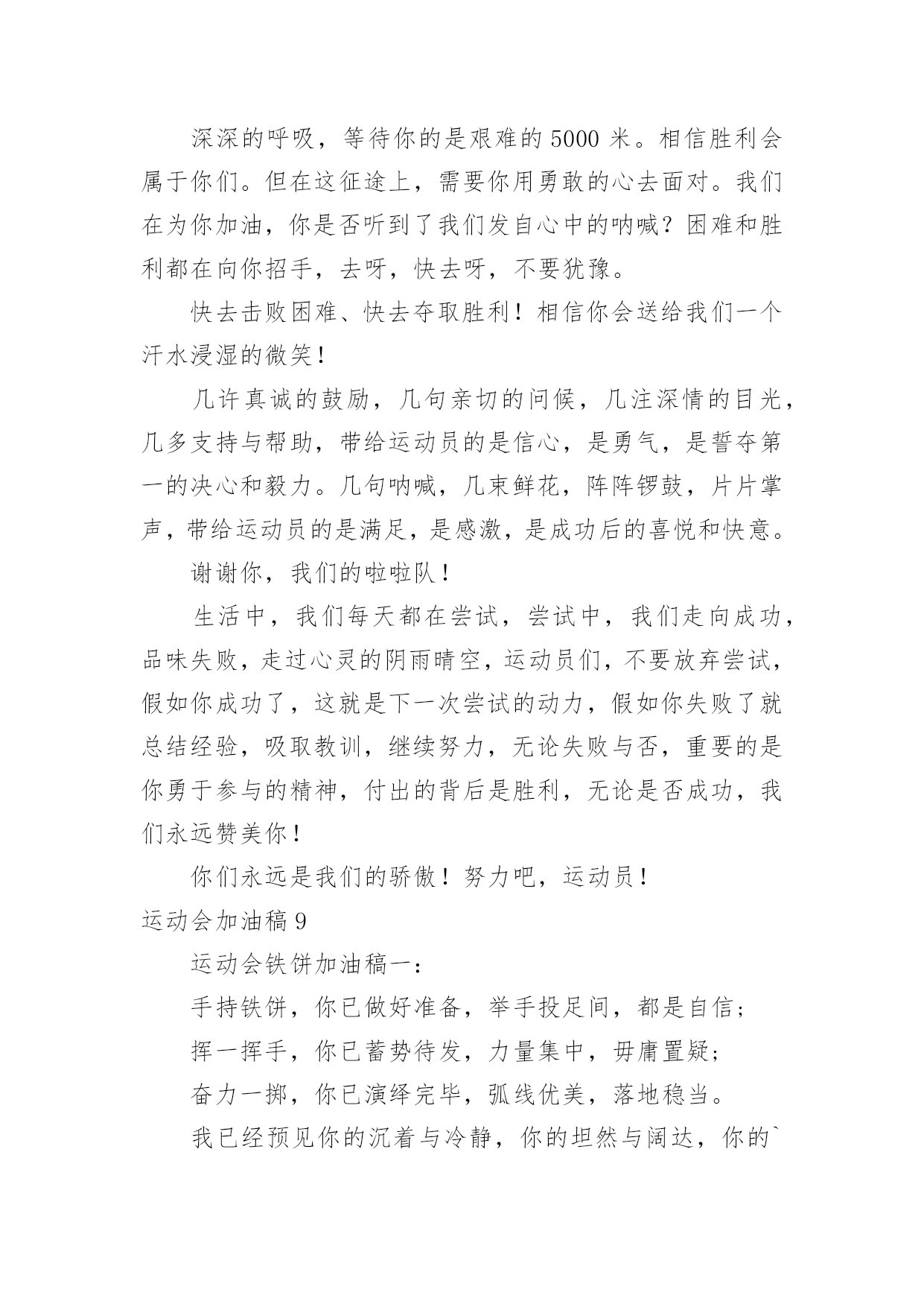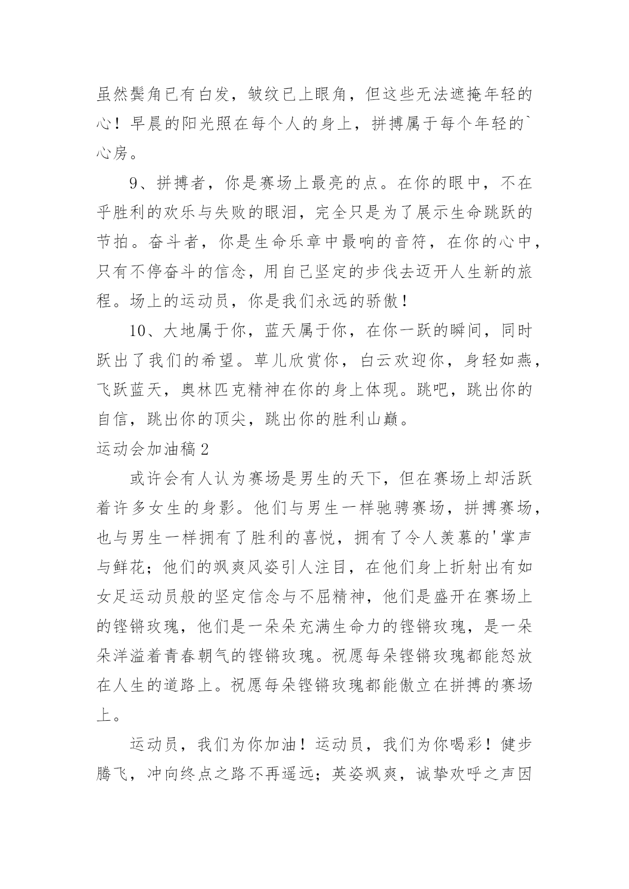 运动会加油稿运动会加油稿(集锦15篇)在现在的社会生活中,我们很多时候都不得不用到加油稿,加油稿可以给予对方克服困难的勇气和信心。你所见过的加油稿是什么样的呢?以下是小编为大家整理的运动会加油稿,希望能够帮助到大家。运动会加油稿11、奥林匹克精神佳,运动健将拼搏强。在运动场上的运动健儿们,发挥你们的特长,展示你们的风采,让你们的身影在运动场上留下优美的风景线,让你们的雄心壮志在运动场上发挥的淋漓尽致。2、山不在高,有仙则名;水不在深,有龙则灵;人不在多,有你则行。运动员们,你们那英姿飒爽豪迈的步履,深深地牵引着我们这些观众的心,让我们不分班级情不自禁的为你们呐喊,不由自主的为你们的胜利而兴奋。你们——运动场上的灵魂,你们——烈日下的主宰者,你们——我们之中的佼佼者,你们——我们骄傲的理由……因为有你,我们感到自豪。因支持,我们必胜!3、在生活中,有成功,也会有失败。因此,我们要放飞生命,也许远方很渺茫,也许我们要被“倾覆于人生的荆棘”刺伤,但我们仍无怨无悔。放飞,即使是黄昏,也必然布满歌唱的流霞,因为我们坚信,不经过战斗的舍弃是虚伪的,不经过劫难磨炼的超脱是轻佻的,逃避显示的明哲是卑怯的。4、谁能在这场激烈的竞争中获胜?让我们拭目以待,让我们为他们呐喊助威吧!只有将力量与技巧合二为一的人,才能获得胜利的桂冠!5、不到最后一刻,绝不轻言放弃,责成了你们的信仰,也成了我们的信仰,运动员们,飞吧!翅膀属于你。致百米运动员最想目睹的是你的风姿,最想倾听的是你的呼吸,最想感觉的是你呼啸而过的骤风,今日,你们是焦点;今日,你们是骄傲;今日,我们看你们创造辉煌。6、有多少次挥汗如雨,伤+痛曾添满记忆,只因为始终相信,去拼搏才能胜利。总在鼓舞自己,要成功就得努力。热血在赛场沸腾,巨人在赛场升起。相信自己,你将赢得胜利,创造奇迹;相信自己,梦想在你手中,这是你的天地。当一切过去,你们将是第一。相信自己,你们将超越极限,超越自己!相信自己,加油吧,健儿们,相信你自己。7、可敬的运动员,努力吧,前进吧,你们是强者,能战胜困难,奋勇进取;你们是鲜花,能给我班增添一道亮丽的风景线;你们是水滴的源泉,愿你们能发挥出令人意想不到的成绩;你们是佼佼者,是独一无二的,加油吧!我们的希望都寄托在你们的身上。8、在操场上,除了同学以外,还有我们的老师。今日在操场上,他们以自己的行动,为我们树立努力拼搏的榜样。虽然鬓角已有白发,皱纹已上眼角,但这些无法遮掩年轻的心!早晨的阳光照在每个人的身上,拼搏属于每个年轻的`心房。9、拼搏者,你是赛场上最亮的点。在你的眼中,不在乎胜利的欢乐与失败的眼泪,完全只是为了展示生命跳跃的节拍。奋斗者,你是生命乐章中最响的音符,在你的心中,只有不停奋斗的信念,用自己坚定的步伐去迈开人生新的旅程。场上的运动员,你是我们永远的骄傲!10、大地属于你,蓝天属于你,在你一跃的瞬间,同时跃出了我们的希望。草儿欣赏你,白云欢迎你,身轻如燕,飞跃蓝天,奥林匹克精神在你的身上体现。跳吧,跳出你的自信,跳出你的顶尖,跳出你的胜利山巅。运动会加油稿2或许会有人认为赛场是男生的天下,但在赛场上却活跃着许多女生的身影。他们与男生一样驰骋赛场,拼搏赛场,也与男生一样拥有了胜利的喜悦,拥有了令人羡慕的'掌声与鲜花;他们的飒爽风姿引人注目,在他们身上折射出有如女足运动员般的坚定信念与不屈精神,他们是盛开在赛场上的铿锵玫瑰,他们是一朵朵充满生命力的铿锵玫瑰,是一朵朵洋溢着青春朝气的铿锵玫瑰。祝愿每朵铿锵玫瑰都能怒放在人生的道路上。祝愿每朵铿锵玫瑰都能傲立在拼搏的赛场上。运动员,我们为你加油!运动员,我们为你喝彩!健步腾飞,冲向终点之路不再遥远;英姿飒爽,诚挚欢呼之声因你嘹亮;奋勇冲刺,宽阔天空之美更加湛蓝。运动健儿们,我们为你欢呼,脚下红色的跑道是你驰骋的战场。啊!激情澎湃,血液沸腾。释放心中积蓄的豪情,敞开钦慕的心扉,我们尽情欢呼。运动健将们,终点就在眼前,加油,加油!成功就在脚下。运动会加油稿3磨练的是非凡的毅力,较量的是超常的体力,拚搏的是出类拔萃的耐力,把长长的跑道跑成一段漫漫的征程。听,呼啸的风在为你喝彩;看,猎猎的彩旗在为你加油!加油吧,为了那辉煌的一瞬间!为你们骄傲,为你们喝彩。运动场上有你们的步伐,那是辛苦汗水的.抒发,你就像天边的云端,有彩霞的绚丽色彩。奔驰的骏马,飞奔的步伐让你的胜利在前方等待。为你们祝福,为你们喝彩!1500米不算长,人生贵在拼一场。健儿奔跑比健康,同龄同路谁最强!风采撒满跑道上,赛场佳绩美名扬!起跑线上你们一字排开健美的肌肉蕴含着爆发力量坚定的目光中充满了自信枪响了。你们开始了并不长的征程笔直的跑道上有你们稳健的足迹不远的终点,将留下你们冲刺时矫捷的背影,加油吧!掌声将为你响起!加油吧!胜利和鲜花终将属于你们。如海上的浪花,似