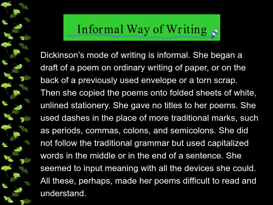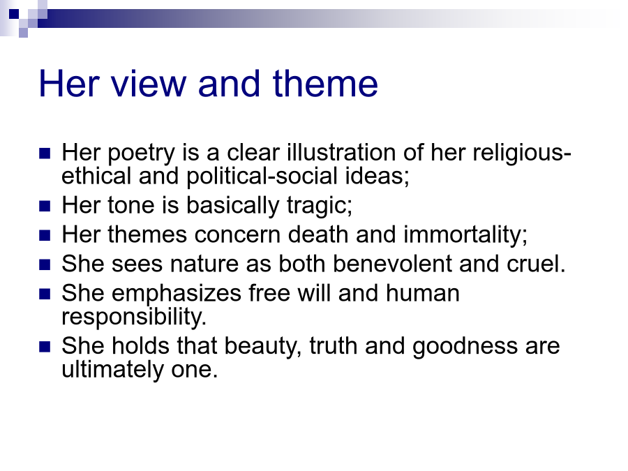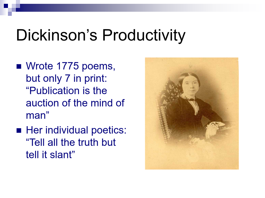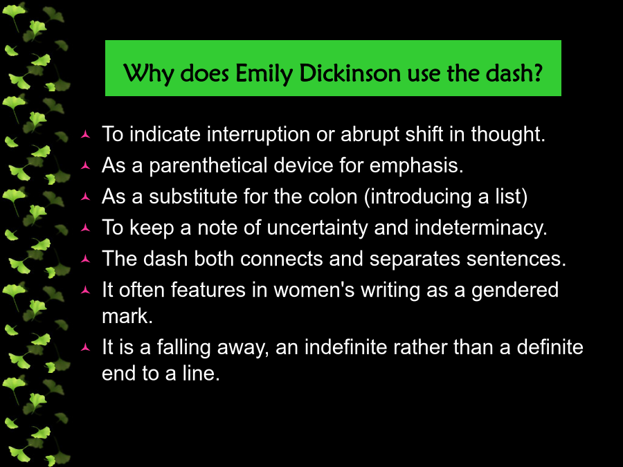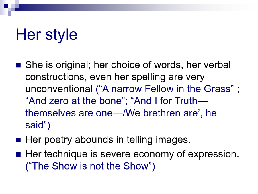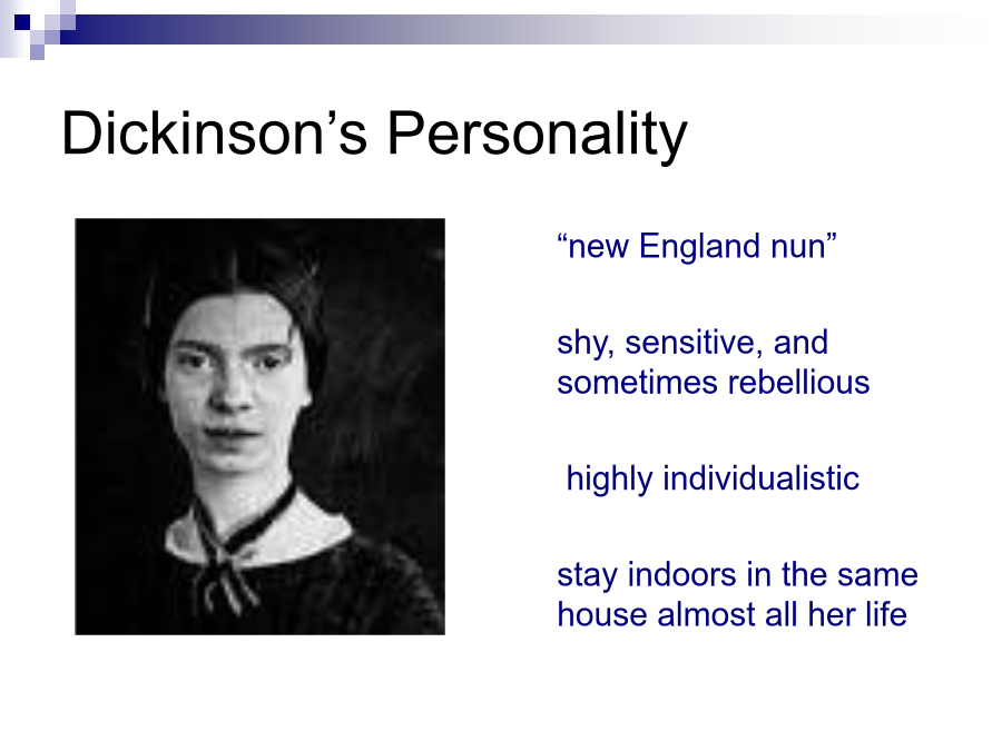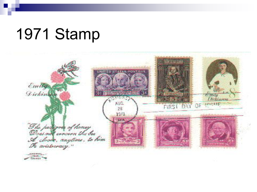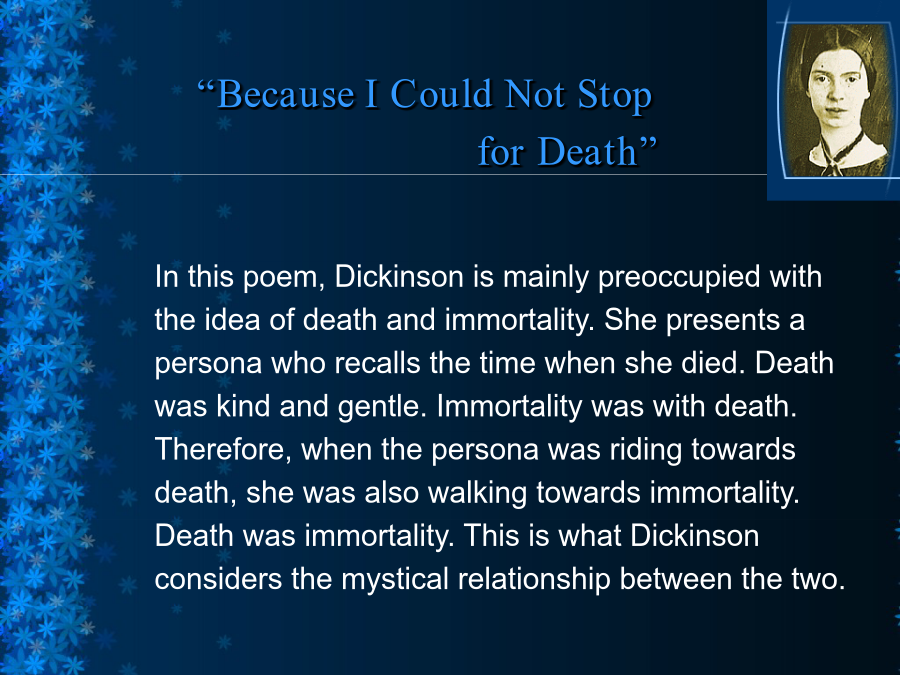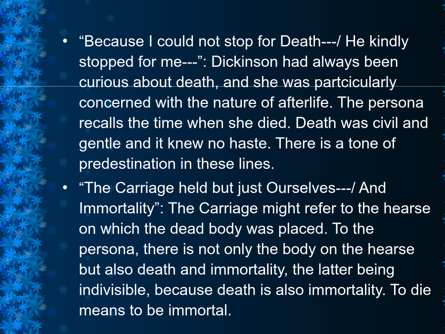 EmilyDickinsonDickinson’sPersonalityDickinson’sProductivity1971StampHerviewandthemeHerstyleInformalWayofWritingWhydoesEmilyDickinsonusethedash?Inthispoem,Dickinsonismainlypreoccupiedwiththeideaofdeathandimmortality.Shepresentsapersonawhorecallsthetimewhenshedied.Deathwaskindandgentle.Immortalitywaswithdeath.Therefore,whenthepersonawasridingtowardsdeath,shewasalsowalkingtowardsimmortality.Deathwasimmortality.ThisiswhatDickinsonconsidersthemysticalrelationshipbetweenthetwo.“BecauseIcouldnotstopforDeath---/Hekindlystoppedforme---”:Dickinsonhadalwaysbeencuriousaboutdeath,andshewaspartcicularlyconcernedwiththenatureofafterlife.Thepersonarecallsthetimewhenshedied.Deathwascivilandgentleanditknewnohaste.Thereisatoneofpredestinationintheselines.“TheCarriageheldbutjustOurselves---/AndImmortality”:TheCarriagemightrefertothehearseonwhichthedeadbodywasplaced.Tothepersona,thereisnotonlythebodyonthehearsebutalsodeathandimmortality,thelatterbeingindivisible,becausedeathisalsoimmortality.Todiemeanstobeimmortal.Whatsignificancedoestheflyimply?Fliesarecreatureswithnegativesymbolicassoci-ations.Incertainculturalcontexts,theywereseenasembodimentsofdemonicpowers;ineverydaylife,aflyisalwaysassociatedwiththerottenfood.Sointhispoem,theflyfirstcomestolookforfoodonthedead.Butitmightalsorefertodeathitself.Explainthesecondstanza.Thecomingofdeathiscomparedtoafightwithdeath.Thefrailtyofthedyingdidnotallowanyresistance.Soallthepeople(relativesandfriends)couldjustwaitfortheappearanceofDeath,forthelastjudgment.“WithBlue-uncertainstumblingBuzz-/Betweenthelight-andme-”:Theselinesdescribethelastthingthedyingpersonsayandheard,literallytheflyanditsbuzz.Thedyingonecouldneitherseenorhearclearly.Sotheflymayrepresentalltheremainingthings.Asdeathcamenearer,alltheremainingthingsofthisworldbecamedim&trivial.Whatisthesymbolicmeaningof“theWindowsfailed”?Eyesareconsideredasthewindowsofhumansoul.WhentheWindowsfailed,i.e.theeyesfailed,thehumansoulwasclosedandthepersondied.Everythingwasshutout.Whatleftwason