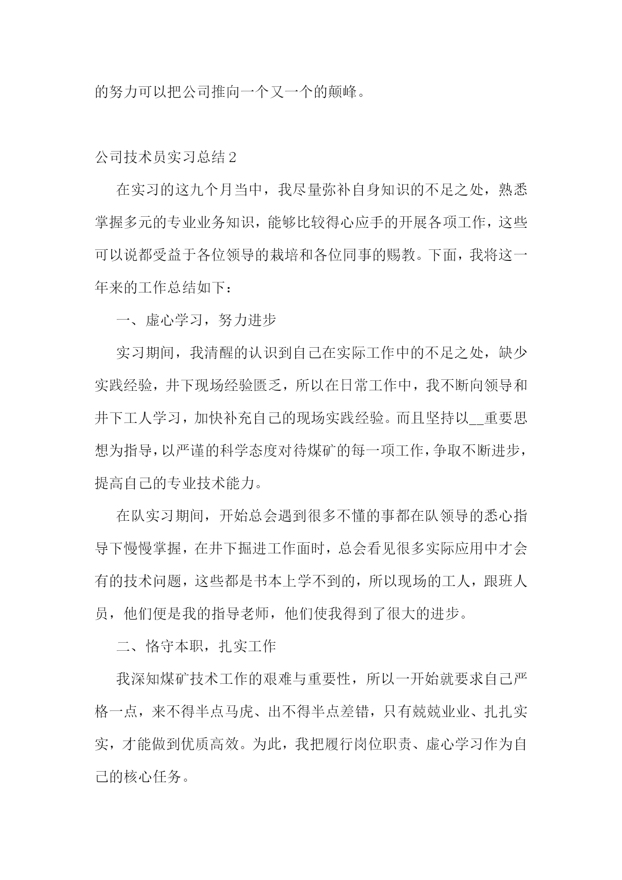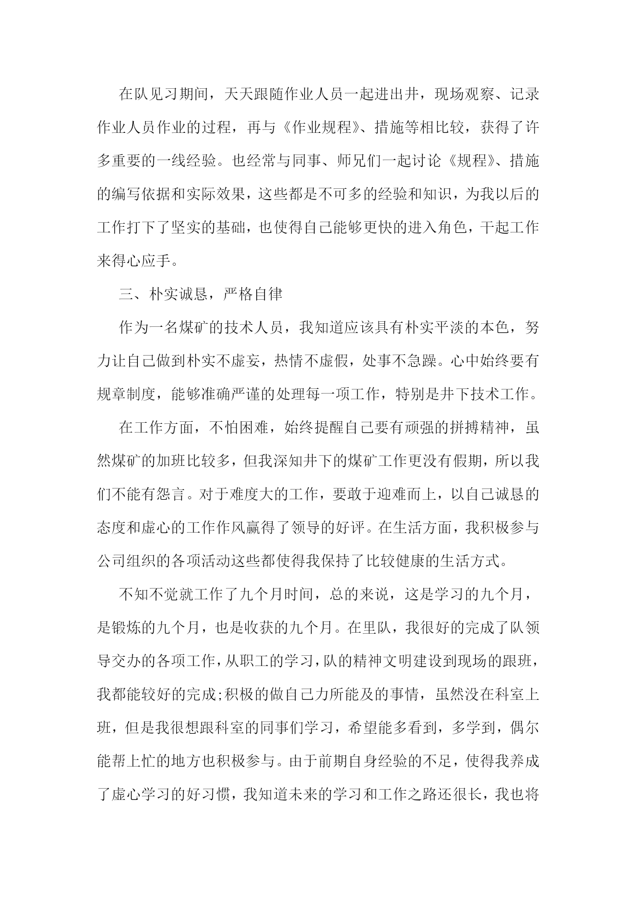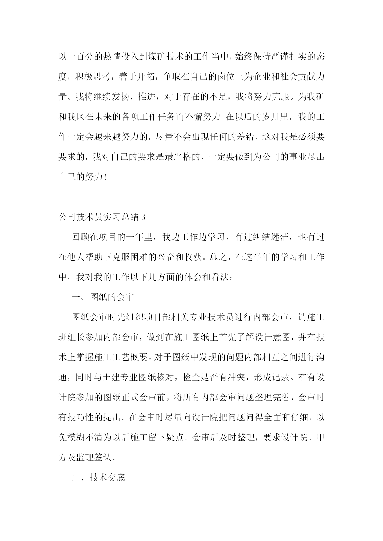 公司技术员实习总结公司技术员实习总结1进公司以来,本人尊敬领导,与同事关系融洽。为尽快进入工作角色,本人自觉认真学习本公司、本部门、本岗位的各项制度、规则,严格按照公司里制定的工作制度开展工作。在这近三个月的工作和学习中,接触了不少人和事,在为自己的成长欢欣鼓舞的同时,我也明白自己尚有许多缺点需要改正。工作以来,在领导的教导和培养下,在同事们的关心和帮助下,自己的思想、工作等各方面都取得了一定的成绩,个人综合素质也得到了一定的提高,现将这三个月来的个人实习工作总结如下:一、工作情况怀着对生活的无限憧憬,我进入了__公司。在实习期的工作中,一方面我严格遵守公司的各项规章制度,不迟到、不早退、严于律己,自觉的遵守各项工作制度;另一方面,吃苦耐劳、积极主动、努力工作;在完成领导交办工作的同时,积极主动的协助其他同事开展工作,并在工作过程中虚心学习以提高自身各方面的能力;工作细节中,我看到公司正逐步做大做强,以目前的趋势,我可以预见公司将有一个辉煌的明天。作为新员工,目前我所能做的就是努力工作,让自己在平凡的岗位上挥洒自己的汗水,焕发自己的热情;使自己在基层得到更多的锻炼。二、学习情况现在是我努力学习的阶段。三人行,必有我师,公司中的每一位同事都是我的老师,他们的丰富经验和工作行为对于我来说就是一笔宝贵的财富。记得我刚到公司的时候,对生产线上的一切都感到陌生而新奇。因为我之前没有过类似的工作经验,所以知道的也有限,但是在领导和同事的的热心帮助下,我受益颇多。带着饱满的工作热情,我逐渐熟悉了设备的操作。尽管我只是入门,而且相对而言年龄要大一点,但是我和其他年轻人一样对工作充满着热情。为尽快提高自己在本职方面的知识和能力,充分发挥自己的主观能动性,我利用业余时间多和同事交流学习,在短短三个月中理论结合实践让我对变电站的基本设备有了真正的认识,这为今后的工作打下了基矗。作为新员工,我经常思考的问题就是如何避免失误,特别是在实习期间,严谨的工作态度决定了自身的工作效率,为此我经常向同事请教。在公司呆了三个月,我接触了很多同事,就在接触他们的同时,我才知道在集体和谐相处是快乐工作的保证。无论是社会还是单位为人处事都是一门高深的学问。对于这门高深的学问,我目前首要做的是诚实做人、努力工作!三、思想情况作为一名新员工,我今后的职业生涯还很长,学习的机会还很多。为此我将尽我所能地对我的工作进行开拓,做出成绩。为早日实现目标,我要求自己:努力工作,保持优点,改正缺点,充分体现自己的人生价值,为企业美好的明天尽一份力。我更希望通过公司全体员工的努力可以把公司推向一个又一个的颠峰。公司技术员实习总结2在实习的这九个月当中,我尽量弥补自身知识的不足之处,熟悉掌握多元的专业业务知识,能够比较得心应手的开展各项工作,这些可以说都受益于各位领导的栽培和各位同事的赐教。下面,我将这一年来的工作总结如下:一、虚心学习,努力进步实习期间,我清醒的认识到自己在实际工作中的不足之处,缺少实践经验,井下现场经验匮乏,所以在日常工作中,我不断向领导和井下工人学习,加快补充自己的现场实践经验。而且坚持以__重要思想为指导,以严谨的科学态度对待煤矿的每一项工作,争取不断进步,提高自己的专业技术能力。在队实习期间,开始总会遇到很多不懂的事都在队领导的悉心指导下慢慢掌握,在井下掘进工作面时,总会看见很多实际应用中才会有的技术问题,这些都是书本上学不到的,所以现场的工人,跟班人员,他们便是我的指导老师,他们使我得到了很大的进步。二、恪守本职,扎实工作我深知煤矿技术工作的艰难与重要性,所以一开始就要求自己严格一点,来不得半点马虎、出不得半点差错,只有兢兢业业、扎扎实实,才能做到优质高效。为此,我把履行岗位职责、虚心学习作为自己的核心任务。在队见习期间,天天跟随作业人员一起进出井,现场观察、记录作业人员作业的过程,再与《作业规程》、措施等相比较,获得了许多重要的一线经验。也经常与同事、师兄们一起讨论《规程》、措施的编写依据和实际效果,这些都是不可多的经验和知识,为我以后的工作打下了坚实的基础,也使得自己能够更快的进入角色,干起工作来得心应手。三、朴实诚恳,严格自律作为一名煤矿的技术人员,我知道应该具有朴实平淡的本色,努力让自己做到朴实不虚妄,热情不虚假,处事不急躁。心中始终要有规章制度,能够准确严谨的处理每一项工作,特别是井下技术工作。在工作方面,不怕困难,始终提醒自己要有顽强的拼搏精神,虽然煤矿的加班比较多,但我深知井下的煤矿工作更没有假期,所以我们不能有怨言。对于难度大的工作,要敢于迎难而上,以自己诚恳的态度和虚心的工作作风赢得了领导的好评。在生活方面,我积极参与公司组织的各项活动这些都使得我保持了比较健康的生活方式。不知不觉就工作了九个