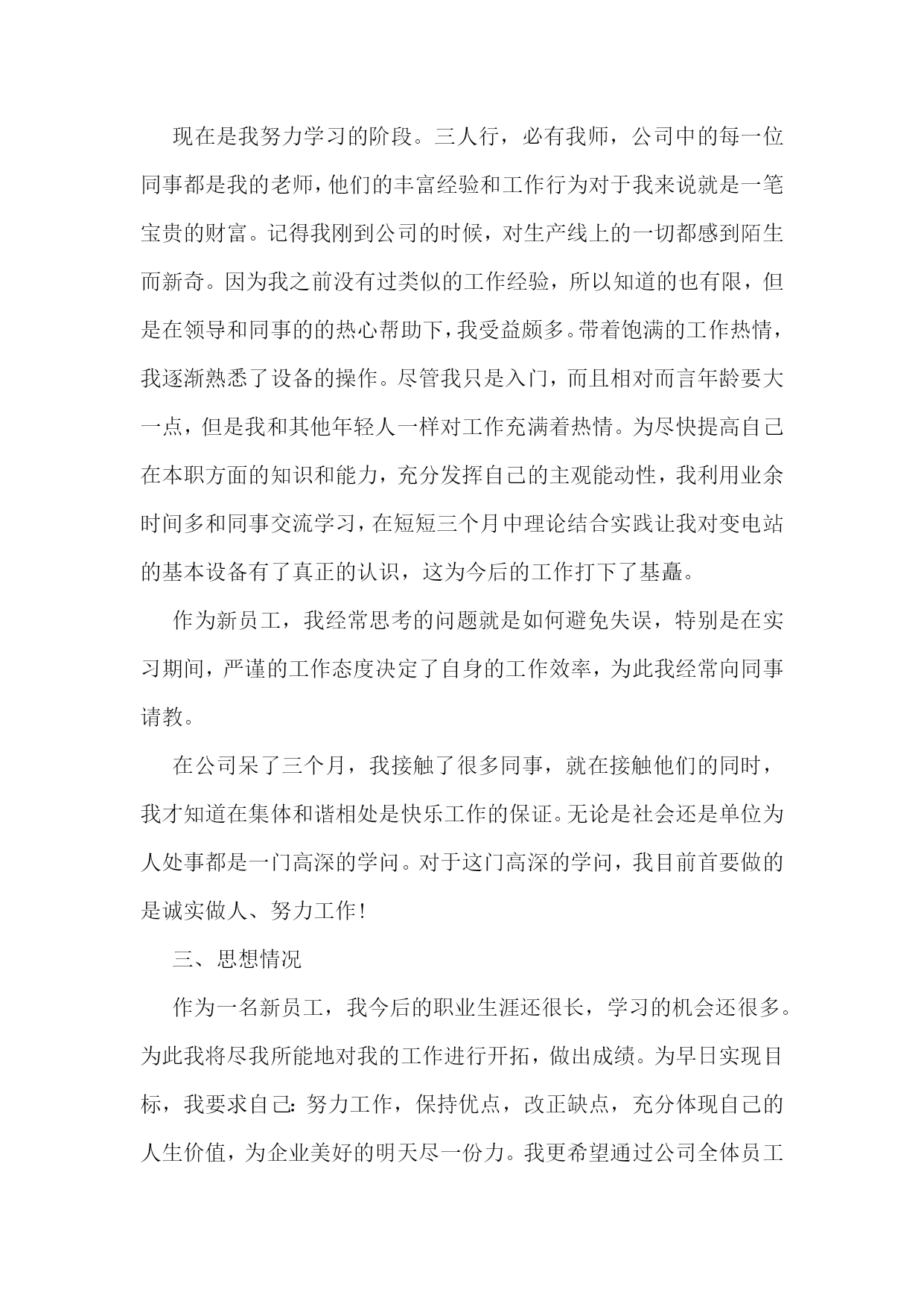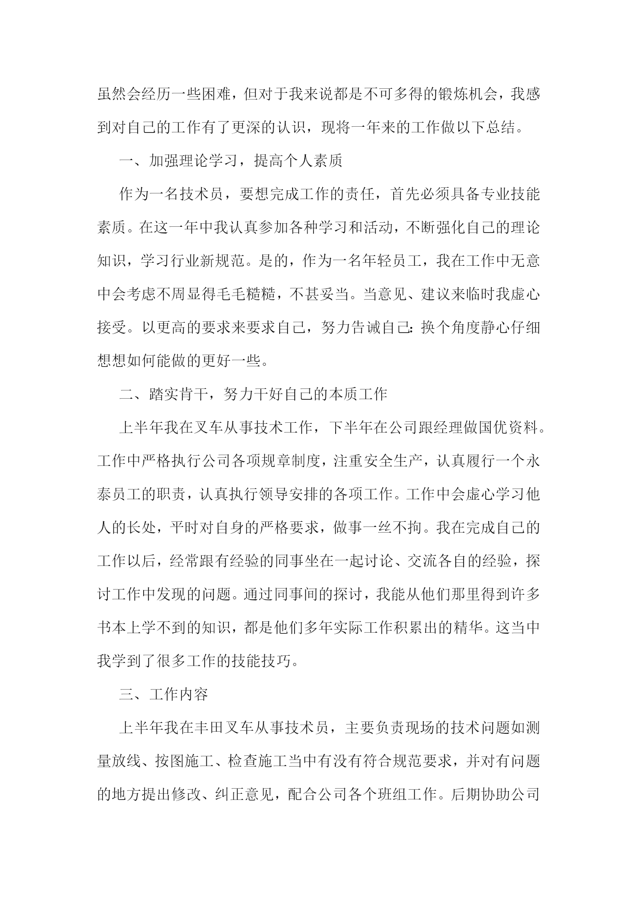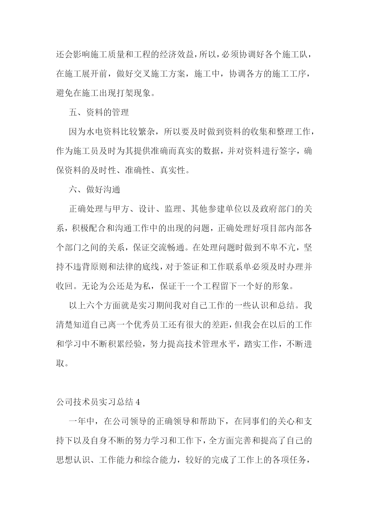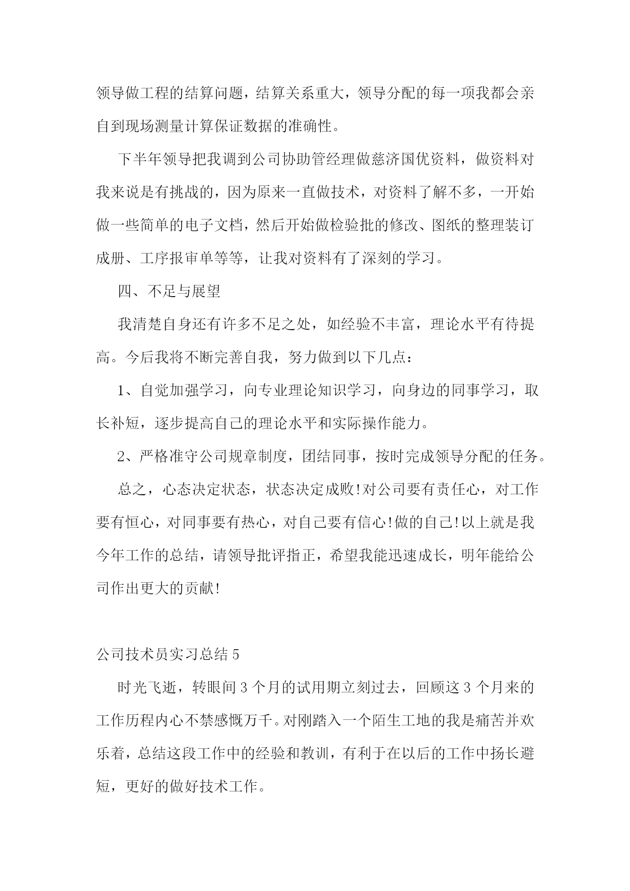 公司技术员实习总结公司技术员实习总结1进公司以来,本人尊敬领导,与同事关系融洽。为尽快进入工作角色,本人自觉认真学习本公司、本部门、本岗位的各项制度、规则,严格按照公司里制定的工作制度开展工作。在这近三个月的工作和学习中,接触了不少人和事,在为自己的成长欢欣鼓舞的同时,我也明白自己尚有许多缺点需要改正。工作以来,在领导的教导和培养下,在同事们的关心和帮助下,自己的思想、工作等各方面都取得了一定的成绩,个人综合素质也得到了一定的提高,现将这三个月来的个人实习工作总结如下:一、工作情况怀着对生活的无限憧憬,我进入了__公司。在实习期的工作中,一方面我严格遵守公司的各项规章制度,不迟到、不早退、严于律己,自觉的遵守各项工作制度;另一方面,吃苦耐劳、积极主动、努力工作;在完成领导交办工作的同时,积极主动的协助其他同事开展工作,并在工作过程中虚心学习以提高自身各方面的能力;工作细节中,我看到公司正逐步做大做强,以目前的趋势,我可以预见公司将有一个辉煌的明天。作为新员工,目前我所能做的就是努力工作,让自己在平凡的岗位上挥洒自己的汗水,焕发自己的热情;使自己在基层得到更多的锻炼。二、学习情况现在是我努力学习的阶段。三人行,必有我师,公司中的每一位同事都是我的老师,他们的丰富经验和工作行为对于我来说就是一笔宝贵的财富。记得我刚到公司的时候,对生产线上的一切都感到陌生而新奇。因为我之前没有过类似的工作经验,所以知道的也有限,但是在领导和同事的的热心帮助下,我受益颇多。带着饱满的工作热情,我逐渐熟悉了设备的操作。尽管我只是入门,而且相对而言年龄要大一点,但是我和其他年轻人一样对工作充满着热情。为尽快提高自己在本职方面的知识和能力,充分发挥自己的主观能动性,我利用业余时间多和同事交流学习,在短短三个月中理论结合实践让我对变电站的基本设备有了真正的认识,这为今后的工作打下了基矗。作为新员工,我经常思考的问题就是如何避免失误,特别是在实习期间,严谨的工作态度决定了自身的工作效率,为此我经常向同事请教。在公司呆了三个月,我接触了很多同事,就在接触他们的同时,我才知道在集体和谐相处是快乐工作的保证。无论是社会还是单位为人处事都是一门高深的学问。对于这门高深的学问,我目前首要做的是诚实做人、努力工作!三、思想情况作为一名新员工,我今后的职业生涯还很长,学习的机会还很多。为此我将尽我所能地对我的工作进行开拓,做出成绩。为早日实现目标,我要求自己:努力工作,保持优点,改正缺点,充分体现自己的人生价值,为企业美好的明天尽一份力。我更希望通过公司全体员工的努力可以把公司推向一个又一个的颠峰。公司技术员实习总结2在实习的这九个月当中,我尽量弥补自身知识的不足之处,熟悉掌握多元的专业业务知识,能够比较得心应手的开展各项工作,这些可以说都受益于各位领导的栽培和各位同事的赐教。下面,我将这一年来的工作总结如下:一、虚心学习,努力进步实习期间,我清醒的认识到自己在实际工作中的不足之处,缺少实践经验,井下现场经验匮乏,所以在日常工作中,我不断向领导和井下工人学习,加快补充自己的现场实践经验。而且坚持以__重要思想为指导,以严谨的科学态度对待煤矿的每一项工作,争取不断进步,提高自己的专业技术能力。在队实习期间,开始总会遇到很多不懂的事都在队领导的悉心指导下慢慢掌握,在井下掘进工作面时,总会看见很多实际应用中才会有的技术问题,这些都是书本上学不到的,所以现场的工人,跟班人员,他们便是我的指导老师,他们使我得到了很大的进步。二、恪守本职,扎实工作我深知煤矿技术工作的艰难与重要性,所以一开始就要求自己严格一点,来不得半点马虎、出不得半点差错,只有兢兢业业、扎扎实实,才能做到优质高效。为此,我把履行岗位职责、虚心学习作为自己的核心任务。在队见习期间,天天跟随作业人员一起进出井,现场观察、记录作业人员作业的过程,再与《作业规程》、措施等相比较,获得了许多重要的一线经验。也经常与同事、师兄们一起讨论《规程》、措施的编写依据和实际效果,这些都是不可多的经验和知识,为我以后的工作打下了坚实的基础,也使得自己能够更快的进入角色,干起工作来得心应手。三、朴实诚恳,严格自律作为一名煤矿的技术人员,我知道应该具有朴实平淡的本色,努力让自己做到朴实不虚妄,热情不虚假,处事不急躁。心中始终要有规章制度,能够准确严谨的处理每一项工作,特别是井下技术工作。在工作方面,不怕困难,始终提醒自己要有顽强的拼搏精神,虽然煤矿的加班比较多,但我深知井下的煤矿工作更没有假期,所以我们不能有怨言。对于难度大的工作,要敢于迎难而上,以自己诚恳的态度和虚心的工作作风赢得了领导的好评。在生活方面,我积极参与公司组织的各项活动这些都使得我保持了比较健康的生活方式。不知不觉就工作了九个
