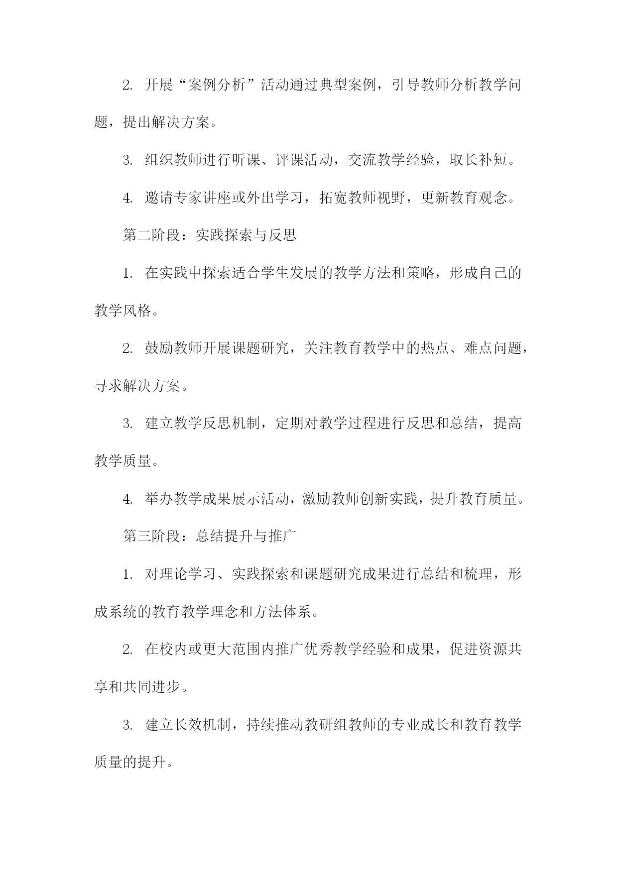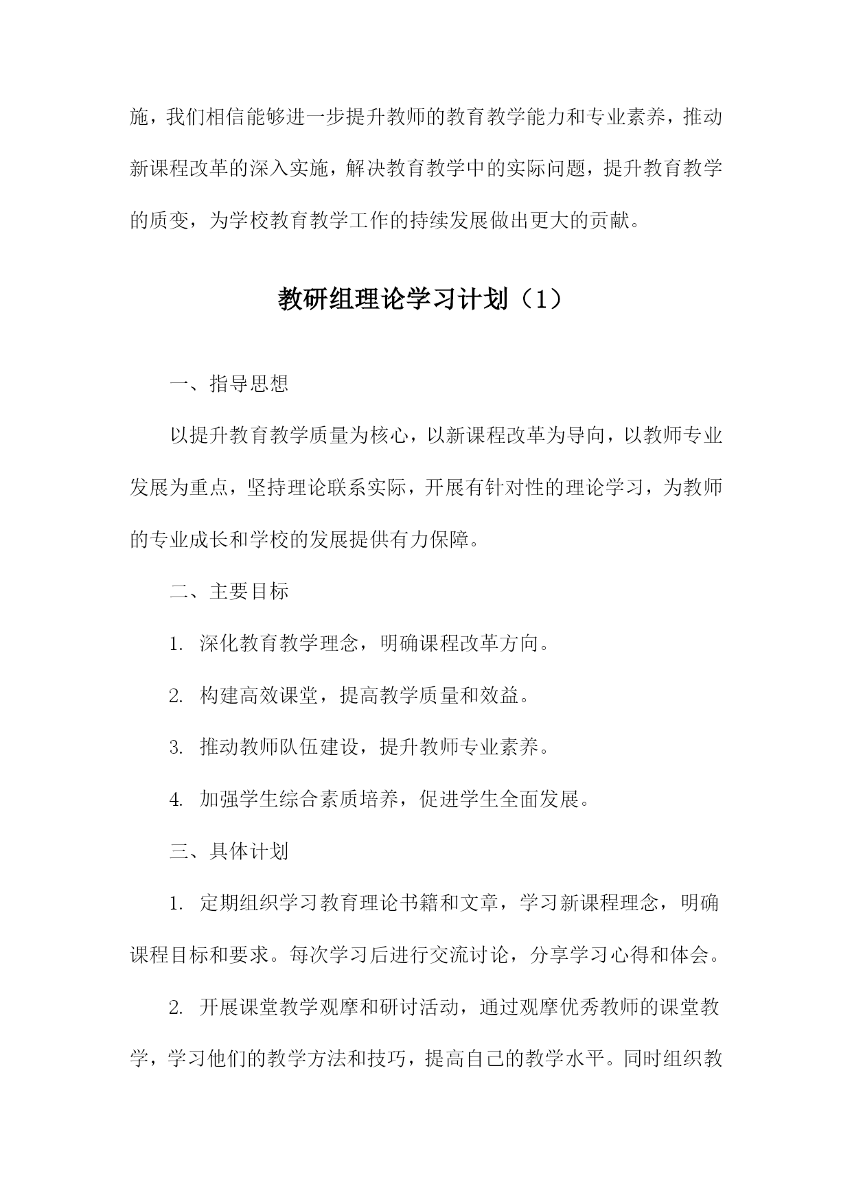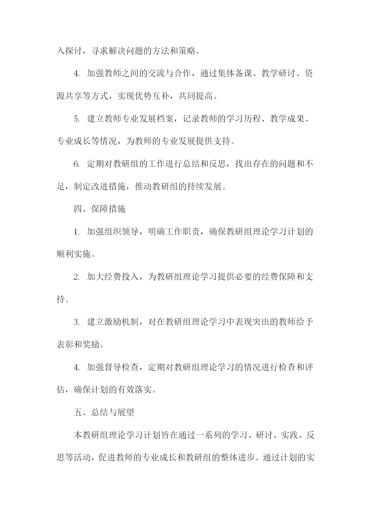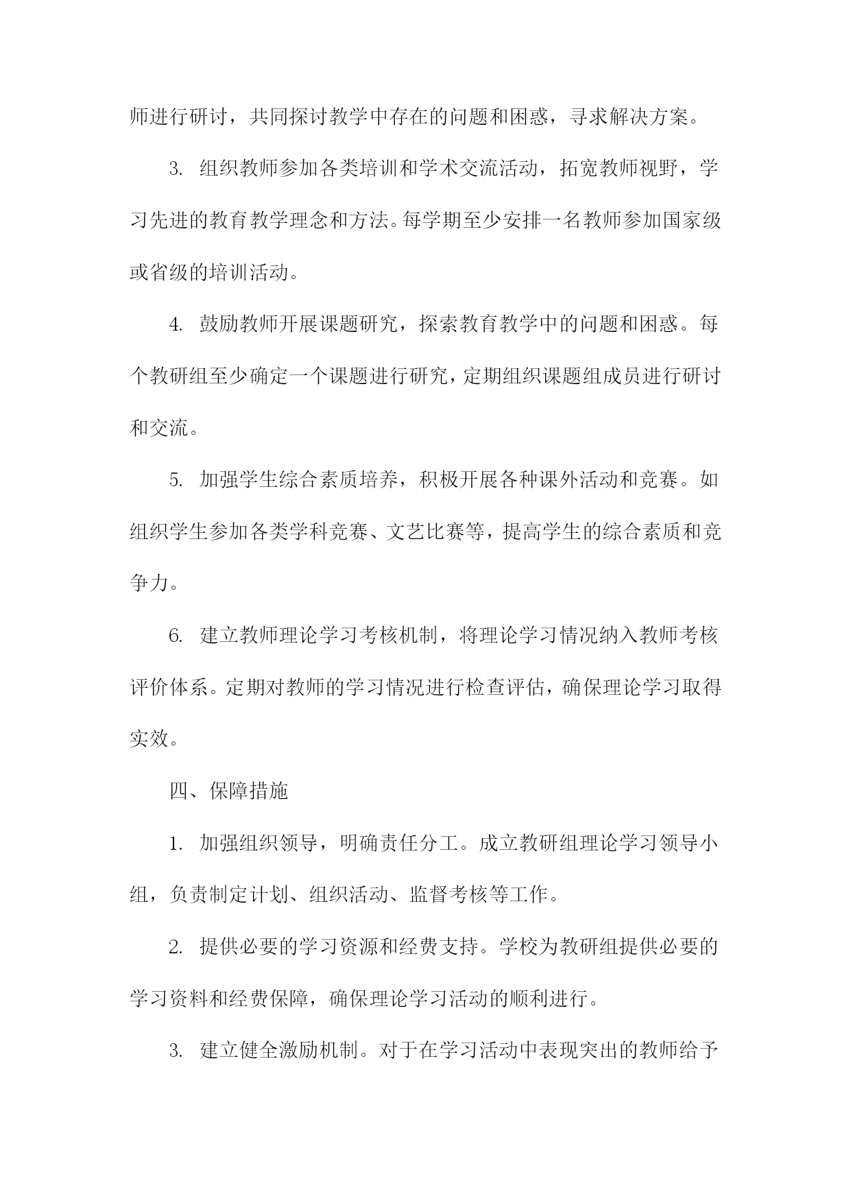教研组理论学习计划一、指导思想以提升教育教学质量为核心,以新课程改革为导向,以教师专业发展为重点,以解决教育教学中的实际问题为切入点,坚持理论与实践相结合,通过学习、研讨、实践、反思等途径,促进教师的专业成长,推动教研组的整体进步。二、主要目标1.促进教师队伍建设,提高教师的教育教学能力和专业素养;2.推动新课程改革,探索适合学生发展的教育教学模式;3.解决教育教学中的实际问题,提高教育教学的针对性和实效性;4.提升教研组的整体实力,推动学校教育教学工作的持续发展。三、具体计划1.定期组织教师学习新课程理论,理解新课程理念,掌握新课程标准,明确新课程改革的方向。2.开展课堂教学观摩和研讨活动,通过案例分析、教学反思等方式,提高教师的课堂教学水平和能力。3.组织教师开展课题研究,围绕教育教学中的实际问题进行深入探讨,寻求解决问题的方法和策略。4.加强教师之间的交流与合作,通过集体备课、教学研讨、资源共享等方式,实现优势互补,共同提高。5.建立教师专业发展档案,记录教师的学习历程、教学成果、专业成长等情况,为教师的专业发展提供支持。6.定期对教研组的工作进行总结和反思,找出存在的问题和不足,制定改进措施,推动教研组的持续发展。四、保障措施1.加强组织领导,明确工作职责,确保教研组理论学习计划的顺利实施。2.加大经费投入,为教研组理论学习提供必要的经费保障和支持。3.建立激励机制,对在教研组理论学习中表现突出的教师给予表彰和奖励。4.加强督导检查,定期对教研组理论学习的情况进行检查和评估,确保计划的有效落实。五、总结与展望本教研组理论学习计划旨在通过一系列的学习、研讨、实践、反思等活动,促进教师的专业成长和教研组的整体进步。通过计划的实施,我们相信能够进一步提升教师的教育教学能力和专业素养,推动新课程改革的深入实施,解决教育教学中的实际问题,提升教育教学的质变,为学校教育教学工作的持续发展做出更大的贡献。教研组理论学习计划(1)一、指导思想以提升教育教学质量为核心,以新课程改革为导向,以教师专业发展为重点,坚持理论联系实际,开展有针对性的理论学习,为教师的专业成长和学校的发展提供有力保障。二、主要目标1.深化教育教学理念,明确课程改革方向。2.构建高效课堂,提高教学质量和效益。3.推动教师队伍建设,提升教师专业素养。4.加强学生综合素质培养,促进学生全面发展。三、具体计划1.定期组织学习教育理论书籍和文章,学习新课程理念,明确课程目标和要求。每次学习后进行交流讨论,分享学习心得和体会。2.开展课堂教学观摩和研讨活动,通过观摩优秀教师的课堂教学,学习他们的教学方法和技巧,提高自己的教学水平。同时组织教师进行研讨,共同探讨教学中存在的问题和困惑,寻求解决方案。3.组织教师参加各类培训和学术交流活动,拓宽教师视野,学习先进的教育教学理念和方法。每学期至少安排一名教师参加国家级或省级的培训活动。4.鼓励教师开展课题研究,探索教育教学中的问题和困惑。每个教研组至少确定一个课题进行研究,定期组织课题组成员进行研讨和交流。5.加强学生综合素质培养,积极开展各种课外活动和竞赛。如组织学生参加各类学科竞赛、文艺比赛等,提高学生的综合素质和竞争力。6.建立教师理论学习考核机制,将理论学习情况纳入教师考核评价体系。定期对教师的学习情况进行检查评估,确保理论学习取得实效。四、保障措施1.加强组织领导,明确责任分工。成立教研组理论学习领导小组,负责制定计划、组织活动、监督考核等工作。2.提供必要的学习资源和经费支持。学校为教研组提供必要的学习资料和经费保障,确保理论学习活动的顺利进行。3.建立健全激励机制。对于在学习活动中表现突出的教师给予表彰和奖励,激发教师的学习积极性和创造性。4.加强宣传推广。及时总结提炼理论学习中的好经验好做法和成果成效,通过校报校刊、校园网站等媒体进行宣传推广,营造良好的学习氛围。教研组理论学习计划(2)一、指导思想以提升教育教学质量为核心,以新课程改革为导向,以教师专业发展为重点,以解决教育教学中的实际问题为切入点,坚持理论与实践相结合,通过学习、研讨、实践等方式,促进本组教师的专业成长。二、主要目标1.深化教育教学理念,明确课程和教学目标,探索适应学生发展的教学方法和策略。2.构建高效课堂,提高课堂教学效益,减轻学生课业负担。3.加强学科德育工作,培养学生良好的道德品质和行为习惯。4.提升教师科研能力,促进教师专业发展。三、具体计划第一阶段:理论学习与研讨1.定期组织教师学习新课程理论,理解课程改革的目标和要求。2.开展“案例分析”活动通过典型案例,引导教师分析教学问题,提出解决方案。3.组织教师进行听课、评课活动,交流教