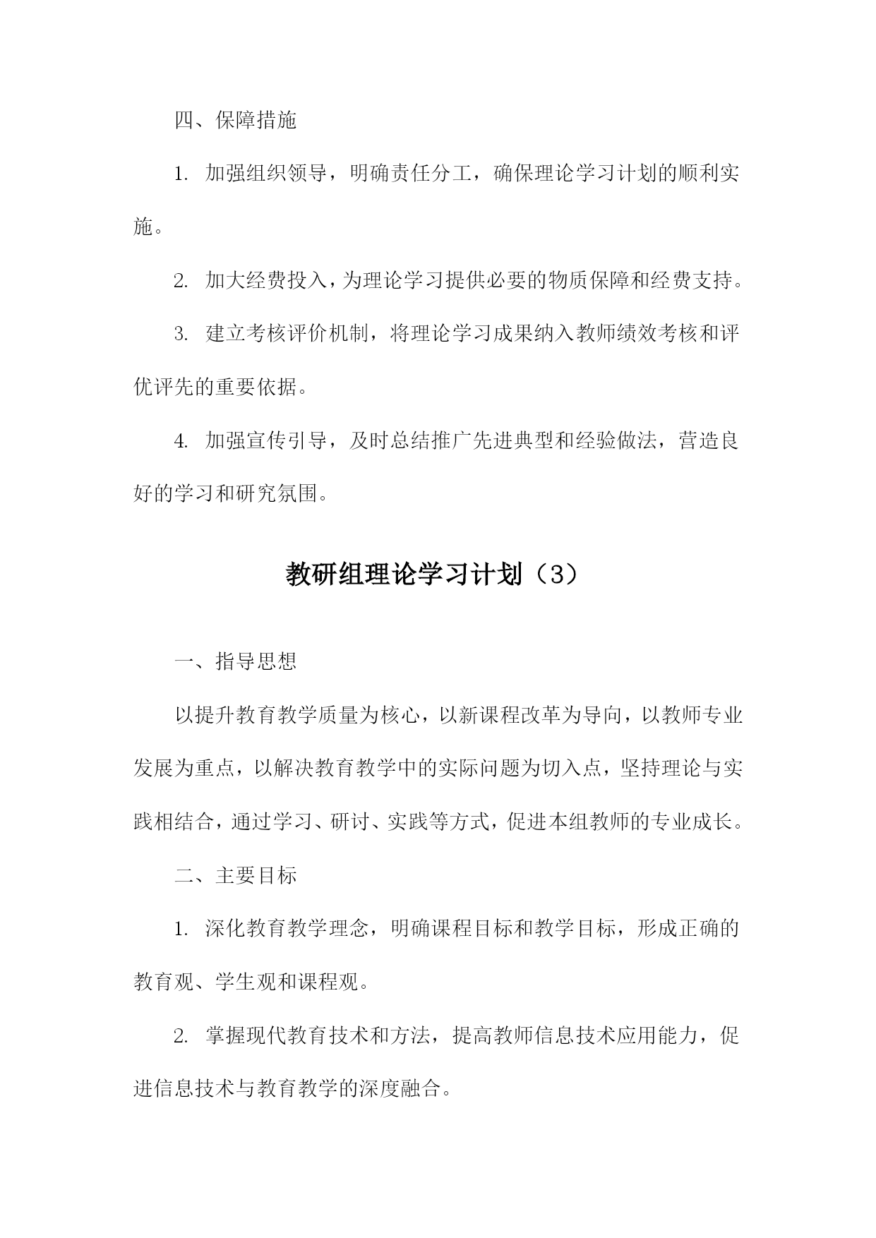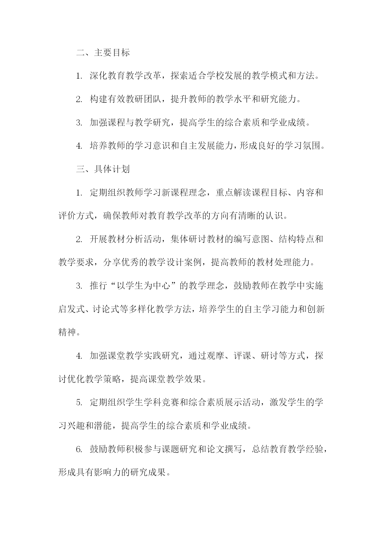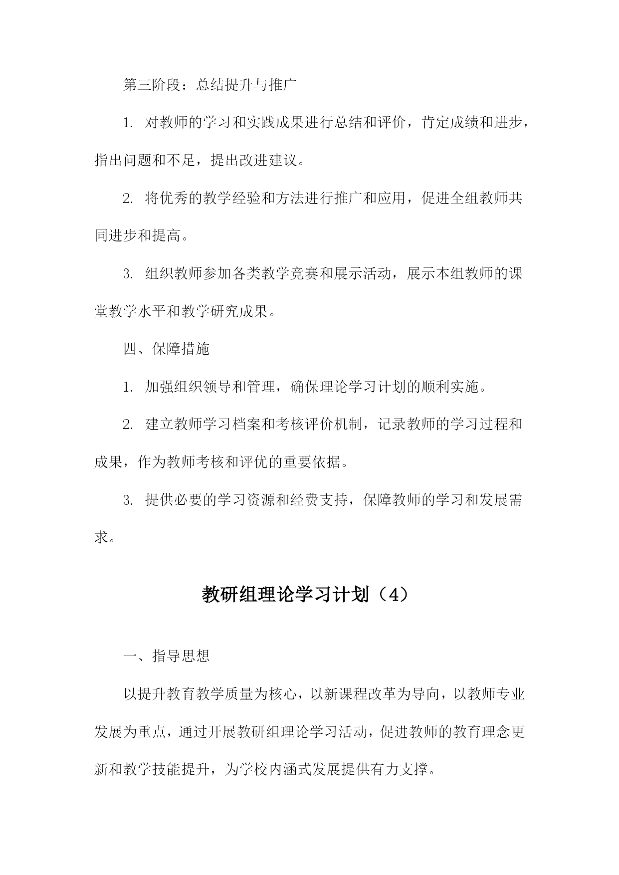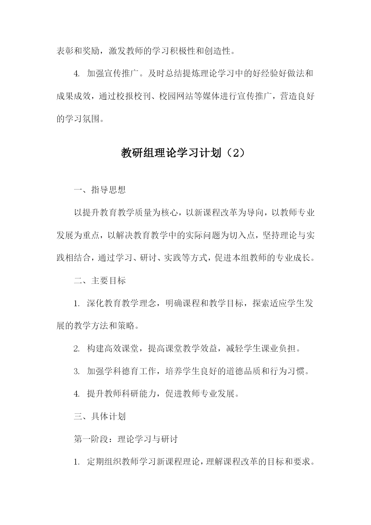 教研组理论学习计划一、指导思想以提升教育教学质量为核心,以新课程改革为导向,以教师专业发展为重点,以解决教育教学中的实际问题为切入点,坚持理论与实践相结合,通过学习、研讨、实践、反思等途径,促进教师的专业成长,推动教研组的整体进步。二、主要目标1.促进教师队伍建设,提高教师的教育教学能力和专业素养;2.推动新课程改革,探索适合学生发展的教育教学模式;3.解决教育教学中的实际问题,提高教育教学的针对性和实效性;4.提升教研组的整体实力,推动学校教育教学工作的持续发展。三、具体计划1.定期组织教师学习新课程理论,理解新课程理念,掌握新课程标准,明确新课程改革的方向。2.开展课堂教学观摩和研讨活动,通过案例分析、教学反思等方式,提高教师的课堂教学水平和能力。3.组织教师开展课题研究,围绕教育教学中的实际问题进行深入探讨,寻求解决问题的方法和策略。4.加强教师之间的交流与合作,通过集体备课、教学研讨、资源共享等方式,实现优势互补,共同提高。5.建立教师专业发展档案,记录教师的学习历程、教学成果、专业成长等情况,为教师的专业发展提供支持。6.定期对教研组的工作进行总结和反思,找出存在的问题和不足,制定改进措施,推动教研组的持续发展。四、保障措施1.加强组织领导,明确工作职责,确保教研组理论学习计划的顺利实施。2.加大经费投入,为教研组理论学习提供必要的经费保障和支持。3.建立激励机制,对在教研组理论学习中表现突出的教师给予表彰和奖励。4.加强督导检查,定期对教研组理论学习的情况进行检查和评估,确保计划的有效落实。五、总结与展望本教研组理论学习计划旨在通过一系列的学习、研讨、实践、反思等活动,促进教师的专业成长和教研组的整体进步。通过计划的实施,我们相信能够进一步提升教师的教育教学能力和专业素养,推动新课程改革的深入实施,解决教育教学中的实际问题,提升教育教学的质变,为学校教育教学工作的持续发展做出更大的贡献。教研组理论学习计划(1)一、指导思想以提升教育教学质量为核心,以新课程改革为导向,以教师专业发展为重点,坚持理论联系实际,开展有针对性的理论学习,为教师的专业成长和学校的发展提供有力保障。二、主要目标1.深化教育教学理念,明确课程改革方向。2.构建高效课堂,提高教学质量和效益。3.推动教师队伍建设,提升教师专业素养。4.加强学生综合素质培养,促进学生全面发展。三、具体计划1.定期组织学习教育理论书籍和文章,学习新课程理念,明确课程目标和要求。每次学习后进行交流讨论,分享学习心得和体会。2.开展课堂教学观摩和研讨活动,通过观摩优秀教师的课堂教学,学习他们的教学方法和技巧,提高自己的教学水平。同时组织教师进行研讨,共同探讨教学中存在的问题和困惑,寻求解决方案。3.组织教师参加各类培训和学术交流活动,拓宽教师视野,学习先进的教育教学理念和方法。每学期至少安排一名教师参加国家级或省级的培训活动。4.鼓励教师开展课题研究,探索教育教学中的问题和困惑。每个教研组至少确定一个课题进行研究,定期组织课题组成员进行研讨和交流。5.加强学生综合素质培养,积极开展各种课外活动和竞赛。如组织学生参加各类学科竞赛、文艺比赛等,提高学生的综合素质和竞争力。6.建立教师理论学习考核机制,将理论学习情况纳入教师考核评价体系。定期对教师的学习情况进行检查评估,确保理论学习取得实效。四、保障措施1.加强组织领导,明确责任分工。成立教研组理论学习领导小组,负责制定计划、组织活动、监督考核等工作。2.提供必要的学习资源和经费支持。学校为教研组提供必要的学习资料和经费保障,确保理论学习活动的顺利进行。3.建立健全激励机制。对于在学习活动中表现突出的教师给予表彰和奖励,激发教师的学习积极性和创造性。4.加强宣传推广。及时总结提炼理论学习中的好经验好做法和成果成效,通过校报校刊、校园网站等媒体进行宣传推广,营造良好的学习氛围。教研组理论学习计划(2)一、指导思想以提升教育教学质量为核心,以新课程改革为导向,以教师专业发展为重点,以解决教育教学中的实际问题为切入点,坚持理论与实践相结合,通过学习、研讨、实践等方式,促进本组教师的专业成长。二、主要目标1.深化教育教学理念,明确课程和教学目标,探索适应学生发展的教学方法和策略。2.构建高效课堂,提高课堂教学效益,减轻学生课业负担。3.加强学科德育工作,培养学生良好的道德品质和行为习惯。4.提升教师科研能力,促进教师专业发展。三、具体计划第一阶段:理论学习与研讨1.定期组织教师学习新课程理论,理解课程改革的目标和要求。2.开展“案例分析”活动通过典型案例,引导教师分析教学问题,提出解决方案。3.组织教师进行听课、评课活动,交流教