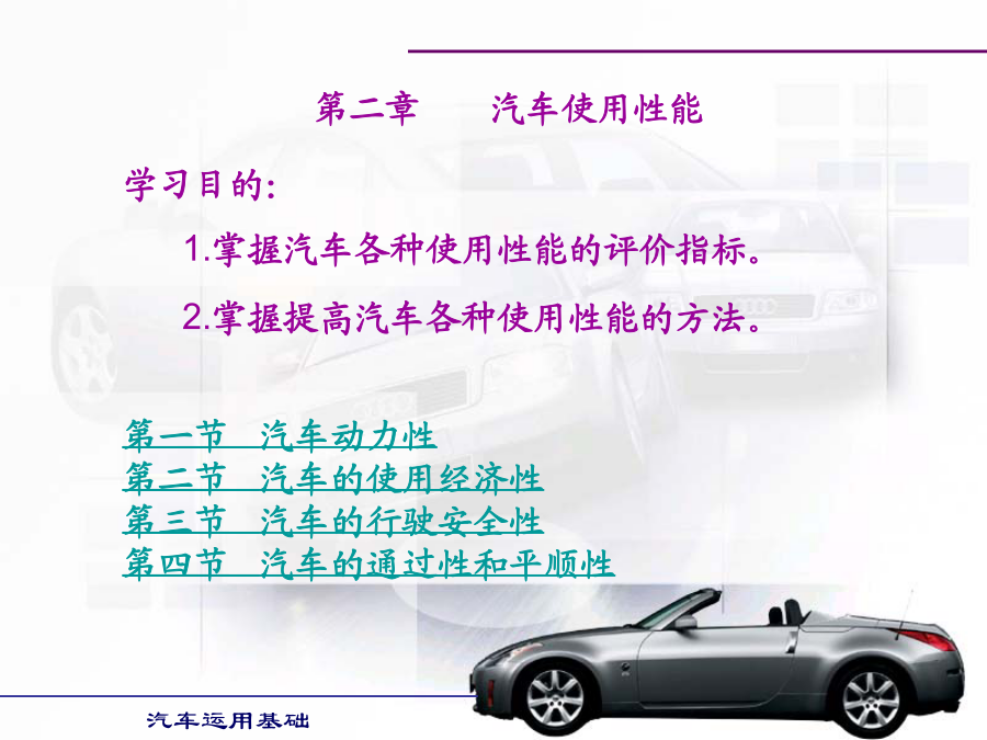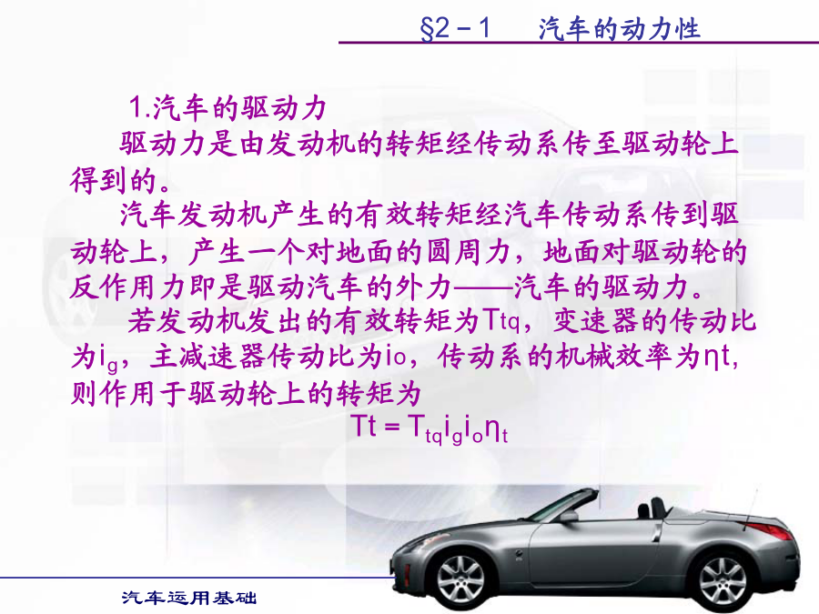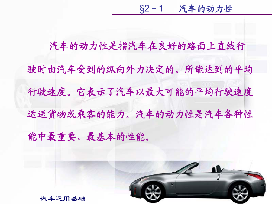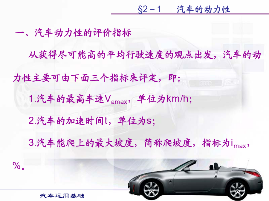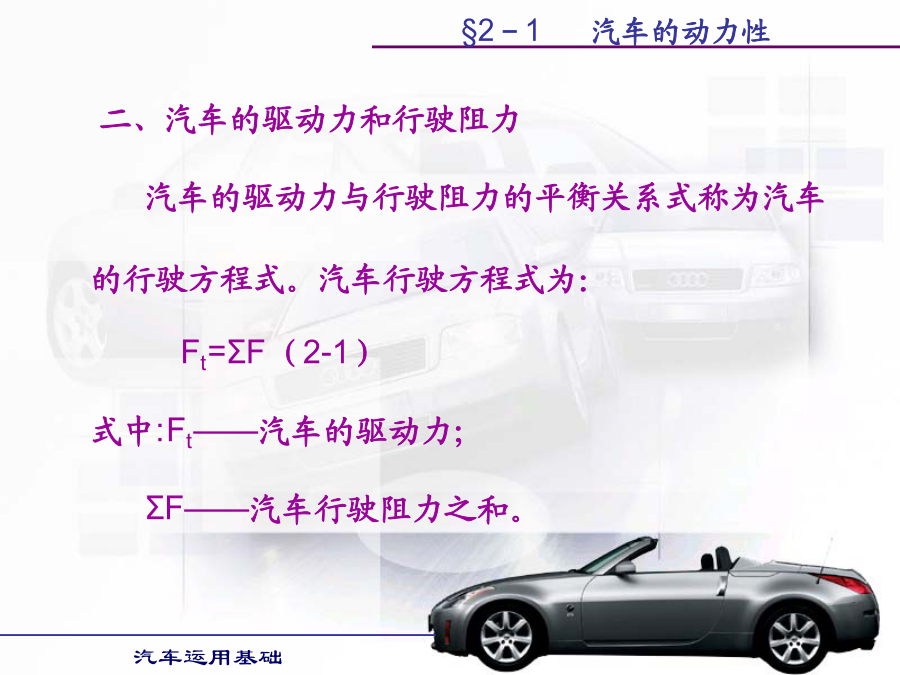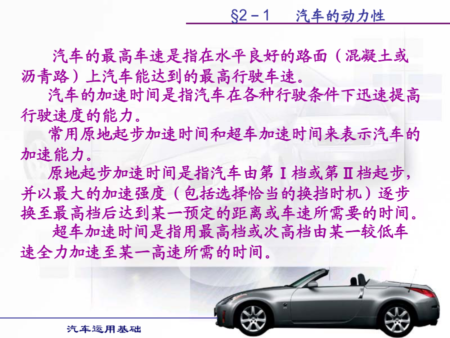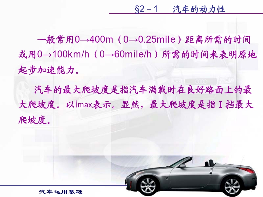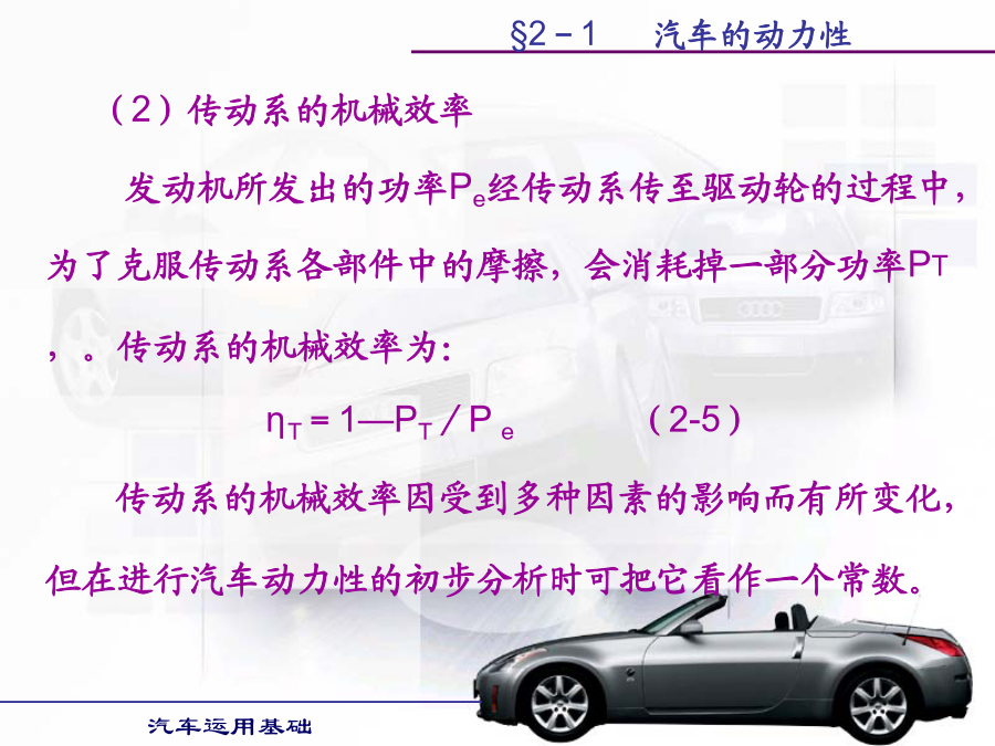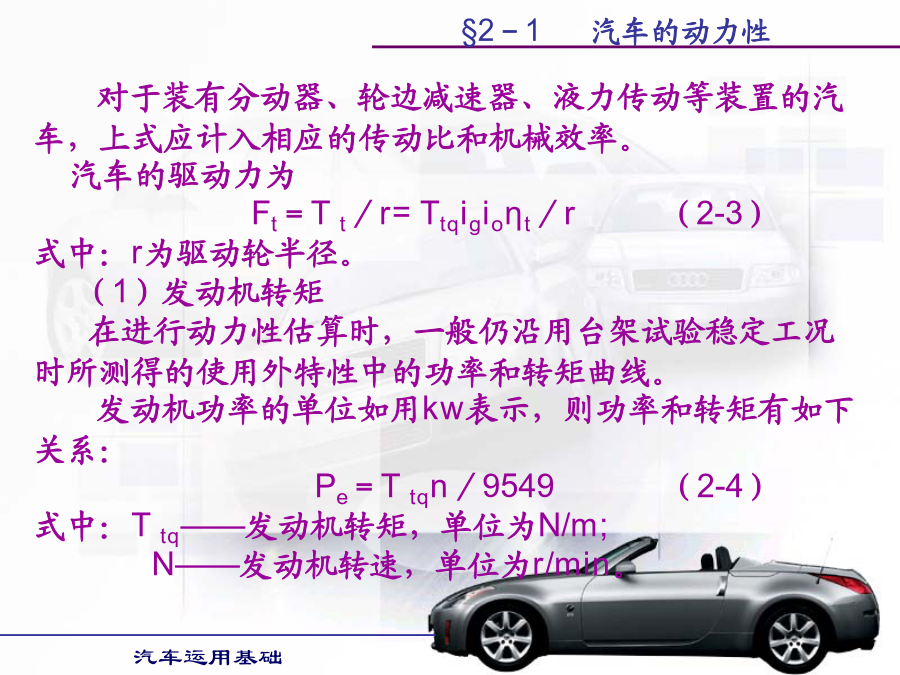 汽车运用基础学习目的:1.掌握汽车各种使用性能的评价指标。2.掌握提高汽车各种使用性能的方法。第一节汽车动力性第二节汽车的使用经济性第三节汽车的行驶安全性第四节汽车的通过性和平顺性§2-1汽车的动力性§2-1汽车的动力性§2-1汽车的动力性§2-1汽车的动力性二、汽车的驱动力和行驶阻力汽车的驱动力与行驶阻力的平衡关系式称为汽车的行驶方程式。汽车行驶方程式为:Ft=ΣF(2-1)式中:Ft——汽车的驱动力;ΣF——汽车行驶阻力之和。§2-1汽车的动力性§2-1汽车的动力性§2-1汽车的动力性§2-1汽车的动力性§2-1汽车的动力性§2-1汽车的动力性§2-1汽车的动力性§2-1汽车的动力性§2-1汽车的动力性§2-1汽车的动力性行驶车速对滚动阻力系数有很大影响。货车及轿车轮胎在车速低于100km/h时,滚动阻力系数随车速增加而逐渐增大但变化不大。轿车轮胎在140km/h以上时增长较快,车速达到某一临界车速例如200km/h时,滚动阻力系数迅速增大,此时轮胎发生驻波现象,轮胎周缘不再是圆形而呈明显的波浪状,轮胎温度也很快增加到100℃以上,胎面与轮胎帘布层脱落,几分种内就会出现爆破现象,这对高速行车是一件很危险的事情。轮胎的结构、帘线和橡胶的品种对滚动阻力都有影响。子午线轮胎的滚动阻力系数较低。轮胎充气压力对f值有很大影响,气压降低时f值迅速增加,这是因为气压降低时,滚动的轮胎变形大,迟滞损失增加的缘故。§2-1汽车的动力性汽车空气阻力的数值通常表示为:(2-12)式中:Cd—空气阻力系数,由试验测得;ρ—空气密度;A—迎风面积,即汽车行驶方向的投影面积,单位m2;Vr—相对速度,在无风即汽车的行驶速度,单位m/s。如相对速度Vr以km/h计,则空气阻力Fw(单位为N)为:Fw=CdAVr2/21.15(2-13)§2-1汽车的动力性§2-1汽车的动力性§2-1汽车的动力性§2-1汽车的动力性(2)传动系参数对汽车动力性的影响。1)传动效率传动系机械效率越高,传动损失功率越小,发动机有效功率更多地转变为驱动力,汽车动力性好。可在润滑油中加入减磨添加剂和选用粘度适当且受温度影响小的润滑油,对提高传动效率有明显效果。2)主减速器传动比变速器处于直接挡时,主减速器传动比将直接影响汽车的动力性。若主减速器传动比设置不当,在其它条件不变的情况下,会使汽车的最高车速降低,汽车的最高车速小于发动机最大功率相对应车速,将使汽车发动机最大功率不能利用,同时汽车后备功率也明显降低,汽车动力性全面变坏。3)变速器传动比及档数对汽车动力性的影响汽车以最低档(Ⅰ挡)行驶时,必须保证汽车具有足够的驱动力,以使汽车具有克服最大行驶阻力的能力。如其它条件相同,I挡的传动比直接影响汽车起步加速性能和最大爬坡能力。现代汽车大多仍保持变速器的最小传动比为1,即最高挡为直接档;少数汽车变速器最小传动比小于1,即最高挡为超速档。利用超速挡的目的主要是提高汽车在良好道路上行驶的最高车速和高速时的燃油经济性。变速器档位多,增加了发动机发挥最大功率附近高功率的机会,提高了汽车的加速能力和爬坡能力。(3)空气阻力系数Cd对汽车动力性的影响若两汽车总重和驱动力相同,则空气阻力Fw越小,克服道路阻力和加速阻力的能力越强,最高车速也提高,汽车的动力性越好。空气阻力系数Cd、迎风面积以及车速决定了汽车空气阻力的大小。空气阻力在汽车低速行驶时,对汽车动力性影响较小;而在汽车高速行驶时,空气阻力在汽车行驶阻力中占很大比重,对汽车动力性影响较大。所以改善汽车流线型,减少空气阻力,对高速行驶汽车是非常必要的。(4)汽车总重对动力性的影响汽车总重对汽车动力性影响很大。除空气阻力外,其它行驶阻力都与汽车的总重成正比。动力因素与汽车总重成反比。因此,随着汽车总重的增加,其动力性变差,汽车行驶的平均速度下降。如果能减轻汽车的自重,则可减小汽车行驶的滚动阻力、上坡阻力和加速阻力,使汽车动力性得到改善,而且燃油经济性也变好。(5)轮胎尺寸与型式对汽车动力性的影响汽车的驱动力Ft与轮胎半径r成反比,而车速Va与轮胎半径r成正比,因此,轮胎半径对与动力性有关的驱动力和车速是矛盾的。现在,在良好路面上行驶的汽车,轮胎半径有减小的趋势。首先,汽车在良好路面上行驶时,附着力较大,用小直径的轮胎,可得到较大的驱动力。车速的提高可以用减小主减速器传动比来解决。轮胎尺寸和主减速器传动比减小,使汽车质心高度降低,提高了汽车的行驶稳定性,有利于汽车的高速行驶。软路面上行驶的汽车,车速不高,要求轮胎半径大些,主要是为了增加轮胎与路面间的附着系数。五、汽车的动力性试验1.试验的主要条件道路试验通常在水泥或沥青路面的干燥、清洁和平直路段上进行,要求路