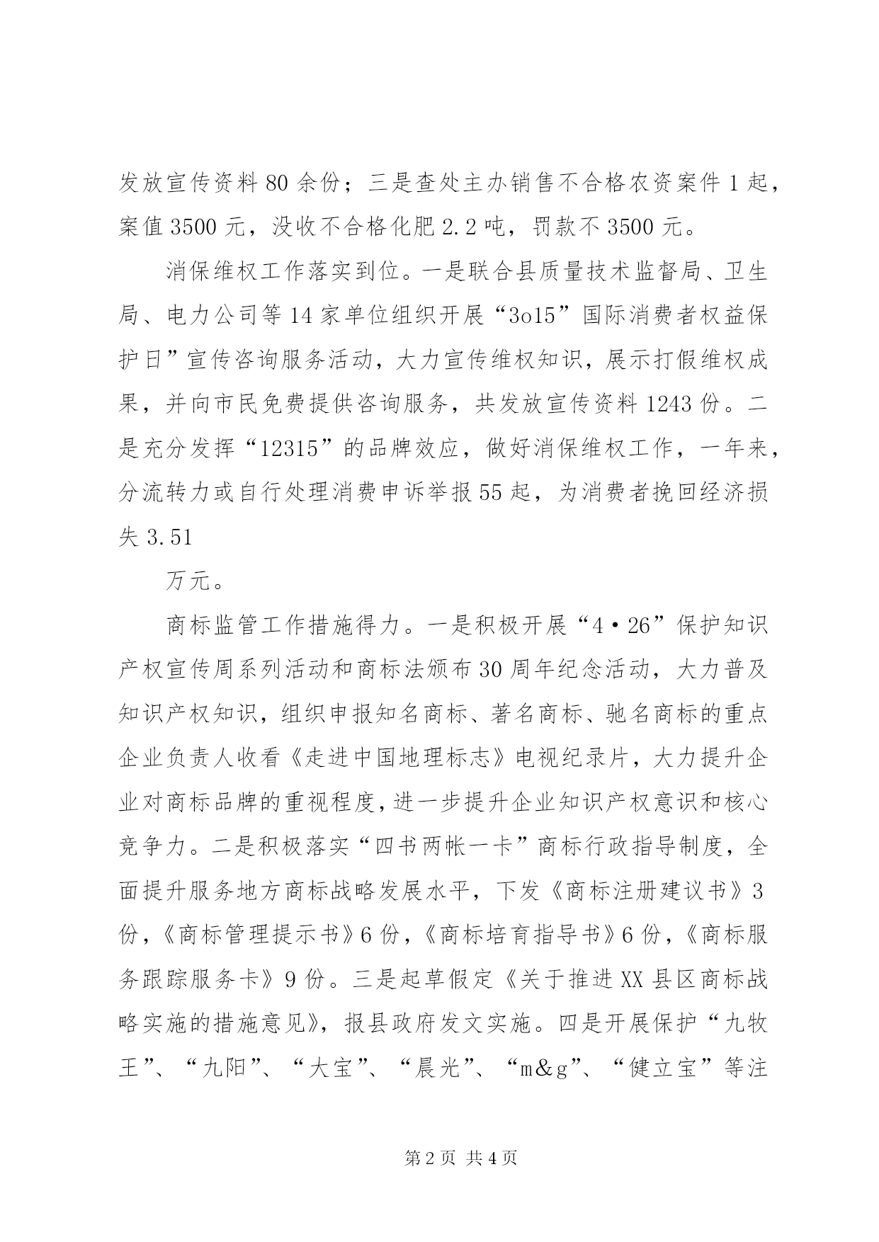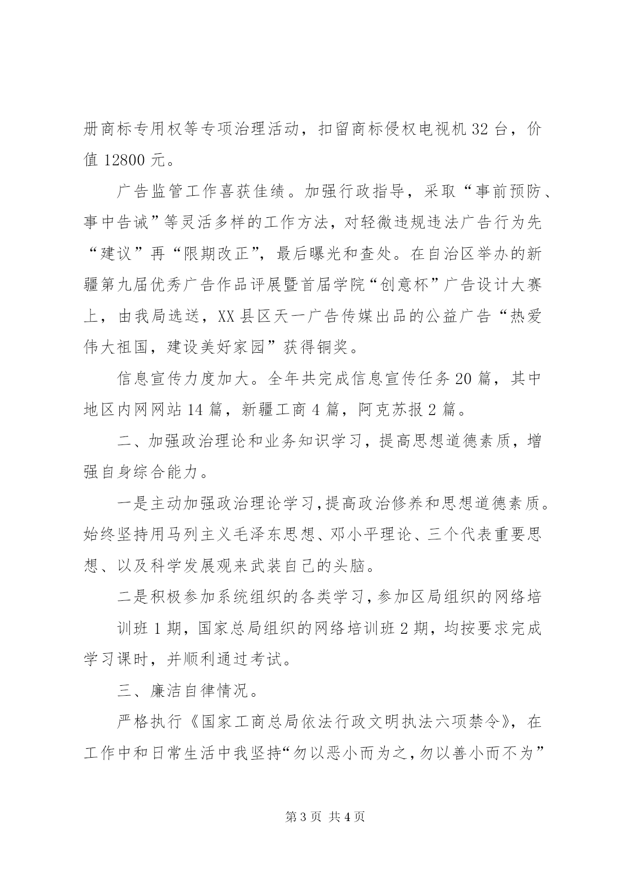 第PAGE\*Arabic\*MERGEFORMAT4页共NUMPAGES\*MERGEFORMAT4页工商干部个人工作总结2012年度个人工作总结2012年,根据县局的安排我在食品消保科工作,在领导的关心和同事们的帮助支持下,我努力做好本职工作,严格自律,时时做到端正态度、吃苦在先、加强学习、不断提高自己的政治修养和业务能力,认真完成了上级交办的各项任务。现将一年来的工作、学习等情况总结如下:一、认真履行职能,完成上级交办的各项工作。食品安全监管工作成效明显。一是加大对食品经营户履行法定义务的培训力度,大力宣传《食品安全法》等法律法规;二是大力推广“一单通”和食品终端机。截止2012年底我局共开通一单通7户,对食品批发户实行全覆盖,开通食品终端机237户,实现城镇全部和乡镇车站、校园周边等重点场所全覆盖;三是加大查处违法行为,促进食品安全工作不断提升,开展了“五一”、“十一”等节日市场、食用油市场、亚欧博览会期间市场专项检查,检查食品经营户273户次,下令责令整改通知书9份,当场规范经营行为33户次,下架各类过期或临近过期食品205袋(包)。农资市场监管工作扎实有力。一是扎实开展了“红盾护农保春耕”专项执法行动,加强农资市场抽检力度,共抽取关检样品300余份;二是大力宣传《农业生产资料监督管理办法》,先后发放宣传资料80余份;三是查处主办销售不合格农资案件1起,案值3500元,没收不合格化肥2.2吨,罚款不3500元。消保维权工作落实到位。一是联合县质量技术监督局、卫生局、电力公司等14家单位组织开展“3o15”国际消费者权益保护日”宣传咨询服务活动,大力宣传维权知识,展示打假维权成果,并向市民免费提供咨询服务,共发放宣传资料1243份。二是充分发挥“12315”的品牌效应,做好消保维权工作,一年来,分流转力或自行处理消费申诉举报55起,为消费者挽回经济损失3.51万元。商标监管工作措施得力。一是积极开展“4·26”保护知识产权宣传周系列活动和商标法颁布30周年纪念活动,大力普及知识产权知识,组织申报知名商标、著名商标、驰名商标的重点企业负责人收看《走进中国地理标志》电视纪录片,大力提升企业对商标品牌的重视程度,进一步提升企业知识产权意识和核心竞争力。二是积极落实“四书两帐一卡”商标行政指导制度,全面提升服务地方商标战略发展水平,下发《商标注册建议书》3份,《商标管理提示书》6份,《商标培育指导书》6份,《商标服务跟踪服务卡》9份。三是起草假定《关于推进XX县区商标战略实施的措施意见》,报县政府发文实施。四是开展保护“九牧王”、“九阳”、“大宝”、“晨光”、“m&g”、“健立宝”等注册商标专用权等专项治理活动,扣留商标侵权电视机32台,价值12800元。广告监管工作喜获佳绩。加强行政指导,采取“事前预防、事中告诫”等灵活多样的工作方法,对轻微违规违法广告行为先“建议”再“限期改正”,最后曝光和查处。在自治区举办的新疆第九届优秀广告作品评展暨首届学院“创意杯”广告设计大赛上,由我局选送,XX县区天一广告传媒出品的公益广告“热爱伟大祖国,建设美好家园”获得铜奖。信息宣传力度加大。全年共完成信息宣传任务20篇,其中地区内网网站14篇,新疆工商4篇,阿克苏报2篇。二、加强政治理论和业务知识学习,提高思想道德素质,增强自身综合能力。一是主动加强政治理论学习,提高政治修养和思想道德素质。始终坚持用马列主义毛泽东思想、邓小平理论、三个代表重要思想、以及科学发展观来武装自己的头脑。二是积极参加系统组织的各类学习,参加区局组织的网络培训班1期,国家总局组织的网络培训班2期,均按要求完成学习课时,并顺利通过考试。三、廉洁自律情况。严格执行《国家工商总局依法行政文明执法六项禁令》,在工作中和日常生活中我坚持“勿以恶小而为之,勿以善小而不为”的做事风格,在日常监管中我不贪经营户的小便宜,坚守自律,自爱,自尊,自强的做人本色。我坚信失之小节,也许是酿成大错的开始,一个人良好的素养往往体现在小节上。四、执行单位考勤制度情况。一年来,始终能够严格要求自己,认真执行单位考勤制度,无迟到、早退、旷工现象发生,未请过病、事假,同时考虑科室人员紧张,日常工作量大,单位安保值班重,未向组织提出探亲和休假申请。回顾一年来的工作,取得的成绩与我的努力有关,但更多地是领导和同事们关心支持的结果,我深知自己还有很多不足之处,特别是在理论学习上还不够深入。在今后的工作中,我会继续积极进取,克服自己的不足,在各方面完善自己,坚持在实践中历练,取人之长、补己之短,为工商事业的发展做出自己应有的贡奉献。