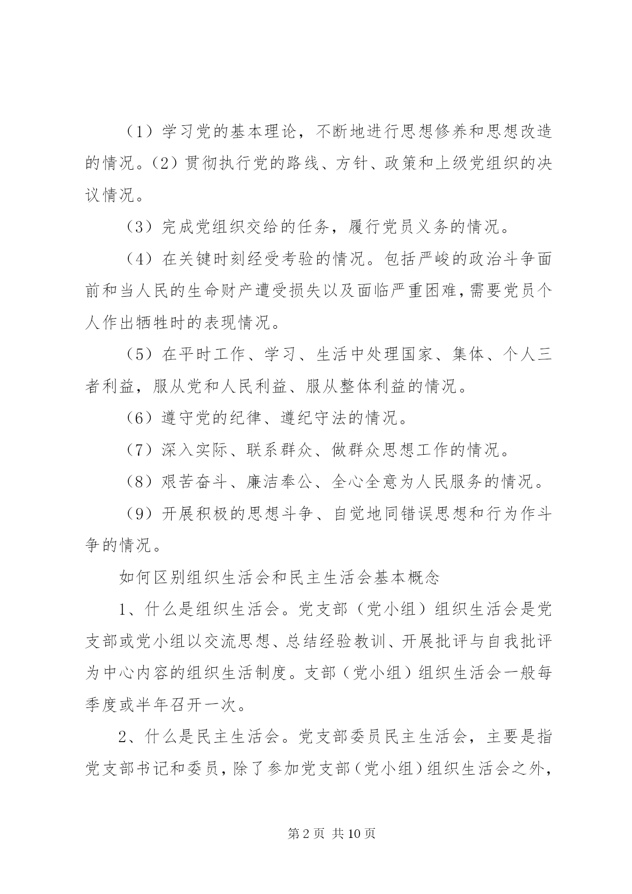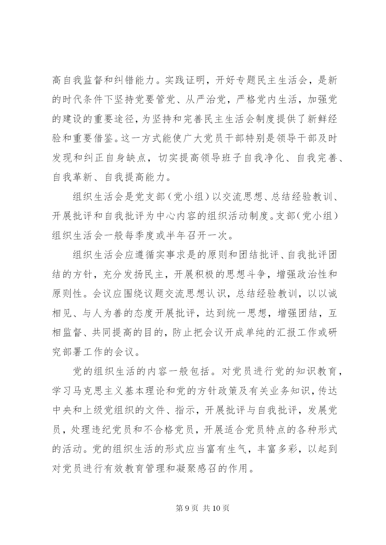第PAGE\*Arabic\*MERGEFORMAT10页共NUMPAGES\*MERGEFORMAT10页民主生活会和组织生活会有何区别民主生活会和组织生活会有何区别民主生活会,是指党员领导干部召开的旨在开展批评与自我批评的组织活动制度。民主生活会制度是我们党在长期的革命和建设实践中形成的优良作风,是增强党的生机与活力的一大法宝。民主生活会,主要指党员在支部、党小组以交流思想,开展批评与自我批评为主要形式的组织活动制度。现在民主生活会执行情况:总体是好的,但也有一些民主生活会质量不高,收效不大,少数单位民主生活会制度坚持得不好。具体现象:一是形式搜索化。当作一般任务来完成,议题不明确,走过场。二是庸俗化。成了聊天会。三是溢美化。表扬与自我表扬相结合。四是简单化,就具体工作、取得成绩、存在不足等内容谈,谈完结束。如果说此项制度有问题,那是执行的问题,其制度本身很好。历史地看,我们党运用民主生活会方法有效解决了自身的问题,所以党始终坚持这种制度。民主生活会目标定位:健全并严格hellip;hellip;都是非常重要的,依靠自身力量解决矛盾。组织生活会是指党支部(党小组)组织生活会是党支部或党小组以交流思想、总结经验教训、开展批评与自我批评为中心内容的组织生活制度。党支部(党小组)组织生活会一般每季度或半年召开一次。(1)学习党的基本理论,不断地进行思想修养和思想改造的情况。(2)贯彻执行党的路线、方针、政策和上级党组织的决议情况。(3)完成党组织交给的任务,履行党员义务的情况。(4)在关键时刻经受考验的情况。包括严峻的政治斗争面前和当人民的生命财产遭受损失以及面临严重困难,需要党员个人作出牺牲时的表现情况。(5)在平时工作、学习、生活中处理国家、集体、个人三者利益,服从党和人民利益、服从整体利益的情况。(6)遵守党的纪律、遵纪守法的情况。(7)深入实际、联系群众、做群众思想工作的情况。(8)艰苦奋斗、廉洁奉公、全心全意为人民服务的情况。(9)开展积极的思想斗争、自觉地同错误思想和行为作斗争的情况。如何区别组织生活会和民主生活会基本概念1、什么是组织生活会。党支部(党小组)组织生活会是党支部或党小组以交流思想、总结经验教训、开展批评与自我批评为中心内容的组织生活制度。支部(党小组)组织生活会一般每季度或半年召开一次。2、什么是民主生活会。党支部委员民主生活会,主要是指党支部书记和委员,除了参加党支部(党小组)组织生活会之外,还必须参加以检查贯彻执行党的路线、方针、政策、决议和《关于党内政治生活的若干准则》情况为主要内容的会议。这是因为,支委会一班人在工作中接触比较多,互相比较了解,而且他们在思想上、工作上有些不同意见,又不便在党支部(党小组)组织生活会上说,因此,需要支部委员单独召开党的民主生活会,就执行党的方针、政策、决议情况和党支部内的一些重要问题,以及相互间在思想、作风和工作上的问题,交换意见,沟通思想,谈心通气,开展批评与自我批评,互相帮助,互相监督,总结经验,统一思想认识。这样做,有利于端正党风,增强团结,密切党群关系。党支部委员民主生活会,一般每个季度或半年召开一次。基本内容1、组织生活会的基本内容(1)学习党的基本理论,不断地进行思想修养和思想改造的情况。(2)贯彻执行党的路线、方针、政策和上级党组织的决议情况。(3)完成党组织交给的任务,履行党员义务的情况。(4)在关键时刻经受考验的情况。包括严峻的政治斗争面前和当人民的生命财产遭受损失以及面临严重困难,需要党员个人作出牺牲时的表现情况。(5)在平时工作、学习、生活中处理国家、集体、个人三者利益,服从党和人民利益、服从整体利益的情况。(6)遵守党的纪律、遵纪守法的情况。(7)深入实际、联系群众、做群众思想工作的情况。(8)艰苦奋斗、廉洁奉公、全心全意为人民服务的情况。(9)开展积极的思想斗争、自觉地同错误思想和行为作斗争的情况。2、党支部委员民主生活会的主要内容(1)紧紧围绕党的路线、方针、政策,密切结合本单位本部门完成生产和工作任务情况,党支部自身建设情况以及党员的思想实际,认真开展批评与自我批评。着重检查、解决贯彻党的路线、方针、政策,坚持四项基本原则,贯彻民主集中制原则,增强团结,加强集体领导,端正党风,严格党纪,为政清廉,克服官僚主义,转变工作作风,以及关心群众等方面存在的重大问题。(2)检查领导班子和个人在重大决策中和执行政策、决议过程中的思想认识、态度和效果,找出存在的问题,明确责任,制定整改措施。(3)检查上次民主生活会所制定的改进措施的落实情况。看哪些落实了,哪些还没有落实,没落实的原因是什么。对无故不落实的要提出严肃的批评。基本做法:1、开好组织生活会的基本做法组织生活会一般由党支部书记(党小组长)主持。主持人首先要宣布党