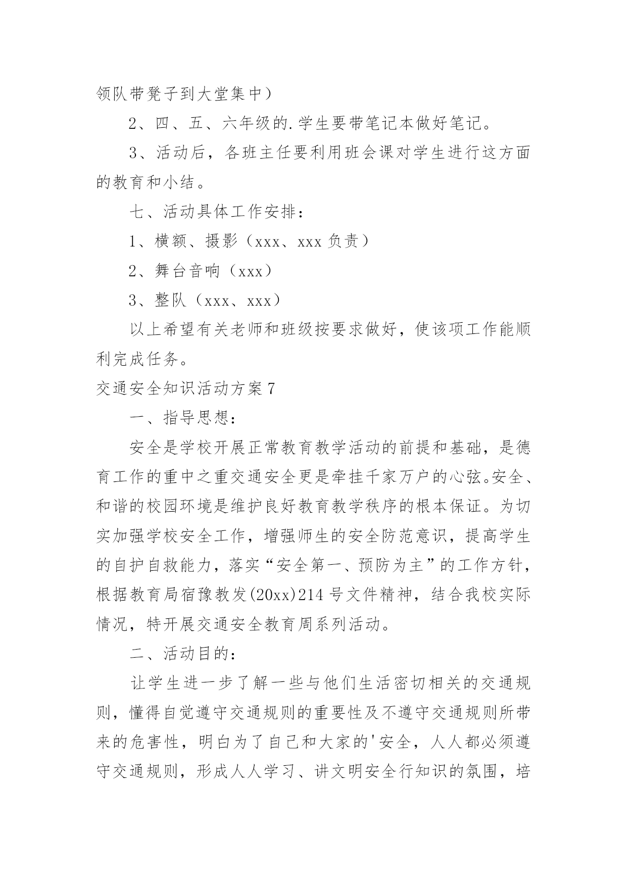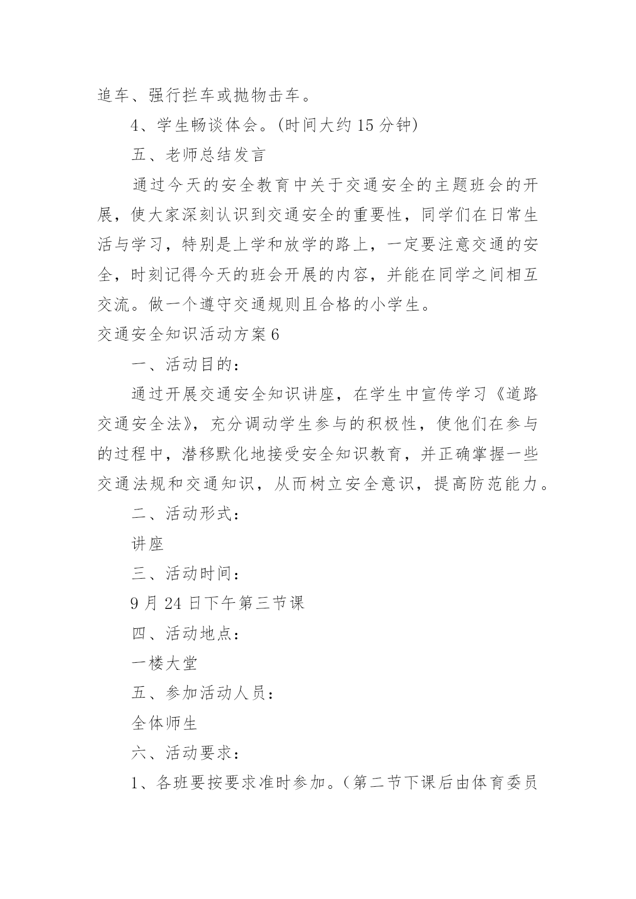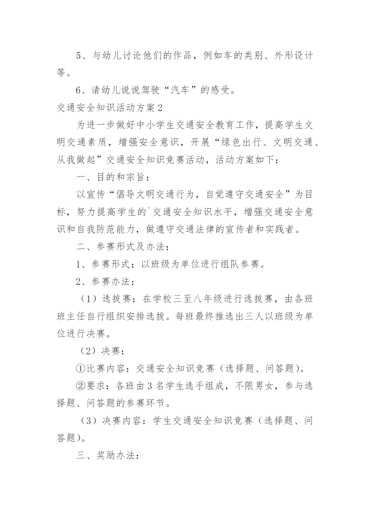交通安全知识活动方案交通安全知识活动方案为确保事情或工作高质量高水平开展,就常常需要事先准备方案,方案是有很强可操作性的书面计划。方案应该怎么制定才好呢?以下是小编为大家收集的交通安全知识活动方案,欢迎大家分享。交通安全知识活动方案1活动目标:1、认识马路上常见的车辆。2、复习统计3、享受制作汽车模型的乐趣。活动准备:1、幼儿自备自己的照片。2、大纸盒、图画纸、杂志纸、碎布、彩笔等美劳材料。活动过程:1、带幼儿到马路边,观察马路上的情况。2、引导幼儿谈论所见所闻,例如哪种车最大,哪种最小,哪种最有趣。3、统计幼儿最常乘坐哪种车,请幼儿把他最常做的'车画下来,并把自己的照片贴在图画上,扮成司机或乘客。4、请幼儿利用大纸盒和不同美劳材料,制作自己喜欢的小汽车,例如私家车、公共汽车、小巴等。5、与幼儿讨论他们的作品,例如车的类别、外形设计等。6、请幼儿说说驾驶“汽车”的感受。交通安全知识活动方案2为进一步做好中小学生交通安全教育工作,提高学生文明交通素质,增强安全意识,开展“绿色出行、文明交通、从我做起”交通安全知识竞赛活动,活动方案如下:一、目的和宗旨:以宣传“倡导文明交通行为,自觉遵守交通安全”为目标,努力提高学生的`交通安全知识水平,增强交通安全意识和自我防范能力,做遵守交通法律的宣传者和实践者。二、参赛形式及办法:1、参赛形式:以班级为单位进行组队参赛。2、参赛办法:(1)选拔赛:在学校三至八年级进行选拔赛,由各班班主任自行组织安排选拔。每班最终推选出三人以班级为单位进行决赛。(2)决赛:①比赛内容:交通安全知识竞赛(选择题、问答题)。②要求:各班由3名学生选手组成,不限男女,参与选择题、问答题的参赛环节。(3)决赛内容:学生交通安全知识竞赛(选择题、问答题)。三、奖励办法:凡参加决赛的各队均受到奖励,分出一等奖1名,二等奖2名,三等奖3名。四、知识竞赛的规则:1、竞赛采用现场答题的方式进行。2、竞赛试题满分为100分,各班参赛队员各自作答,比赛结束后对各班队员的成绩相加,最后依据各队总得分高低排定名次。5、在规定时间之外回答的内容无效。五、知识竞赛时间安排及地点:1、知识竞赛准备阶段的时间约1周。2、选拔赛时间、地点由各班自行安排,在xx月xx日前完成。决赛时间、地点另行通知,在xx月xx日前完成。六、本方案未尽事宜另行通知。交通安全知识活动方案3一、活动主题细节关乎生命、安全文明出行二、时间安排12月2日至12月10日为集中宣传阶段,形成宣传热点;12月11日至年底为持续推进阶段。三、工作目标以全面提升师生文明交通素养为主线,统筹传统媒体、新兴媒体宣传渠道,集中开展多方位、全覆盖、立体式宣传教育活动,大力普及交通安全法律法规、弘扬法治交通精神,着力提升师生交通安全意识、法治意识、规则意识、文明意识,为创造有序、畅通、安全、绿色、文明的道路交通环境做贡献。四、活动内容1、“指尖上的文明交通”活动。各团学组织要充分发挥微博、微信、微视和客户端等“三微一端”新媒体平台受众广、传播快的优势,开展“指尖上的文明交通”传播,宣传交通法规、交通安全知识、校园交通安全等,并保持话题热度,不断延伸宣传触角和覆盖面。(负责单位:校院两级团学组织新媒体中心)2、“文明交通,安全出行”活动。目前,我校学生使用电动车的'人数越来越多,其中有许多为超标电动车,也有学生开小车到校上课。各班举行一次以关注交通安全为主题的班会课,教育学生注意交通安全,校内尽量以步行为主,不使用不合格、超标电动车,各类车辆按指定地点有序停放。(负责单位:各班级)3、“交通违法我监督”随手拍活动。倡导文明交通,加强校内车辆通行秩序,进一步加大交通违法违规行为曝光力度,鼓励、发动学生积极参与“交通违法我监督”随手拍活动,用手机、相机记录交通违法违规行为、违反校园交通安全的行为、车辆乱停乱放行为等。(负责单位:校自律会)4、“交通安全伴我行”主题活动。各班举行主题会、主题团日活动,播放交通安全警示教育片,使“尊法守规明礼”观念深入人心。交通安全知识活动方案4为进一步加强学校道路交通安全工作,切实提高广大学生的道路交通安全意识、法治意识和交通文明意识,营造文明和谐的校园交通安全环境和浓厚的宣传氛围,根据省教育厅《学校道路交通安全宣传教育工作方案》精神,特制订本方案。一、工作目标以预防和减少涉及学生的'道路交通事故为核心,实现学生道路交通安全宣传教育工作制度化,普及道路交通安全知识,宣传道路安全法律法规,增强学生道路交通安全意识,提高学生道路安全行为能力,使在校学生接受道路交通安全宣传教育率达100%。二、工作措施(一)落实责任学校要建立学生道路安全宣传教育的工作机制,明确任务,落实责任,深入开展学校道路交通安全宣传教育。同时,要建立和健全道路交通安全宣传教育工作制度,落实交通