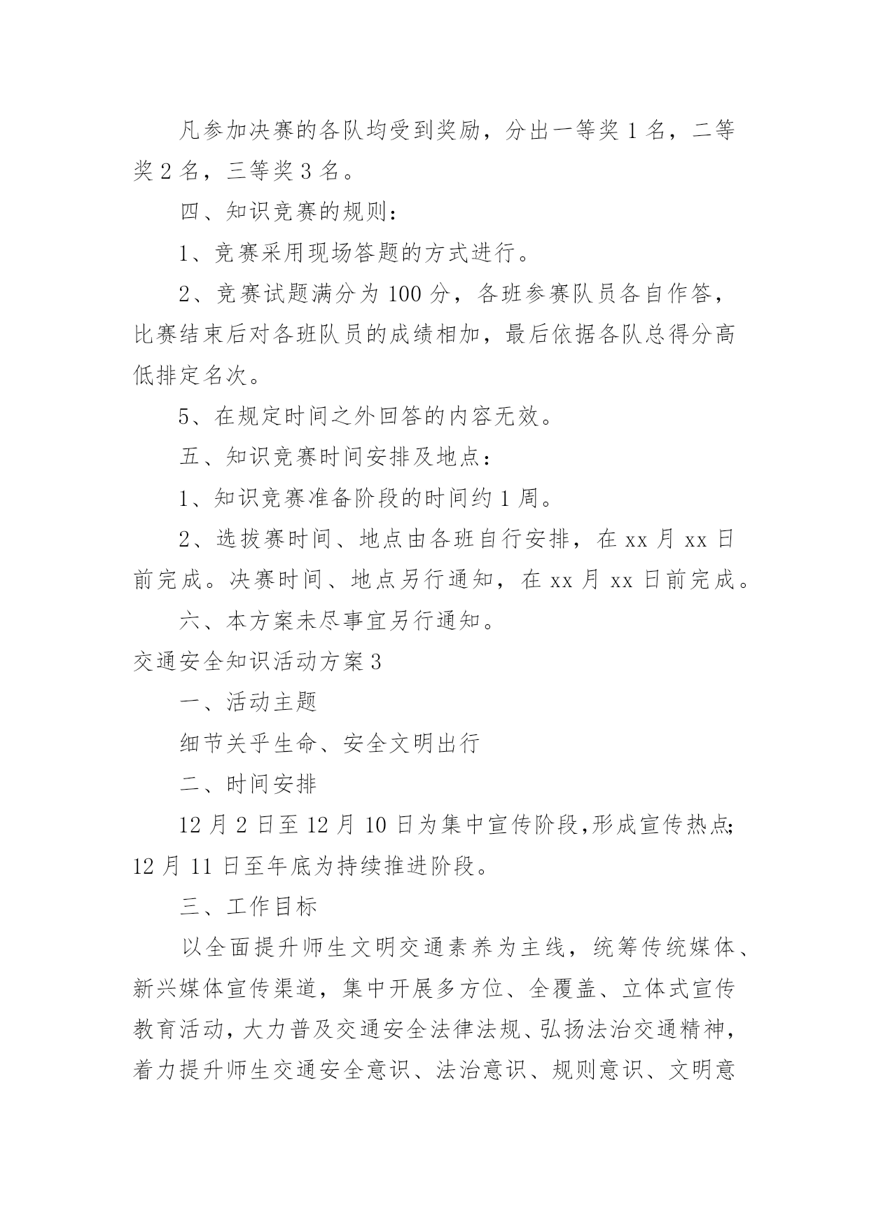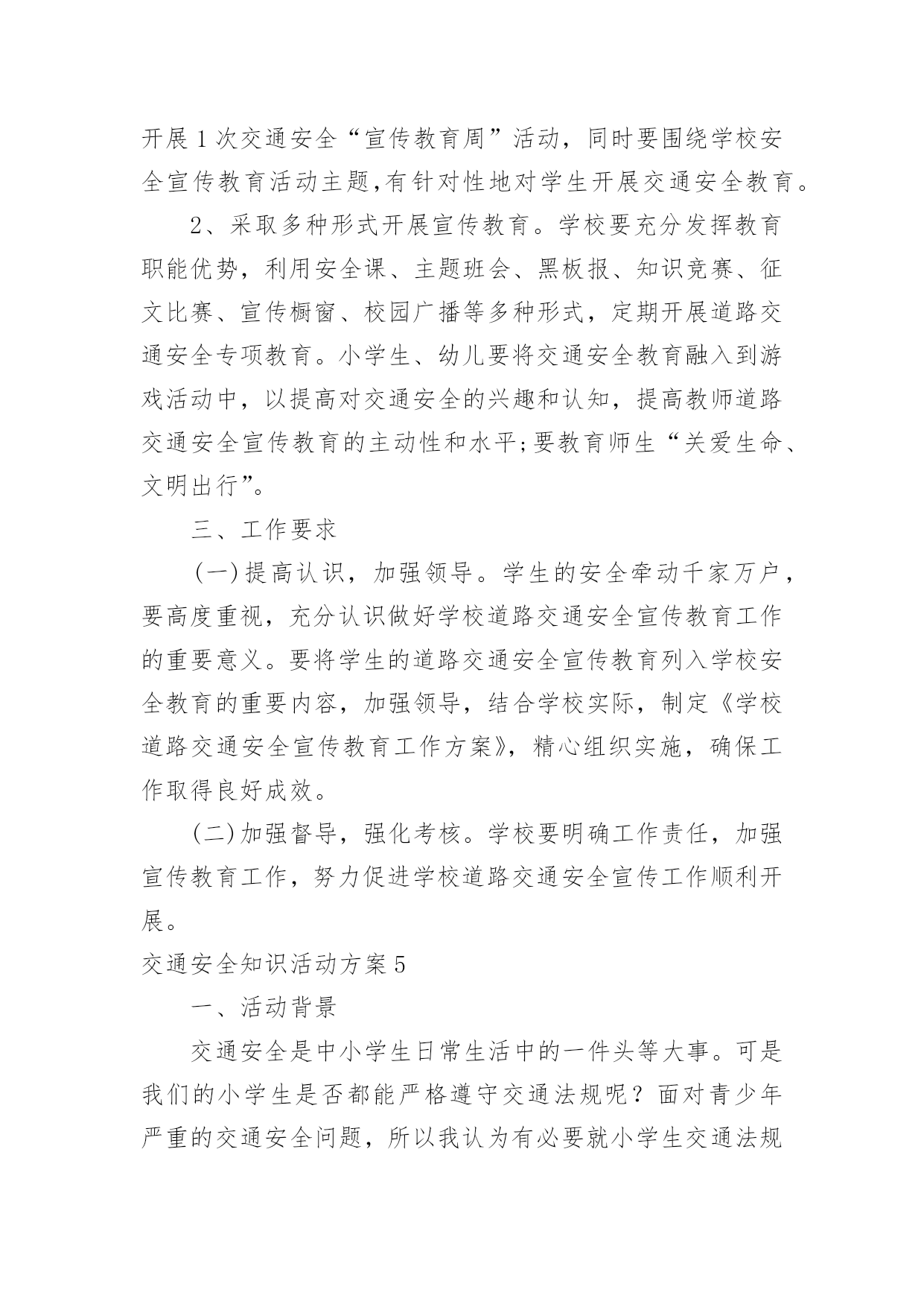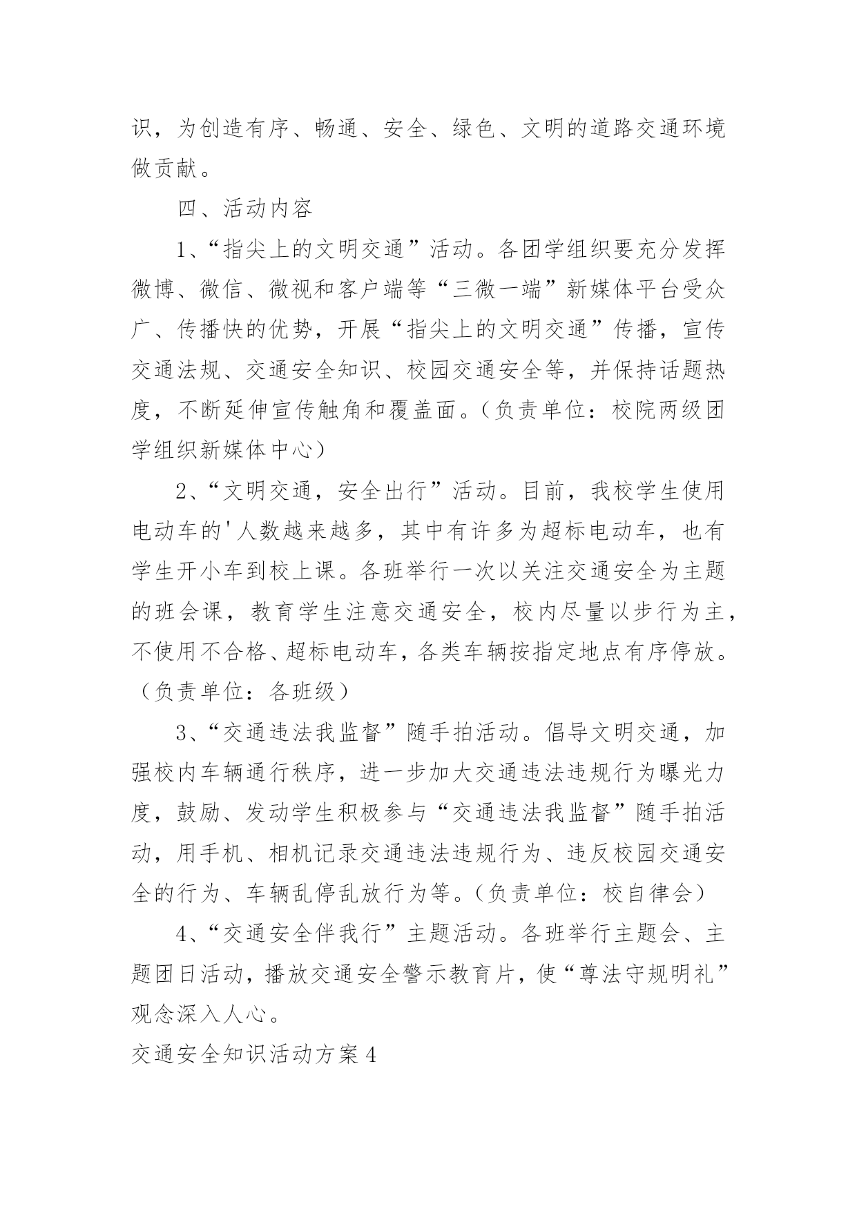 交通安全知识活动方案交通安全知识活动方案为确保事情或工作高质量高水平开展,就常常需要事先准备方案,方案是有很强可操作性的书面计划。方案应该怎么制定才好呢?以下是小编为大家收集的交通安全知识活动方案,欢迎大家分享。交通安全知识活动方案1活动目标:1、认识马路上常见的车辆。2、复习统计3、享受制作汽车模型的乐趣。活动准备:1、幼儿自备自己的照片。2、大纸盒、图画纸、杂志纸、碎布、彩笔等美劳材料。活动过程:1、带幼儿到马路边,观察马路上的情况。2、引导幼儿谈论所见所闻,例如哪种车最大,哪种最小,哪种最有趣。3、统计幼儿最常乘坐哪种车,请幼儿把他最常做的'车画下来,并把自己的照片贴在图画上,扮成司机或乘客。4、请幼儿利用大纸盒和不同美劳材料,制作自己喜欢的小汽车,例如私家车、公共汽车、小巴等。5、与幼儿讨论他们的作品,例如车的类别、外形设计等。6、请幼儿说说驾驶“汽车”的感受。交通安全知识活动方案2为进一步做好中小学生交通安全教育工作,提高学生文明交通素质,增强安全意识,开展“绿色出行、文明交通、从我做起”交通安全知识竞赛活动,活动方案如下:一、目的和宗旨:以宣传“倡导文明交通行为,自觉遵守交通安全”为目标,努力提高学生的`交通安全知识水平,增强交通安全意识和自我防范能力,做遵守交通法律的宣传者和实践者。二、参赛形式及办法:1、参赛形式:以班级为单位进行组队参赛。2、参赛办法:(1)选拔赛:在学校三至八年级进行选拔赛,由各班班主任自行组织安排选拔。每班最终推选出三人以班级为单位进行决赛。(2)决赛:①比赛内容:交通安全知识竞赛(选择题、问答题)。②要求:各班由3名学生选手组成,不限男女,参与选择题、问答题的参赛环节。(3)决赛内容:学生交通安全知识竞赛(选择题、问答题)。三、奖励办法:凡参加决赛的各队均受到奖励,分出一等奖1名,二等奖2名,三等奖3名。四、知识竞赛的规则:1、竞赛采用现场答题的方式进行。2、竞赛试题满分为100分,各班参赛队员各自作答,比赛结束后对各班队员的成绩相加,最后依据各队总得分高低排定名次。5、在规定时间之外回答的内容无效。五、知识竞赛时间安排及地点:1、知识竞赛准备阶段的时间约1周。2、选拔赛时间、地点由各班自行安排,在xx月xx日前完成。决赛时间、地点另行通知,在xx月xx日前完成。六、本方案未尽事宜另行通知。交通安全知识活动方案3一、活动主题细节关乎生命、安全文明出行二、时间安排12月2日至12月10日为集中宣传阶段,形成宣传热点;12月11日至年底为持续推进阶段。三、工作目标以全面提升师生文明交通素养为主线,统筹传统媒体、新兴媒体宣传渠道,集中开展多方位、全覆盖、立体式宣传教育活动,大力普及交通安全法律法规、弘扬法治交通精神,着力提升师生交通安全意识、法治意识、规则意识、文明意识,为创造有序、畅通、安全、绿色、文明的道路交通环境做贡献。四、活动内容1、“指尖上的文明交通”活动。各团学组织要充分发挥微博、微信、微视和客户端等“三微一端”新媒体平台受众广、传播快的优势,开展“指尖上的文明交通”传播,宣传交通法规、交通安全知识、校园交通安全等,并保持话题热度,不断延伸宣传触角和覆盖面。(负责单位:校院两级团学组织新媒体中心)2、“文明交通,安全出行”活动。目前,我校学生使用电动车的'人数越来越多,其中有许多为超标电动车,也有学生开小车到校上课。各班举行一次以关注交通安全为主题的班会课,教育学生注意交通安全,校内尽量以步行为主,不使用不合格、超标电动车,各类车辆按指定地点有序停放。(负责单位:各班级)3、“交通违法我监督”随手拍活动。倡导文明交通,加强校内车辆通行秩序,进一步加大交通违法违规行为曝光力度,鼓励、发动学生积极参与“交通违法我监督”随手拍活动,用手机、相机记录交通违法违规行为、违反校园交通安全的行为、车辆乱停乱放行为等。(负责单位:校自律会)4、“交通安全伴我行”主题活动。各班举行主题会、主题团日活动,播放交通安全警示教育片,使“尊法守规明礼”观念深入人心。交通安全知识活动方案4为进一步加强学校道路交通安全工作,切实提高广大学生的道路交通安全意识、法治意识和交通文明意识,营造文明和谐的校园交通安全环境和浓厚的宣传氛围,根据省教育厅《学校道路交通安全宣传教育工作方案》精神,特制订本方案。一、工作目标以预防和减少涉及学生的'道路交通事故为核心,实现学生道路交通安全宣传教育工作制度化,普及道路交通安全知识,宣传道路安全法律法规,增强学生道路交通安全意识,提高学生道路安全行为能力,使在校学生接受道路交通安全宣传教育率达100%。二、工作措施(一)落实责任学校要建立学生道路安全宣传教育的工作机制,明确任务,落实责任,深入开展学校道路交通安全宣传教育。同时,要建立和健全道路交通安全宣传教育工作制度,落实交通