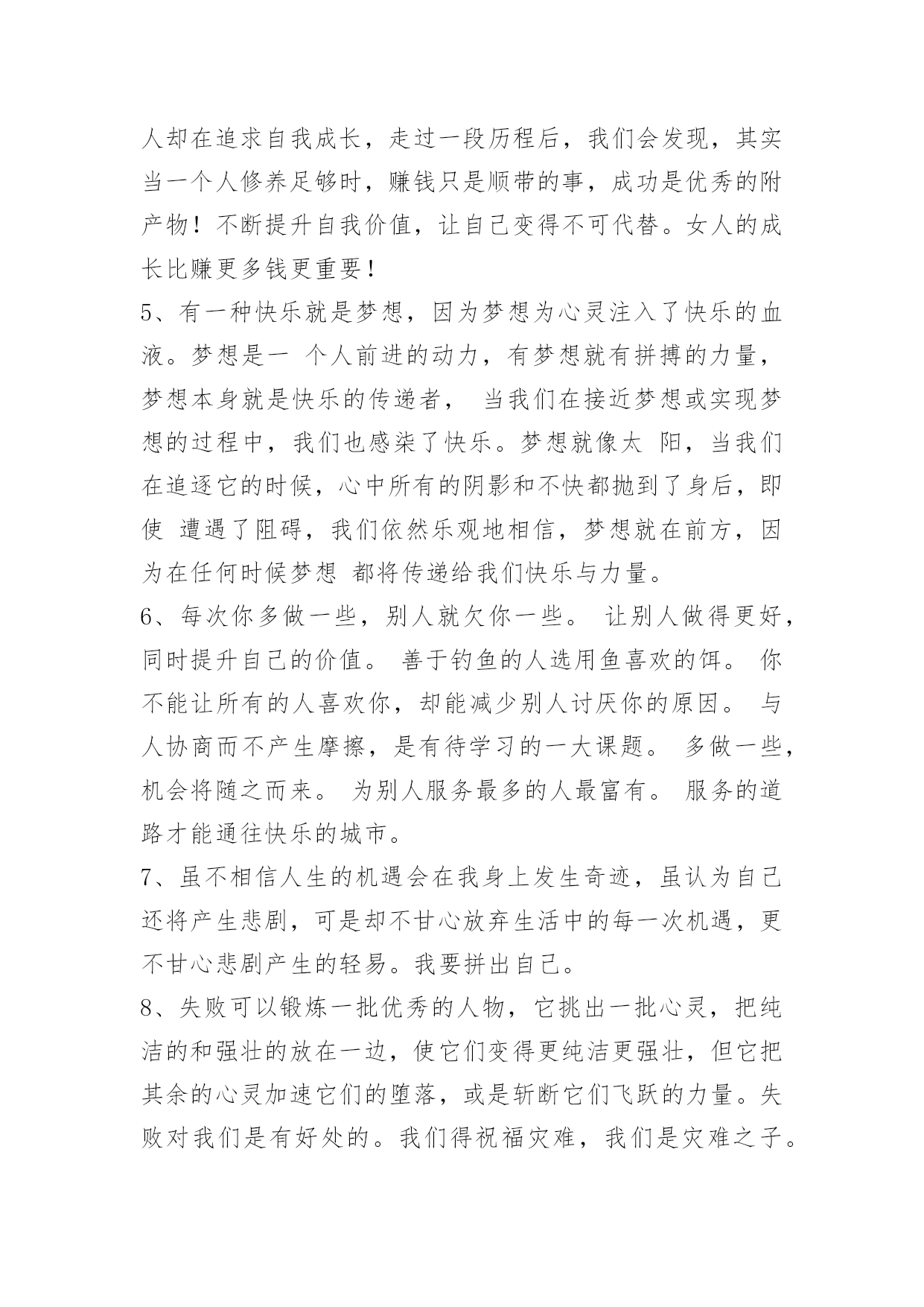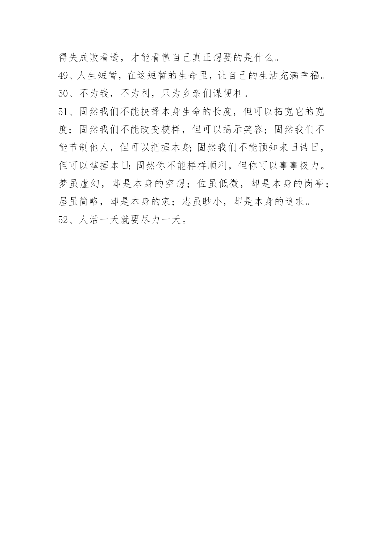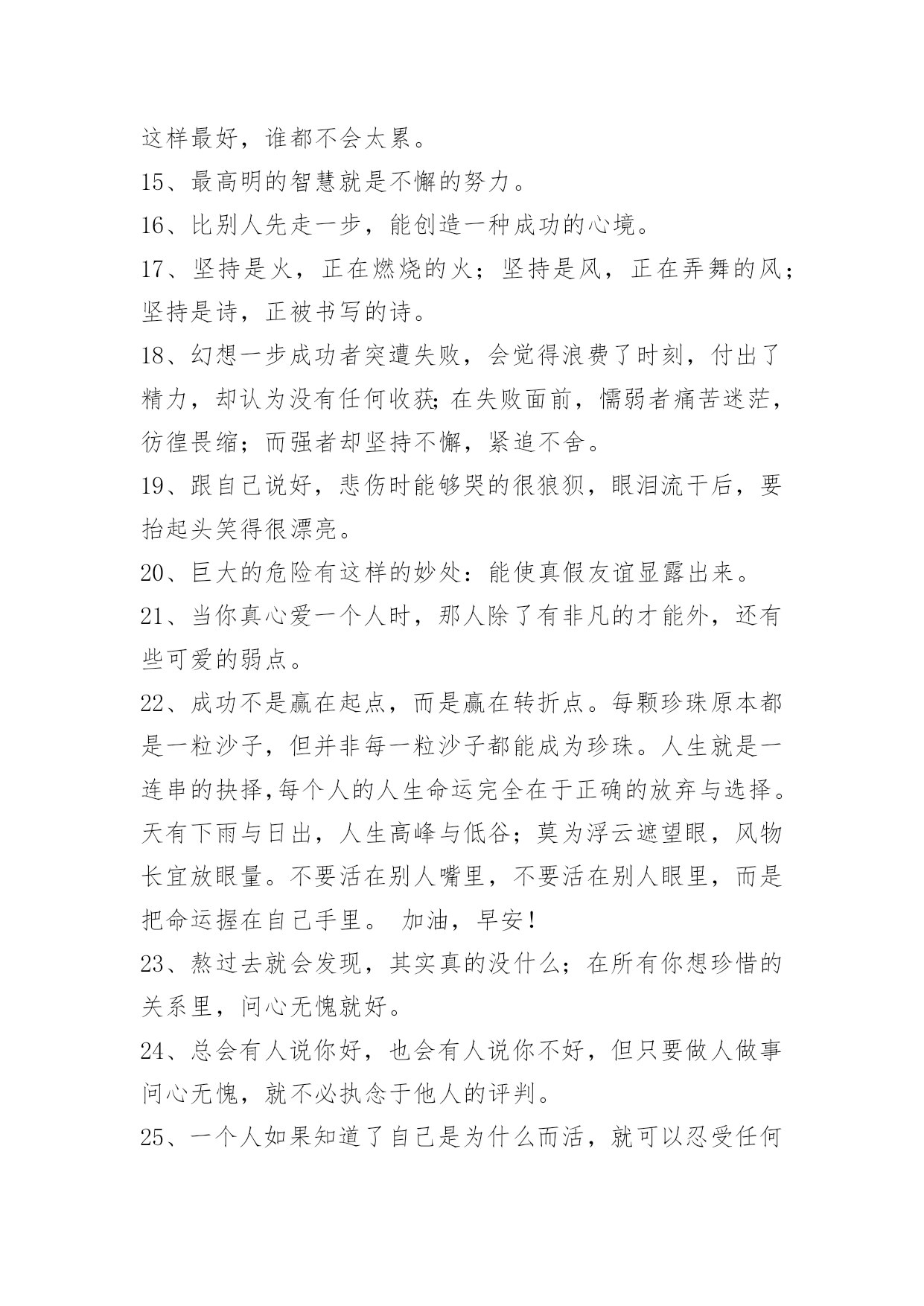 工作励志语录52条【必备】2021年工作励志语录汇编52条情投意合长相处,他成啥人你成啥;旁人比你都能干,那你也就成长快;自己身边高人多,不想提高都很难;天天向上有进取,交往高人己提高。下面是小编为大家推荐的工作励志语录52条,欢迎大家借鉴与参考,希望对大家有所帮助。1、造物主让我们出生,必赋其使命。为了让我们有能力完成这种使命,它没有忘记在我们身上注入为完成这种使命所必须具备的潜能,这种潜能就是我们的长处,就是我们打开成功大门的钥匙。2、我们渴望成功,首先要志在成功,要盯着目标向前走,视线不要左右飘忽,心态不易随地转移。要坚信成功不是梦幻,而就在我们脚下延伸,需要我们矢志不移地前行。要深知语言的祝愿很无力,行动才是最好的祈祷。成功的帷幕随时都有可能拉开,就看我们是愿意纵情地舞蹈,还是选择仓皇的逃避。3、在人生这本书里,多数的人都会从过分善良的天性里找到简单的教训。老实人有老实人的头脑简单之处,狡猾人也照样有狡猾人的头脑简单之处。——狄更斯4、女人干事业,并不是要赚多少钱,而是让自己的人生变得独立而精彩。很多女人都在追求物质财富,而有一部分女人却在追求自我成长,走过一段历程后,我们会发现,其实当一个人修养足够时,赚钱只是顺带的事,成功是优秀的附产物!不断提升自我价值,让自己变得不可代替。女人的成长比赚更多钱更重要!5、有一种快乐就是梦想,因为梦想为心灵注入了快乐的血液。梦想是一个人前进的动力,有梦想就有拼搏的力量,梦想本身就是快乐的传递者,当我们在接近梦想或实现梦想的过程中,我们也感柒了快乐。梦想就像太阳,当我们在追逐它的时候,心中所有的阴影和不快都抛到了身后,即使遭遇了阻碍,我们依然乐观地相信,梦想就在前方,因为在任何时候梦想都将传递给我们快乐与力量。6、每次你多做一些,别人就欠你一些。让别人做得更好,同时提升自己的价值。善于钓鱼的人选用鱼喜欢的饵。你不能让所有的人喜欢你,却能减少别人讨厌你的原因。与人协商而不产生摩擦,是有待学习的一大课题。多做一些,机会将随之而来。为别人服务最多的人最富有。服务的道路才能通往快乐的城市。7、虽不相信人生的机遇会在我身上发生奇迹,虽认为自己还将产生悲剧,可是却不甘心放弃生活中的每一次机遇,更不甘心悲剧产生的轻易。我要拼出自己。8、失败可以锻炼一批优秀的人物,它挑出一批心灵,把纯洁的和强壮的放在一边,使它们变得更纯洁更强壮,但它把其余的心灵加速它们的堕落,或是斩断它们飞跃的力量。失败对我们是有好处的。我们得祝福灾难,我们是灾难之子。——罗曼·罗兰9、如果读书只为了装饰自己,与新式化妆品系列合流,我看没有多大意思,无论对人对己,都只会产生负效应。柯灵《柯灵谈读书》,《新民晚报》1990年5月8日。10、生命的用途并不在长短而在我们怎样利用它。许多人活的日子并不多,却活了很长久。’金钱能使人成为奴隶,一个人拥有金钱,有时就像娶了一个没有爱情的妻子,富有而没有幸福。11、美国的崛起是基于这样一种普遍的个人理念:一个人如果想成功,他必须把自己全部的生命热忱都投入进去。正是热忱,在科学、艺术和商业领域造就了无数的奇迹。对于个人来说,成功与失败的分水岭往住在于有的人凭着热忱全身心地投入而另外一些人却不够专心致志。12、人总是免不了会沉醉于希望的幻影之中,我们总想闭上我们的眼睛,不愿看痛苦的事实。……就我自己而言,不论要付出多少的.痛苦和经历,我绝不逃避整个事实的真相!我想知道最糟的程度是什么,并且谋求补救的办法。一亨利13、生命中的考验常有,不要把挫折归罪到命运。只要意志坚定,就会收获满满;但若软弱可欺,就会悲惨连连。想要幸福生活,必须让自己坚强自信。14、听着一首歌,反反复复,琢磨不透,自己在想什么?难道真的爱她么?可为什么说不出口呢,爱情就是买卖,看透就好。痴情的人不会有真爱、让这一切随风,吹到天涯海角。不要再让我见到,对你,既然说不出,那就模模糊糊。或许,这样最好,谁都不会太累。15、最高明的智慧就是不懈的努力。16、比别人先走一步,能创造一种成功的心境。17、坚持是火,正在燃烧的火;坚持是风,正在弄舞的风;坚持是诗,正被书写的诗。18、幻想一步成功者突遭失败,会觉得浪费了时刻,付出了精力,却认为没有任何收获;在失败面前,懦弱者痛苦迷茫,彷徨畏缩;而强者却坚持不懈,紧追不舍。19、跟自己说好,悲伤时能够哭的很狼狈,眼泪流干后,要抬起头笑得很漂亮。20、巨大的危险有这样的妙处:能使真假友谊显露出来。21、当你真心爱一个人时,那人除了有非凡的才能外,还有些可爱的弱点。22、成功不是赢在起点,而是赢在转折点。每颗珍珠原本都是一粒沙子,但并非每一粒沙子都能成为珍珠。人生就是一连串的抉择,每个人的人生命运完全在于正确的放弃与选择。天有下雨与日出,人生高峰与低谷;莫为浮云遮望眼,风物长宜放眼量。不要活在别人