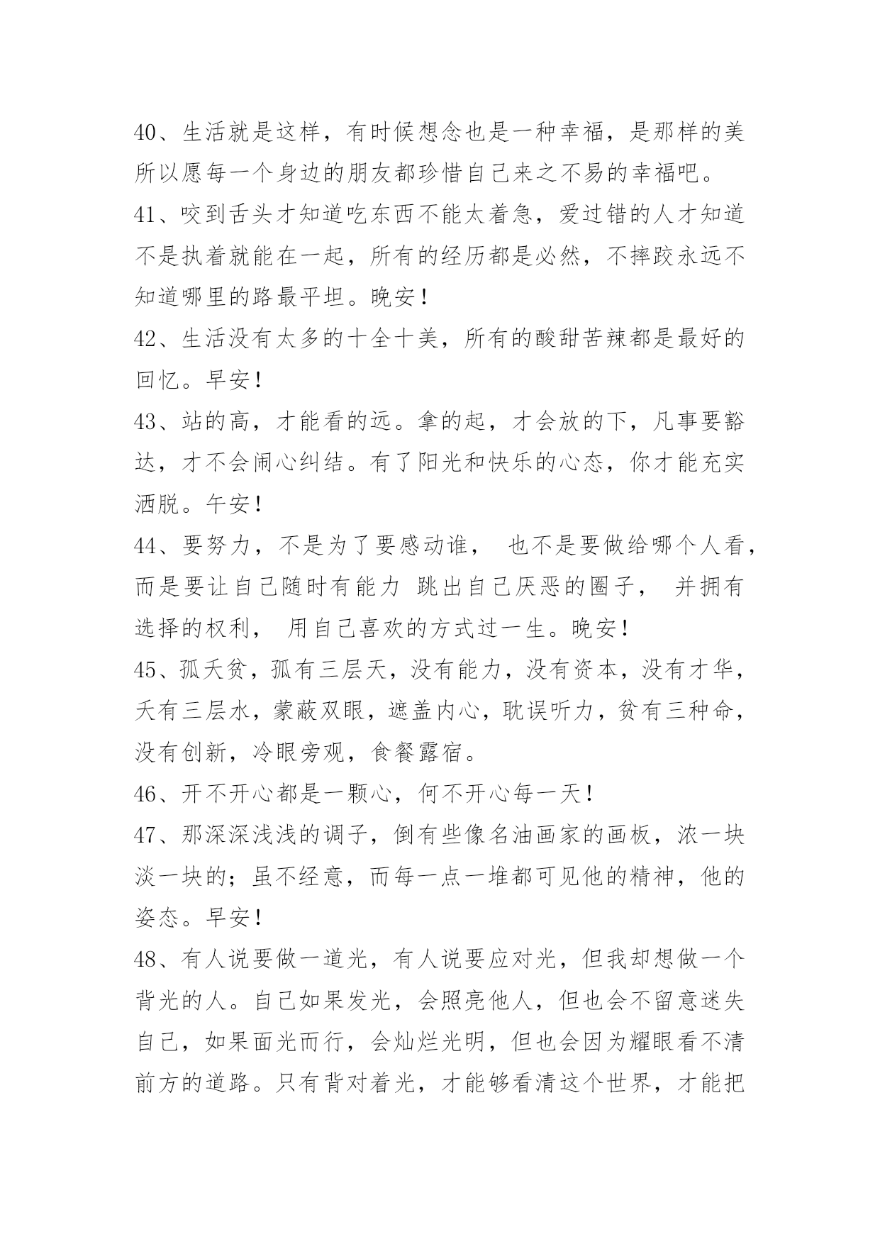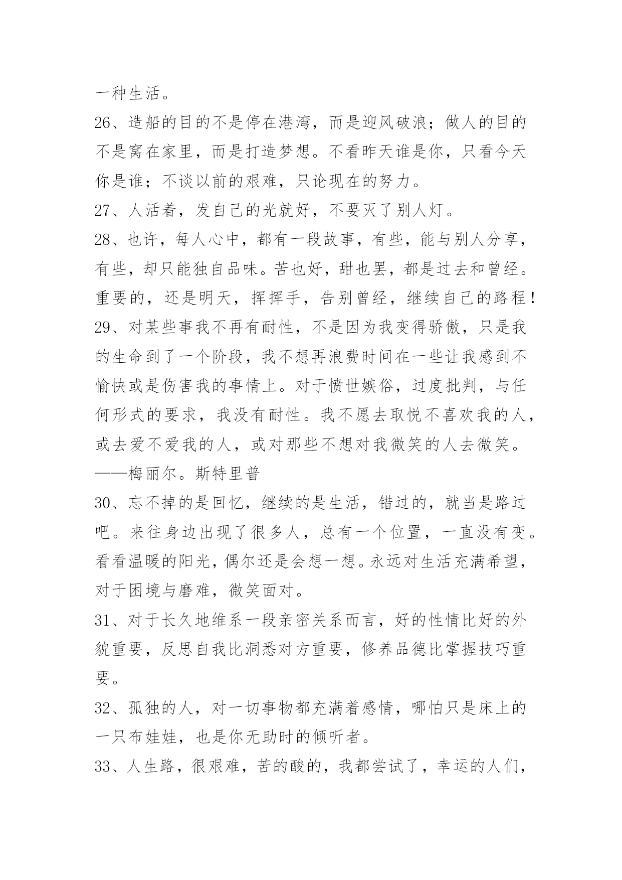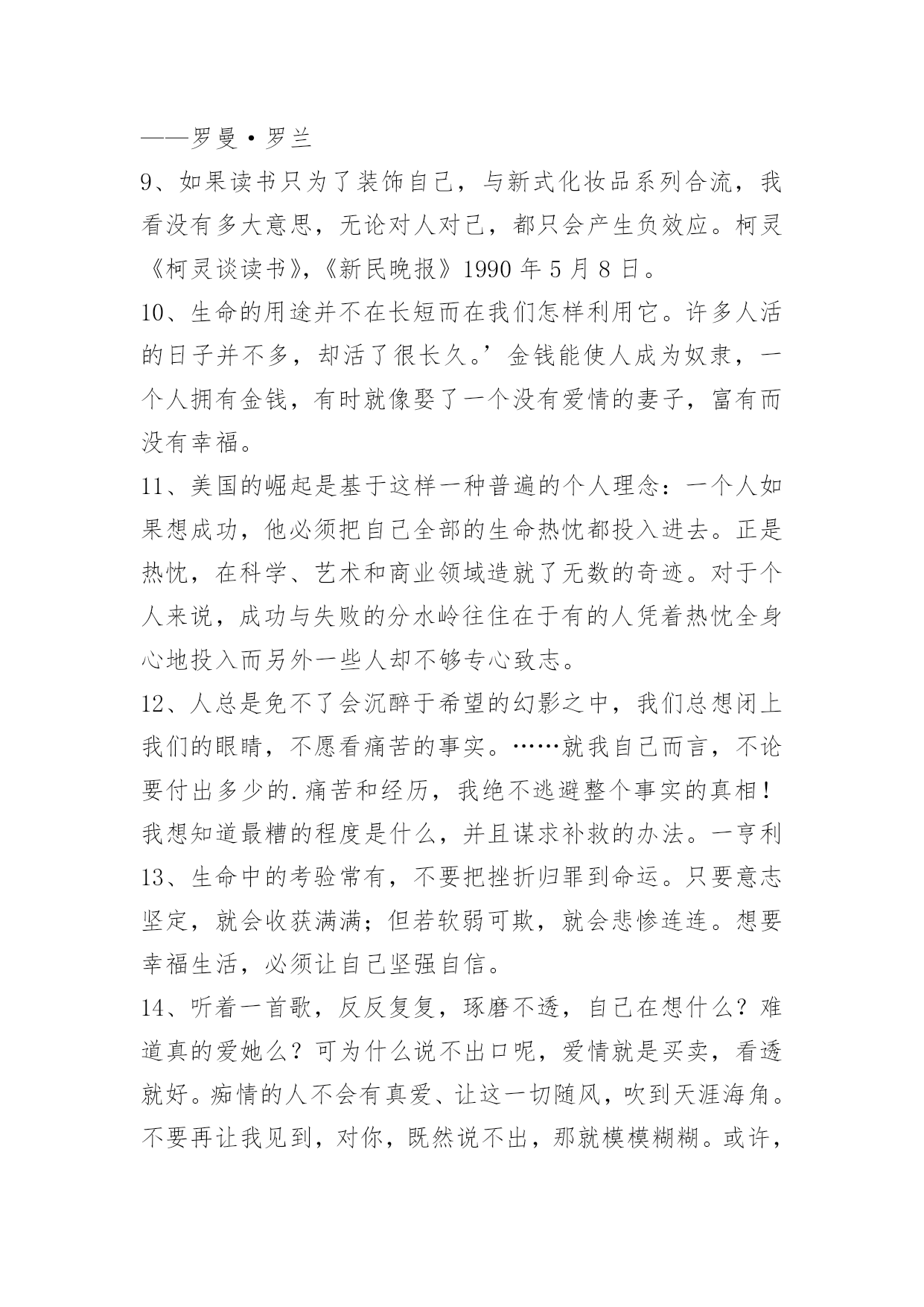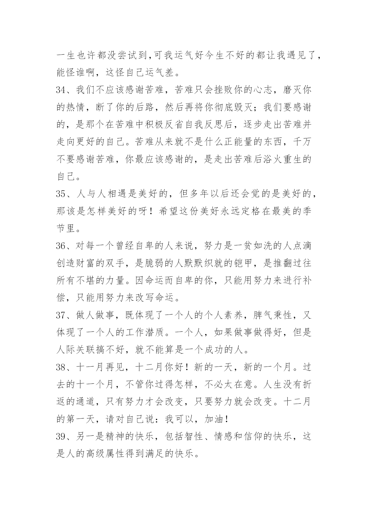 工作励志语录52条【必备】2021年工作励志语录汇编52条情投意合长相处,他成啥人你成啥;旁人比你都能干,那你也就成长快;自己身边高人多,不想提高都很难;天天向上有进取,交往高人己提高。下面是小编为大家推荐的工作励志语录52条,欢迎大家借鉴与参考,希望对大家有所帮助。1、造物主让我们出生,必赋其使命。为了让我们有能力完成这种使命,它没有忘记在我们身上注入为完成这种使命所必须具备的潜能,这种潜能就是我们的长处,就是我们打开成功大门的钥匙。2、我们渴望成功,首先要志在成功,要盯着目标向前走,视线不要左右飘忽,心态不易随地转移。要坚信成功不是梦幻,而就在我们脚下延伸,需要我们矢志不移地前行。要深知语言的祝愿很无力,行动才是最好的祈祷。成功的帷幕随时都有可能拉开,就看我们是愿意纵情地舞蹈,还是选择仓皇的逃避。3、在人生这本书里,多数的人都会从过分善良的天性里找到简单的教训。老实人有老实人的头脑简单之处,狡猾人也照样有狡猾人的头脑简单之处。——狄更斯4、女人干事业,并不是要赚多少钱,而是让自己的人生变得独立而精彩。很多女人都在追求物质财富,而有一部分女人却在追求自我成长,走过一段历程后,我们会发现,其实当一个人修养足够时,赚钱只是顺带的事,成功是优秀的附产物!不断提升自我价值,让自己变得不可代替。女人的成长比赚更多钱更重要!5、有一种快乐就是梦想,因为梦想为心灵注入了快乐的血液。梦想是一个人前进的动力,有梦想就有拼搏的力量,梦想本身就是快乐的传递者,当我们在接近梦想或实现梦想的过程中,我们也感柒了快乐。梦想就像太阳,当我们在追逐它的时候,心中所有的阴影和不快都抛到了身后,即使遭遇了阻碍,我们依然乐观地相信,梦想就在前方,因为在任何时候梦想都将传递给我们快乐与力量。6、每次你多做一些,别人就欠你一些。让别人做得更好,同时提升自己的价值。善于钓鱼的人选用鱼喜欢的饵。你不能让所有的人喜欢你,却能减少别人讨厌你的原因。与人协商而不产生摩擦,是有待学习的一大课题。多做一些,机会将随之而来。为别人服务最多的人最富有。服务的道路才能通往快乐的城市。7、虽不相信人生的机遇会在我身上发生奇迹,虽认为自己还将产生悲剧,可是却不甘心放弃生活中的每一次机遇,更不甘心悲剧产生的轻易。我要拼出自己。8、失败可以锻炼一批优秀的人物,它挑出一批心灵,把纯洁的和强壮的放在一边,使它们变得更纯洁更强壮,但它把其余的心灵加速它们的堕落,或是斩断它们飞跃的力量。失败对我们是有好处的。我们得祝福灾难,我们是灾难之子。——罗曼·罗兰9、如果读书只为了装饰自己,与新式化妆品系列合流,我看没有多大意思,无论对人对己,都只会产生负效应。柯灵《柯灵谈读书》,《新民晚报》1990年5月8日。10、生命的用途并不在长短而在我们怎样利用它。许多人活的日子并不多,却活了很长久。’金钱能使人成为奴隶,一个人拥有金钱,有时就像娶了一个没有爱情的妻子,富有而没有幸福。11、美国的崛起是基于这样一种普遍的个人理念:一个人如果想成功,他必须把自己全部的生命热忱都投入进去。正是热忱,在科学、艺术和商业领域造就了无数的奇迹。对于个人来说,成功与失败的分水岭往住在于有的人凭着热忱全身心地投入而另外一些人却不够专心致志。12、人总是免不了会沉醉于希望的幻影之中,我们总想闭上我们的眼睛,不愿看痛苦的事实。……就我自己而言,不论要付出多少的.痛苦和经历,我绝不逃避整个事实的真相!我想知道最糟的程度是什么,并且谋求补救的办法。一亨利13、生命中的考验常有,不要把挫折归罪到命运。只要意志坚定,就会收获满满;但若软弱可欺,就会悲惨连连。想要幸福生活,必须让自己坚强自信。14、听着一首歌,反反复复,琢磨不透,自己在想什么?难道真的爱她么?可为什么说不出口呢,爱情就是买卖,看透就好。痴情的人不会有真爱、让这一切随风,吹到天涯海角。不要再让我见到,对你,既然说不出,那就模模糊糊。或许,这样最好,谁都不会太累。15、最高明的智慧就是不懈的努力。16、比别人先走一步,能创造一种成功的心境。17、坚持是火,正在燃烧的火;坚持是风,正在弄舞的风;坚持是诗,正被书写的诗。18、幻想一步成功者突遭失败,会觉得浪费了时刻,付出了精力,却认为没有任何收获;在失败面前,懦弱者痛苦迷茫,彷徨畏缩;而强者却坚持不懈,紧追不舍。19、跟自己说好,悲伤时能够哭的很狼狈,眼泪流干后,要抬起头笑得很漂亮。20、巨大的危险有这样的妙处:能使真假友谊显露出来。21、当你真心爱一个人时,那人除了有非凡的才能外,还有些可爱的弱点。22、成功不是赢在起点,而是赢在转折点。每颗珍珠原本都是一粒沙子,但并非每一粒沙子都能成为珍珠。人生就是一连串的抉择,每个人的人生命运完全在于正确的放弃与选择。天有下雨与日出,人生高峰与低谷;莫为浮云遮望眼,风物长宜放眼量。不要活在别人