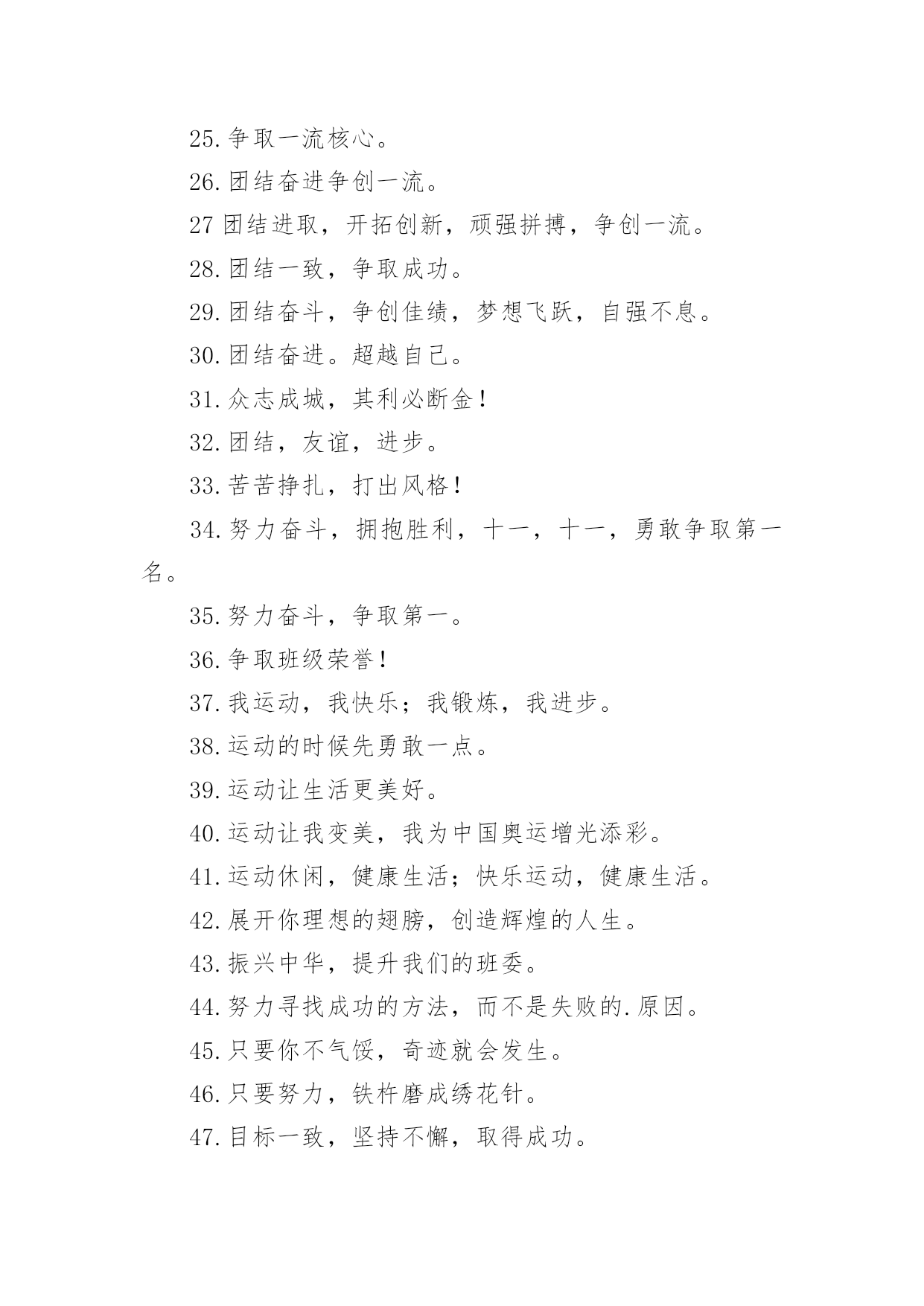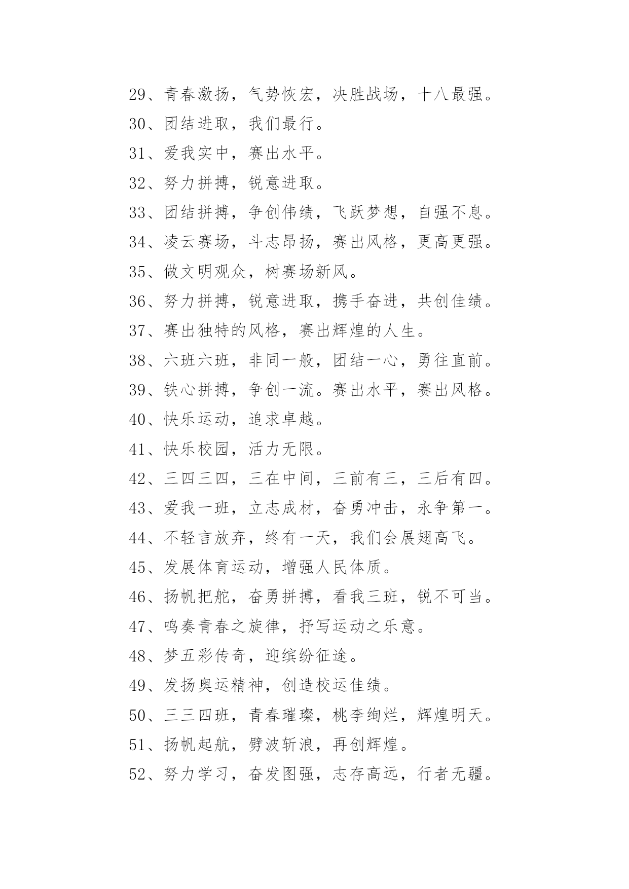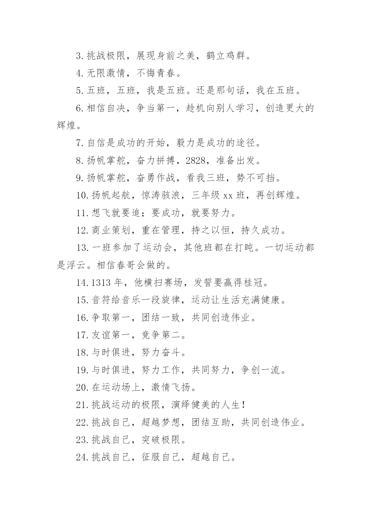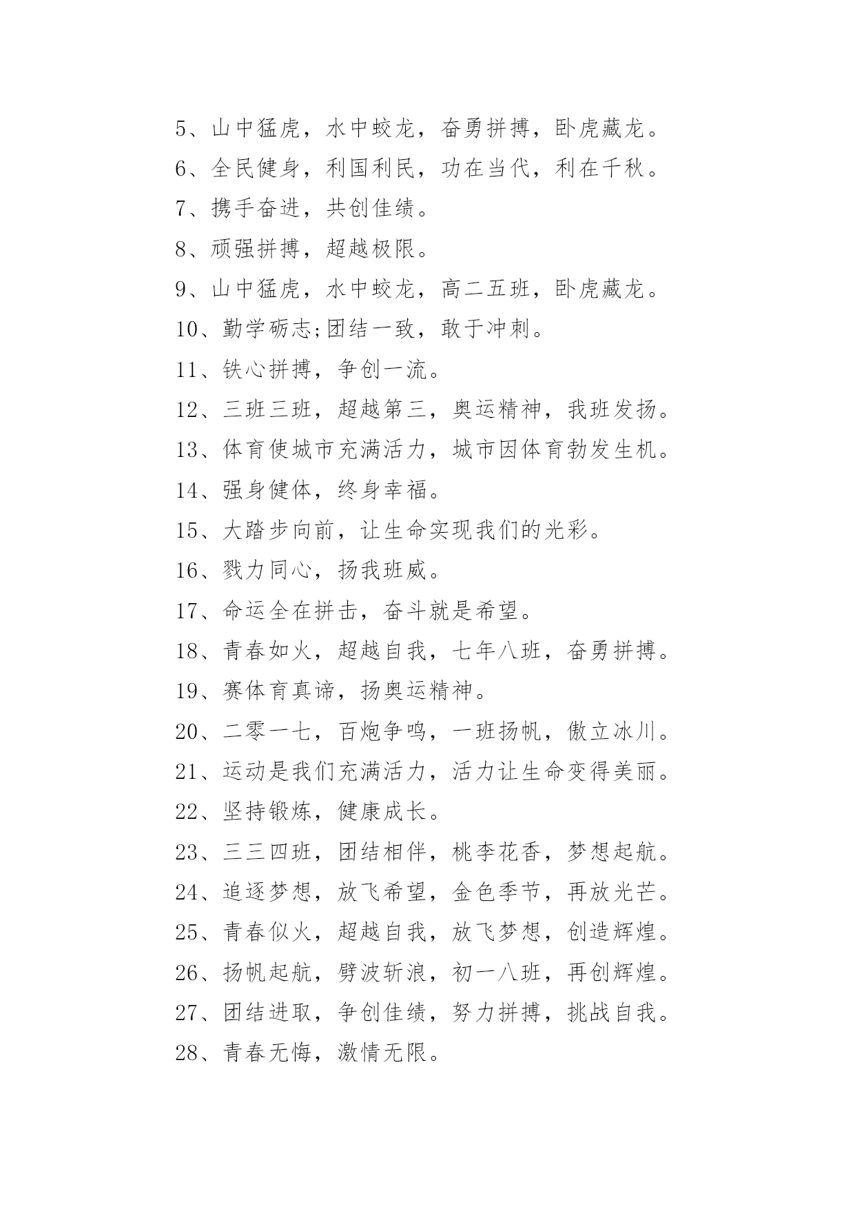 秋季运动会口号押韵在日常学习、工作和生活中,大家一定都接触过一些使用较为普遍的口号吧,通过口号可以增加团队凝聚力,起到事半功倍的效果。那么什么样的口号才是好的口号呢?以下是小编收集整理的秋季运动会口号押韵,希望对大家有所帮助。秋季运动会口号押韵1一、三班三班,超越第三,奥运精神,我班发杨二、赶虎下山,驱龙出水,高二(2)班,独占山水三、一七一七,迸发活力,扬帆百舵,勇争第一四、我爱运动,快乐成长;我爱运动,我更健康五、三四三四,班级旗帜,荣誉在手,贵在保持六、挑战自我,突破极限;奋发拼搏,勇于开拓七、挑战自我,超越梦想,团结互助,共创佳绩八、锻炼身体,保卫祖国,锻炼身体,建设祖国九、山中蛟龙,水中猛虎,三三四班,卧虎藏龙十、七八七八,精神焕发,强身健体,状态最佳十一、团结拼搏,勇创佳绩,超越梦想,永不言弃十二、十九雄风,争荣立功,二班精英,谁与争锋十三、小二小二,齐心协力;小二小二,力争第一十四、高二五班,奋勇争先,永不退缩,向前向前十五、青春如火,超越自我;机汽学子,勇创佳绩秋季运动会口号押韵21.一七一七,迸发活力,扬帆百舵,勇争第一2.运动起来,勇敢第一。3.励精图治,奋发向上,努力拼搏,永不言弃。4.开展全民健身运动,全面建设小康社会!5.比赛第二,光明正大的去比赛。6.爱我一班,立志成材,奋勇冲击,永争第一。7.精神的动力,源于运动。8.团结进取,开拓创新,顽强拼搏,争创一流9.凌云赛场,斗志昂扬,赛出风格,更高更强10.以勇求改,以改求变,以变求进。11.与时俱进,奋力拼搏,齐心协力,争创一流12.实力最佳,与时俱进,开创未来。13.体育使学校充满活力,学校因体育勃发生机!14.我运动,我健康,我快乐15.青春拥抱梦想,拼搏成就辉煌16.发展体育运动,增强人民体质!17.播下希望,充满xx,勇往直前,永不言败。18.年轻健儿显身手,时代骄子竞风流!19.青春如火,奋勇拼搏,高一十班,必得桂冠20.锻炼身体增强体质,报效祖国,造福人类21.鸣奏青春旋律,抒写运动乐意。22.鸣奏青春旋律,抒写运动乐意23.不为掌声的诠释,不为刻意的征服。24.挑战运动极限,演绎健美人生。25.扬帆把舵,奋勇拼搏,看我三班,锐不可当。秋季运动会口号押韵3一、学习奥运,顽强拼搏,奋勇争先,超越自我二、齐心协力,再创辉煌,勇争冠军,实力无限三、英明神武,勇冠江山,史上最强,唯我五班四、扬帆把舵,奋勇拼搏,看我四班,锐不可当五、强身健体,立志成材,2班2班,非同一般。六、信笃志坚,奋起争先,机汽学子,再创辉煌七、高二十班,冲锋在前,为了明日,凤舞九天八、希望希望,团结坚强,英姿飒爽,梦想飞扬九、xx班一出,谁与争锋,横扫赛场,唯我称雄十、飞跃梦想,敢拼敢闯,乘风破浪,奋勇激昂十一、浪潮风行,气势如虹,浪潮风行,众志成城十二、六五精英,敢闯敢拼,齐心协力,争创佳绩十三、八(4)精英,敢闯敢拼,齐心协力,争创佳绩十四、志比天高,气比山昂,机汽学子,力争更强十五、凌云赛场,斗志昂扬,赛出风格,更高更强秋季运动会口号押韵41.体育让学校充满活力,学校占尽优势!2.田径运动英勇有趣。3.挑战极限,展现身前之美,鹤立鸡群。4.无限激情,不悔青春。5.五班,五班,我是五班。还是那句话,我在五班。6.相信自决,争当第一,趁机向别人学习,创造更大的辉煌。7.自信是成功的开始,毅力是成功的途径。8.扬帆掌舵,奋力拼搏,2828,准备出发。9.扬帆掌舵,奋勇作战,看我三班,势不可挡。10.扬帆起航,惊涛骇浪,三年级xx班,再创辉煌。11.想飞就要追;要成功,就要努力。12.商业策划,重在管理,持之以恒,持久成功。13.一班参加了运动会,其他班都在打盹。一切运动都是浮云。相信春哥会做的。14.1313年,他横扫赛场,发誓要赢得桂冠。15.音符给音乐一段旋律,运动让生活充满健康。16.争取第一,团结一致,共同创造伟业。17.友谊第一,竞争第二。18.与时俱进,努力奋斗。19.与时俱进,努力工作,共同努力,争创一流。20.在运动场上,激情飞扬。21.挑战运动的极限,演绎健美的人生!22.挑战自己,超越梦想,团结互助,共同创造伟业。23.挑战自己,突破极限。24.挑战自己,征服自己,超越自己。25.争取一流核心。26.团结奋进争创一流。27团结进取,开拓创新,顽强拼搏,争创一流。28.团结一致,争取成功。29.团结奋斗,争创佳绩,梦想飞跃,自强不息。30.团结奋进。超越自己。31.众志成城,其利必断金!32.团结,友谊,进步。33.苦苦挣扎,打出风格!34.努力奋斗,拥抱胜利,十一,十一,勇敢争取第一名。35.努力奋斗,争取第一。36.争取班级荣誉!37.我运动,我快乐;我锻炼,我进步。38.运动的时候先勇敢一点。39.运动让生活更美好。40.运动让我变美,我为中国奥