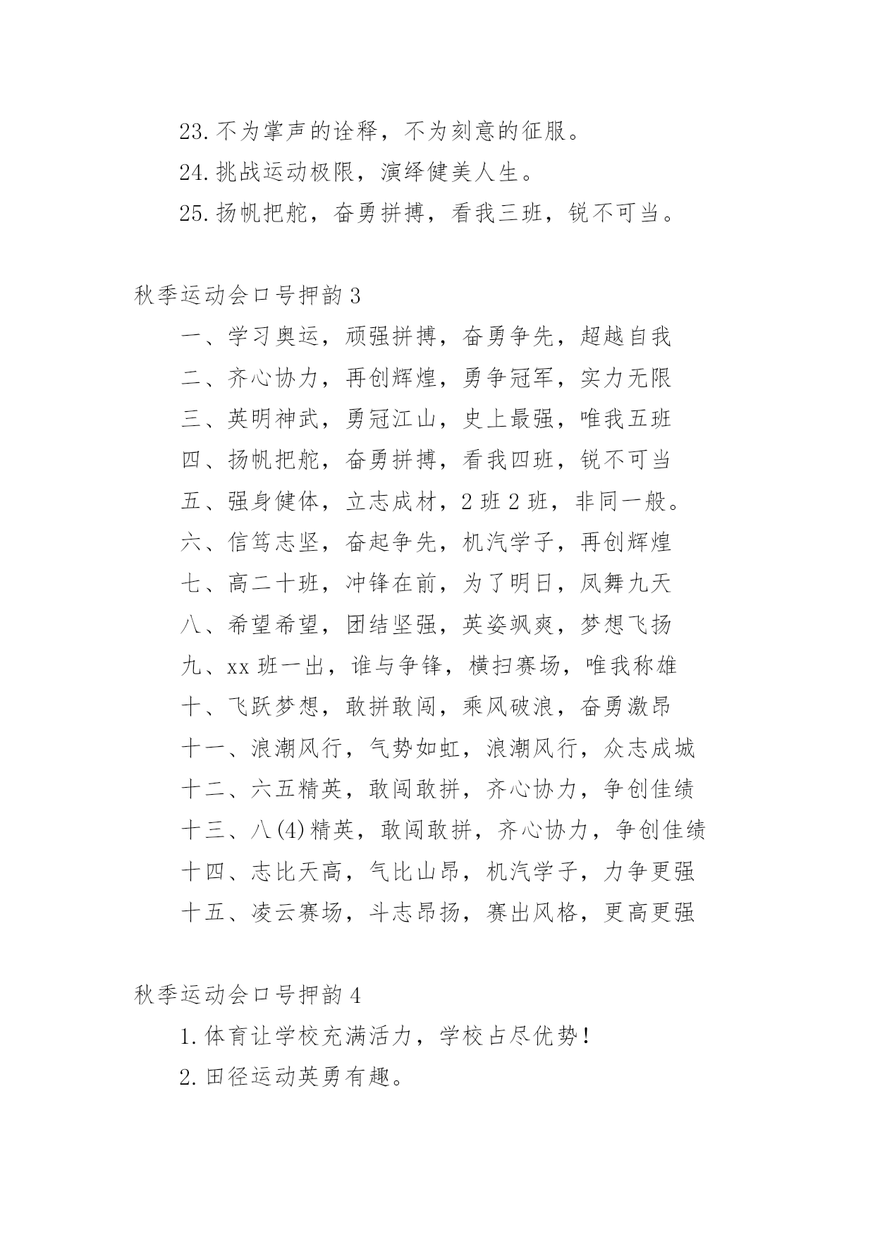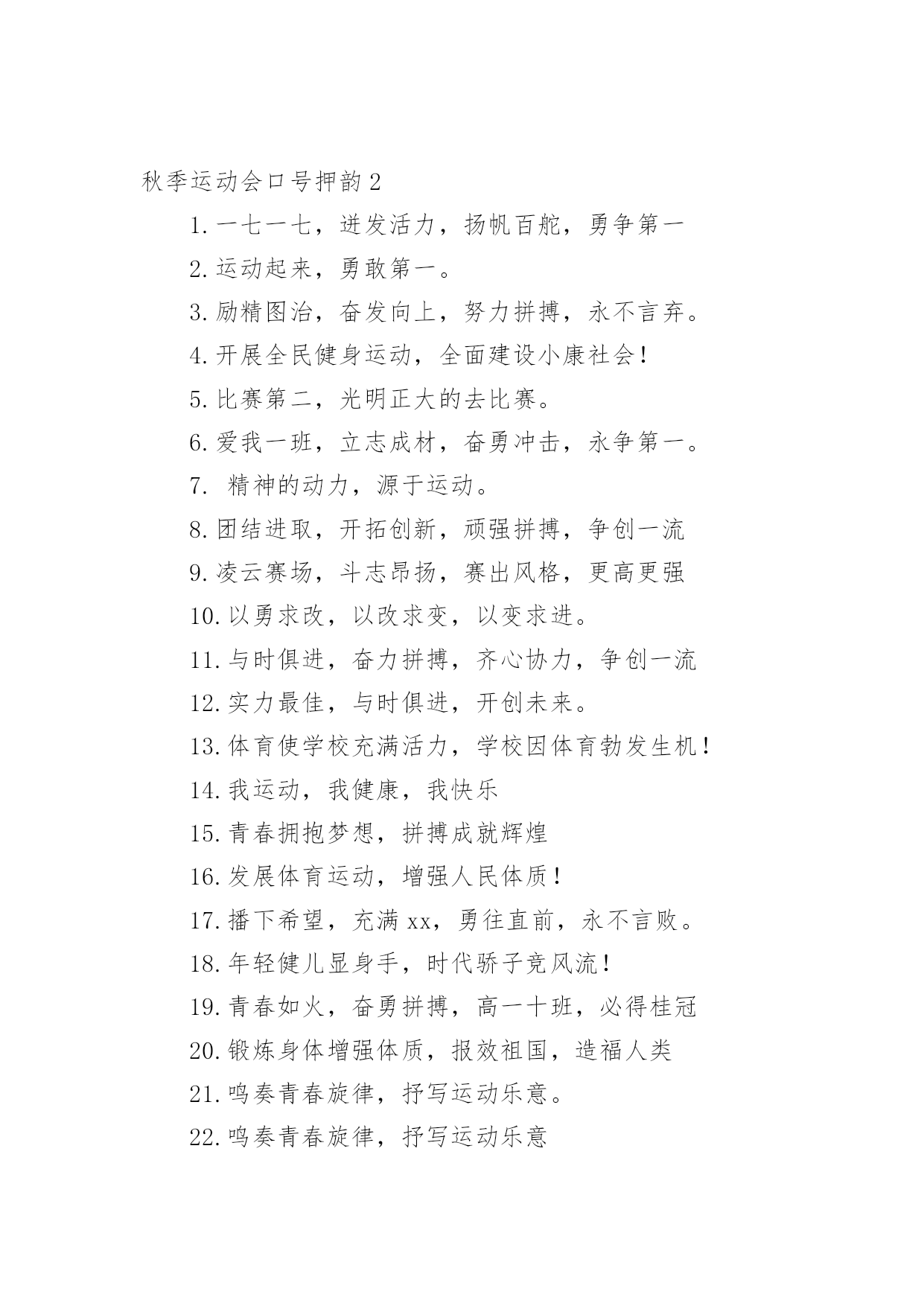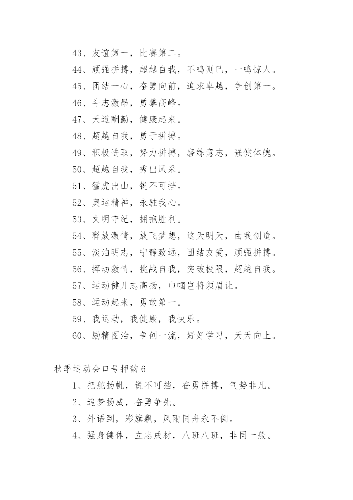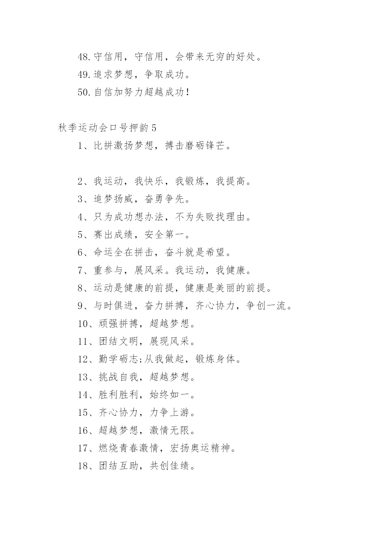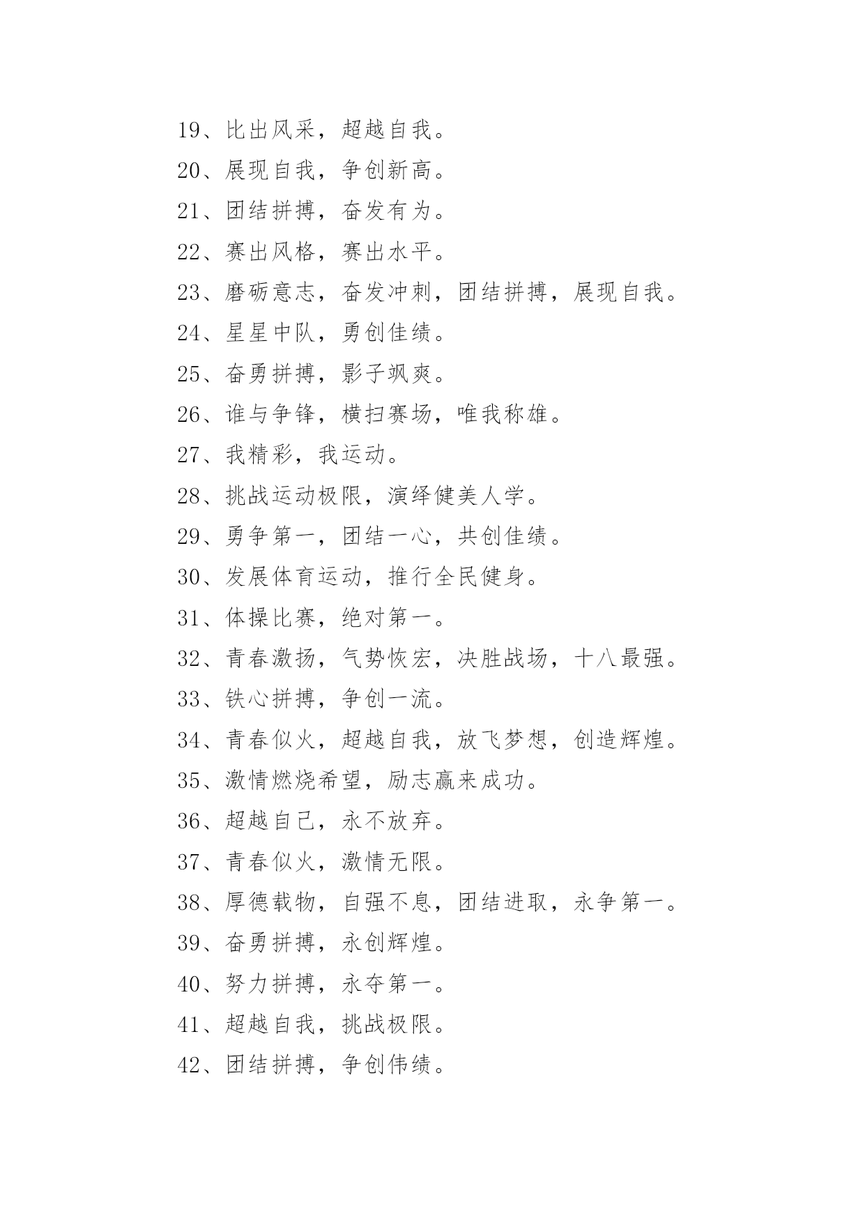 秋季运动会口号押韵在日常学习、工作和生活中,大家一定都接触过一些使用较为普遍的口号吧,通过口号可以增加团队凝聚力,起到事半功倍的效果。那么什么样的口号才是好的口号呢?以下是小编收集整理的秋季运动会口号押韵,希望对大家有所帮助。秋季运动会口号押韵1一、三班三班,超越第三,奥运精神,我班发杨二、赶虎下山,驱龙出水,高二(2)班,独占山水三、一七一七,迸发活力,扬帆百舵,勇争第一四、我爱运动,快乐成长;我爱运动,我更健康五、三四三四,班级旗帜,荣誉在手,贵在保持六、挑战自我,突破极限;奋发拼搏,勇于开拓七、挑战自我,超越梦想,团结互助,共创佳绩八、锻炼身体,保卫祖国,锻炼身体,建设祖国九、山中蛟龙,水中猛虎,三三四班,卧虎藏龙十、七八七八,精神焕发,强身健体,状态最佳十一、团结拼搏,勇创佳绩,超越梦想,永不言弃十二、十九雄风,争荣立功,二班精英,谁与争锋十三、小二小二,齐心协力;小二小二,力争第一十四、高二五班,奋勇争先,永不退缩,向前向前十五、青春如火,超越自我;机汽学子,勇创佳绩秋季运动会口号押韵21.一七一七,迸发活力,扬帆百舵,勇争第一2.运动起来,勇敢第一。3.励精图治,奋发向上,努力拼搏,永不言弃。4.开展全民健身运动,全面建设小康社会!5.比赛第二,光明正大的去比赛。6.爱我一班,立志成材,奋勇冲击,永争第一。7.精神的动力,源于运动。8.团结进取,开拓创新,顽强拼搏,争创一流9.凌云赛场,斗志昂扬,赛出风格,更高更强10.以勇求改,以改求变,以变求进。11.与时俱进,奋力拼搏,齐心协力,争创一流12.实力最佳,与时俱进,开创未来。13.体育使学校充满活力,学校因体育勃发生机!14.我运动,我健康,我快乐15.青春拥抱梦想,拼搏成就辉煌16.发展体育运动,增强人民体质!17.播下希望,充满xx,勇往直前,永不言败。18.年轻健儿显身手,时代骄子竞风流!19.青春如火,奋勇拼搏,高一十班,必得桂冠20.锻炼身体增强体质,报效祖国,造福人类21.鸣奏青春旋律,抒写运动乐意。22.鸣奏青春旋律,抒写运动乐意23.不为掌声的诠释,不为刻意的征服。24.挑战运动极限,演绎健美人生。25.扬帆把舵,奋勇拼搏,看我三班,锐不可当。秋季运动会口号押韵3一、学习奥运,顽强拼搏,奋勇争先,超越自我二、齐心协力,再创辉煌,勇争冠军,实力无限三、英明神武,勇冠江山,史上最强,唯我五班四、扬帆把舵,奋勇拼搏,看我四班,锐不可当五、强身健体,立志成材,2班2班,非同一般。六、信笃志坚,奋起争先,机汽学子,再创辉煌七、高二十班,冲锋在前,为了明日,凤舞九天八、希望希望,团结坚强,英姿飒爽,梦想飞扬九、xx班一出,谁与争锋,横扫赛场,唯我称雄十、飞跃梦想,敢拼敢闯,乘风破浪,奋勇激昂十一、浪潮风行,气势如虹,浪潮风行,众志成城十二、六五精英,敢闯敢拼,齐心协力,争创佳绩十三、八(4)精英,敢闯敢拼,齐心协力,争创佳绩十四、志比天高,气比山昂,机汽学子,力争更强十五、凌云赛场,斗志昂扬,赛出风格,更高更强秋季运动会口号押韵41.体育让学校充满活力,学校占尽优势!2.田径运动英勇有趣。3.挑战极限,展现身前之美,鹤立鸡群。4.无限激情,不悔青春。5.五班,五班,我是五班。还是那句话,我在五班。6.相信自决,争当第一,趁机向别人学习,创造更大的辉煌。7.自信是成功的开始,毅力是成功的途径。8.扬帆掌舵,奋力拼搏,2828,准备出发。9.扬帆掌舵,奋勇作战,看我三班,势不可挡。10.扬帆起航,惊涛骇浪,三年级xx班,再创辉煌。11.想飞就要追;要成功,就要努力。12.商业策划,重在管理,持之以恒,持久成功。13.一班参加了运动会,其他班都在打盹。一切运动都是浮云。相信春哥会做的。14.1313年,他横扫赛场,发誓要赢得桂冠。15.音符给音乐一段旋律,运动让生活充满健康。16.争取第一,团结一致,共同创造伟业。17.友谊第一,竞争第二。18.与时俱进,努力奋斗。19.与时俱进,努力工作,共同努力,争创一流。20.在运动场上,激情飞扬。21.挑战运动的极限,演绎健美的人生!22.挑战自己,超越梦想,团结互助,共同创造伟业。23.挑战自己,突破极限。24.挑战自己,征服自己,超越自己。25.争取一流核心。26.团结奋进争创一流。27团结进取,开拓创新,顽强拼搏,争创一流。28.团结一致,争取成功。29.团结奋斗,争创佳绩,梦想飞跃,自强不息。30.团结奋进。超越自己。31.众志成城,其利必断金!32.团结,友谊,进步。33.苦苦挣扎,打出风格!34.努力奋斗,拥抱胜利,十一,十一,勇敢争取第一名。35.努力奋斗,争取第一。36.争取班级荣誉!37.我运动,我快乐;我锻炼,我进步。38.运动的时候先勇敢一点。39.运动让生活更美好。40.运动让我变美,我为中国奥