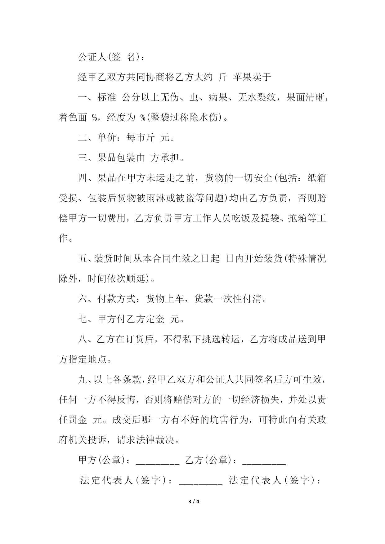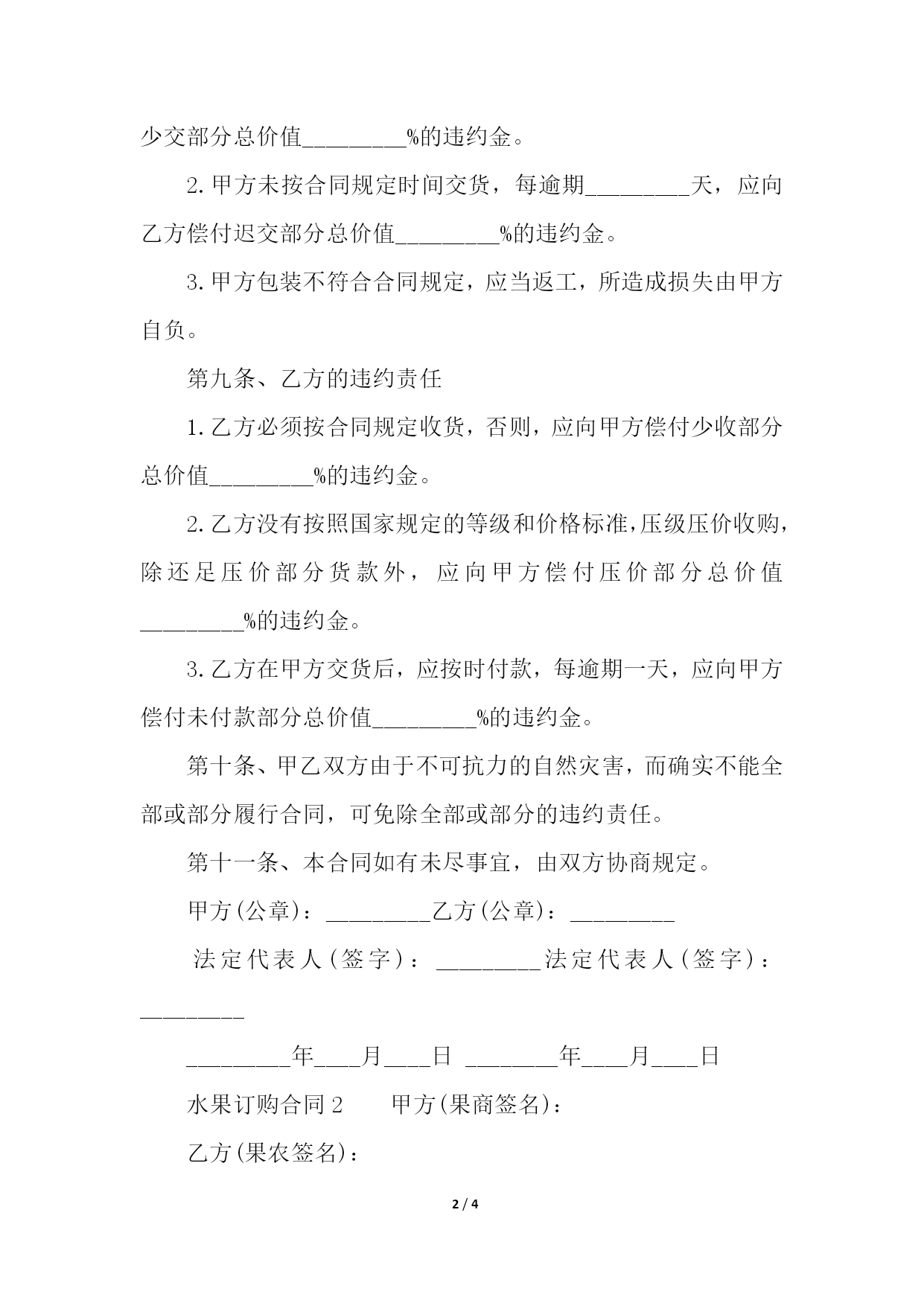 PAGE4/NUMPAGES4水果订购合同模板水果订购合同1甲方:_________乙方:_________为了发展果品生产,安排好市场供应,甲乙双方协商一致,签订本合同,共同信守。第一条、定购水果名称、单位、单价、数量_________。第二条、果品质量(按照国家规定的规格标准执行)。第三条、包装要求和费用承担:1.包装材料及规格:_________。2.每包水果净重:_________公斤。3.不同品种等级分别包装。4.包装牢固,适宜装卸运输。5.每包品种等级标签清楚。6.包装费用由甲方负担。第四条、交货时间、地点_________。第五条、验收方法_________。第六条、运输方法及运费承担_________。第七条、结算方式与期限_________。第八条、甲方的违约责任1.甲方未按合同规定品名、品级、数量交货,应向乙方偿付少交部分总价值_________%的违约金。2.甲方未按合同规定时间交货,每逾期_________天,应向乙方偿付迟交部分总价值_________%的违约金。3.甲方包装不符合合同规定,应当返工,所造成损失由甲方自负。第九条、乙方的违约责任1.乙方必须按合同规定收货,否则,应向甲方偿付少收部分总价值_________%的违约金。2.乙方没有按照国家规定的等级和价格标准,压级压价收购,除还足压价部分货款外,应向甲方偿付压价部分总价值_________%的违约金。3.乙方在甲方交货后,应按时付款,每逾期一天,应向甲方偿付未付款部分总价值_________%的违约金。第十条、甲乙双方由于不可抗力的自然灾害,而确实不能全部或部分履行合同,可免除全部或部分的违约责任。第十一条、本合同如有未尽事宜,由双方协商规定。甲方(公章):_________乙方(公章):_________法定代表人(签字):_________法定代表人(签字):__________________年____月____日________年____月____日水果订购合同2甲方(果商签名):乙方(果农签名):公证人(签名):经甲乙双方共同协商将乙方大约斤苹果卖于一、标准公分以上无伤、虫、病果、无水裂纹,果面清晰,着色面%,经度为%(整袋过称除水伤)。二、单价:每市斤元。三、果品包装由方承担。四、果品在甲方未运走之前,货物的一切安全(包括:纸箱受损、包装后货物被雨淋或被盗等问题)均由乙方负责,否则赔偿甲方一切费用,乙方负责甲方工作人员吃饭及提袋、抱箱等工作。五、装货时间从本合同生效之日起日内开始装货(特殊情况除外,时间依次顺延)。六、付款方式:货物上车,货款一次性付清。七、甲方付乙方定金元。八、乙方在订货后,不得私下挑选转运,乙方将成品送到甲方指定地点。九、以上各条款,经甲乙双方和公证人共同签名后方可生效,任何一方不得反悔,否则将赔偿对方的一切经济损失,并处以责任罚金元。成交后哪一方有不好的坑害行为,可特此向有关政府机关投诉,请求法律裁决。甲方(公章):_________乙方(公章):_________法定代表人(签字):_________法定代表人(签字):__________________年____月____日_________年____月____日