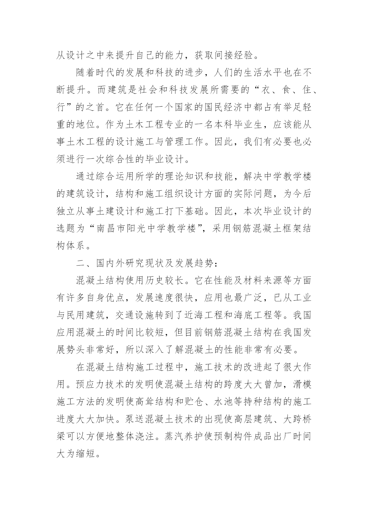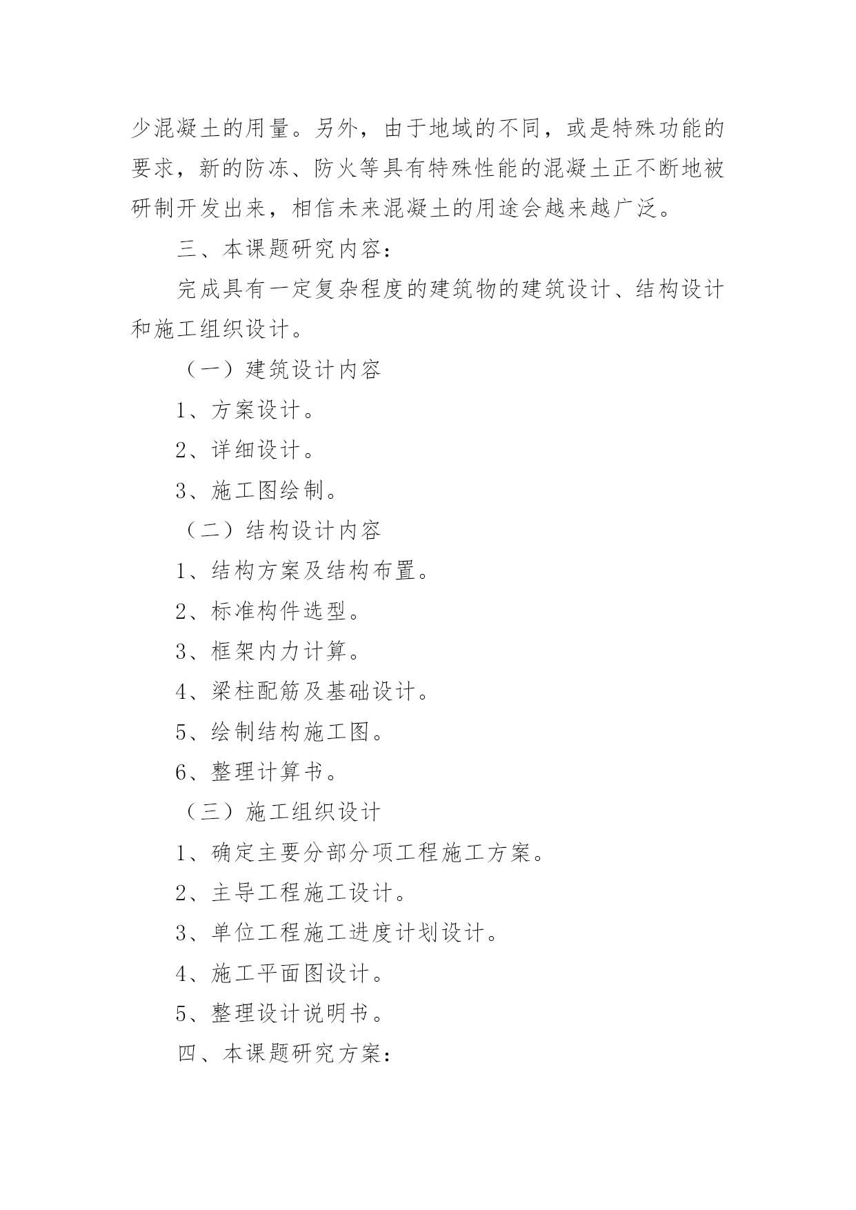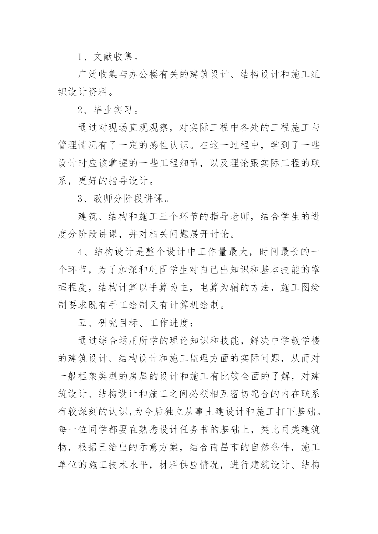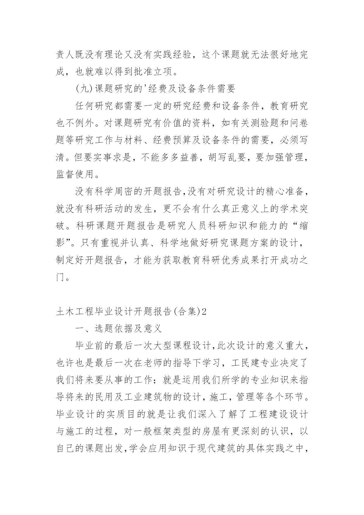 土木工程毕业设计开题报告土木工程毕业设计开题报告(合集)在我们平凡的日常里,我们使用报告的情况越来越多,不同的报告内容同样也是不同的。在写之前,可以先参考范文,以下是小编为大家整理的土木工程毕业设计开题报告(合集),欢迎大家分享。土木工程毕业设计开题报告(合集)1(一)课题名称课题名称就是课题的名字。这看起来是个小问题,但实际上很多人写课题名称时,往往写得不准确、不恰当,从而影响整个课题的形象与质量。这就是平常人们所说的“只会生孩子,不会起名字”。那么,如何给课题起名称呢?1、名称要准确、规范准确就是课题的名称要把课题研究的问题是什么,研究的对象是什么交待清楚。总之,课题的名称一定要和研究的内容相一致,要准确地把你研究的对象、问题概括出来。规范就是所用的词语、句型要规范、科学。课题就是我们要解决的问题,所以这些问题需要正在探讨,正开始研究,而不能有结论性的口气。2、名称要简洁,不能太长不管是论文或者课题,名称都不能太长,要简明扼要,通俗易懂,能不要的文字就尽量不用,一般不要超过20个字。但要尽可能表明三点:研究对象、研究问题和研究方法。(二)课题研究的目的、意义首先,要阐明课题研究的背景,即根据什么、受什么启发而进行这项研究的。因为任何课题研究都不是凭空来的,都有一定的背景和思路。其次,要阐明为什么要研究这个课题、研究它有什么价值,能解决什么问题。第三,要认真、仔细查阅与本课题有关的文献资料,了解前人或他人对本课题或有关问题所做的研究及研究的指导思想、研究范围、方法、成果等。把已有的研究成果作为自己的研究起点,并从中发现以往的不足,确认自己的创意,从而确定自己研究的特色或突破点。这样既可以更加突出本课题研究的的价值、意义,也可以使自己开阔眼界,受到启发,拓展思路。一般可以先从现实需要方面去论述,指出现实中存在这个问题,需要去研究,去解决,本课题的研究有什么实际作用,然后,再写课题的理论和学术价值。(三)课题研究的目标课题研究的目标就是通过研究,要达到什么目标?要解决哪些具体问题?研究的目标是比较具体的,不能笼统地讲,必须清楚地写出来。只有目标明确而具体,才能知道工作的具体方向是什么,才知道研究的重点是什么,思路就不会被各种因素所干扰。确定课题研究目标时,一方面要考虑课题本身的要求,另一方面要考虑课题组实际的工作条件与工作水平。(四)课题研究的基本内容有了课题的研究目标,就要根据目标来确定这个课题要研究的内容,研究内容要比研究目标写得更具体、明确。目前在这方面存在的主要问题是:1、只有课题而无具体研究内容;2、研究内容与课题不吻合;3、课题很大而研究内容却很少;4,把研究的目的、意义当作研究内容。(五)课题研究的方法任何科学研究除了要应用哲学方法和一般科学方法之外,还要有具体的研究方法、技术手段。“研究方法”这部分,主要反映一项课题的研究通过什么方法来验证我们的假设,为什么要用这个方法?以及要“做什么”、“怎么做”。教育研究的方法很多,包括历史研究法、调查研究法、实验研究法、比较研究法、理论研究法、行动研究法等。一个大的课题往往需要多种方法,小的课题可能主要是一种方法,但也要利用其它方法。我们在应用各种方法时,一定要严格按照每一具体科研方法的要求,不能凭经验、常识去做。比如,我们要通过调查了解情况,我们如何制订调查表,如何进行分析,不是随随便便发一张表,搞一些百分数、平均数就行了。这是在今后的科研工作中必须解决的问题。(六)课题研究的步骤和计划课题研究的步骤,就是课题研究在时间和顺序上的安排。研究的步骤要充分考虑研究内容的相互关系和难易程度,一般情况下,都是从基础性问题开始,分阶段进行,每一阶段从什么时间开始,至什么时间结束都要有规定。每一阶段的工作任务和要求,不仅要胸中有数,还要落实到书面计划中。从而保证课题研究按时保质保量完成,课题研究的管理也可据此对课题研究进行检查、督促和管理。(七)课题预期的成果与表现形式课题研究成果预测即研究过程可能出现哪些情况、问题?研究会带来什么成果?有什么对策?课题研究的成果形式包括研究报告、教育论文、专著、软件、课件等多种形式。课题不同,研究成果的内容、形式也不一样,但不管形式是什么,课题研究必须有成果,否则,就是这个课题没有完成。在开题报告中设计出成果形式,可以使研究者明确将来用什么表现研究成果,以便从开始就可以着手努力积累材料、构思框架、进行分工,以利于研究成果的顺利问世。同时也有利于课题管理者据此对课题进行检查验收。(八)课题研究的组织机构和人员分工课题小组成员如何分工合作,在方案中,要确定课题组长、副组长、课题组成员以及分工。课题组组长就是本课题的负责人。一个课题组应该包括三方面的人,一是有权之士,二是有识之士,三是有志之士。有权了课题就可以得到更多的支持,有识了课题质量、水平就会