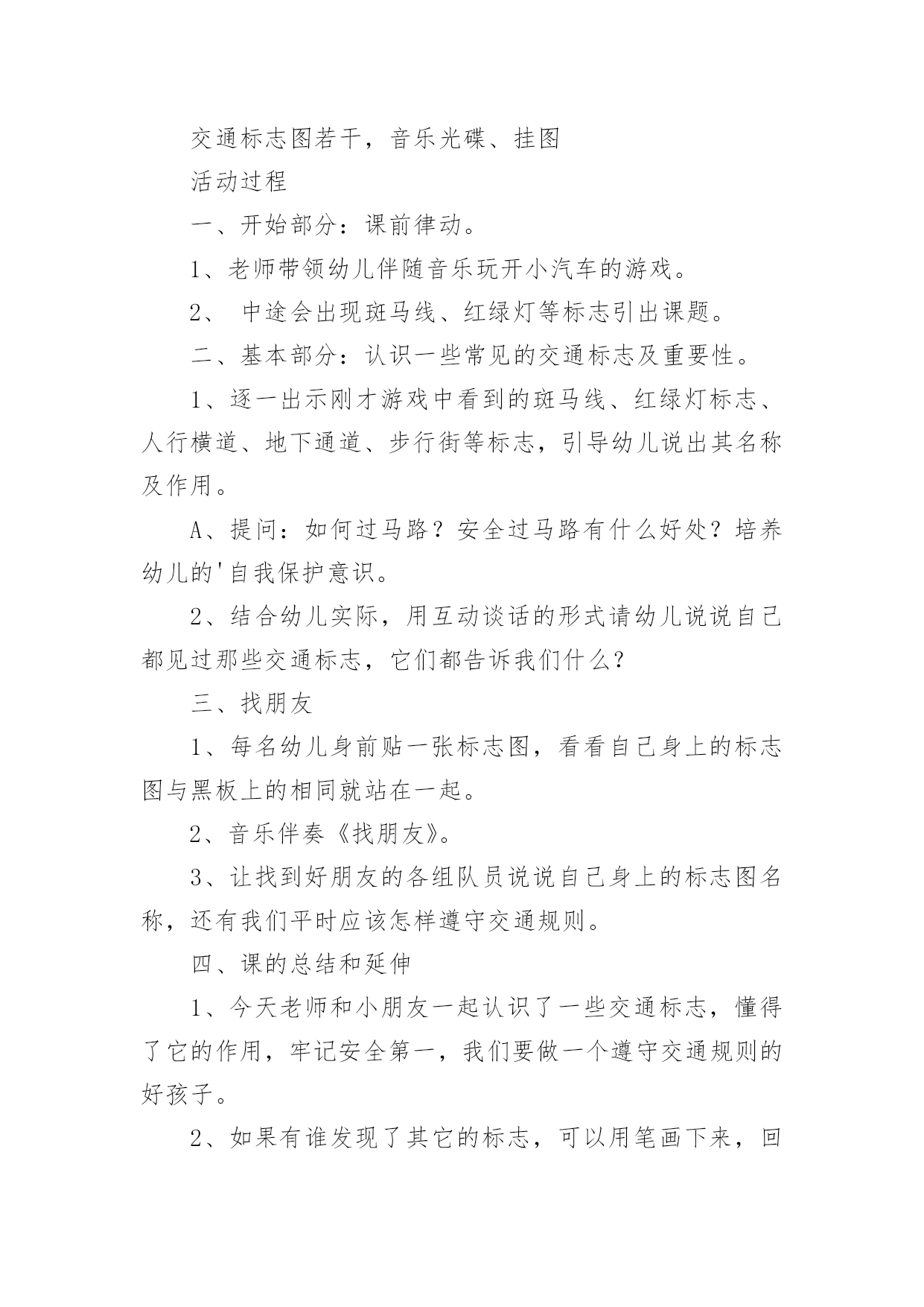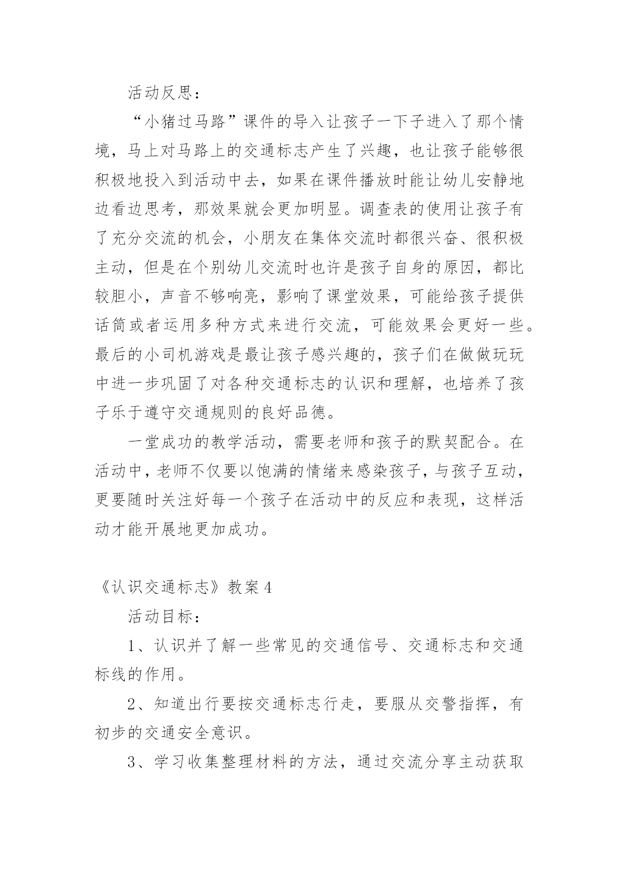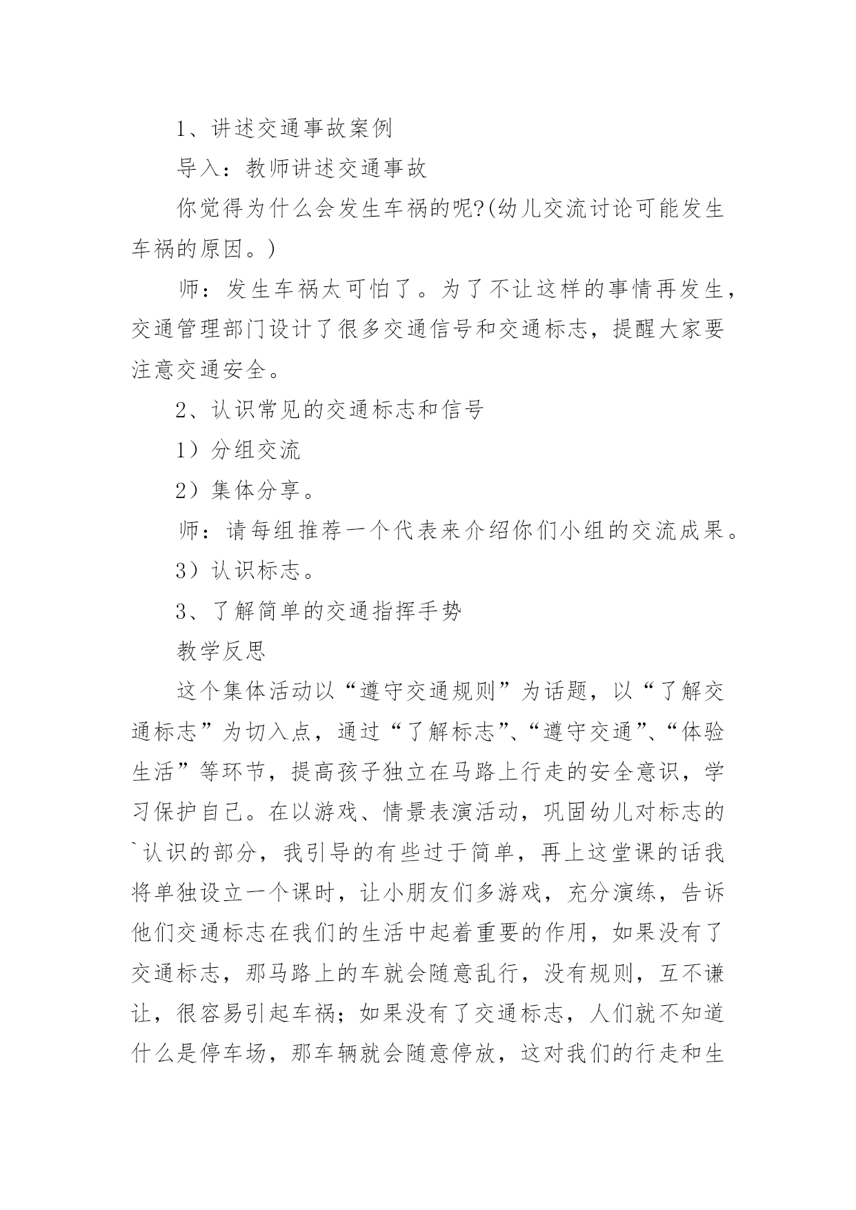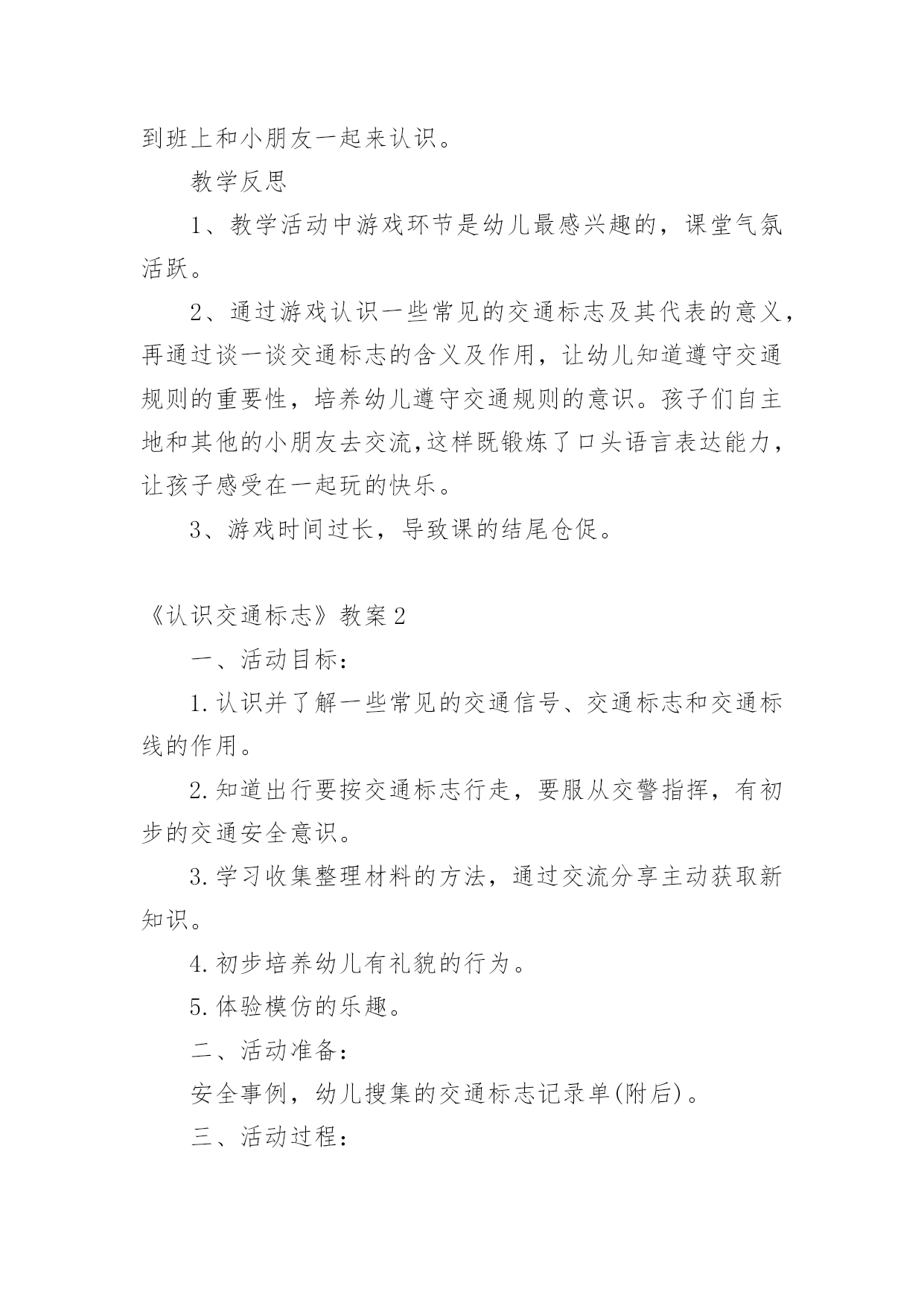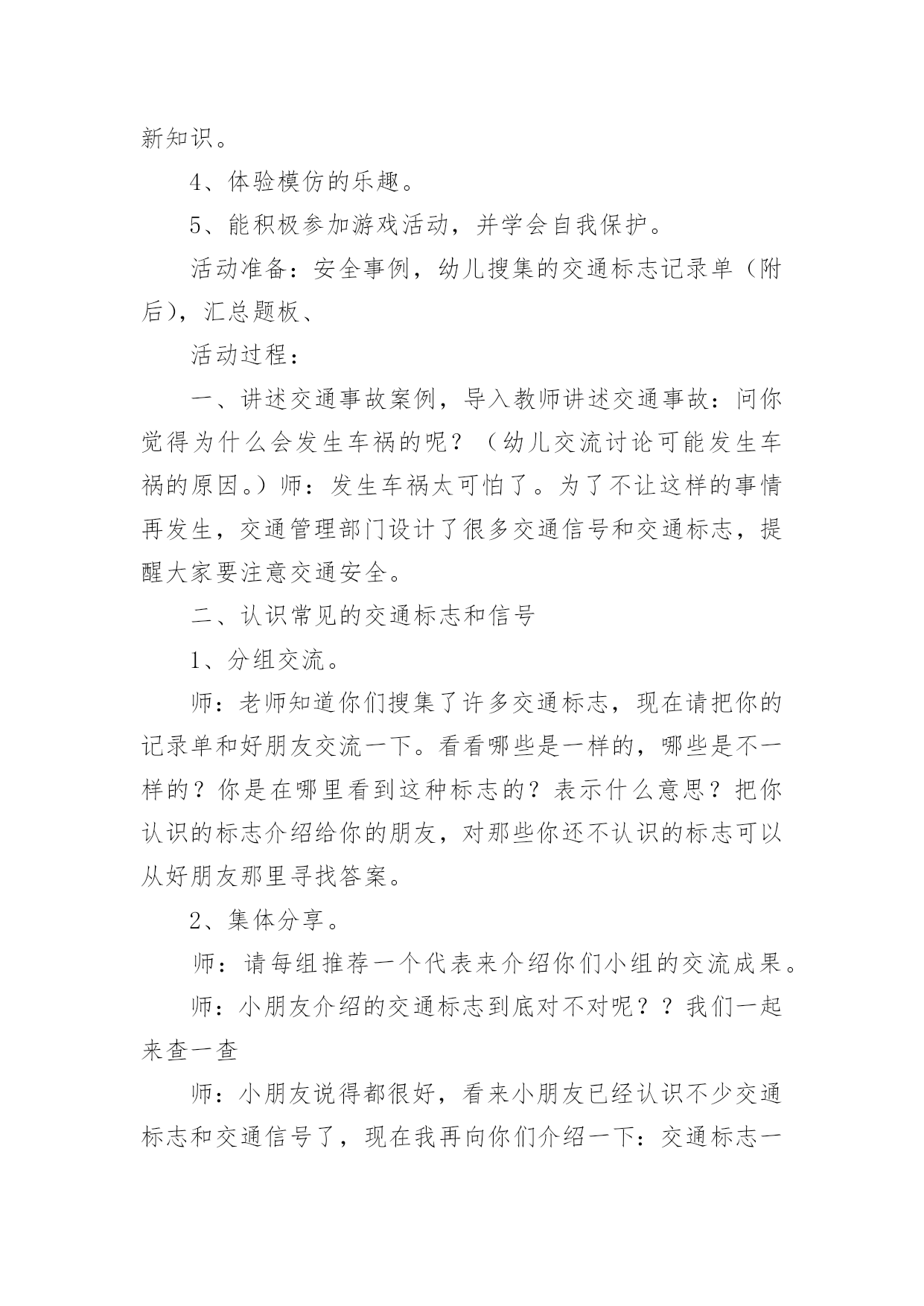 《认识交通标志》教案作为一名教学工作者,通常需要用到教案来辅助教学,教案有助于顺利而有效地开展教学活动。那么写教案需要注意哪些问题呢?下面是小编为大家整理的《认识交通标志》教案,欢迎阅读,希望大家能够喜欢。《认识交通标志》教案1活动设计背景幼儿年龄小,活泼好动,有必要进行安全常识的学习,特别是马路上的交通安全,所以设计了本节教学活动,让幼儿对交通标志有所认识,并按标志行动。活动目标1、教育幼儿走在马路上要注意安全,初步培养幼儿的自我保护意识。2、幼儿能认识简单的交通标记并了解安全通过马路应遵守的交通规则。3、鼓励幼儿大胆表述自己的想法,并能与同伴进行合作学习。4、遵守社会交通规则,不做“禁止”的事。5、培养幼儿敏锐的观察能力。教学重点、难点能认识几种交通标志,知道标志的作用和特征。活动准备交通标志图若干,音乐光碟、挂图活动过程一、开始部分:课前律动。1、老师带领幼儿伴随音乐玩开小汽车的游戏。2、中途会出现斑马线、红绿灯等标志引出课题。二、基本部分:认识一些常见的交通标志及重要性。1、逐一出示刚才游戏中看到的斑马线、红绿灯标志、人行横道、地下通道、步行街等标志,引导幼儿说出其名称及作用。A、提问:如何过马路?安全过马路有什么好处?培养幼儿的'自我保护意识。2、结合幼儿实际,用互动谈话的形式请幼儿说说自己都见过那些交通标志,它们都告诉我们什么?三、找朋友1、每名幼儿身前贴一张标志图,看看自己身上的标志图与黑板上的相同就站在一起。2、音乐伴奏《找朋友》。3、让找到好朋友的各组队员说说自己身上的标志图名称,还有我们平时应该怎样遵守交通规则。四、课的总结和延伸1、今天老师和小朋友一起认识了一些交通标志,懂得了它的作用,牢记安全第一,我们要做一个遵守交通规则的好孩子。2、如果有谁发现了其它的标志,可以用笔画下来,回到班上和小朋友一起来认识。教学反思1、教学活动中游戏环节是幼儿最感兴趣的,课堂气氛活跃。2、通过游戏认识一些常见的交通标志及其代表的意义,再通过谈一谈交通标志的含义及作用,让幼儿知道遵守交通规则的重要性,培养幼儿遵守交通规则的意识。孩子们自主地和其他的小朋友去交流,这样既锻炼了口头语言表达能力,让孩子感受在一起玩的快乐。3、游戏时间过长,导致课的结尾仓促。《认识交通标志》教案2一、活动目标:1.认识并了解一些常见的交通信号、交通标志和交通标线的作用。2.知道出行要按交通标志行走,要服从交警指挥,有初步的交通安全意识。3.学习收集整理材料的方法,通过交流分享主动获取新知识。4.初步培养幼儿有礼貌的行为。5.体验模仿的乐趣。二、活动准备:安全事例,幼儿搜集的交通标志记录单(附后)。三、活动过程:1、讲述交通事故案例导入:教师讲述交通事故你觉得为什么会发生车祸的呢?(幼儿交流讨论可能发生车祸的原因。)师:发生车祸太可怕了。为了不让这样的事情再发生,交通管理部门设计了很多交通信号和交通标志,提醒大家要注意交通安全。2、认识常见的交通标志和信号1)分组交流2)集体分享。师:请每组推荐一个代表来介绍你们小组的交流成果。3)认识标志。3、了解简单的交通指挥手势教学反思这个集体活动以“遵守交通规则”为话题,以“了解交通标志”为切入点,通过“了解标志”、“遵守交通”、“体验生活”等环节,提高孩子独立在马路上行走的安全意识,学习保护自己。在以游戏、情景表演活动,巩固幼儿对标志的`认识的部分,我引导的有些过于简单,再上这堂课的话我将单独设立一个课时,让小朋友们多游戏,充分演练,告诉他们交通标志在我们的生活中起着重要的作用,如果没有了交通标志,那马路上的车就会随意乱行,没有规则,互不谦让,很容易引起车祸;如果没有了交通标志,人们就不知道什么是停车场,那车辆就会随意停放,这对我们的行走和生活都会造成很大的影响;如果没有了交通标志,上班的时候马路就会混乱,这样会影响人们的工作的等等,所以我们可以看出交通标志是社会生活环境中不可缺少的一种符号;我们都应该认真的去执行这些交通标志所表达的含义,做一名优秀的交通小标兵。《认识交通标志》教案3设计理念:标志作为一种图形符号,以它简单性、形象性、直观性、知识性、实用性等特点被现代人所广泛应用,各种环保标志、交通标志和安全标志与幼儿的生活密切相关。新《纲要》中提到:“应培养幼儿对生活中常见的简单标志和文字符号的兴趣”。可见,让幼儿掌握生活中一些常见的标志和含义,有着极其重要的教育意义。随着生活水平的不断提高,交通也是越来越发达,但随之而来的交通事故也越来越多了。中班的孩子虽然年龄小,但好奇心强,然而由于生活经验的缺乏,缺少积极的自我保护的能力和技巧,因而在日常生活中常常会有一些意外事故的发生。“安全无小事,责任重泰山”,为保证孩子的健康和安全,防止意外伤害的发生,我们对幼儿加强了安全教育的培养。在这个活动中,我从众