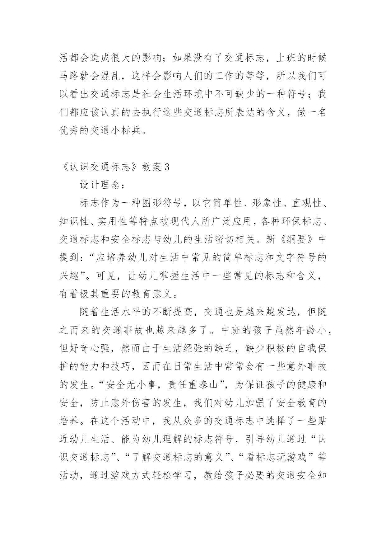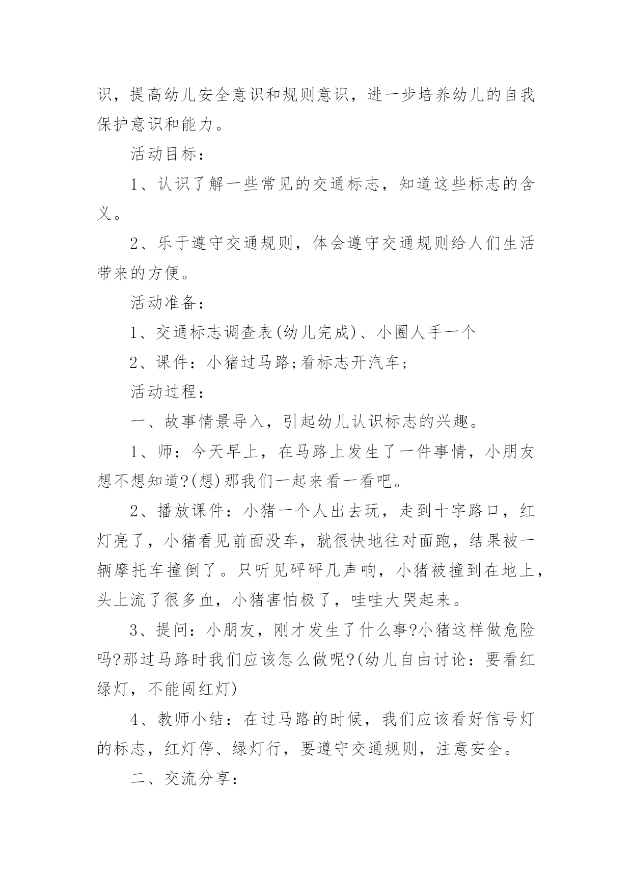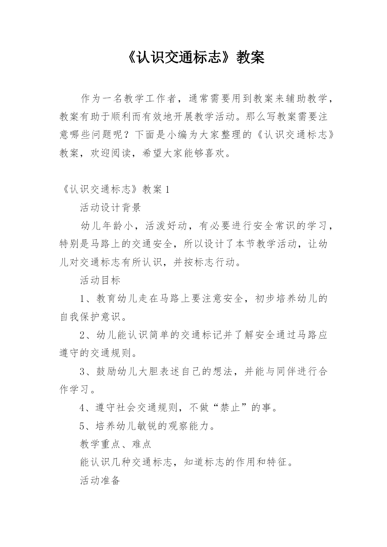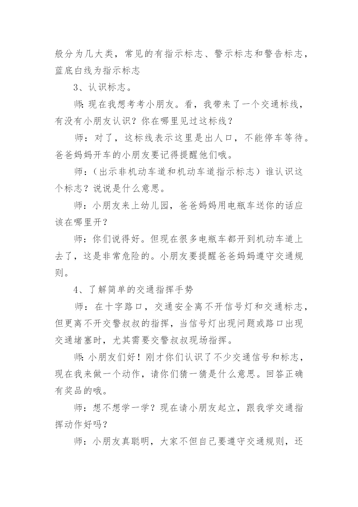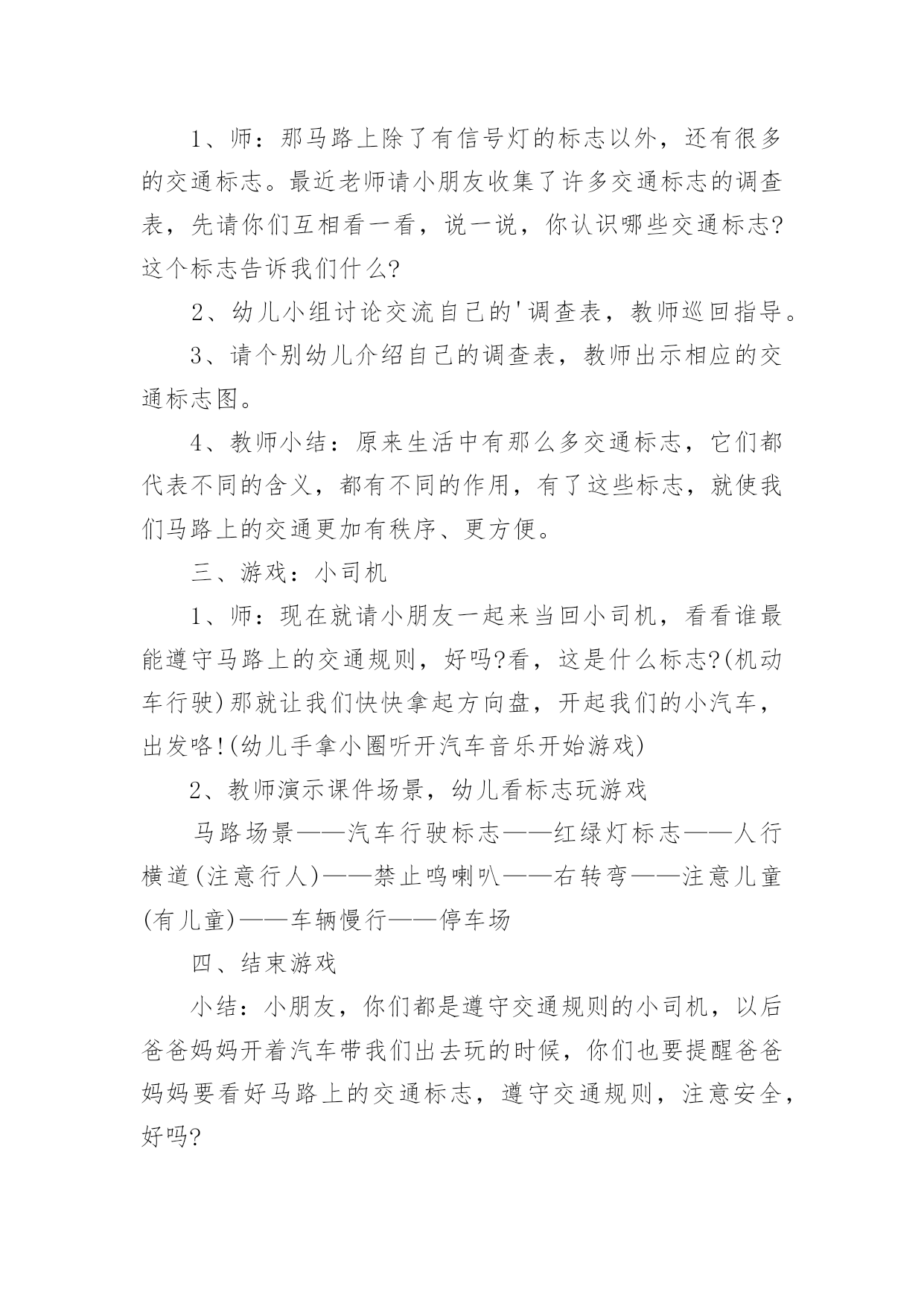 《认识交通标志》教案作为一名教学工作者,通常需要用到教案来辅助教学,教案有助于顺利而有效地开展教学活动。那么写教案需要注意哪些问题呢?下面是小编为大家整理的《认识交通标志》教案,欢迎阅读,希望大家能够喜欢。《认识交通标志》教案1活动设计背景幼儿年龄小,活泼好动,有必要进行安全常识的学习,特别是马路上的交通安全,所以设计了本节教学活动,让幼儿对交通标志有所认识,并按标志行动。活动目标1、教育幼儿走在马路上要注意安全,初步培养幼儿的自我保护意识。2、幼儿能认识简单的交通标记并了解安全通过马路应遵守的交通规则。3、鼓励幼儿大胆表述自己的想法,并能与同伴进行合作学习。4、遵守社会交通规则,不做“禁止”的事。5、培养幼儿敏锐的观察能力。教学重点、难点能认识几种交通标志,知道标志的作用和特征。活动准备交通标志图若干,音乐光碟、挂图活动过程一、开始部分:课前律动。1、老师带领幼儿伴随音乐玩开小汽车的游戏。2、中途会出现斑马线、红绿灯等标志引出课题。二、基本部分:认识一些常见的交通标志及重要性。1、逐一出示刚才游戏中看到的斑马线、红绿灯标志、人行横道、地下通道、步行街等标志,引导幼儿说出其名称及作用。A、提问:如何过马路?安全过马路有什么好处?培养幼儿的'自我保护意识。2、结合幼儿实际,用互动谈话的形式请幼儿说说自己都见过那些交通标志,它们都告诉我们什么?三、找朋友1、每名幼儿身前贴一张标志图,看看自己身上的标志图与黑板上的相同就站在一起。2、音乐伴奏《找朋友》。3、让找到好朋友的各组队员说说自己身上的标志图名称,还有我们平时应该怎样遵守交通规则。四、课的总结和延伸1、今天老师和小朋友一起认识了一些交通标志,懂得了它的作用,牢记安全第一,我们要做一个遵守交通规则的好孩子。2、如果有谁发现了其它的标志,可以用笔画下来,回到班上和小朋友一起来认识。教学反思1、教学活动中游戏环节是幼儿最感兴趣的,课堂气氛活跃。2、通过游戏认识一些常见的交通标志及其代表的意义,再通过谈一谈交通标志的含义及作用,让幼儿知道遵守交通规则的重要性,培养幼儿遵守交通规则的意识。孩子们自主地和其他的小朋友去交流,这样既锻炼了口头语言表达能力,让孩子感受在一起玩的快乐。3、游戏时间过长,导致课的结尾仓促。《认识交通标志》教案2一、活动目标:1.认识并了解一些常见的交通信号、交通标志和交通标线的作用。2.知道出行要按交通标志行走,要服从交警指挥,有初步的交通安全意识。3.学习收集整理材料的方法,通过交流分享主动获取新知识。4.初步培养幼儿有礼貌的行为。5.体验模仿的乐趣。二、活动准备:安全事例,幼儿搜集的交通标志记录单(附后)。三、活动过程:1、讲述交通事故案例导入:教师讲述交通事故你觉得为什么会发生车祸的呢?(幼儿交流讨论可能发生车祸的原因。)师:发生车祸太可怕了。为了不让这样的事情再发生,交通管理部门设计了很多交通信号和交通标志,提醒大家要注意交通安全。2、认识常见的交通标志和信号1)分组交流2)集体分享。师:请每组推荐一个代表来介绍你们小组的交流成果。3)认识标志。3、了解简单的交通指挥手势教学反思这个集体活动以“遵守交通规则”为话题,以“了解交通标志”为切入点,通过“了解标志”、“遵守交通”、“体验生活”等环节,提高孩子独立在马路上行走的安全意识,学习保护自己。在以游戏、情景表演活动,巩固幼儿对标志的`认识的部分,我引导的有些过于简单,再上这堂课的话我将单独设立一个课时,让小朋友们多游戏,充分演练,告诉他们交通标志在我们的生活中起着重要的作用,如果没有了交通标志,那马路上的车就会随意乱行,没有规则,互不谦让,很容易引起车祸;如果没有了交通标志,人们就不知道什么是停车场,那车辆就会随意停放,这对我们的行走和生活都会造成很大的影响;如果没有了交通标志,上班的时候马路就会混乱,这样会影响人们的工作的等等,所以我们可以看出交通标志是社会生活环境中不可缺少的一种符号;我们都应该认真的去执行这些交通标志所表达的含义,做一名优秀的交通小标兵。《认识交通标志》教案3设计理念:标志作为一种图形符号,以它简单性、形象性、直观性、知识性、实用性等特点被现代人所广泛应用,各种环保标志、交通标志和安全标志与幼儿的生活密切相关。新《纲要》中提到:“应培养幼儿对生活中常见的简单标志和文字符号的兴趣”。可见,让幼儿掌握生活中一些常见的标志和含义,有着极其重要的教育意义。随着生活水平的不断提高,交通也是越来越发达,但随之而来的交通事故也越来越多了。中班的孩子虽然年龄小,但好奇心强,然而由于生活经验的缺乏,缺少积极的自我保护的能力和技巧,因而在日常生活中常常会有一些意外事故的发生。“安全无小事,责任重泰山”,为保证孩子的健康和安全,防止意外伤害的发生,我们对幼儿加强了安全教育的培养。在这个活动中,我从众