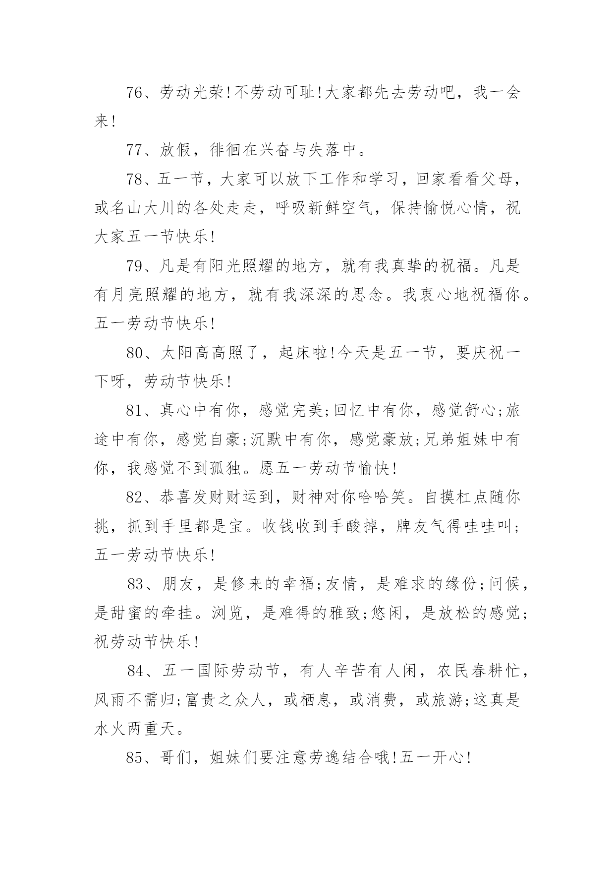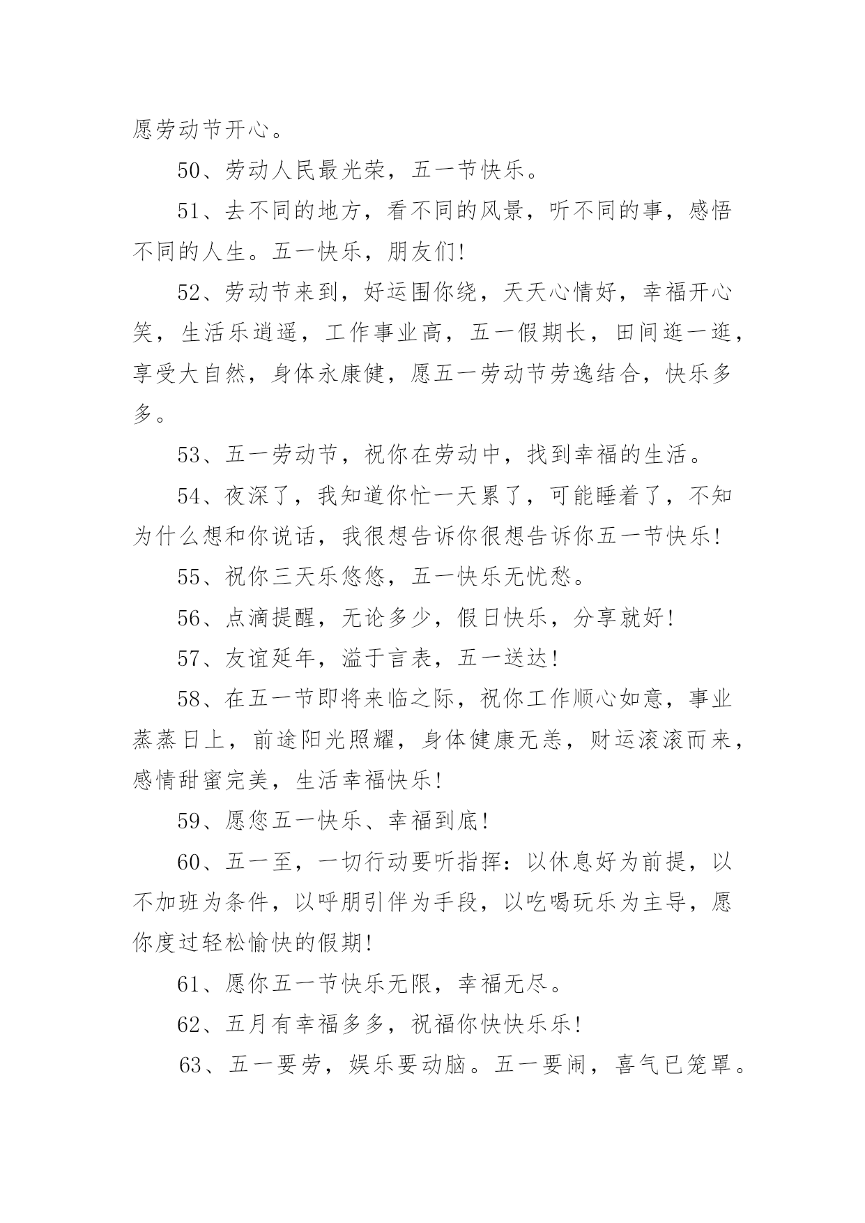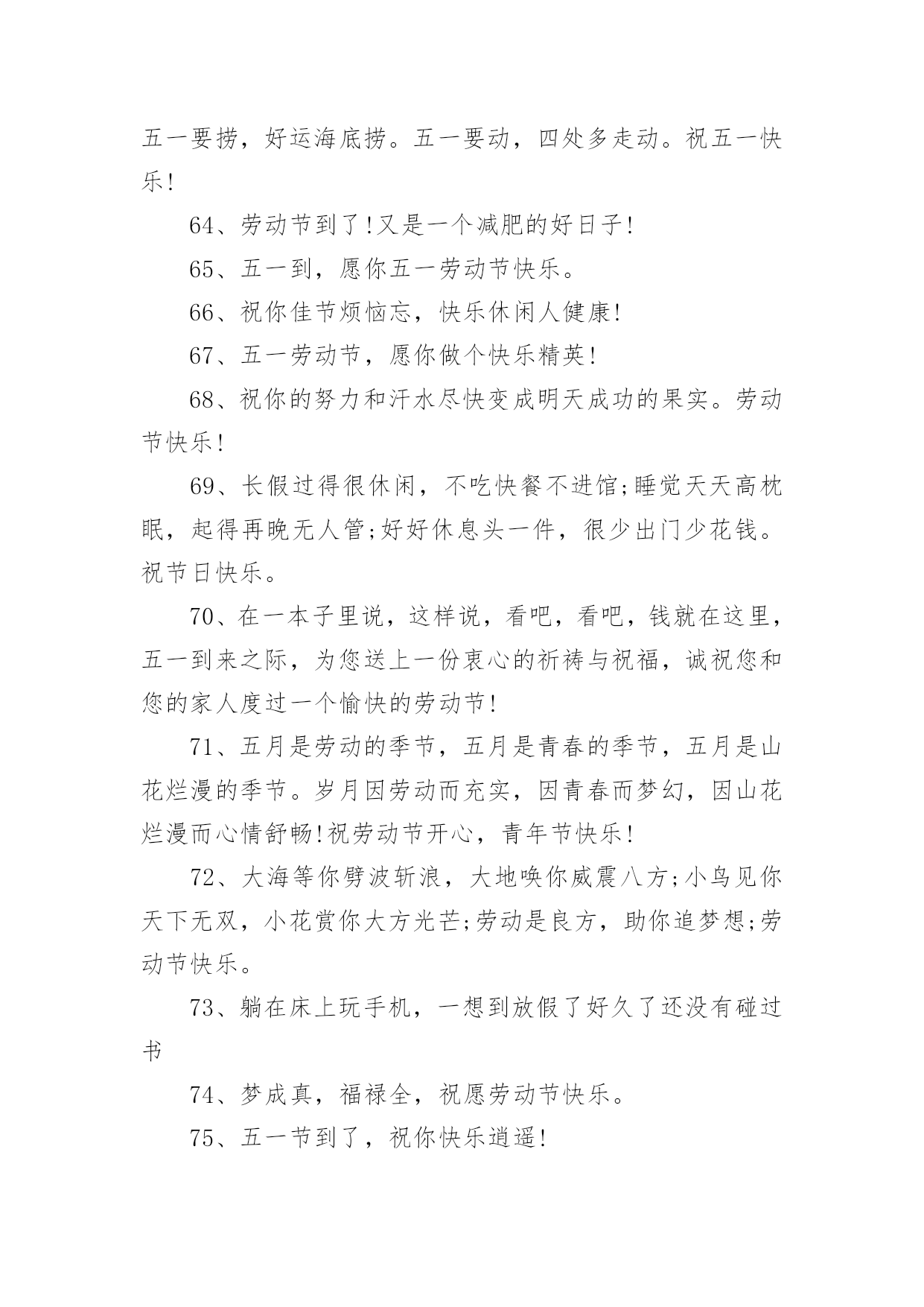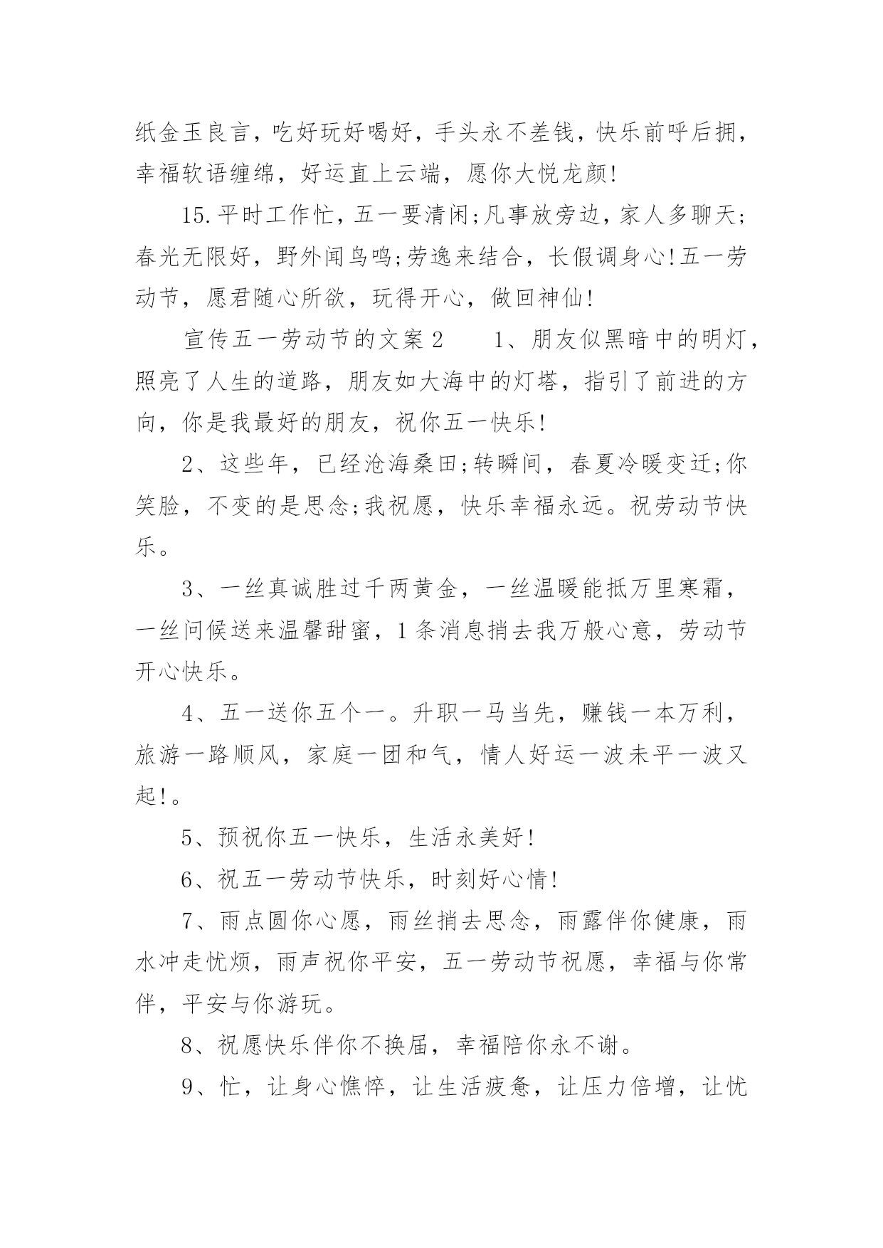 宣传五一劳动节的文案宣传五一劳动节的文案随着在线社交网络的爆炸式增长,越来越多人习惯于在朋友圈发布文案,文案用于分享快乐,宣泄伤感。朋友圈发什么样的文案才受欢迎呢?下面是小编精心整理的宣传五一劳动节的文案,希望能够帮助到大家。宣传五一劳动节的文案11.愿年年有今日,岁岁有今朝;月月涨工资,周周中彩票,天天好心情,日日好运到,白天遇财神,晚上数钞票。五一劳动节快乐!2.我愿我的祝福是小溪,悄悄地流淌在兄弟姐妹的心上,绵绵不绝;我愿我的关怀是枫叶,轻轻地摇着秋日的气息,吹送兄弟姐妹们的问候,五一快乐!3.好久不见,十分想念。在这漫漫的五一长假里,常常忆起共处的岁月。找点时间,约个地点,带上祝福,来个非常体验!劳动节快乐!4.阳光洒满了你前进的道路,愿花儿开满你生活的旅途,愿我最真诚的祝福,带给你无尽的喜悦,愿你每一个这天都过得幸福,祝你劳动节快乐!5.五一到来之际,为您送上一份忠心的祝福:诚祝您与您的家人度过一个痛快的节日!男人劳动养女人,女人劳动养男人,老子劳动养儿子,儿子劳动养孙子,所以社会发展了。6.五一劳动节,祝福送给你,祝你快乐无限,好运无限,健康无限,成功无限,幸福无限,一生好运紧相伴!7.花瓣飘落是想跟风起舞,黄叶飘零是想春风来度,咖啡变浓是因牵挂的苦,流行陨落是因我的许愿化作祝福。劳动节了,对你说声:劳必有获,你一定会幸福!8.天色变得真快,出门留意防晒,睡觉被子要盖,多吃生果蔬菜,好好保持心态,这样才会可爱,你好我才痛快。祝劳动节痛快。9.窗外春光明媚,风儿令花陶醉,五一祝福要传递:一祝健康身体好,二祝快乐没烦恼,三祝升职步步高,四祝发财变阔佬,五祝好运跟你跑。祝福已经发送!10.劳动健身、劳动致富、劳动快乐、劳动幸福、劳动光荣、劳动万岁。愿你我用辛勤的劳动创造事业辉煌,给自己和最亲爱的人以幸福。五一劳动节快乐!11.朋友就是身边的'那份充实,是情感上的思念,是忍不住想拨的号码,是深夜想喝的那杯清茶,是悠闲时梦见的身影,是忙碌时忘不了的牵挂!祝你劳动节快乐!12.劳动是姐姐,享受是妹妹,种子是收获,工具是勤劳,只有通过辛勤的劳动,才能使种子发芽、花儿开放、带来收获、获得幸福、得到享受。祝劳动节快乐!13.褪去你疲惫的外衣,抖去你奔波的尘埃,卸下你心头的倦意,到友情的天空下沐浴,洗去你点点的忧愁,只愿在五一劳动节送你最真祝福,愿你五一心欢喜!14.五一就在眼前,不禁满心喜欢,火速修书一封,满纸金玉良言,吃好玩好喝好,手头永不差钱,快乐前呼后拥,幸福软语缠绵,好运直上云端,愿你大悦龙颜!15.平时工作忙,五一要清闲;凡事放旁边,家人多聊天;春光无限好,野外闻鸟鸣;劳逸来结合,长假调身心!五一劳动节,愿君随心所欲,玩得开心,做回神仙!宣传五一劳动节的文案21、朋友似黑暗中的明灯,照亮了人生的道路,朋友如大海中的灯塔,指引了前进的方向,你是我最好的朋友,祝你五一快乐!2、这些年,已经沧海桑田;转瞬间,春夏冷暖变迁;你笑脸,不变的是思念;我祝愿,快乐幸福永远。祝劳动节快乐。3、一丝真诚胜过千两黄金,一丝温暖能抵万里寒霜,一丝问候送来温馨甜蜜,1条消息捎去我万般心意,劳动节开心快乐。4、五一送你五个一。升职一马当先,赚钱一本万利,旅游一路顺风,家庭一团和气,情人好运一波未平一波又起!。5、预祝你五一快乐,生活永美好!6、祝五一劳动节快乐,时刻好心情!7、雨点圆你心愿,雨丝捎去思念,雨露伴你健康,雨水冲走忧烦,雨声祝你平安,五一劳动节祝愿,幸福与你常伴,平安与你游玩。8、祝愿快乐伴你不换届,幸福陪你永不谢。9、忙,让身心憔悴,让生活疲惫,让压力倍增,让忧烦加剧。恰巧五一劳动节到了,幸福快乐委员会特准你几天假,愿你梳理身心,尽情放松;抛忧忘烦,尽情HAPPY!10、五一节,问候中有祝愿,祝你每天快乐多一点!11、雨声祝你平安,雨水冲走麻烦,雨丝捎去思念,雨花飞落心弦,雨点圆你心愿,雨露润你心田。愿幸福与你常相伴。祝劳动节愉快。12、五一是劳动节,有没有人要和我一起去劳动啊!13、今天虽然是劳动节,但也要多多注意休息,保持身体健康。祝节日快乐,生意兴隆!14、放假了才发现,只有爱你的人才会和你保持联系。15、五一到,愿你有个快乐的心情。16、拥有你,天天都是情人节!拥有我,天天都是劳动节!我们两个在一起,天天都会是狂欢节!17、你是我的巧克力,我是你的朱古力,见到你啊多美丽,想你想到浑身无力。五一佳节,盼望与你相聚!18、劳动节里,朋友情谊,记在心里!19、愿您五一快乐、幸福到底。20、亲爱的,你日夜操劳家务终于令我感到过意不去,为了今后能够继续心安理得地享受你的服务,只好忍痛决定:这个五一任你处置!21、转一转,悠一悠,生活美丽乐逍遥!22、五一到,送你人间五月芬芳。23、朋友似黑暗中的明灯,照亮了人生的道路,朋友如大海中的