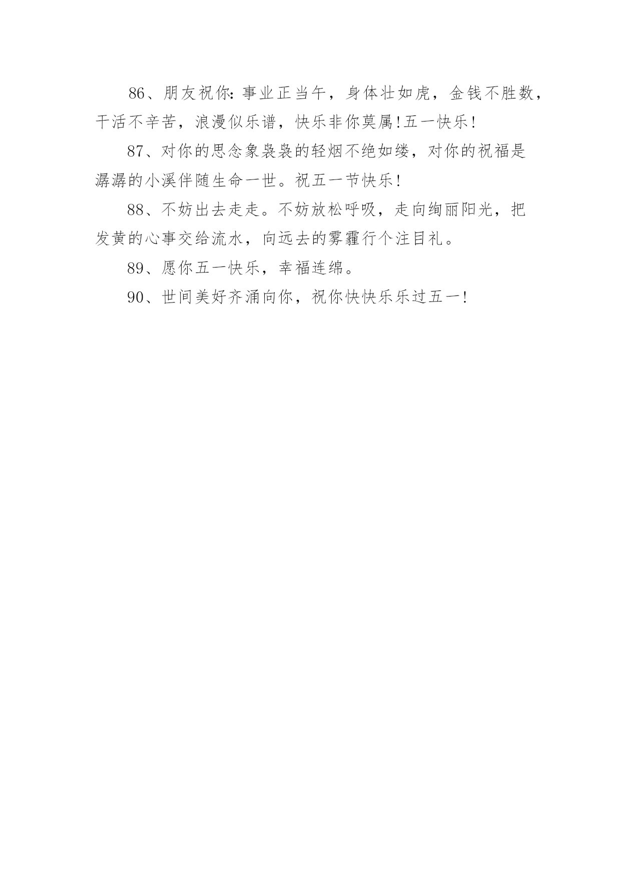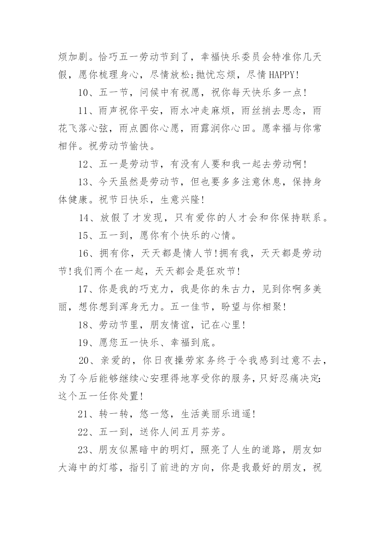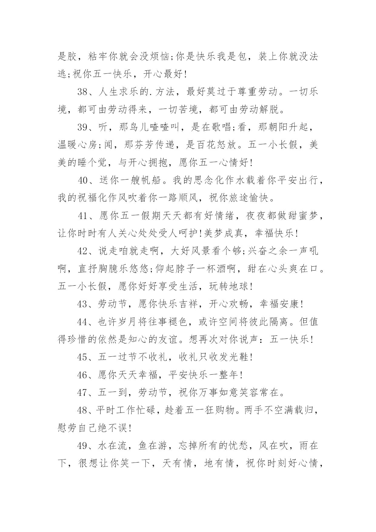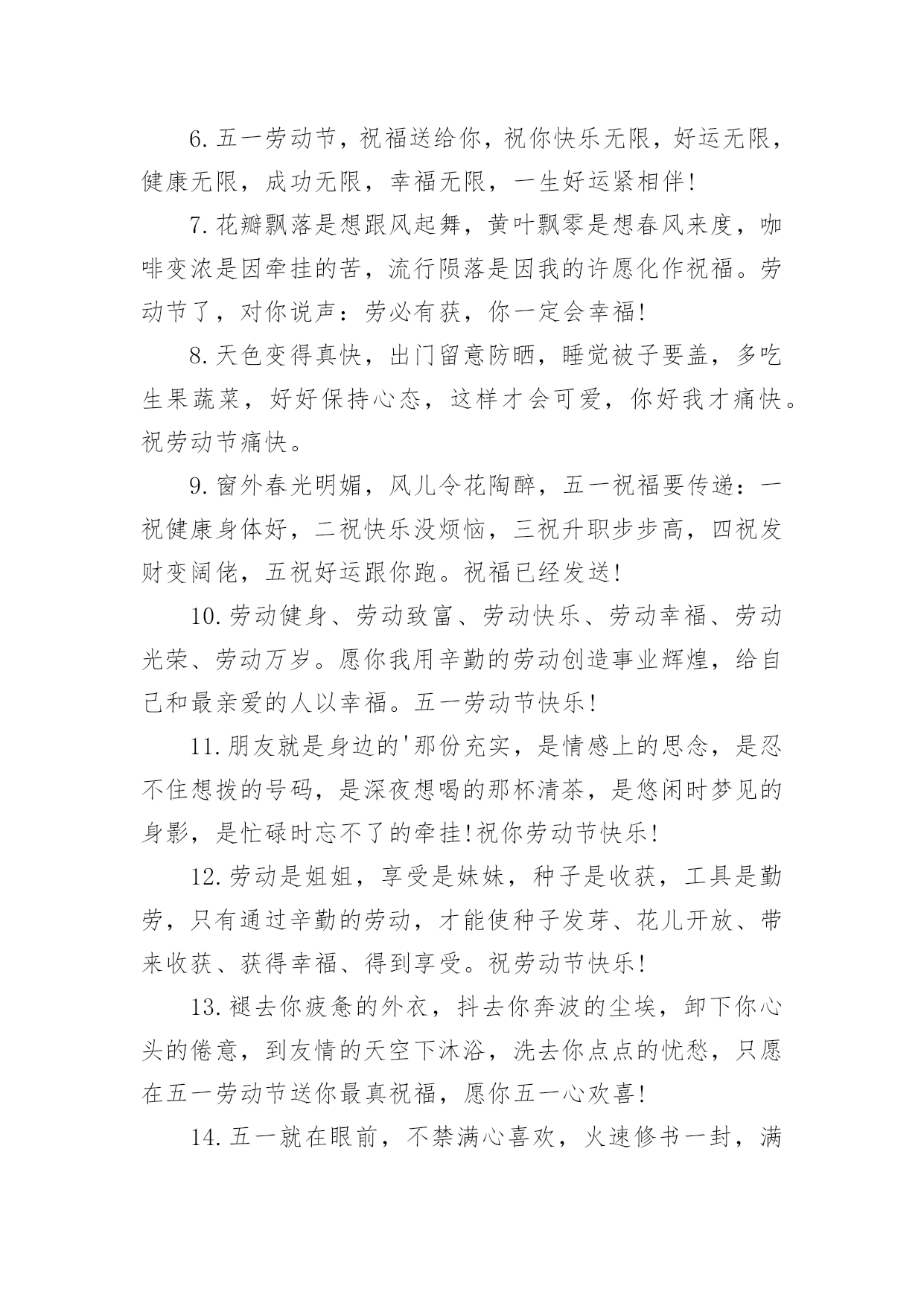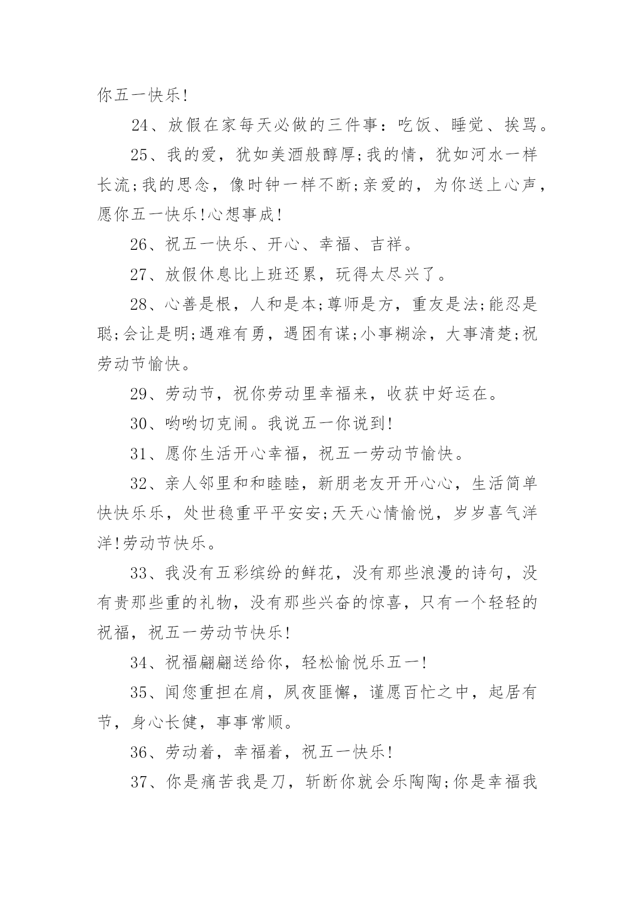 宣传五一劳动节的文案宣传五一劳动节的文案随着在线社交网络的爆炸式增长,越来越多人习惯于在朋友圈发布文案,文案用于分享快乐,宣泄伤感。朋友圈发什么样的文案才受欢迎呢?下面是小编精心整理的宣传五一劳动节的文案,希望能够帮助到大家。宣传五一劳动节的文案11.愿年年有今日,岁岁有今朝;月月涨工资,周周中彩票,天天好心情,日日好运到,白天遇财神,晚上数钞票。五一劳动节快乐!2.我愿我的祝福是小溪,悄悄地流淌在兄弟姐妹的心上,绵绵不绝;我愿我的关怀是枫叶,轻轻地摇着秋日的气息,吹送兄弟姐妹们的问候,五一快乐!3.好久不见,十分想念。在这漫漫的五一长假里,常常忆起共处的岁月。找点时间,约个地点,带上祝福,来个非常体验!劳动节快乐!4.阳光洒满了你前进的道路,愿花儿开满你生活的旅途,愿我最真诚的祝福,带给你无尽的喜悦,愿你每一个这天都过得幸福,祝你劳动节快乐!5.五一到来之际,为您送上一份忠心的祝福:诚祝您与您的家人度过一个痛快的节日!男人劳动养女人,女人劳动养男人,老子劳动养儿子,儿子劳动养孙子,所以社会发展了。6.五一劳动节,祝福送给你,祝你快乐无限,好运无限,健康无限,成功无限,幸福无限,一生好运紧相伴!7.花瓣飘落是想跟风起舞,黄叶飘零是想春风来度,咖啡变浓是因牵挂的苦,流行陨落是因我的许愿化作祝福。劳动节了,对你说声:劳必有获,你一定会幸福!8.天色变得真快,出门留意防晒,睡觉被子要盖,多吃生果蔬菜,好好保持心态,这样才会可爱,你好我才痛快。祝劳动节痛快。9.窗外春光明媚,风儿令花陶醉,五一祝福要传递:一祝健康身体好,二祝快乐没烦恼,三祝升职步步高,四祝发财变阔佬,五祝好运跟你跑。祝福已经发送!10.劳动健身、劳动致富、劳动快乐、劳动幸福、劳动光荣、劳动万岁。愿你我用辛勤的劳动创造事业辉煌,给自己和最亲爱的人以幸福。五一劳动节快乐!11.朋友就是身边的'那份充实,是情感上的思念,是忍不住想拨的号码,是深夜想喝的那杯清茶,是悠闲时梦见的身影,是忙碌时忘不了的牵挂!祝你劳动节快乐!12.劳动是姐姐,享受是妹妹,种子是收获,工具是勤劳,只有通过辛勤的劳动,才能使种子发芽、花儿开放、带来收获、获得幸福、得到享受。祝劳动节快乐!13.褪去你疲惫的外衣,抖去你奔波的尘埃,卸下你心头的倦意,到友情的天空下沐浴,洗去你点点的忧愁,只愿在五一劳动节送你最真祝福,愿你五一心欢喜!14.五一就在眼前,不禁满心喜欢,火速修书一封,满纸金玉良言,吃好玩好喝好,手头永不差钱,快乐前呼后拥,幸福软语缠绵,好运直上云端,愿你大悦龙颜!15.平时工作忙,五一要清闲;凡事放旁边,家人多聊天;春光无限好,野外闻鸟鸣;劳逸来结合,长假调身心!五一劳动节,愿君随心所欲,玩得开心,做回神仙!宣传五一劳动节的文案21、朋友似黑暗中的明灯,照亮了人生的道路,朋友如大海中的灯塔,指引了前进的方向,你是我最好的朋友,祝你五一快乐!2、这些年,已经沧海桑田;转瞬间,春夏冷暖变迁;你笑脸,不变的是思念;我祝愿,快乐幸福永远。祝劳动节快乐。3、一丝真诚胜过千两黄金,一丝温暖能抵万里寒霜,一丝问候送来温馨甜蜜,1条消息捎去我万般心意,劳动节开心快乐。4、五一送你五个一。升职一马当先,赚钱一本万利,旅游一路顺风,家庭一团和气,情人好运一波未平一波又起!。5、预祝你五一快乐,生活永美好!6、祝五一劳动节快乐,时刻好心情!7、雨点圆你心愿,雨丝捎去思念,雨露伴你健康,雨水冲走忧烦,雨声祝你平安,五一劳动节祝愿,幸福与你常伴,平安与你游玩。8、祝愿快乐伴你不换届,幸福陪你永不谢。9、忙,让身心憔悴,让生活疲惫,让压力倍增,让忧烦加剧。恰巧五一劳动节到了,幸福快乐委员会特准你几天假,愿你梳理身心,尽情放松;抛忧忘烦,尽情HAPPY!10、五一节,问候中有祝愿,祝你每天快乐多一点!11、雨声祝你平安,雨水冲走麻烦,雨丝捎去思念,雨花飞落心弦,雨点圆你心愿,雨露润你心田。愿幸福与你常相伴。祝劳动节愉快。12、五一是劳动节,有没有人要和我一起去劳动啊!13、今天虽然是劳动节,但也要多多注意休息,保持身体健康。祝节日快乐,生意兴隆!14、放假了才发现,只有爱你的人才会和你保持联系。15、五一到,愿你有个快乐的心情。16、拥有你,天天都是情人节!拥有我,天天都是劳动节!我们两个在一起,天天都会是狂欢节!17、你是我的巧克力,我是你的朱古力,见到你啊多美丽,想你想到浑身无力。五一佳节,盼望与你相聚!18、劳动节里,朋友情谊,记在心里!19、愿您五一快乐、幸福到底。20、亲爱的,你日夜操劳家务终于令我感到过意不去,为了今后能够继续心安理得地享受你的服务,只好忍痛决定:这个五一任你处置!21、转一转,悠一悠,生活美丽乐逍遥!22、五一到,送你人间五月芬芳。23、朋友似黑暗中的明灯,照亮了人生的道路,朋友如大海中的