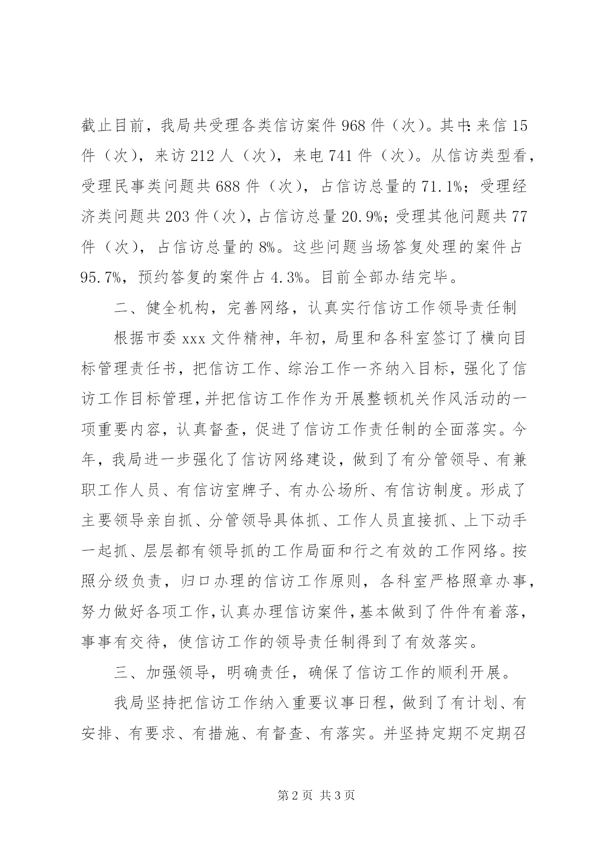 第PAGE\*Arabic\*MERGEFORMAT3页共NUMPAGES\*MERGEFORMAT3页司法局信访工作总结范文司法局信访工作总结xxx年,我局在市委、市政府的领导下,认真贯彻落实全市信访工作会议精神,紧紧围绕深化改革,加快发展,促进稳定这个大局,加强领导,强化措施,不断加大督查督办及落实力度,解决群众关心的热点、难点问题,处理了大批人民群众的来信来访,较好地完成了全年信访工作的各项任务,为推动我市两个文明建设做出了积极的贡献。一、认识到位,思想明确,各科室做好信访工作的主动性强为了把信访工作措施切实落到实处,及时化解各种矛盾,局党组坚持把信访工作摆在重要位置,贯彻落实******总书记三个代表的重要思想,结合开展整顿机关作风活动和党风廉政建设,在干部职工中大力提倡和发扬求真务实、艰苦奋斗、密切联系群众的作风,教育和引导广大干部职工从讲政治、讲稳定、讲大局和坚持党的群众路线的高度出发,充分认识新时期信访工作的重要性和紧迫性,正确处理改革、发展、稳定的关系,把信访工作作为促进全市民主法制建设和社会稳定的大事来抓,进一步提高了干部职工的思想认识,增强了大家全心全意为人民服务的自觉性。在实际工作中,局党组针对不同时期的信访形势和任务,结合业务工作,及时对各科室信访工作提出具体要求,有力地促进了全局信访工作的深入开展,及时妥善解决了大量的信访问题。截止目前,我局共受理各类信访案件968件(次)。其中:来信15件(次),来访212人(次),来电741件(次)。从信访类型看,受理民事类问题共688件(次),占信访总量的71.1%;受理经济类问题共203件(次),占信访总量20.9%;受理其他问题共77件(次),占信访总量的8%。这些问题当场答复处理的案件占95.7%,预约答复的案件占4.3%。目前全部办结完毕。二、健全机构,完善网络,认真实行信访工作领导责任制根据市委xxx文件精神,年初,局里和各科室签订了横向目标管理责任书,把信访工作、综治工作一齐纳入目标,强化了信访工作目标管理,并把信访工作作为开展整顿机关作风活动的一项重要内容,认真督查,促进了信访工作责任制的全面落实。今年,我局进一步强化了信访网络建设,做到了有分管领导、有兼职工作人员、有信访室牌子、有办公场所、有信访制度。形成了主要领导亲自抓、分管领导具体抓、工作人员直接抓、上下动手一起抓、层层都有领导抓的工作局面和行之有效的工作网络。按照分级负责,归口办理的信访工作原则,各科室严格照章办事,努力做好各项工作,认真办理信访案件,基本做到了件件有着落,事事有交待,使信访工作的领导责任制得到了有效落实。三、加强领导,明确责任,确保了信访工作的顺利开展。我局坚持把信访工作纳入重要议事日程,做到了有计划、有安排、有要求、有措施、有督查、有落实。并坚持定期不定期召开专题会议,听取信访工作汇报,分析信访形势,研究信访动态,排查不安定因素,有针对性地研究工作,探讨办法,有效地开展了信访工作。一是继续实行信访工作一把手负责制;二是进一步完善了信访案件回访制度和包案处理重要信访案件等制度;三是局领导经常亲自批办信访案件,对许多案件亲自主持协调处理,使一些疑难问题及时得到了解决。