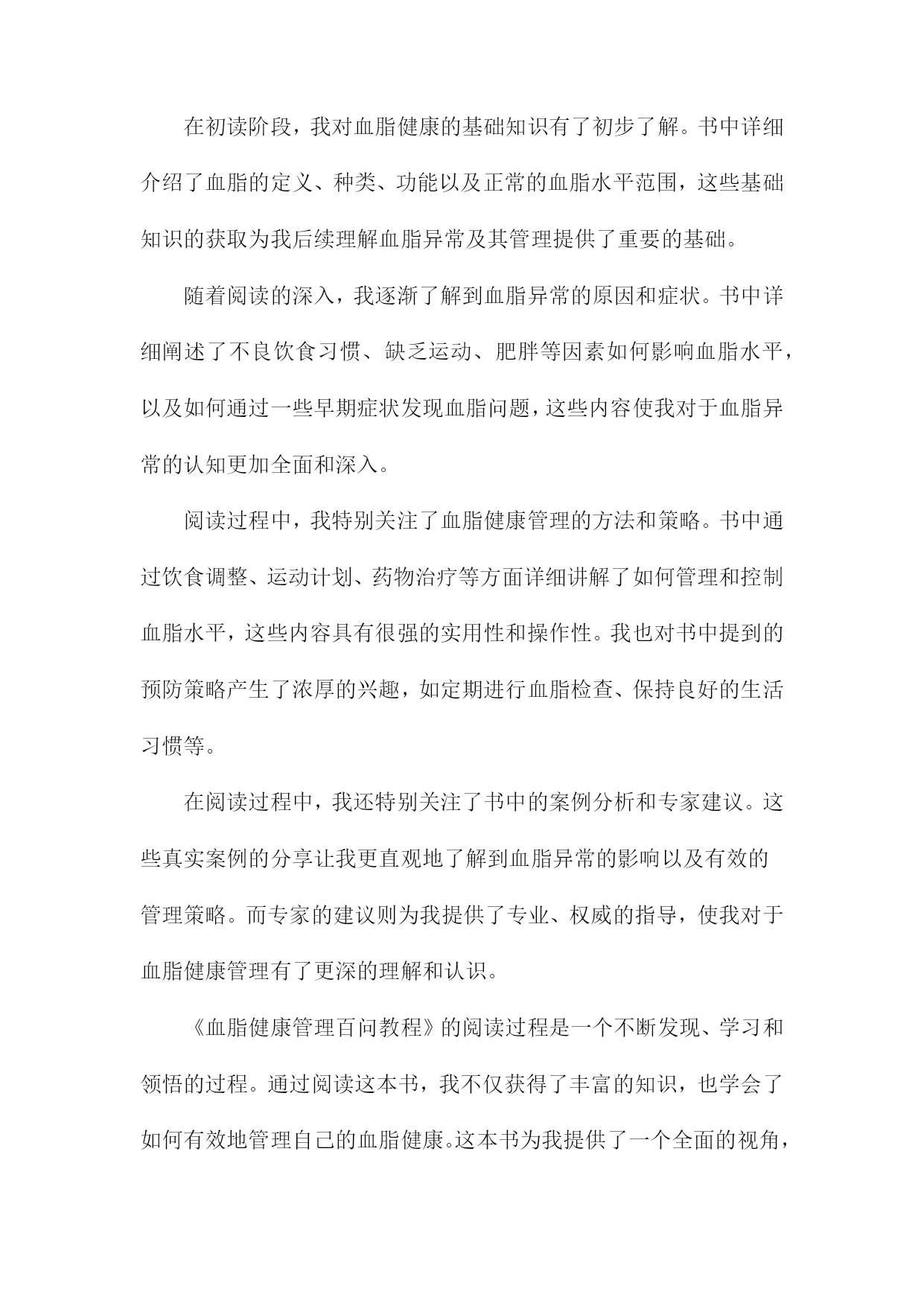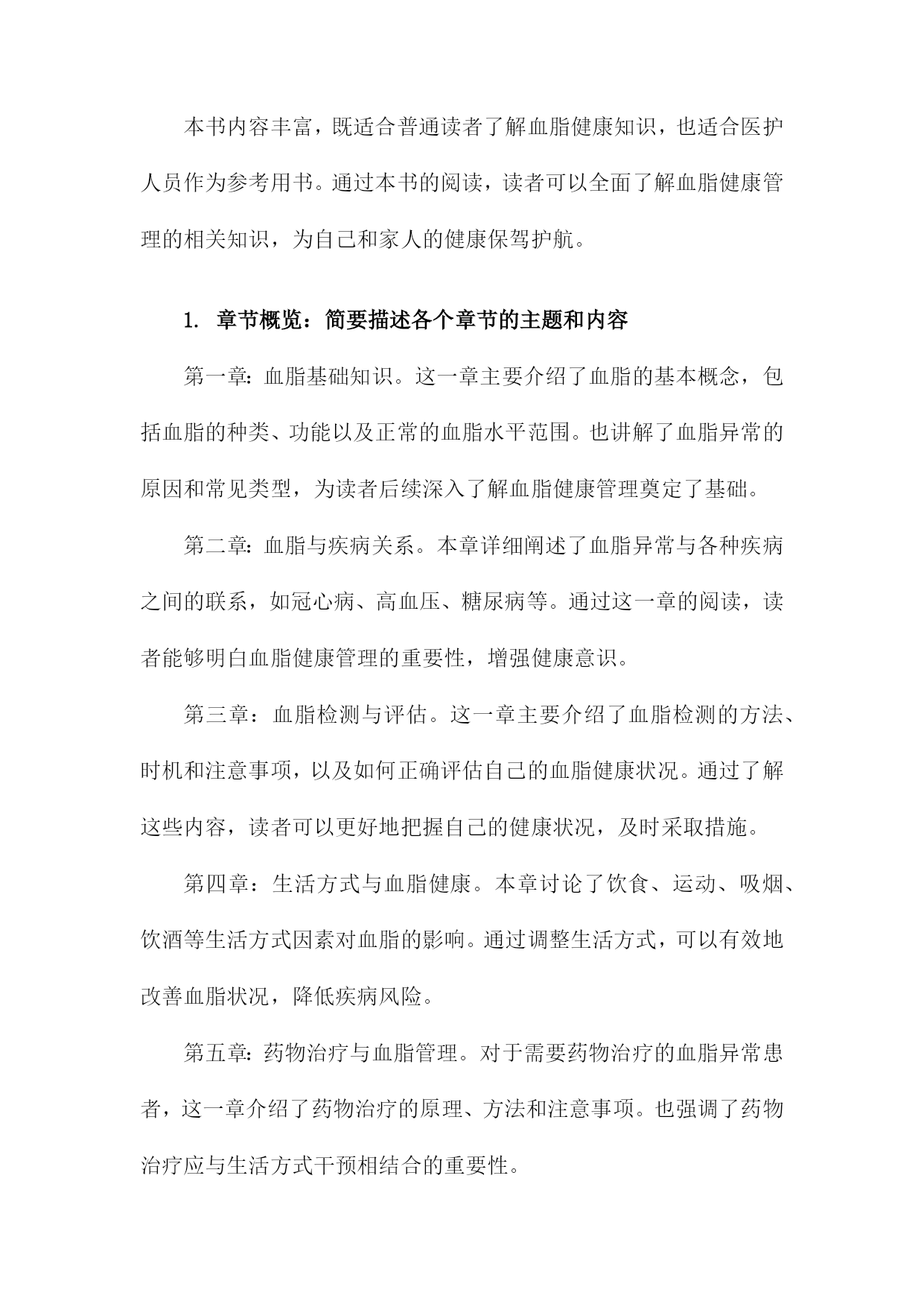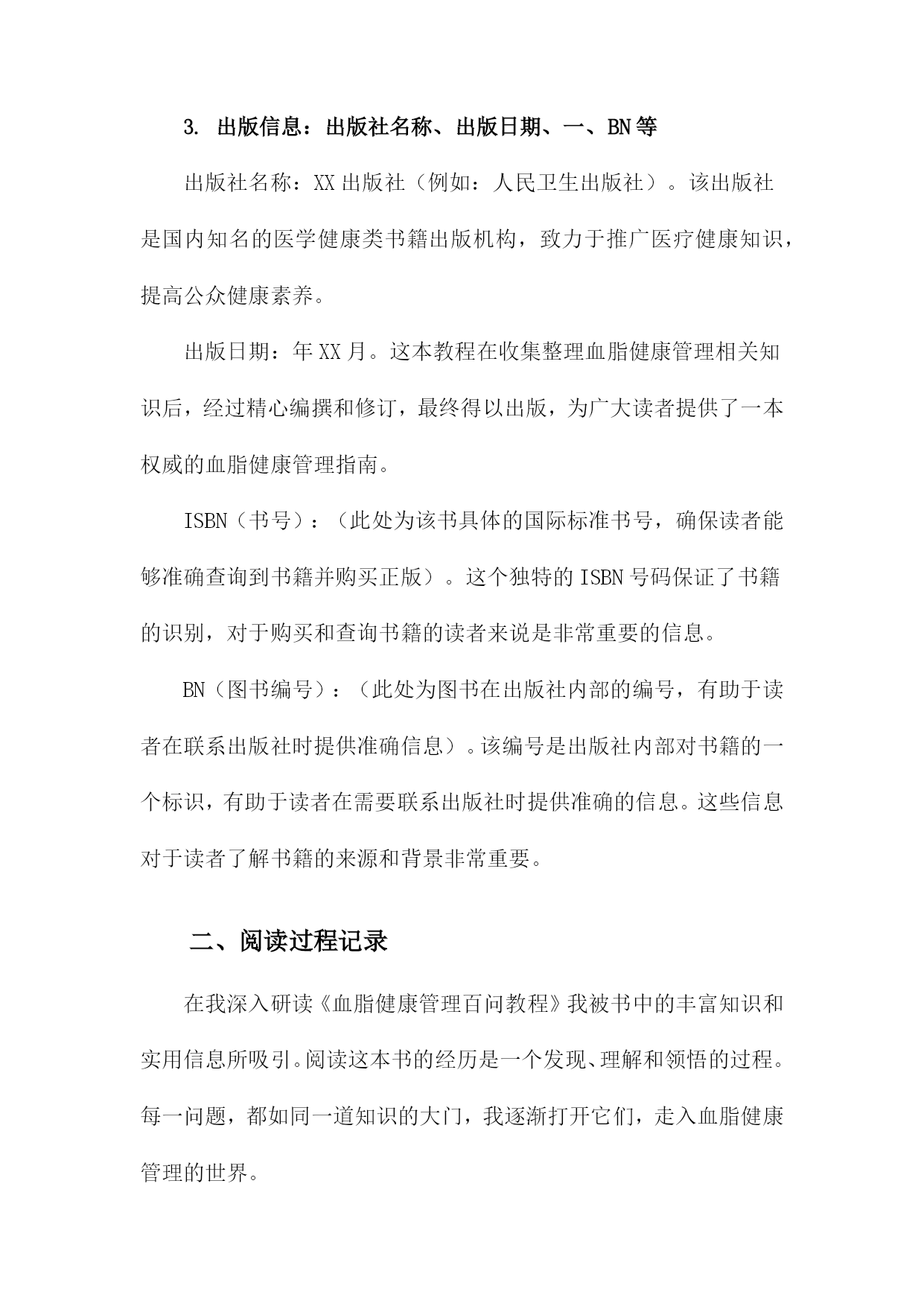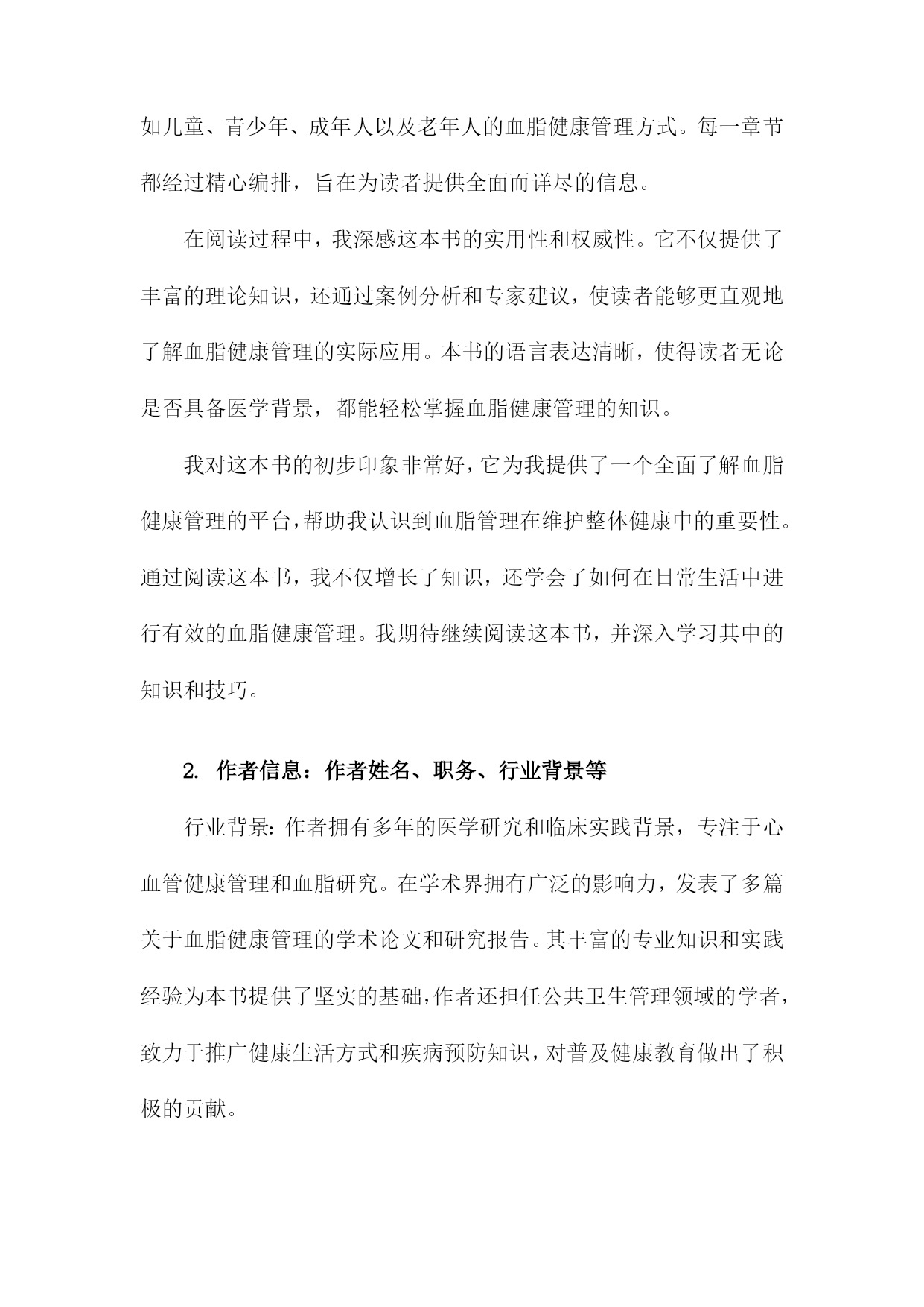 《血脂健康管理百问教程》读书记录一、书籍基本信息内容简介:本书是一部关于血脂健康管理的专业教程,旨在帮助读者了解血脂的基本知识、高血脂的危害、预防及治疗方法。全书通过百问百答的形式,系统地介绍了血脂健康管理的各个方面,内容涵盖血脂的基本概念、检测、评估、疾病预防、饮食调整、运动建议以及药物治疗等方面。本书既适合普通读者了解血脂健康知识,也适合医护人员参考学习。(接下来可以添加书籍封面设计、开本、纸张质量等具体信息,以及ISBN等标识,以便读者在购买或借阅时能够准确识别。)1.书籍名称:《血脂健康管理百问教程》当我拿起这本《血脂健康管理百问教程》时,我意识到这是一本关于血脂健康管理的权威指南。这本书以其详尽的内容和专业的角度,让我对血脂健康管理有了更深入的了解。我开始了我的阅读之旅,期待从中获取关于血脂健康管理的宝贵知识。本书从血脂的基本概念开始,逐步深入介绍了血脂的种类、功能以及其在人体健康中的作用。书中详细阐述了血脂异常的原因、症状、诊断方法以及预防措施。更重要的是,这本书还涵盖了针对不同人群,如儿童、青少年、成年人以及老年人的血脂健康管理方式。每一章节都经过精心编排,旨在为读者提供全面而详尽的信息。在阅读过程中,我深感这本书的实用性和权威性。它不仅提供了丰富的理论知识,还通过案例分析和专家建议,使读者能够更直观地了解血脂健康管理的实际应用。本书的语言表达清晰,使得读者无论是否具备医学背景,都能轻松掌握血脂健康管理的知识。我对这本书的初步印象非常好,它为我提供了一个全面了解血脂健康管理的平台,帮助我认识到血脂管理在维护整体健康中的重要性。通过阅读这本书,我不仅增长了知识,还学会了如何在日常生活中进行有效的血脂健康管理。我期待继续阅读这本书,并深入学习其中的知识和技巧。2.作者信息:作者姓名、职务、行业背景等行业背景:作者拥有多年的医学研究和临床实践背景,专注于心血管健康管理和血脂研究。在学术界拥有广泛的影响力,发表了多篇关于血脂健康管理的学术论文和研究报告。其丰富的专业知识和实践经验为本书提供了坚实的基础,作者还担任公共卫生管理领域的学者,致力于推广健康生活方式和疾病预防知识,对普及健康教育做出了积极的贡献。3.出版信息:出版社名称、出版日期、一、BN等出版社名称:XX出版社(例如:人民卫生出版社)。该出版社是国内知名的医学健康类书籍出版机构,致力于推广医疗健康知识,提高公众健康素养。出版日期:年XX月。这本教程在收集整理血脂健康管理相关知识后,经过精心编撰和修订,最终得以出版,为广大读者提供了一本权威的血脂健康管理指南。ISBN(书号):(此处为该书具体的国际标准书号,确保读者能够准确查询到书籍并购买正版)。这个独特的ISBN号码保证了书籍的识别,对于购买和查询书籍的读者来说是非常重要的信息。BN(图书编号):(此处为图书在出版社内部的编号,有助于读者在联系出版社时提供准确信息)。该编号是出版社内部对书籍的一个标识,有助于读者在需要联系出版社时提供准确的信息。这些信息对于读者了解书籍的来源和背景非常重要。二、阅读过程记录在我深入研读《血脂健康管理百问教程》我被书中的丰富知识和实用信息所吸引。阅读这本书的经历是一个发现、理解和领悟的过程。每一问题,都如同一道知识的大门,我逐渐打开它们,走入血脂健康管理的世界。在初读阶段,我对血脂健康的基础知识有了初步了解。书中详细介绍了血脂的定义、种类、功能以及正常的血脂水平范围,这些基础知识的获取为我后续理解血脂异常及其管理提供了重要的基础。随着阅读的深入,我逐渐了解到血脂异常的原因和症状。书中详细阐述了不良饮食习惯、缺乏运动、肥胖等因素如何影响血脂水平,以及如何通过一些早期症状发现血脂问题,这些内容使我对于血脂异常的认知更加全面和深入。阅读过程中,我特别关注了血脂健康管理的方法和策略。书中通过饮食调整、运动计划、药物治疗等方面详细讲解了如何管理和控制血脂水平,这些内容具有很强的实用性和操作性。我也对书中提到的预防策略产生了浓厚的兴趣,如定期进行血脂检查、保持良好的生活习惯等。在阅读过程中,我还特别关注了书中的案例分析和专家建议。这些真实案例的分享让我更直观地了解到血脂异常的影响以及有效的管理策略。而专家的建议则为我提供了专业、权威的指导,使我对于血脂健康管理有了更深的理解和认识。《血脂健康管理百问教程》的阅读过程是一个不断发现、学习和领悟的过程。通过阅读这本书,我不仅获得了丰富的知识,也学会了如何有效地管理自己的血脂健康。这本书为我提供了一个全面的视角,帮助我深入了解血脂健康管理的各个方面,为我未来的健康管理提供了重要的指导和帮助。1.阅读时间:开始阅读日期,结束阅读日期《血脂健康管理百问教程》是一本专注于血脂健康管理的书籍,通过对一百个关