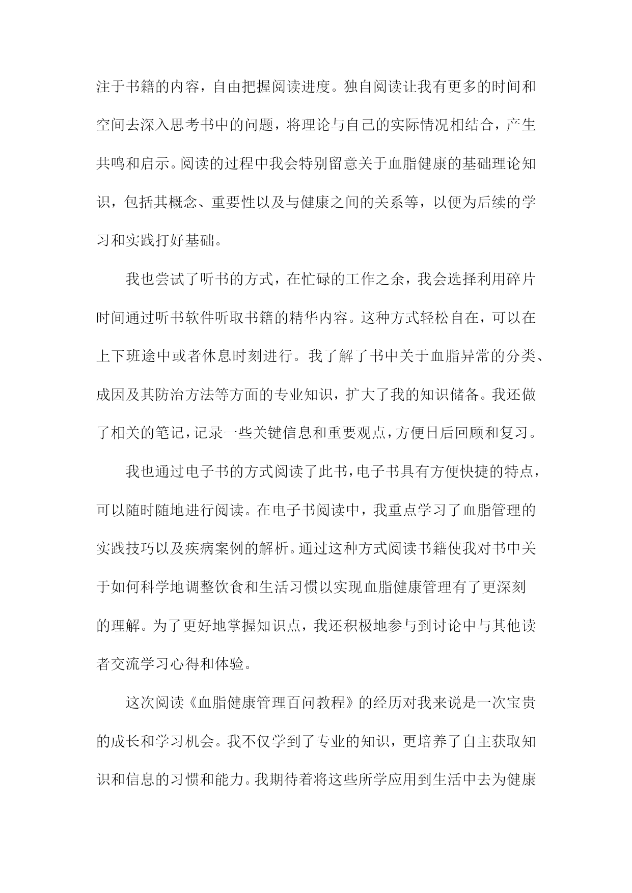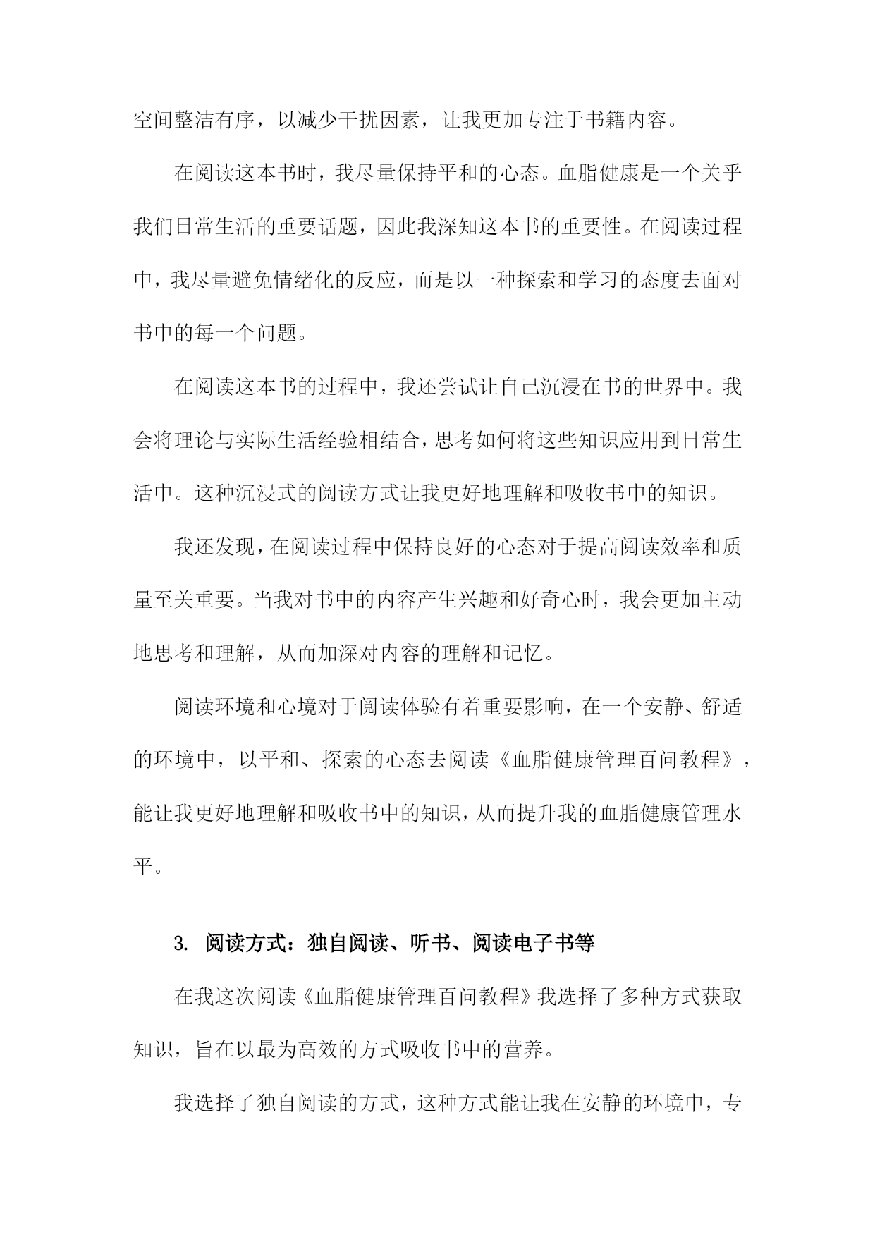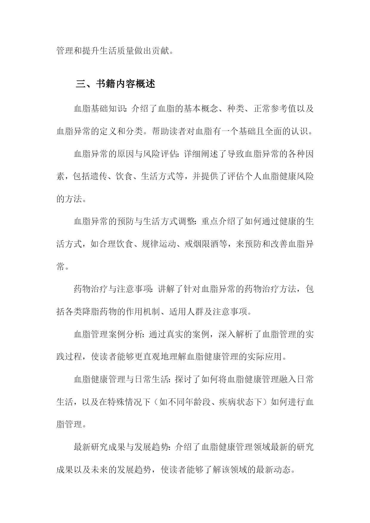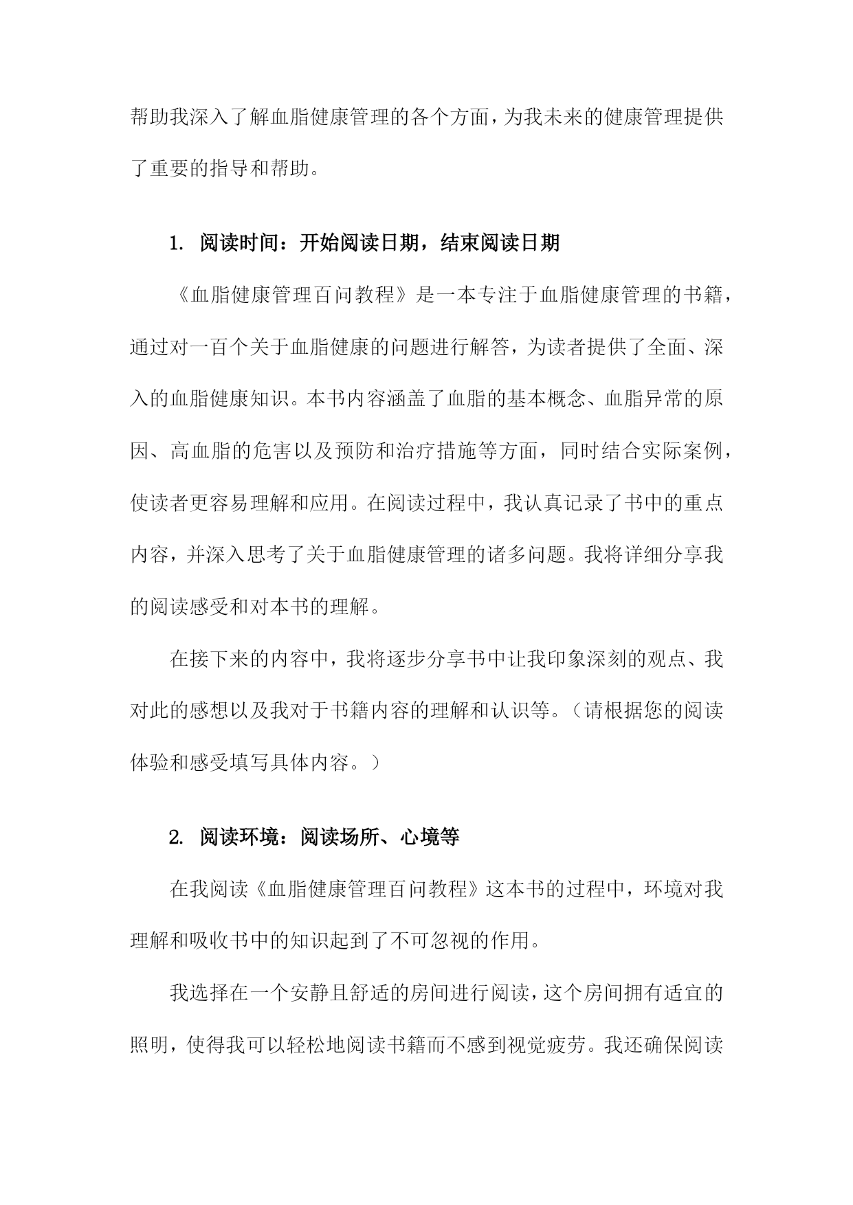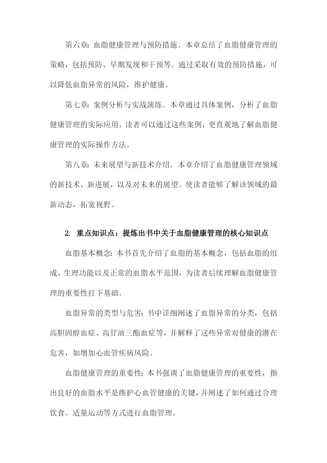《血脂健康管理百问教程》读书记录一、书籍基本信息内容简介:本书是一部关于血脂健康管理的专业教程,旨在帮助读者了解血脂的基本知识、高血脂的危害、预防及治疗方法。全书通过百问百答的形式,系统地介绍了血脂健康管理的各个方面,内容涵盖血脂的基本概念、检测、评估、疾病预防、饮食调整、运动建议以及药物治疗等方面。本书既适合普通读者了解血脂健康知识,也适合医护人员参考学习。(接下来可以添加书籍封面设计、开本、纸张质量等具体信息,以及ISBN等标识,以便读者在购买或借阅时能够准确识别。)1.书籍名称:《血脂健康管理百问教程》当我拿起这本《血脂健康管理百问教程》时,我意识到这是一本关于血脂健康管理的权威指南。这本书以其详尽的内容和专业的角度,让我对血脂健康管理有了更深入的了解。我开始了我的阅读之旅,期待从中获取关于血脂健康管理的宝贵知识。本书从血脂的基本概念开始,逐步深入介绍了血脂的种类、功能以及其在人体健康中的作用。书中详细阐述了血脂异常的原因、症状、诊断方法以及预防措施。更重要的是,这本书还涵盖了针对不同人群,如儿童、青少年、成年人以及老年人的血脂健康管理方式。每一章节都经过精心编排,旨在为读者提供全面而详尽的信息。在阅读过程中,我深感这本书的实用性和权威性。它不仅提供了丰富的理论知识,还通过案例分析和专家建议,使读者能够更直观地了解血脂健康管理的实际应用。本书的语言表达清晰,使得读者无论是否具备医学背景,都能轻松掌握血脂健康管理的知识。我对这本书的初步印象非常好,它为我提供了一个全面了解血脂健康管理的平台,帮助我认识到血脂管理在维护整体健康中的重要性。通过阅读这本书,我不仅增长了知识,还学会了如何在日常生活中进行有效的血脂健康管理。我期待继续阅读这本书,并深入学习其中的知识和技巧。2.作者信息:作者姓名、职务、行业背景等行业背景:作者拥有多年的医学研究和临床实践背景,专注于心血管健康管理和血脂研究。在学术界拥有广泛的影响力,发表了多篇关于血脂健康管理的学术论文和研究报告。其丰富的专业知识和实践经验为本书提供了坚实的基础,作者还担任公共卫生管理领域的学者,致力于推广健康生活方式和疾病预防知识,对普及健康教育做出了积极的贡献。3.出版信息:出版社名称、出版日期、一、BN等出版社名称:XX出版社(例如:人民卫生出版社)。该出版社是国内知名的医学健康类书籍出版机构,致力于推广医疗健康知识,提高公众健康素养。出版日期:年XX月。这本教程在收集整理血脂健康管理相关知识后,经过精心编撰和修订,最终得以出版,为广大读者提供了一本权威的血脂健康管理指南。ISBN(书号):(此处为该书具体的国际标准书号,确保读者能够准确查询到书籍并购买正版)。这个独特的ISBN号码保证了书籍的识别,对于购买和查询书籍的读者来说是非常重要的信息。BN(图书编号):(此处为图书在出版社内部的编号,有助于读者在联系出版社时提供准确信息)。该编号是出版社内部对书籍的一个标识,有助于读者在需要联系出版社时提供准确的信息。这些信息对于读者了解书籍的来源和背景非常重要。二、阅读过程记录在我深入研读《血脂健康管理百问教程》我被书中的丰富知识和实用信息所吸引。阅读这本书的经历是一个发现、理解和领悟的过程。每一问题,都如同一道知识的大门,我逐渐打开它们,走入血脂健康管理的世界。在初读阶段,我对血脂健康的基础知识有了初步了解。书中详细介绍了血脂的定义、种类、功能以及正常的血脂水平范围,这些基础知识的获取为我后续理解血脂异常及其管理提供了重要的基础。随着阅读的深入,我逐渐了解到血脂异常的原因和症状。书中详细阐述了不良饮食习惯、缺乏运动、肥胖等因素如何影响血脂水平,以及如何通过一些早期症状发现血脂问题,这些内容使我对于血脂异常的认知更加全面和深入。阅读过程中,我特别关注了血脂健康管理的方法和策略。书中通过饮食调整、运动计划、药物治疗等方面详细讲解了如何管理和控制血脂水平,这些内容具有很强的实用性和操作性。我也对书中提到的预防策略产生了浓厚的兴趣,如定期进行血脂检查、保持良好的生活习惯等。在阅读过程中,我还特别关注了书中的案例分析和专家建议。这些真实案例的分享让我更直观地了解到血脂异常的影响以及有效的管理策略。而专家的建议则为我提供了专业、权威的指导,使我对于血脂健康管理有了更深的理解和认识。《血脂健康管理百问教程》的阅读过程是一个不断发现、学习和领悟的过程。通过阅读这本书,我不仅获得了丰富的知识,也学会了如何有效地管理自己的血脂健康。这本书为我提供了一个全面的视角,帮助我深入了解血脂健康管理的各个方面,为我未来的健康管理提供了重要的指导和帮助。1.阅读时间:开始阅读日期,结束阅读日期《血脂健康管理百问教程》是一本专注于血脂健康管理的书籍,通过对一百个关