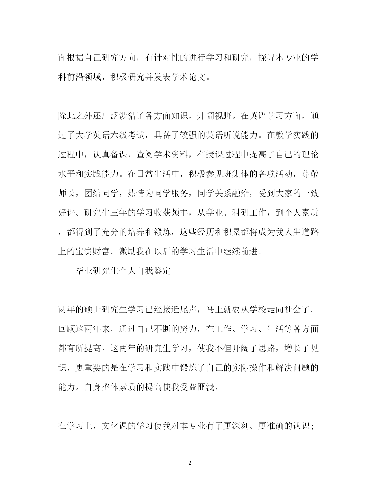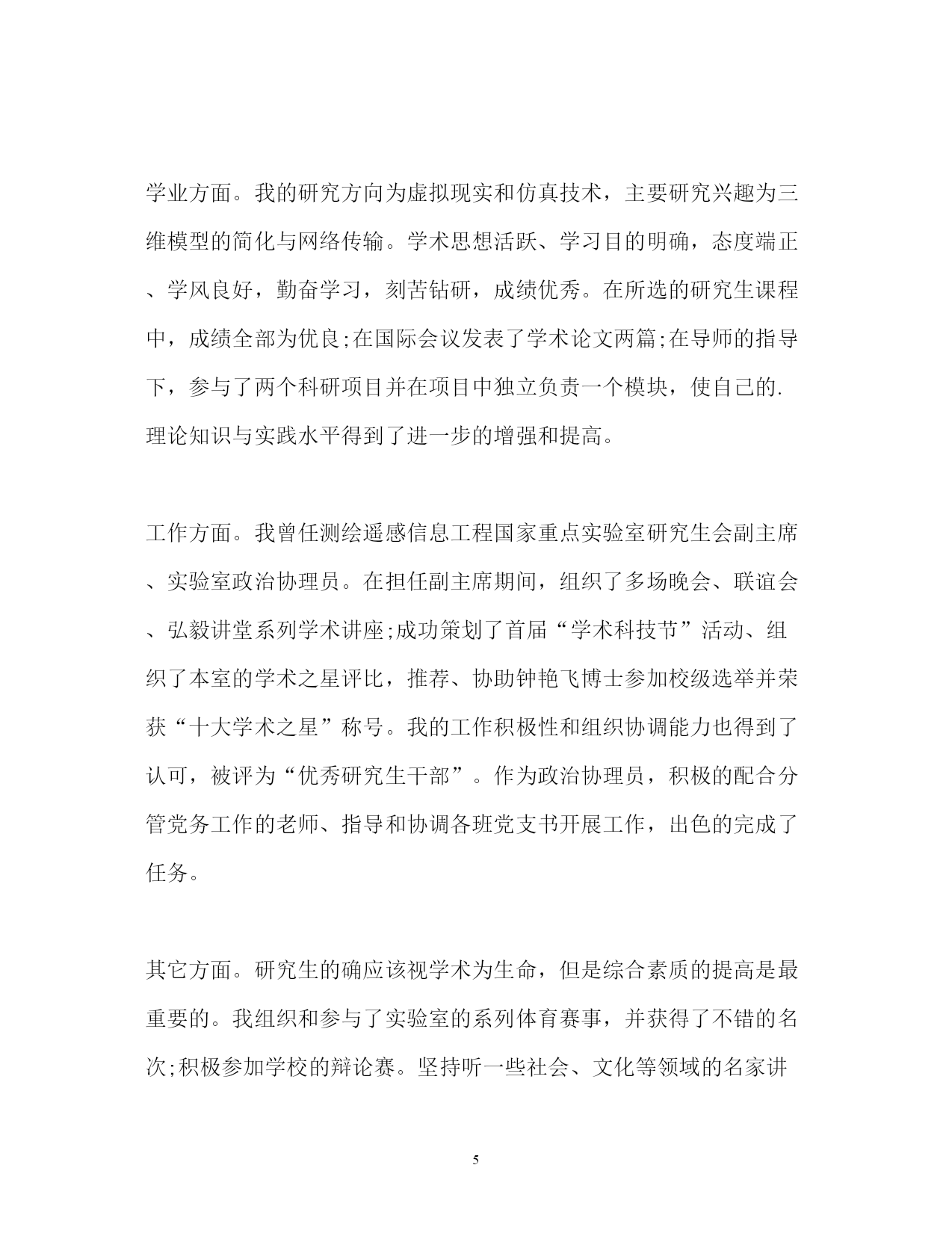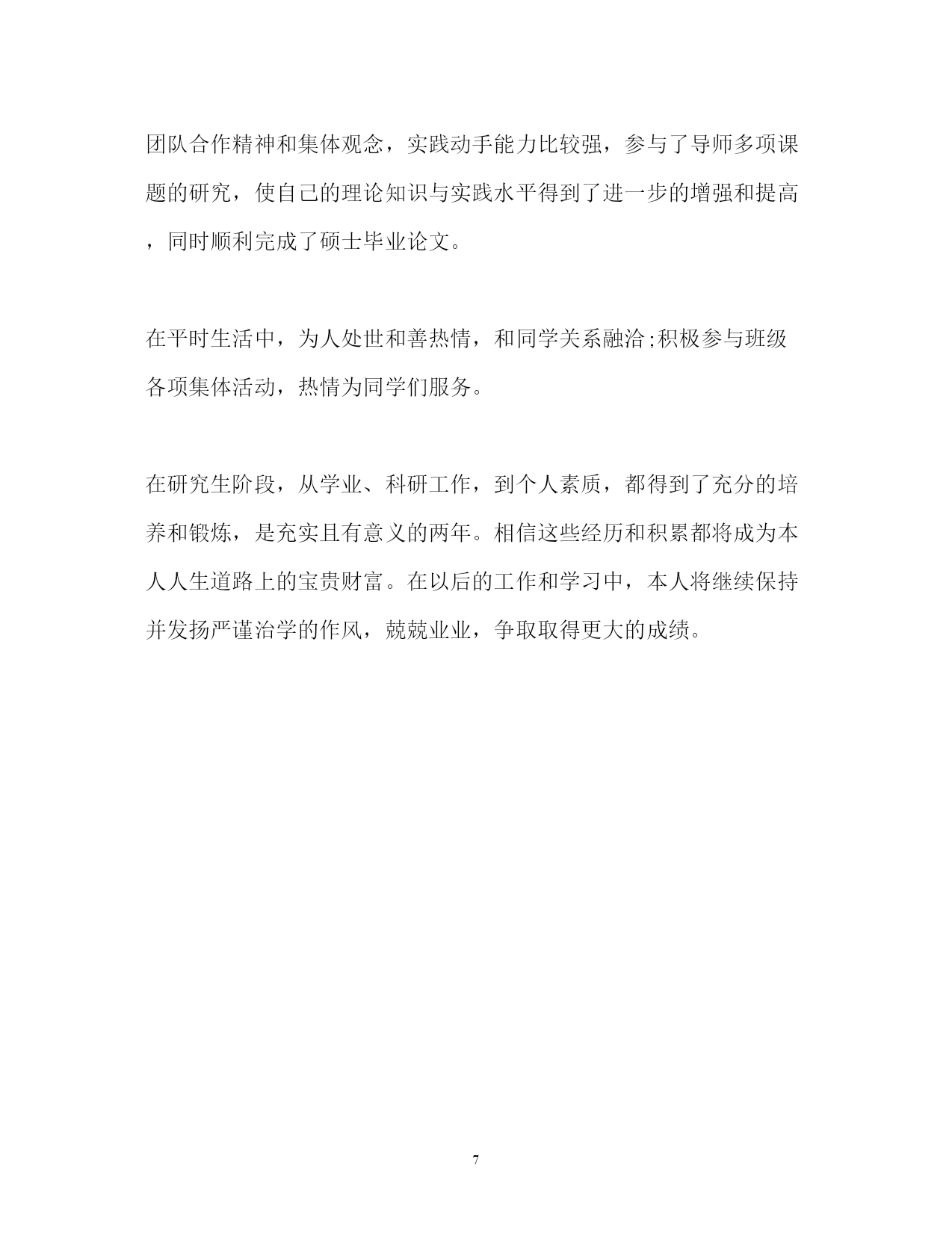 此资料由网络收集而来,如有侵权请告知上传者立即删除。资料共分享,我们负责传递知识。PAGEPAGE7毕业研究生个人自我鉴定「」毕业研究生个人自我鉴定「四篇」本人在硕士研究生学习阶段,思想上要求上进,认真学习,努力钻研专业知识,毕业之际,回顾两年来的学习、工作以及生活,做自我鉴定如下:毕业研究生个人自我鉴定研究生学习生活匆匆而过,在这三年从不曾懈怠对自己的要求。在思想上严格以党员的标准要求自己,学习党的经典著作,不断提高自己的理论水平。作为其他同学的入党培养人,多次与培养对象交流、探讨,帮助他们提高思想认识。积极的参加党组织的各项活动,认真学习科学发展观,以科学发展观指导自己的学习科研活动。在科研上,一方面认真学习专业基础课程,掌握专业基本理论,夯实专业基础,拓宽知识领域,为自己的科研工作打下扎实基础;另一方面根据自己研究方向,有针对性的进行学习和研究,探寻本专业的学科前沿领域,积极研究并发表学术论文。除此之外还广泛涉猎了各方面知识,开阔视野。在英语学习方面,通过了大学英语六级考试,具备了较强的英语听说能力。在教学实践的过程中,认真备课,查阅学术资料,在授课过程中提高了自己的理论水平和实践能力。在日常生活中,积极参见班集体的各项活动,尊敬师长,团结同学,热情为同学服务,同学关系融洽,受到大家的一致好评。研究生三年的学习收获颇丰,从学业、科研工作,到个人素质,都得到了充分的培养和锻炼,这些经历和积累都将成为我人生道路上的宝贵财富。激励我在以后的学习生活中继续前进。毕业研究生个人自我鉴定两年的硕士研究生学习已经接近尾声,马上就要从学校走向社会了。回顾这两年来,通过自己不断的努力,在工作、学习、生活等各方面都有所提高。这两年的研究生学习,使我不但开阔了思路,增长了见识,更重要的是在学习和实践中锻炼了自己的实际操作和解决问题的能力。自身整体素质的提高使我受益匪浅。在学习上,文化课的学习使我对本专业有了更深刻、更准确的认识;查阅相关的文献和资料使我对专业的相关进展有了更加清晰的了解;实验相关的课程使我对很多仪器有了更直观的认识。在不断的学习中,积累了知识和经验;在平常的实验中,提高了动手技能;在课题的研究过程中,对相关的领域有了全面而具体的认知。在生活中,我积极参加各项集体活动,同学之间和睦相处,与同寝室、同专业、同班级的同学保持十分融洽的关系。平常注意锻炼身体,参加丰富多彩的各种体育活动,并且在足球、篮球等有特长的方面努力为集体争取荣誉。保持朴素的生活作风,注意节俭,抵制各种浪费行为。提高自身修养,从小事做起严格要求自己。在思想觉悟上,我时刻牢记自己是一名党员,处处以身作则,以一名合格党员的要求严格规范自己的言行举止,起到模范带头作用。关心国家大事,经常通过各种媒体了解时事新闻,对国内外发生的事件都有自己的见解和判断。当然,在不断进步的同时,自己还是暴露了一些缺点和需要提高的地方。例如,在两年的学习中并没有发表相关的论文,说明自己在学术研究上还需要继续努力。平常的待人处事中容易冲动,有时脾气比较急躁,做起事情来有些时候也欠缺考虑。所以在将来的工作和学习中要更加努力,不断严格要求自己,从各个方面完善自我,继续提高自身的综合素质。毕业研究生个人自我鉴定能够在研究生院继续深造我十分的珍惜,我一直希望自己能够更加出色,我在研究生阶段所获颇丰,从学业、科研工作,到个人素质,都得到了充分的培养和锻炼,是充实且有意义的两年。两年来本人思想上要求上进,认真学习,努力钻研专业知识,毕业之际,回望过去的日子,不禁让我感慨万千:这一段时光不但让充实了自我,而且也让我结交了许多良师益友;这段岁月不仅仅只是难忘,而是让我刻苦铭心。年华虽逝坚,带不走的记忆却历历在目。思想方面。我认真学习马克思列宁主义、毛泽东思想、xxx理论和“三个代表”重要思想;关心时事政治,关心学校的改革与发展;拥护党的路线、方针和政策,能认真执行学校、实验室的决议;尊敬导师、团结同学、乐于助人、勇于奉献,具有良好的道德品质和思想修养;能遵守国家法律、法令和学校各项规章制度。作为一名中共党员和一名学生干部,我始终努力学习、积极工作,在自己进步的同时还不忘帮助别人进步,先后担任了几位同志的入党介绍人、充分发挥党员学生干部的模范带头作用。学业方面。我的研究方向为虚拟现实和仿真技术,主要研究兴趣为三维模型的简化与网络传输。学术思想活跃、学习目的明确,态度端正、学风良好,勤奋学习,刻苦钻研,成绩优秀。在所选的研究生课程中,成绩全部为优良;在国际会议发表了学术论文两篇;在导师的指导下,参与了两个科研项目并在项目中独立负责一个模块,使自己的.理论知识与实践水平得到了进一步的增强和提高。工作方面。我曾任测绘遥感信息工程国家重点实验室研究生会副主席