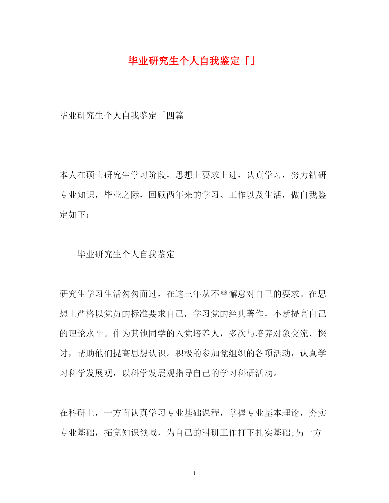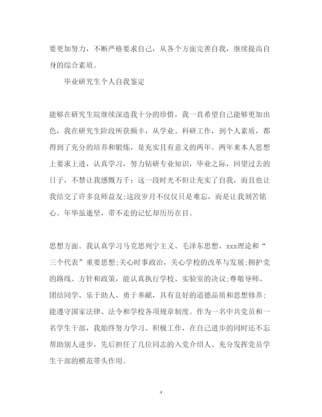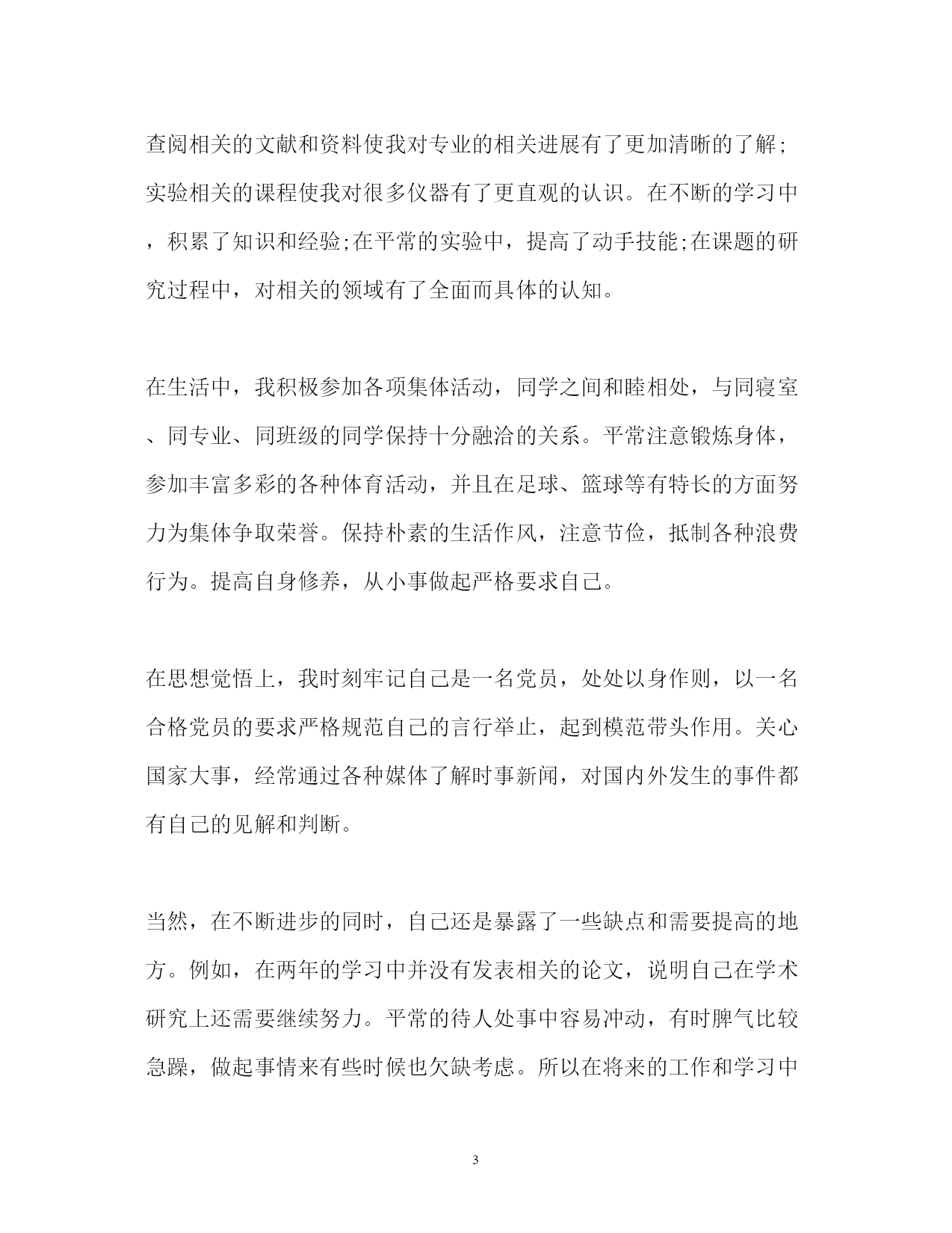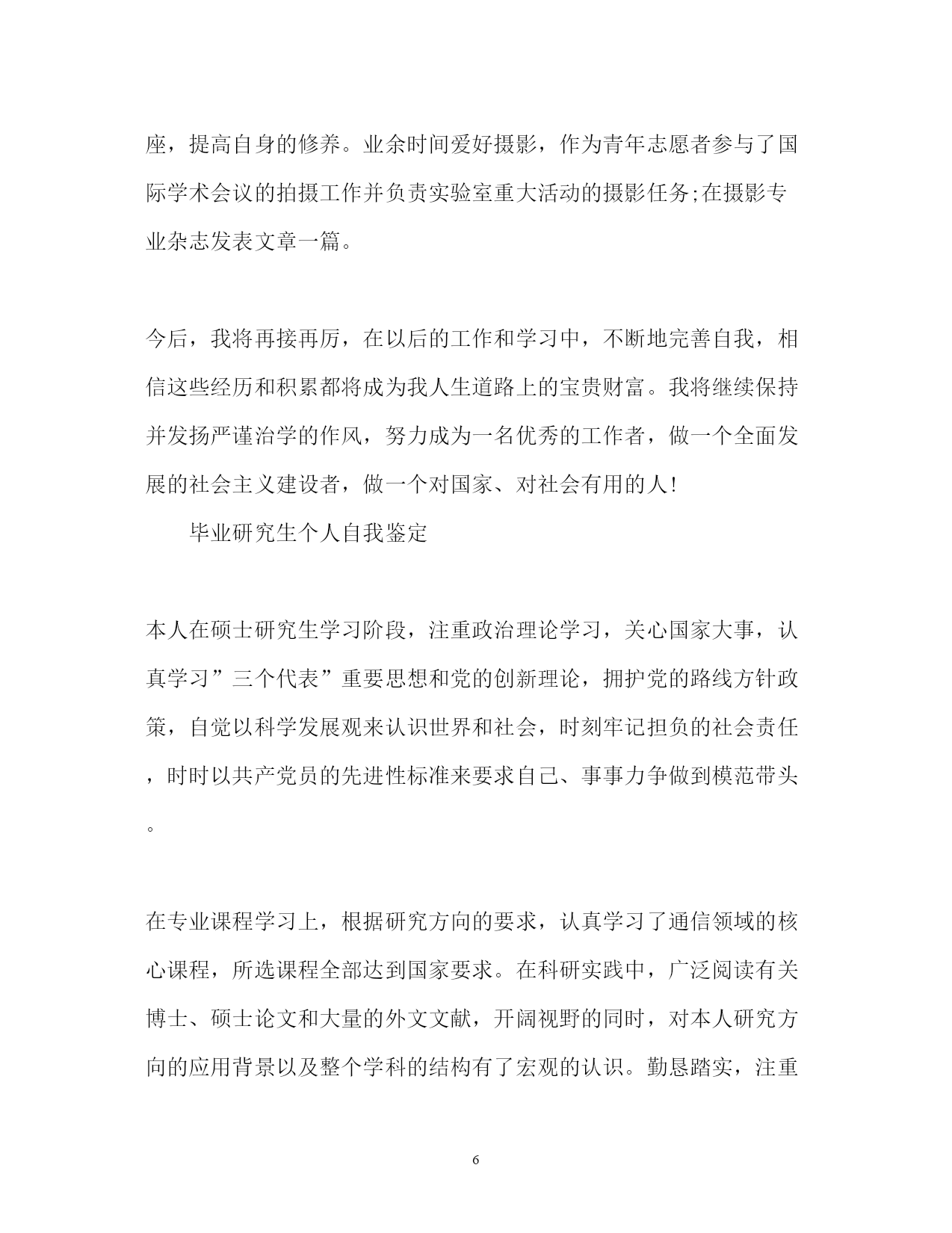 此资料由网络收集而来,如有侵权请告知上传者立即删除。资料共分享,我们负责传递知识。PAGEPAGE7毕业研究生个人自我鉴定「」毕业研究生个人自我鉴定「四篇」本人在硕士研究生学习阶段,思想上要求上进,认真学习,努力钻研专业知识,毕业之际,回顾两年来的学习、工作以及生活,做自我鉴定如下:毕业研究生个人自我鉴定研究生学习生活匆匆而过,在这三年从不曾懈怠对自己的要求。在思想上严格以党员的标准要求自己,学习党的经典著作,不断提高自己的理论水平。作为其他同学的入党培养人,多次与培养对象交流、探讨,帮助他们提高思想认识。积极的参加党组织的各项活动,认真学习科学发展观,以科学发展观指导自己的学习科研活动。在科研上,一方面认真学习专业基础课程,掌握专业基本理论,夯实专业基础,拓宽知识领域,为自己的科研工作打下扎实基础;另一方面根据自己研究方向,有针对性的进行学习和研究,探寻本专业的学科前沿领域,积极研究并发表学术论文。除此之外还广泛涉猎了各方面知识,开阔视野。在英语学习方面,通过了大学英语六级考试,具备了较强的英语听说能力。在教学实践的过程中,认真备课,查阅学术资料,在授课过程中提高了自己的理论水平和实践能力。在日常生活中,积极参见班集体的各项活动,尊敬师长,团结同学,热情为同学服务,同学关系融洽,受到大家的一致好评。研究生三年的学习收获颇丰,从学业、科研工作,到个人素质,都得到了充分的培养和锻炼,这些经历和积累都将成为我人生道路上的宝贵财富。激励我在以后的学习生活中继续前进。毕业研究生个人自我鉴定两年的硕士研究生学习已经接近尾声,马上就要从学校走向社会了。回顾这两年来,通过自己不断的努力,在工作、学习、生活等各方面都有所提高。这两年的研究生学习,使我不但开阔了思路,增长了见识,更重要的是在学习和实践中锻炼了自己的实际操作和解决问题的能力。自身整体素质的提高使我受益匪浅。在学习上,文化课的学习使我对本专业有了更深刻、更准确的认识;查阅相关的文献和资料使我对专业的相关进展有了更加清晰的了解;实验相关的课程使我对很多仪器有了更直观的认识。在不断的学习中,积累了知识和经验;在平常的实验中,提高了动手技能;在课题的研究过程中,对相关的领域有了全面而具体的认知。在生活中,我积极参加各项集体活动,同学之间和睦相处,与同寝室、同专业、同班级的同学保持十分融洽的关系。平常注意锻炼身体,参加丰富多彩的各种体育活动,并且在足球、篮球等有特长的方面努力为集体争取荣誉。保持朴素的生活作风,注意节俭,抵制各种浪费行为。提高自身修养,从小事做起严格要求自己。在思想觉悟上,我时刻牢记自己是一名党员,处处以身作则,以一名合格党员的要求严格规范自己的言行举止,起到模范带头作用。关心国家大事,经常通过各种媒体了解时事新闻,对国内外发生的事件都有自己的见解和判断。当然,在不断进步的同时,自己还是暴露了一些缺点和需要提高的地方。例如,在两年的学习中并没有发表相关的论文,说明自己在学术研究上还需要继续努力。平常的待人处事中容易冲动,有时脾气比较急躁,做起事情来有些时候也欠缺考虑。所以在将来的工作和学习中要更加努力,不断严格要求自己,从各个方面完善自我,继续提高自身的综合素质。毕业研究生个人自我鉴定能够在研究生院继续深造我十分的珍惜,我一直希望自己能够更加出色,我在研究生阶段所获颇丰,从学业、科研工作,到个人素质,都得到了充分的培养和锻炼,是充实且有意义的两年。两年来本人思想上要求上进,认真学习,努力钻研专业知识,毕业之际,回望过去的日子,不禁让我感慨万千:这一段时光不但让充实了自我,而且也让我结交了许多良师益友;这段岁月不仅仅只是难忘,而是让我刻苦铭心。年华虽逝坚,带不走的记忆却历历在目。思想方面。我认真学习马克思列宁主义、毛泽东思想、xxx理论和“三个代表”重要思想;关心时事政治,关心学校的改革与发展;拥护党的路线、方针和政策,能认真执行学校、实验室的决议;尊敬导师、团结同学、乐于助人、勇于奉献,具有良好的道德品质和思想修养;能遵守国家法律、法令和学校各项规章制度。作为一名中共党员和一名学生干部,我始终努力学习、积极工作,在自己进步的同时还不忘帮助别人进步,先后担任了几位同志的入党介绍人、充分发挥党员学生干部的模范带头作用。学业方面。我的研究方向为虚拟现实和仿真技术,主要研究兴趣为三维模型的简化与网络传输。学术思想活跃、学习目的明确,态度端正、学风良好,勤奋学习,刻苦钻研,成绩优秀。在所选的研究生课程中,成绩全部为优良;在国际会议发表了学术论文两篇;在导师的指导下,参与了两个科研项目并在项目中独立负责一个模块,使自己的.理论知识与实践水平得到了进一步的增强和提高。工作方面。我曾任测绘遥感信息工程国家重点实验室研究生会副主席