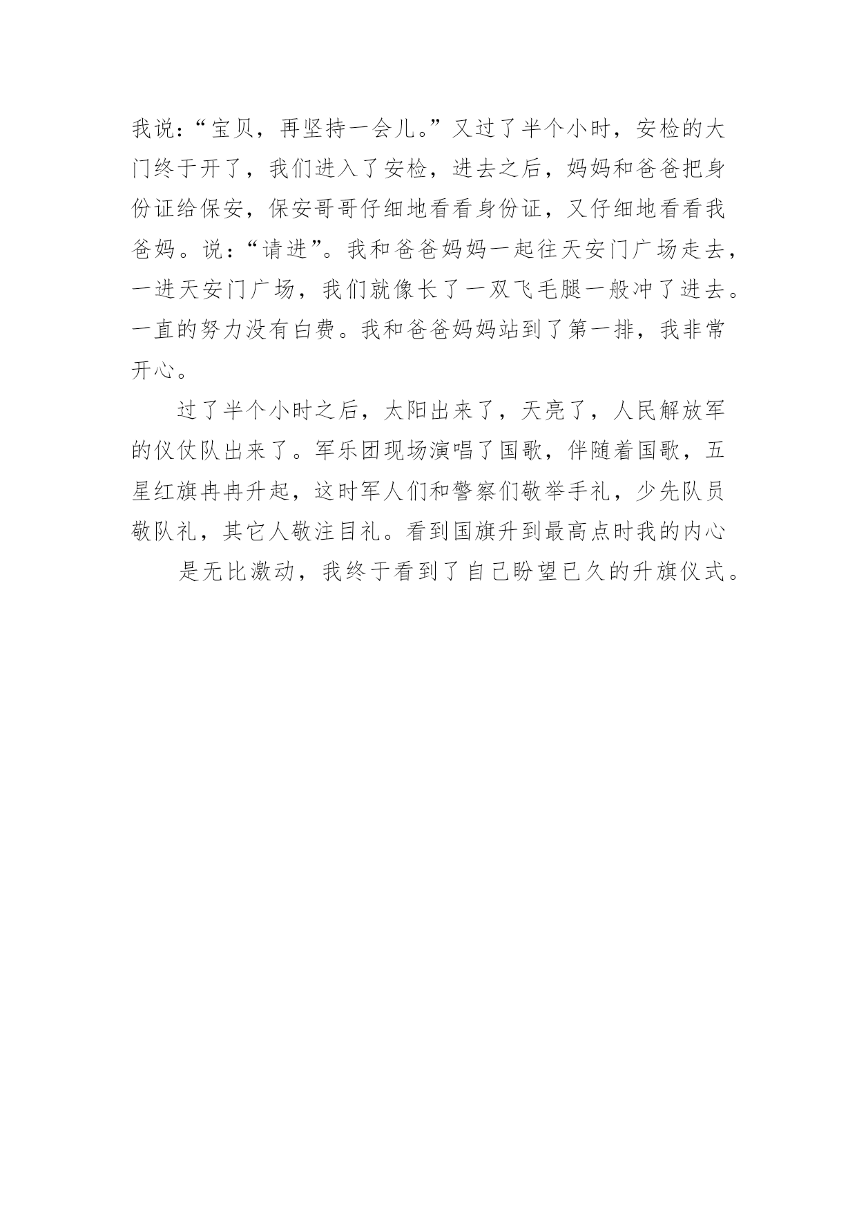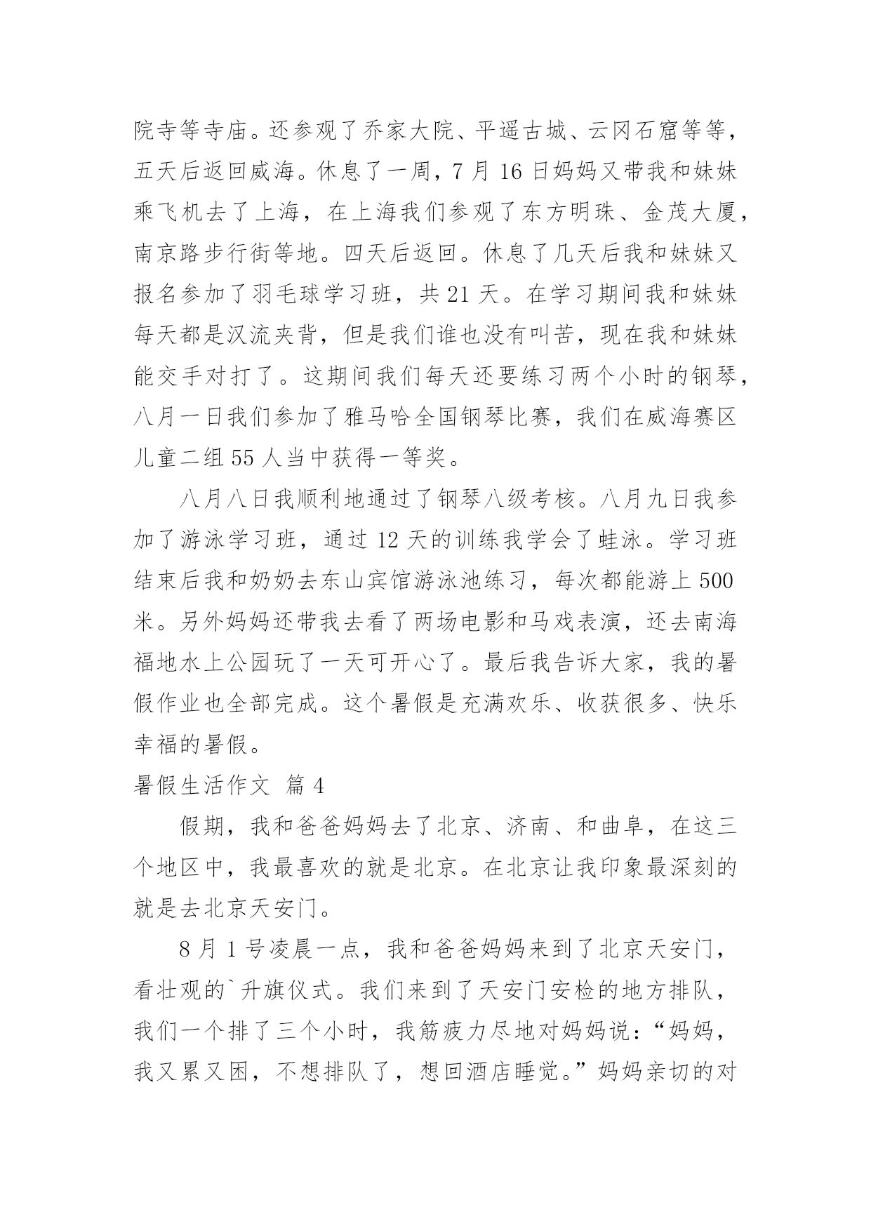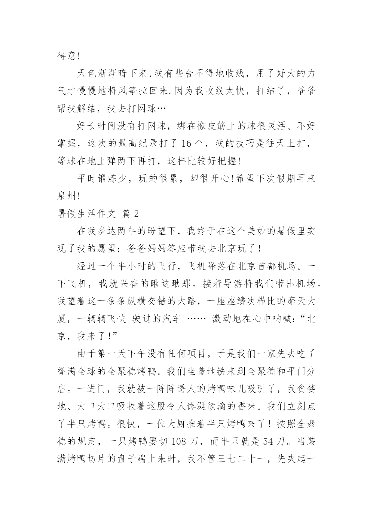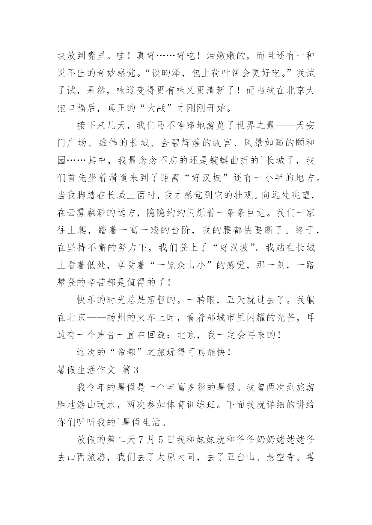 暑假生活作文精选暑假生活作文四篇在平时的学习、工作或生活中,大家都跟作文打过交道吧,借助作文可以宣泄心中的情感,调节自己的心情。那么一般作文是怎么写的呢?下面是小编收集整理的暑假生活作文4篇,仅供参考,欢迎大家阅读。暑假生活作文篇1暑假里,我和姑姑到福建泉州,看望奶奶、姥爷、姥姥!姥爷姥姥家离湖很近,到了傍晚那里的人可多了,有许多美丽的风筝飞在天空中,像是五彩缤纷的蝴蝶…我早已做好了准备:放风筝,打网球。我很喜欢放风筝,听姥爷说我4、5岁时就喜欢上风筝,已经用坏了好几个风筝。以前经常来湖边放风筝,这里风大,很凉快,风筝也飞得高,有时,好像被它拉着跑,这种感觉真好!这次,是我最高兴的一次,风好大,也意味着风筝飞得很高。到了湖边,我和姥爷从包里拿出风筝,开始拼装风筝:风筝的'两边有两个洞,把一根黑色的捧子扎在两边洞里,把绳子在两个洞里打个结,风筝就拼装好了。我们要放风筝了,我们先放线,放了好长,我跑到前面的一片空地上手一放,稍微助跑,一下子就飞了起来,越飞越高,越飞越高…我和姥爷身边多了几位观看者,继续放着手中的线,没过多久线都放得差不多了,观众都说我的风筝放的真高,我有些得意!天色渐渐暗下来,我有些舍不得地收线,用了好大的力气才慢慢地将风筝拉回来.因为我收线太快,打结了,爷爷帮我解结,我去打网球…好长时间没有打网球,绑在橡皮筋上的球很灵活、不好掌握,这次的最高纪录打了16个,我的技巧是往天上打,等球在地上弹两下再打,这样比较好把握!平时锻炼少,玩的很累,却很开心!希望下次假期再来泉州!暑假生活作文篇2在我多达两年的盼望下,我终于在这个美妙的暑假里实现了我的愿望:爸爸妈妈答应带我去北京玩了!经过一个半小时的飞行,飞机降落在北京首都机场。一下飞机,我就兴奋的瞅这瞅那。接着导游将我们带出机场。我望着这一条条纵横交错的大路,一座座鳞次栉比的摩天大厦,一辆辆飞快驶过的汽车……激动地在心中呐喊:“北京,我来了!”由于第一天下午没有任何项目,于是我们一家先去吃了誉满全球的全聚德烤鸭。我们坐着地铁来到全聚德和平门分店。一进门,我就被一阵阵诱人的烤鸭味儿吸引了,我贪婪地、大口大口吸收着这股令人馋涎欲滴的香味。我们立刻点了半只烤鸭。很快,一位大厨推着半只烤鸭来了!按照全聚德的规定,一只烤鸭要切108刀,而半只就是54刀。当装满烤鸭切片的盘子端上来时,我不管三七二十一,先夹起一块放到嘴里。哇!真好……好吃!油嫩嫩的,而且还有一种说不出的奇妙感觉。“谈昀泽,包上荷叶饼会更好吃。”我试了试,果然,味道变得更有味又更清新了!而当我在北京大饱口福后,真正的“大战”才刚刚开始。接下来几天,我们马不停蹄地游览了世界之最——天安门广场、雄伟的长城、金碧辉煌的故宫、风景如画的颐和园……其中,我最念念不忘的还是蜿蜒曲折的`长城了,我们首先坐着滑道来到了距离“好汉坡”还有一小半的地方。当我脚踏在长城上面时,我才感觉到它的壮观。向远处眺望,在云雾飘渺的远方,隐隐约约闪烁着一条条巨龙。我们一家往上爬,踏着一高一矮的台阶,我的腰都快要断了。终于,在坚持不懈的努力下,我们登上了“好汉坡”。我站在长城上看着低处,享受着“一览众山小”的感觉,那一刻,一路攀登的辛苦都是值得的了!快乐的时光总是短暂的。一转眼,五天就过去了。我躺在北京——扬州的火车上时,看着那城市里闪耀的光芒,耳边有一个声音一直在回旋:北京,我一定会再来的!这次的“帝都”之旅玩得可真痛快!暑假生活作文篇3我今年的暑假是一个丰富多彩的暑假。我曾两次到旅游胜地游山玩水,两次参加体育训练班。下面我就详细的讲给你们听听我的`暑假生活。放假的第二天7月5日我和妹妹就和爷爷奶奶姥姥姥爷去山西旅游,我们去了太原大同,去了五台山、悬空寺、塔院寺等寺庙。还参观了乔家大院、平遥古城、云冈石窟等等,五天后返回威海。休息了一周,7月16日妈妈又带我和妹妹乘飞机去了上海,在上海我们参观了东方明珠、金茂大厦,南京路步行街等地。四天后返回。休息了几天后我和妹妹又报名参加了羽毛球学习班,共21天。在学习期间我和妹妹每天都是汉流夹背,但是我们谁也没有叫苦,现在我和妹妹能交手对打了。这期间我们每天还要练习两个小时的钢琴,八月一日我们参加了雅马哈全国钢琴比赛,我们在威海赛区儿童二组55人当中获得一等奖。八月八日我顺利地通过了钢琴八级考核。八月九日我参加了游泳学习班,通过12天的训练我学会了蛙泳。学习班结束后我和奶奶去东山宾馆游泳池练习,每次都能游上500米。另外妈妈还带我去看了两场电影和马戏表演,还去南海福地水上公园玩了一天可开心了。最后我告诉大家,我的暑假作业也全部完成。这个暑假是充满欢乐、收获很多、快乐幸福的暑假。暑假生活作文篇4假期,我和爸爸妈妈去了北京、济南、和曲阜,在这三个地区中,我最喜欢的就是北京。在北京让我印象最深刻的就是去北京天安门。8