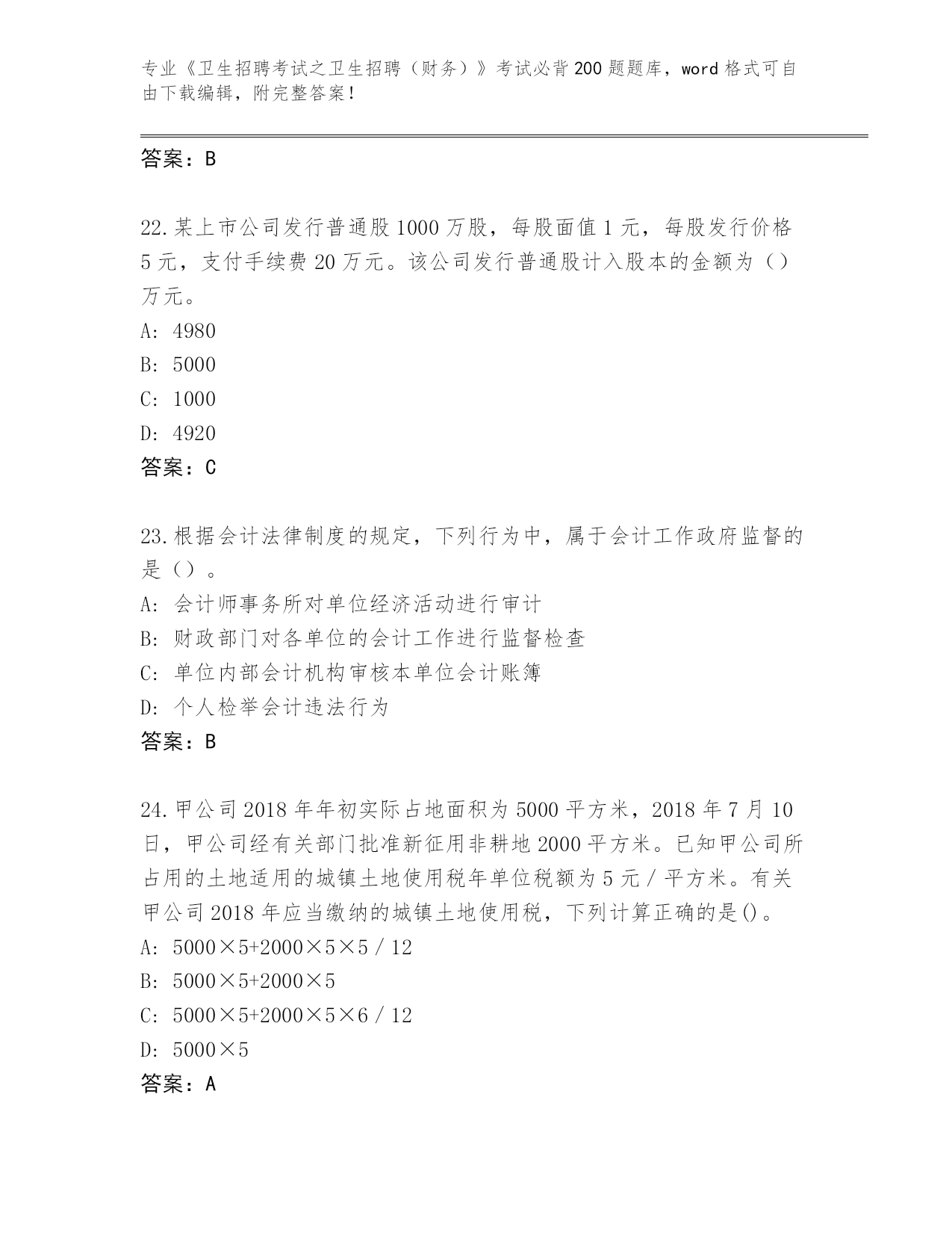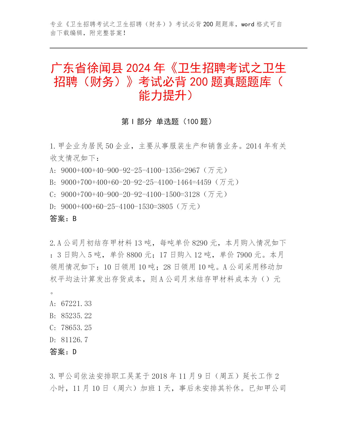 广东省徐闻县2024年《卫生招聘考试之卫生招聘(财务)》考试必背200题真题题库(能力提升)